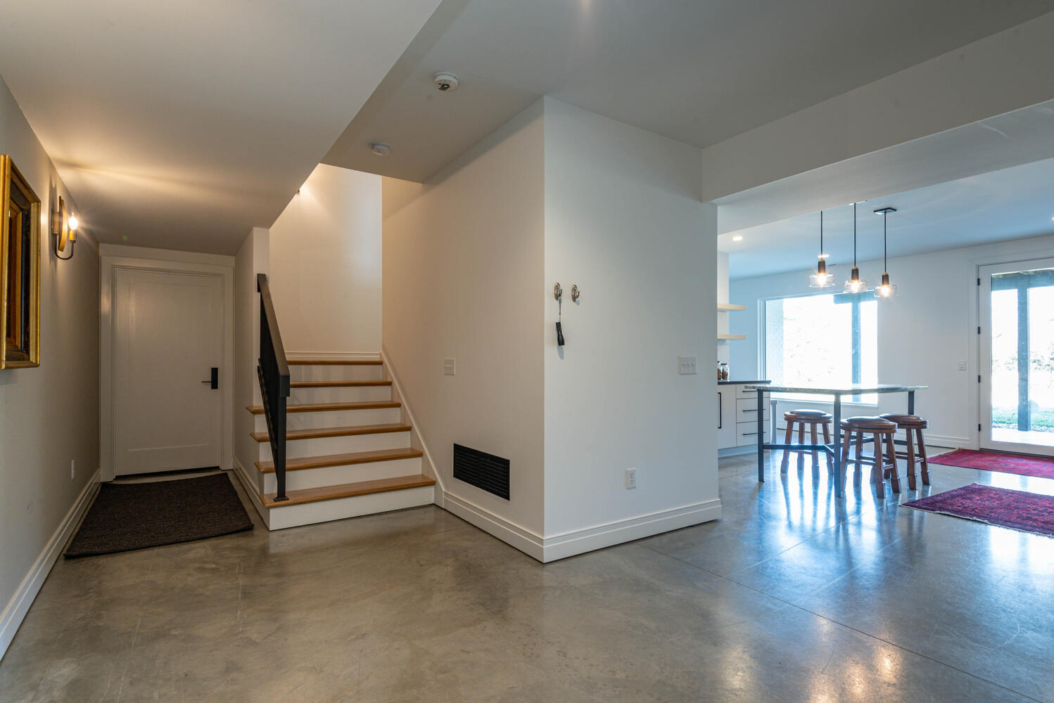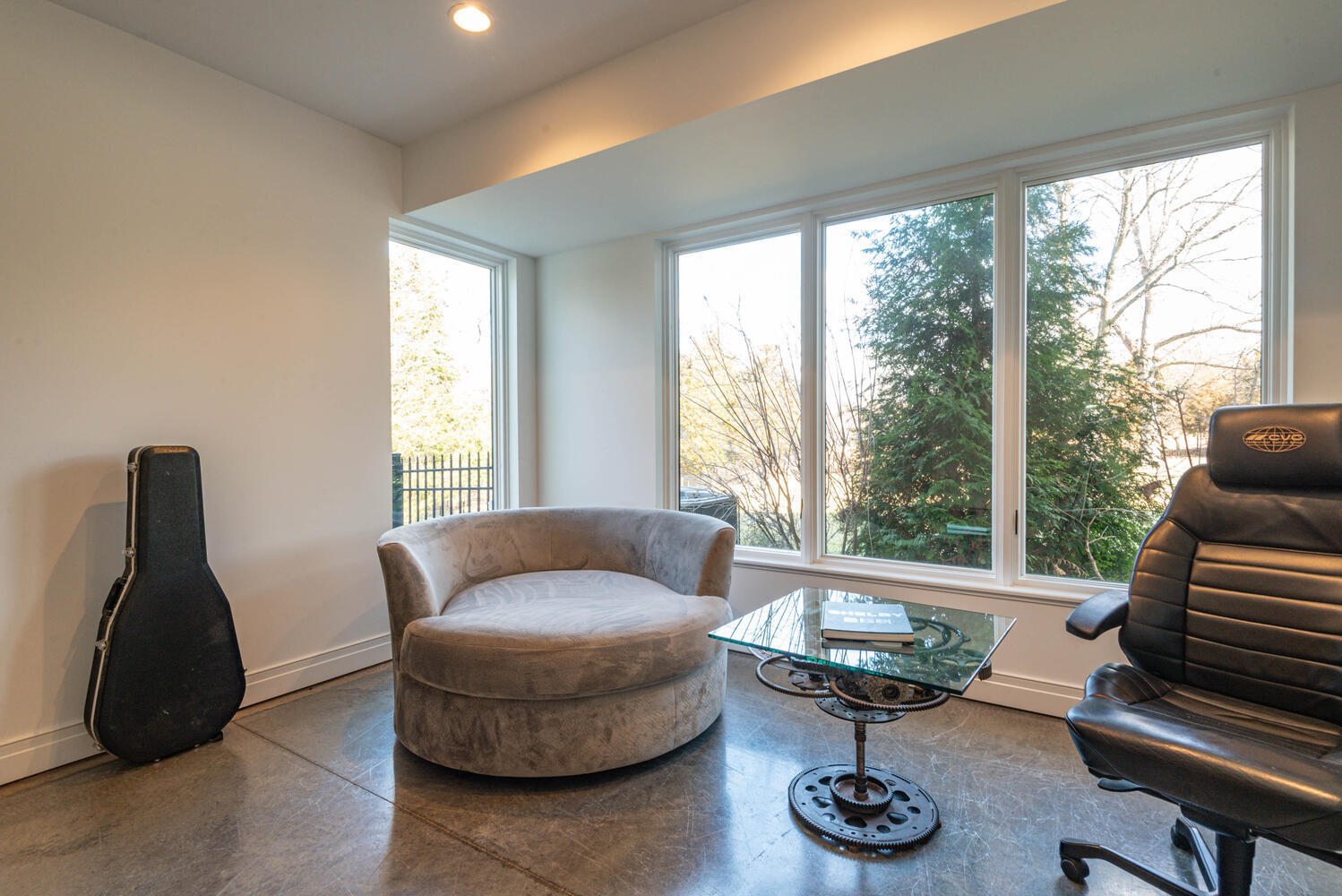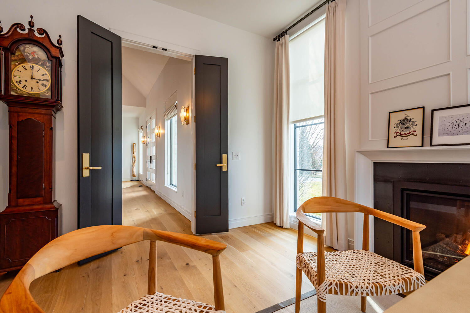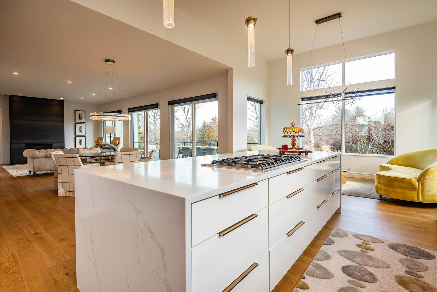 Nestled within Gramercy Park, Bloomington’s distinguished estate neighborhood offers convenient proximity to IU, the IU Health Campus, the IU golf course, and various eastside amenities. This residence exudes modern elegance with its clean lines and meticulous attention to detail. Stepping through the mahogany door with a glass insert, you’re immediately greeted by a showcase of luxury. Kaiser German 7″ finished plank hardwood flooring, upscale lighting, and a custom iron staircase provide just a glimpse of the opulence within. Featuring open entertaining spaces on each level, this home caters to diverse activities and guests. A cozy office/den off the entrance boasts a gas log fireplace, large windows, and exquisite wall coverings. The sleek contemporary style extends to the custom Stoll Cabinetry, entertaining island, quartz countertops, Emtek hardware, and stylish lighting fixtures in the kitchen. Complete with two dishwashers, two ovens, a large refrigerator, and a 6-burner gas cooktop, the kitchen is designed for culinary excellence. Additional amenities include a custom pantry, spacious laundry area, and a coffee bar with a wine/beverage refrigerator. Natural light floods through designer Pella windows and glass doors, illuminating the main floor. The primary suite is on the main level. Enjoy spa-like relaxation in the generously sized bathroom with a large steam shower, marble-topped cabinetry, and a perfectly designed walk-in closet. Upstairs, three bedrooms and two full baths offer functional living spaces, while the living area provides flexibility for gatherings or leisure. The lower level presents another complete living space, with a bedroom, full bath, kitchenette, and ample entertaining area opening to the outdoors. A large bonus room offers versatility for various uses, from a golf simulator room to a media/theatre space. The four-car garage features epoxy flooring, a thermo-controlled gas heater, a sink, and built-in Gladiator storage cabinets.
