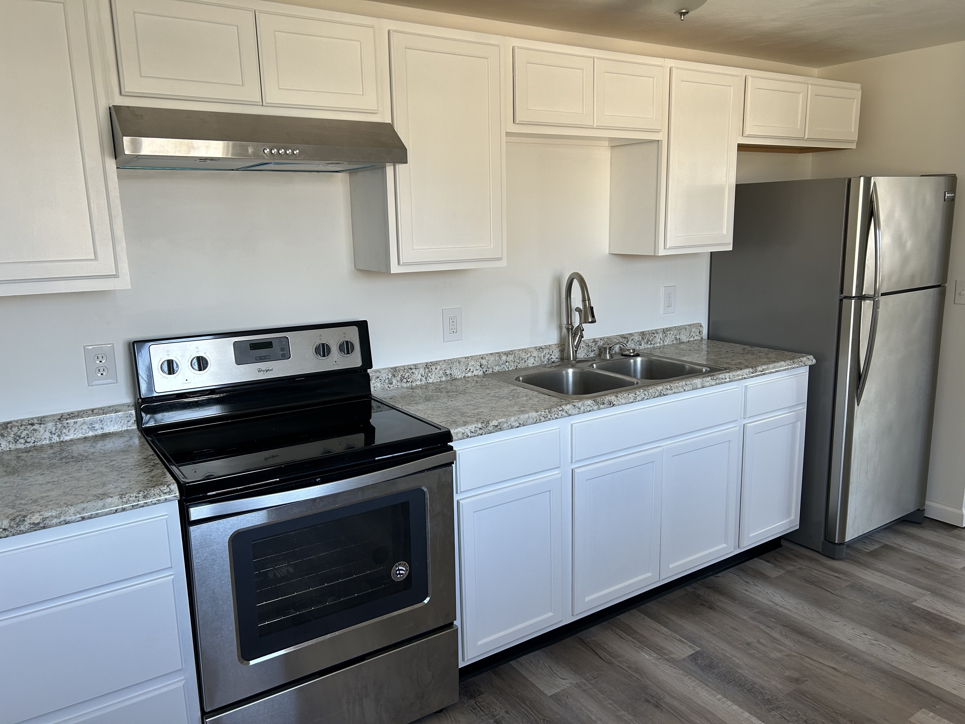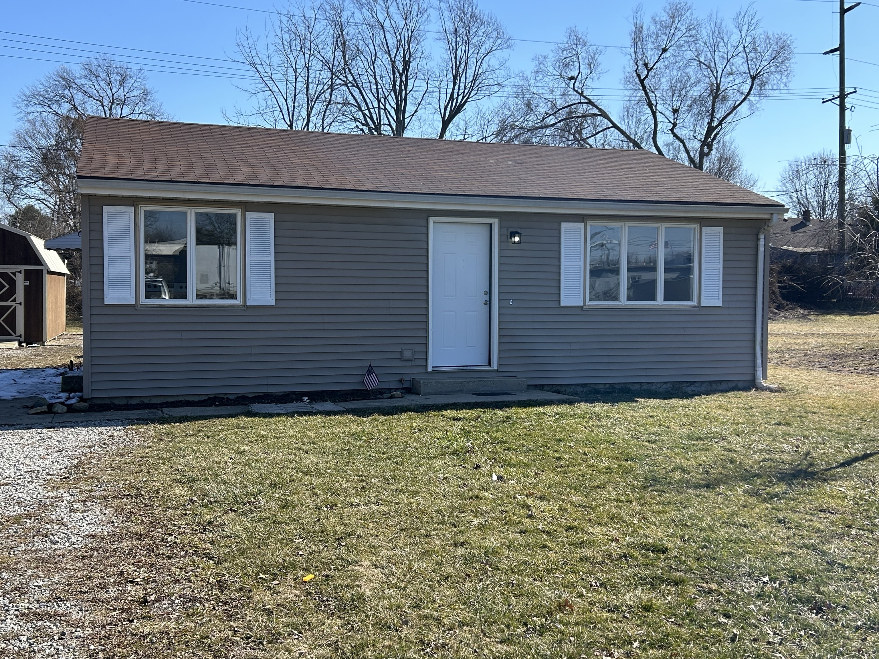 Home has completely been updated/remodeled located on dead end road. Move-in condition. All new kitchen cabinets, appliances and laminate flooring. New windows. Bathroom completely updated with new shower/tub, sink, laminate flooring. Both bedrooms have new carpet. Includes 2 storage sheds.