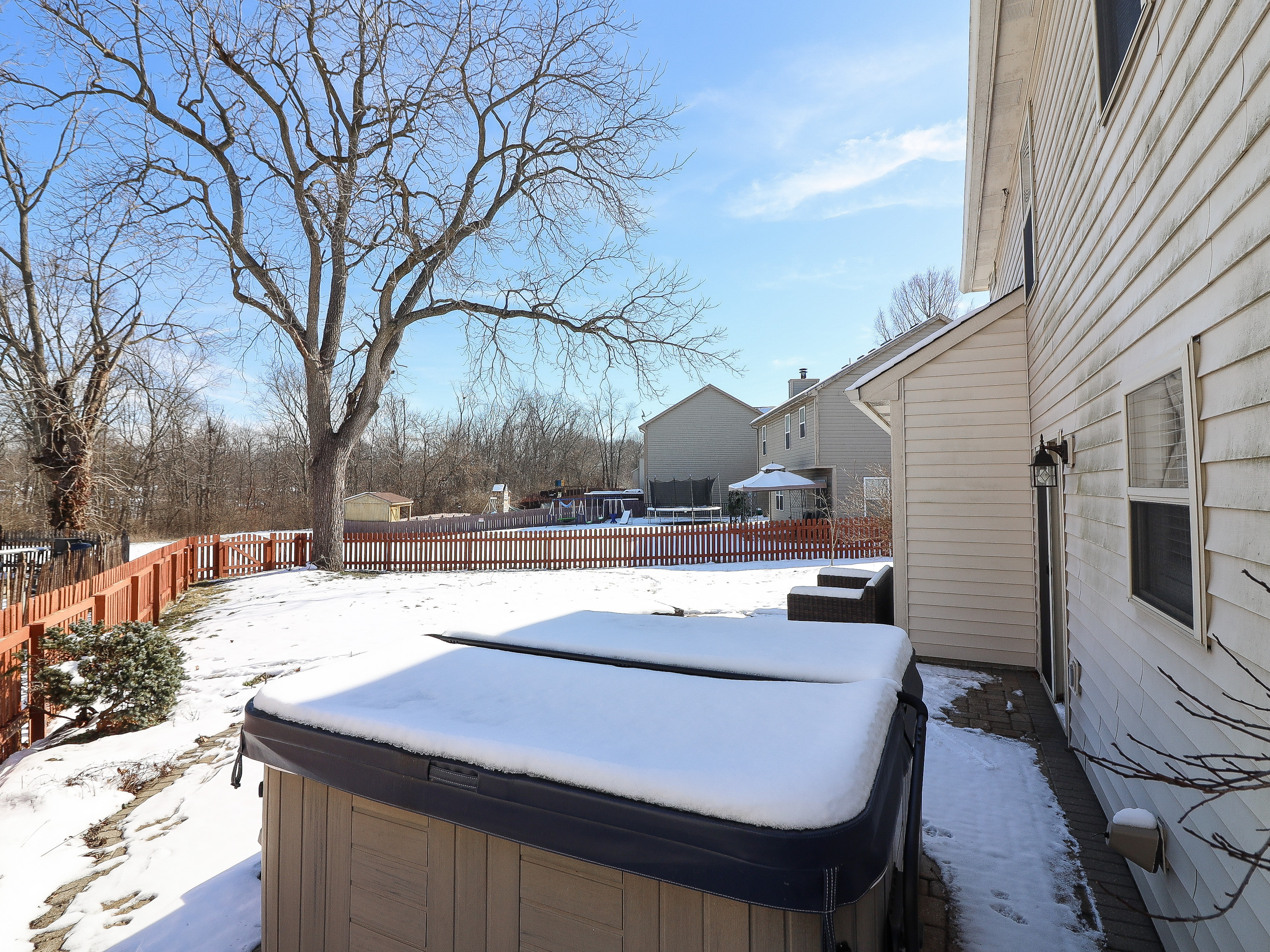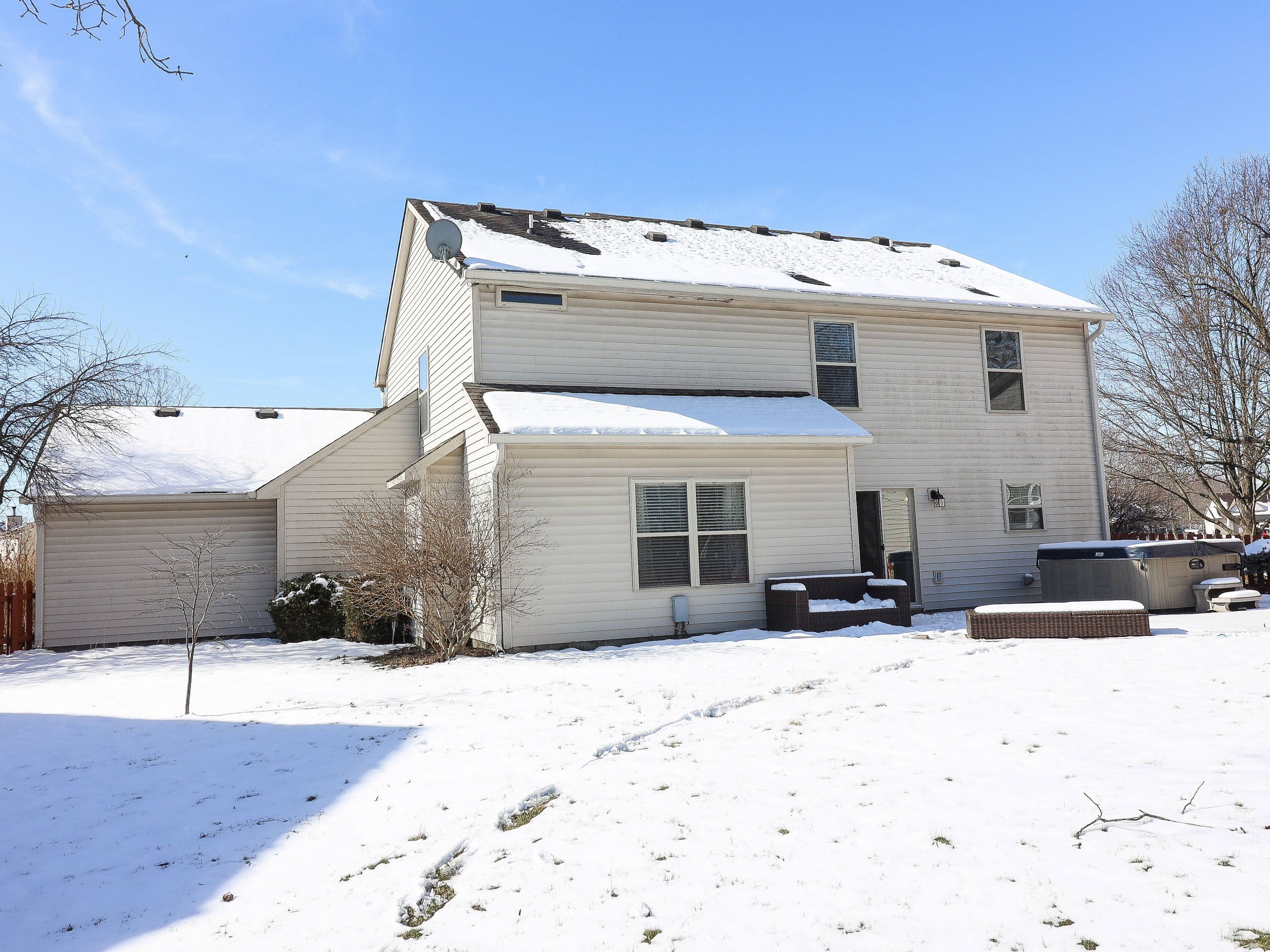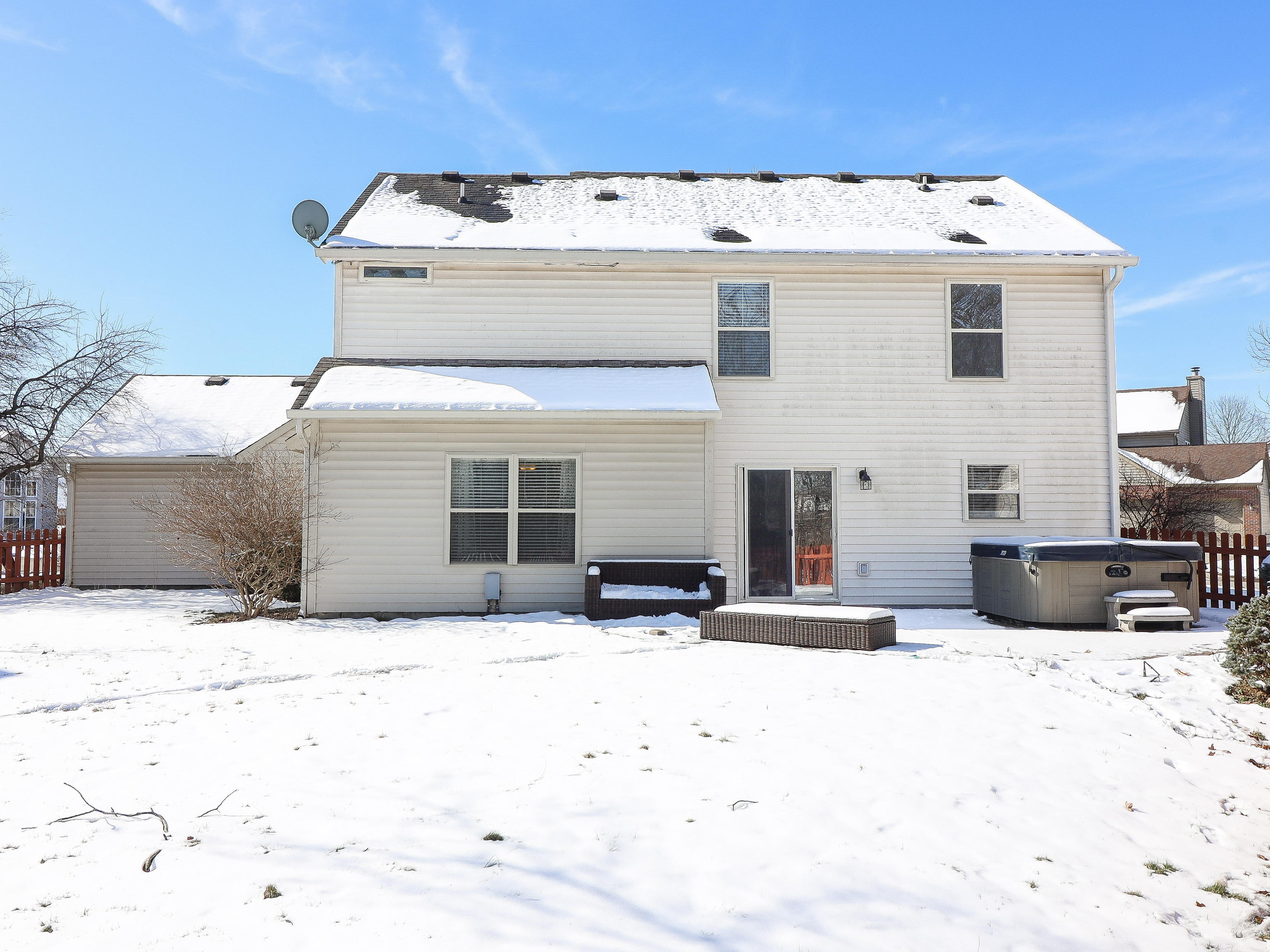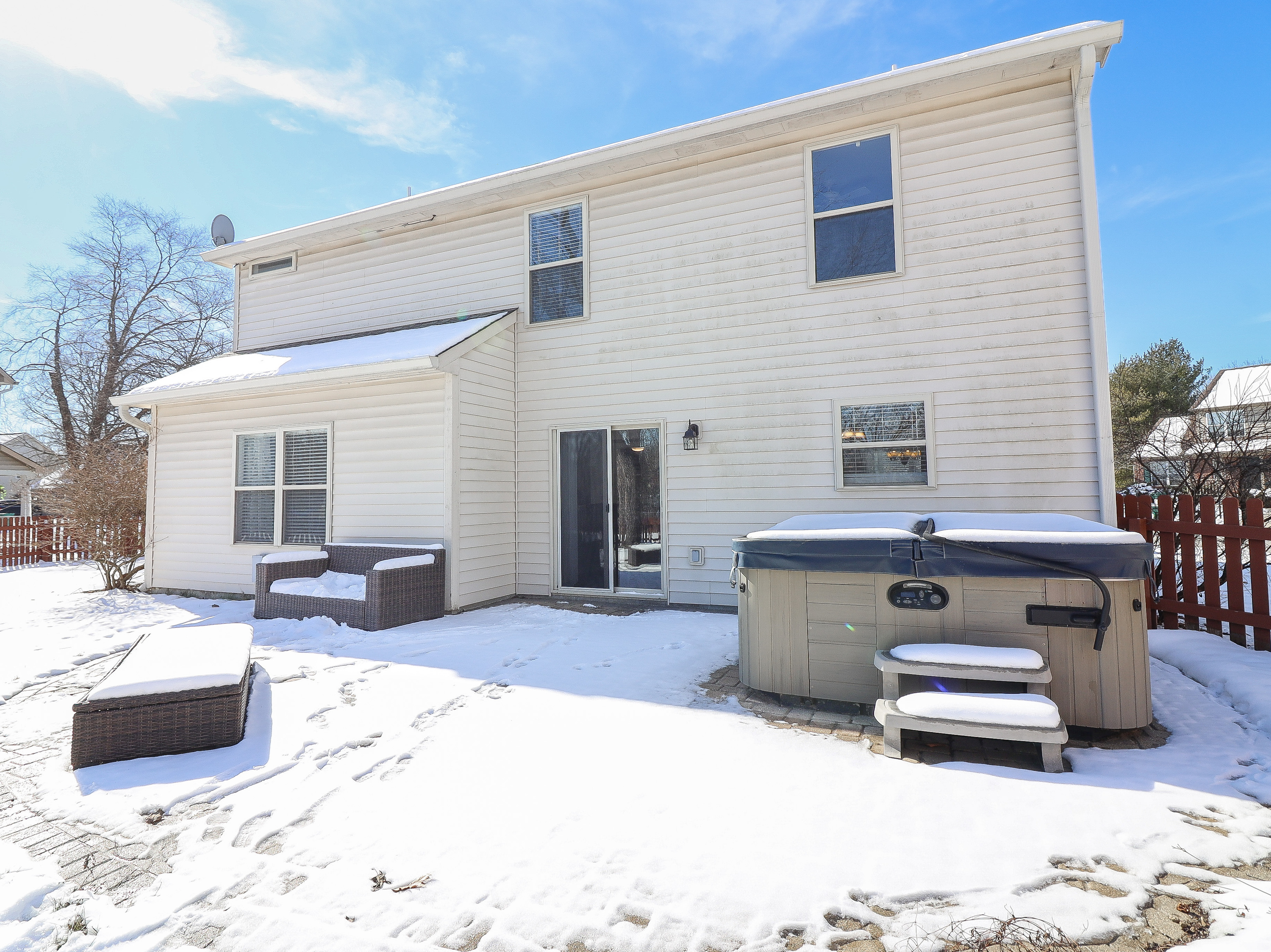 Impeccably maintained and move-in ready! This stunning 3 bed, 2.5 bath home boasts a grand 2-story foyer, formal dining room, and cozy great room with a gas fireplace. The gourmet kitchen features an island, breakfast bar, pantry, and appliances. Retreat to the master suite with a luxurious soaking tub, tiled flooring, and a spacious walk-in closet. Enjoy the versatility of the open loft for an office, den, or playroom. Recent upgrades include new carpeting throughout (2017), vinyl plank flooring in entry, kitchen, and breakfast room (2018), and LED lighting (2019). Additional features include a new central AC unit (2020), furnace (2018), and an oversized 3-car attached garage. Relax in the hot tub on the gorgeous brick paver patio in the private fenced rear yard on this corner lot, with common space behind for added privacy. Prepare to be impressed by this exceptional home!