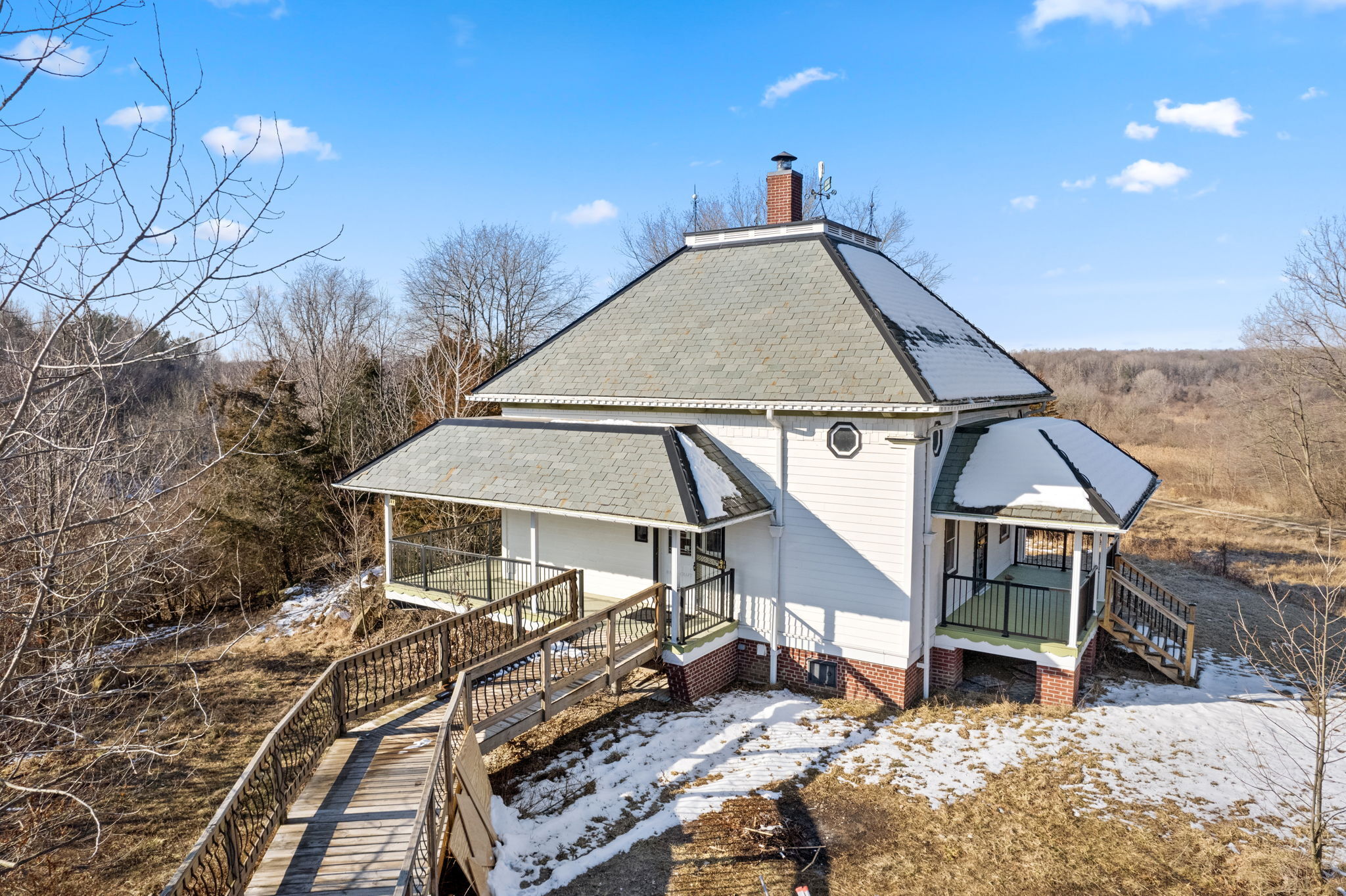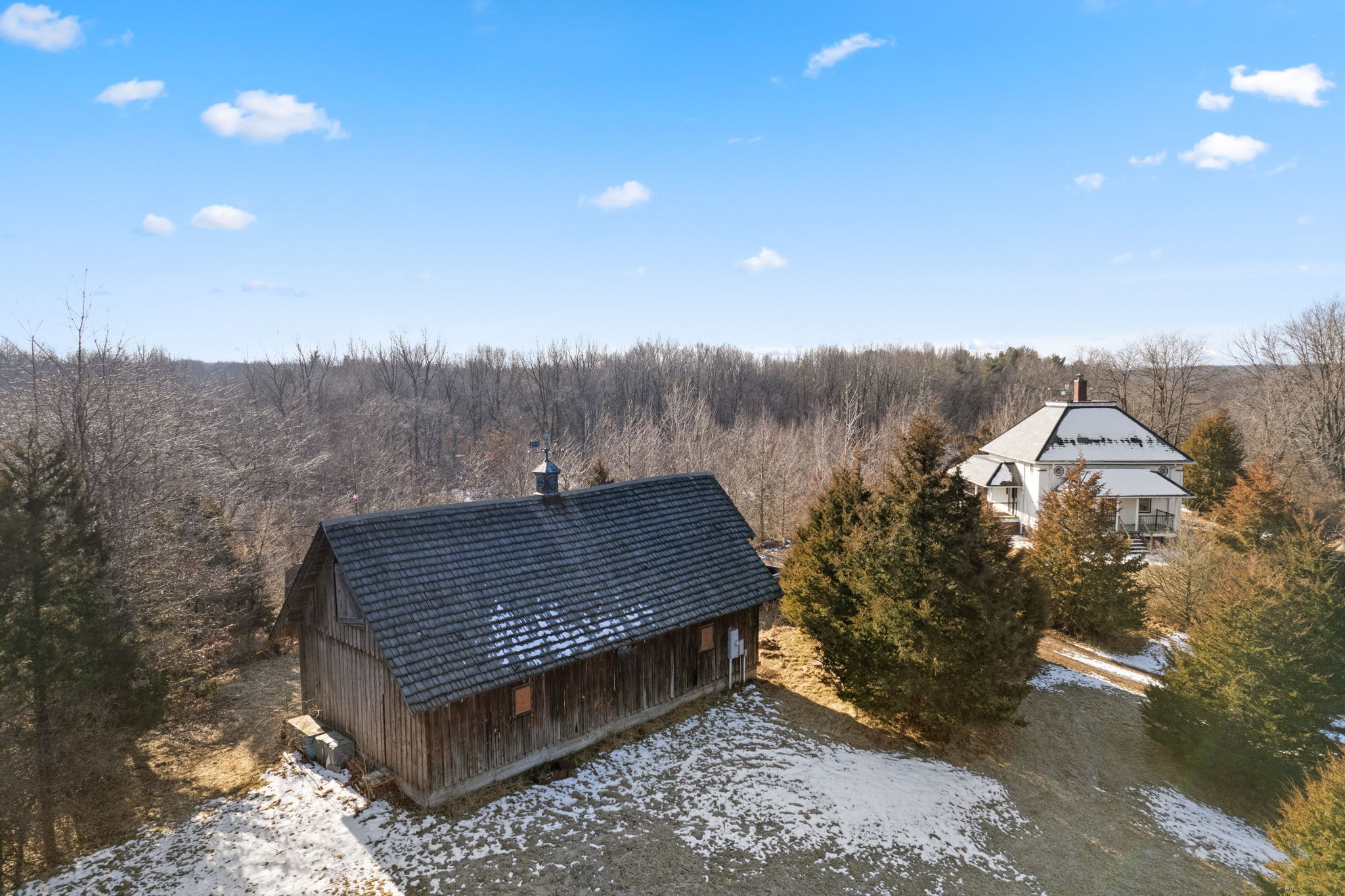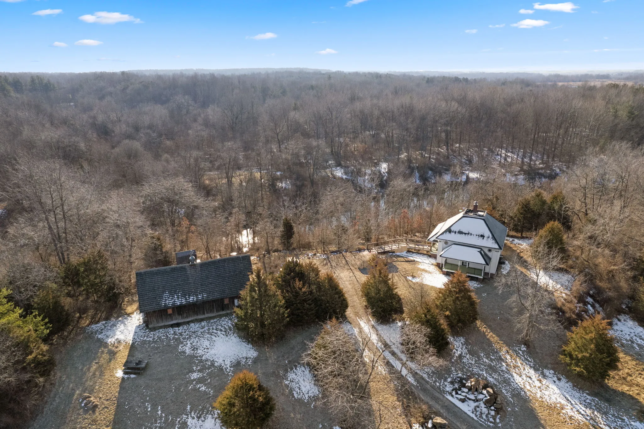 One-of-a-kind home that comes with a slate roof, high domed ceiling surrounds large spacious loft, exposed industrial beam as well as striking views. Large walk-in shower with beautiful 7′ soaker tub. All fixtures in bathroom are copper. All new LVP, and all new wood trim arched antique doors on main level make the home unique. Bedroom on the main floor. The kitchen is open with new solid wood cabinets, new countertops, refrigerator, stove, black appliances. Large, finished basement with a full bath and laundry room. The basement can be used as a bedroom that sliding glass doors that opens to a brick patio. Large Porch that overlooks Croppy Lake and the beautiful land. Large barn with awesome spacious loft area, concrete floors and electric. Barn has a unique custom door with a puzzle lock functionality.