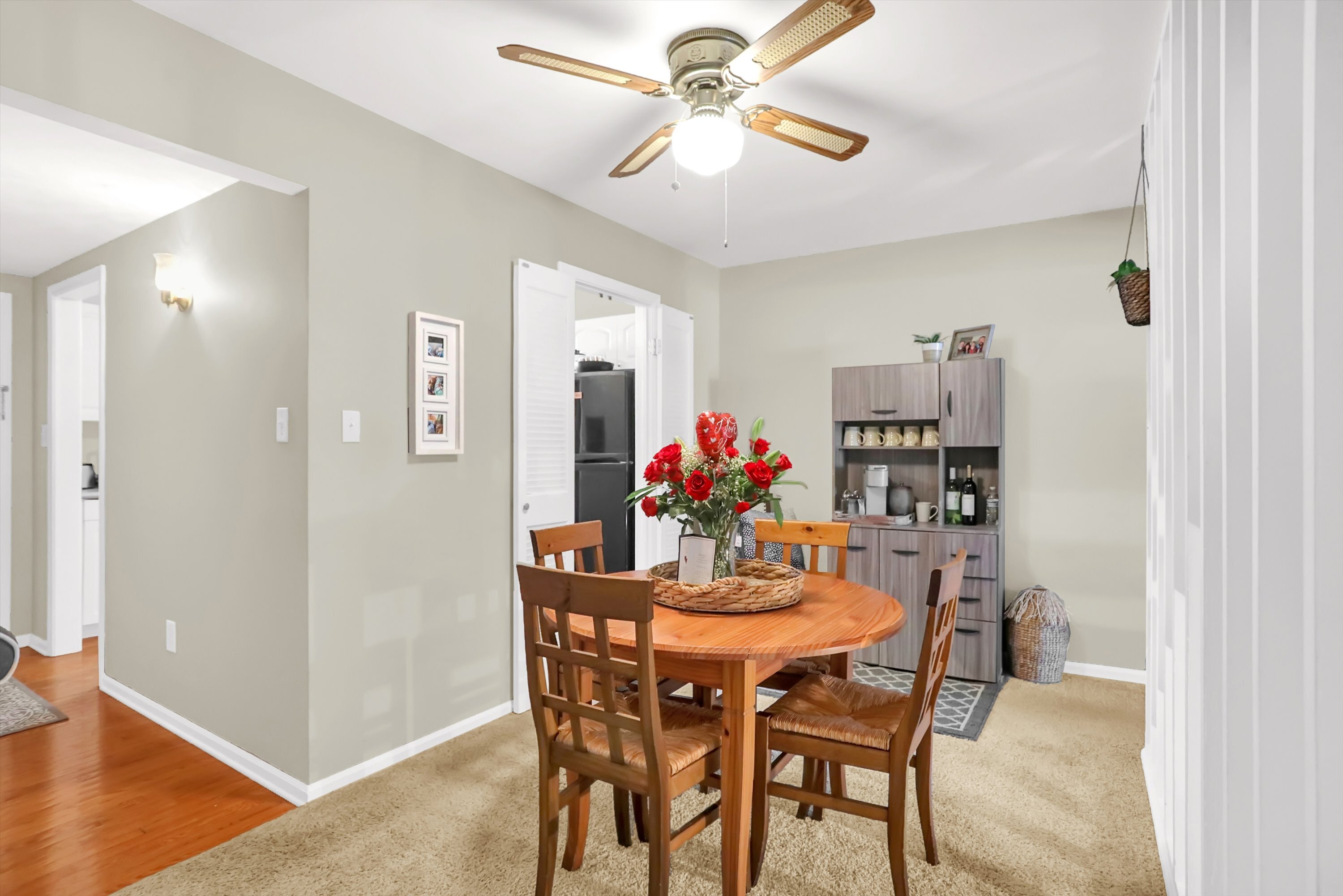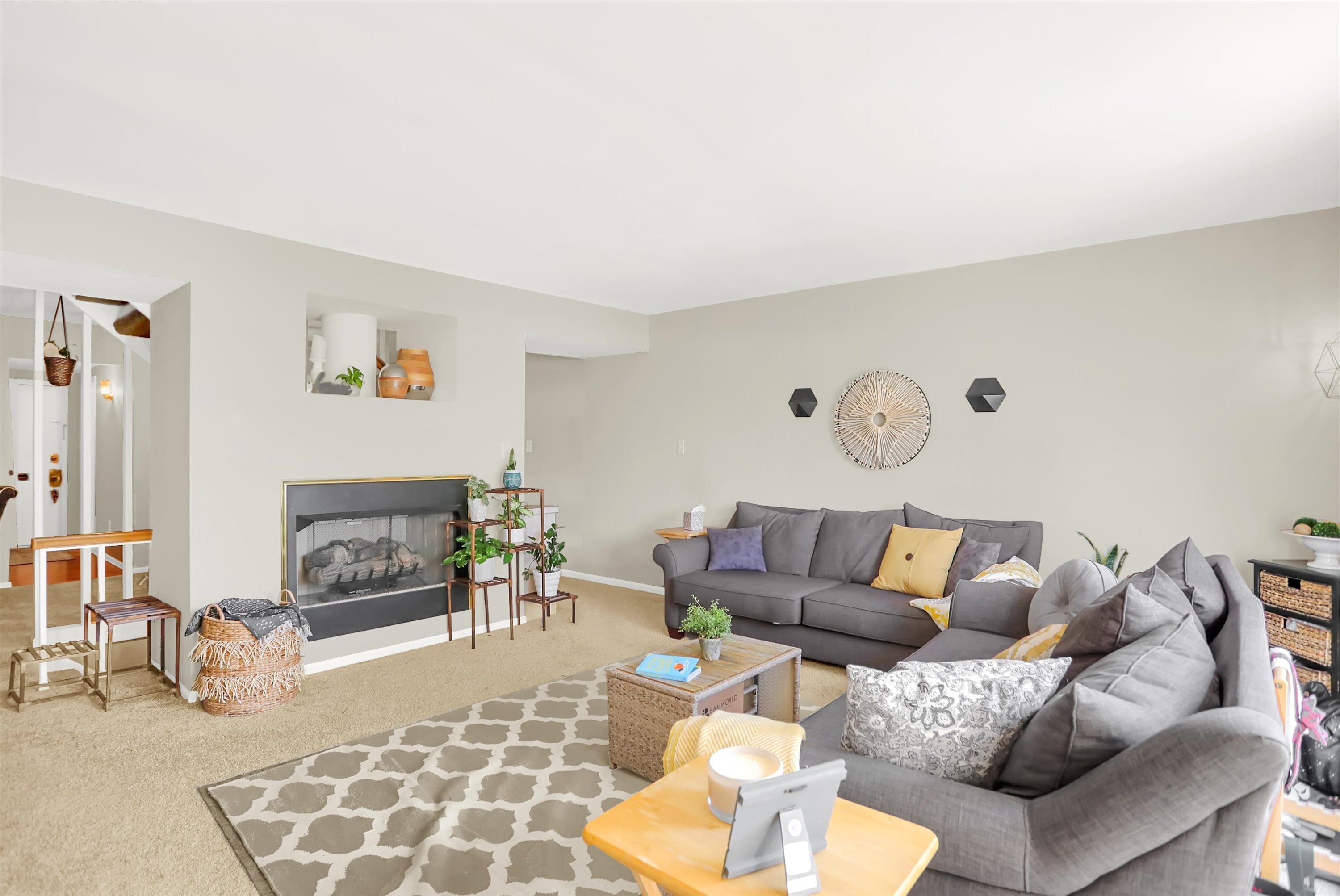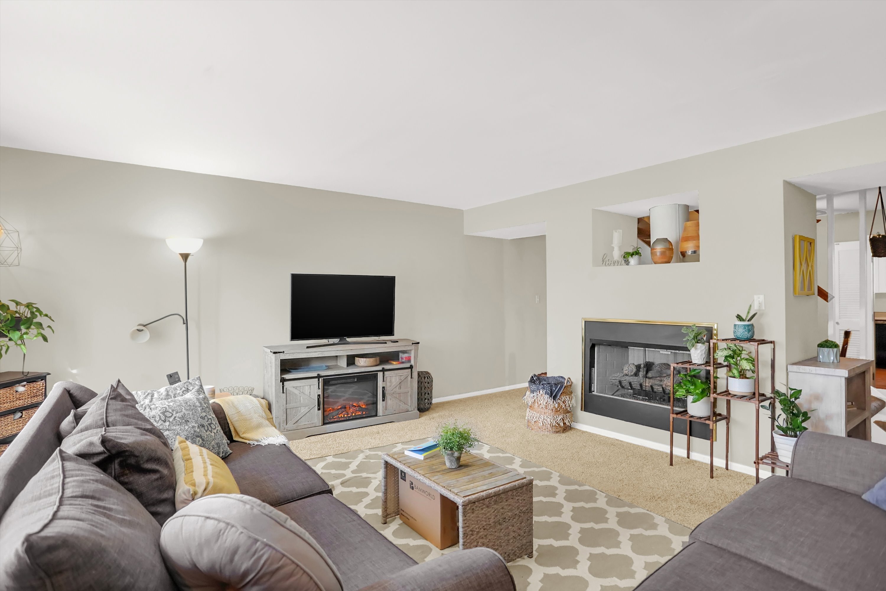 Fantastic 3BR/2.5BA townhouse for rent just minutes from downtown Carmel’s Arts & Design District! Updated carpet & paint can be found thru-out this over 2,200 sq ft home. Main level features spacious living room with fireplace and access to backyard. Dining area with modern beamed wall bring in extra natural light. The kitchen with white cabinets, half bathroom and foyer feature hardwood floors and chrome fixtures. Floating staircase leads to primary suite with private bathroom and walk-in closet. Upper level also features two more large bedrooms & second full bathroom. Large finished basement has lots of space for entertaining & play and garden level window. Large laundry room has loads of storage too. Enjoy warmer weather on the back patio with privacy fence & storage shed. Behind the property is green space for walking pets or for play. Assigned carport and guest parking available too. This community also features a clubhouse with swimming pool. Amazing location near dining, nightlife, grocery, the Monon Trail, public library & Carmel Schools! Walk or bike to Carmel’s Midtown or the Arts and Design District!