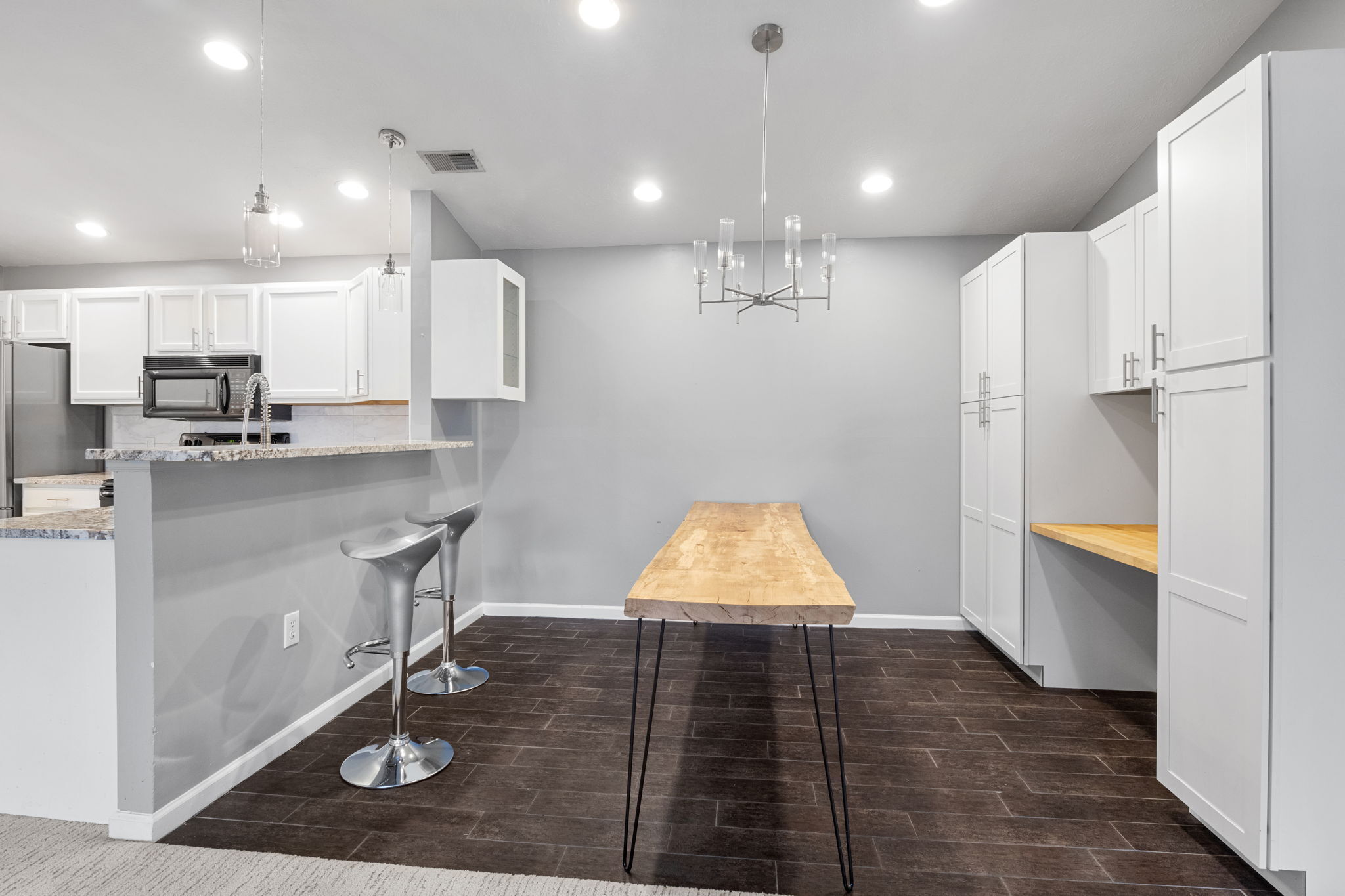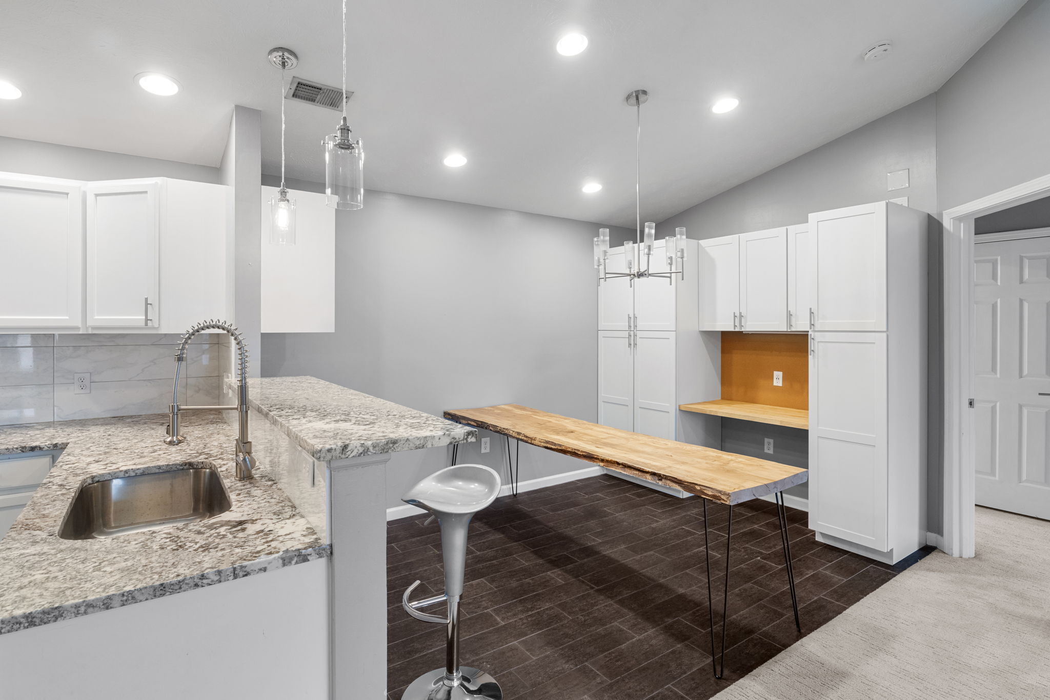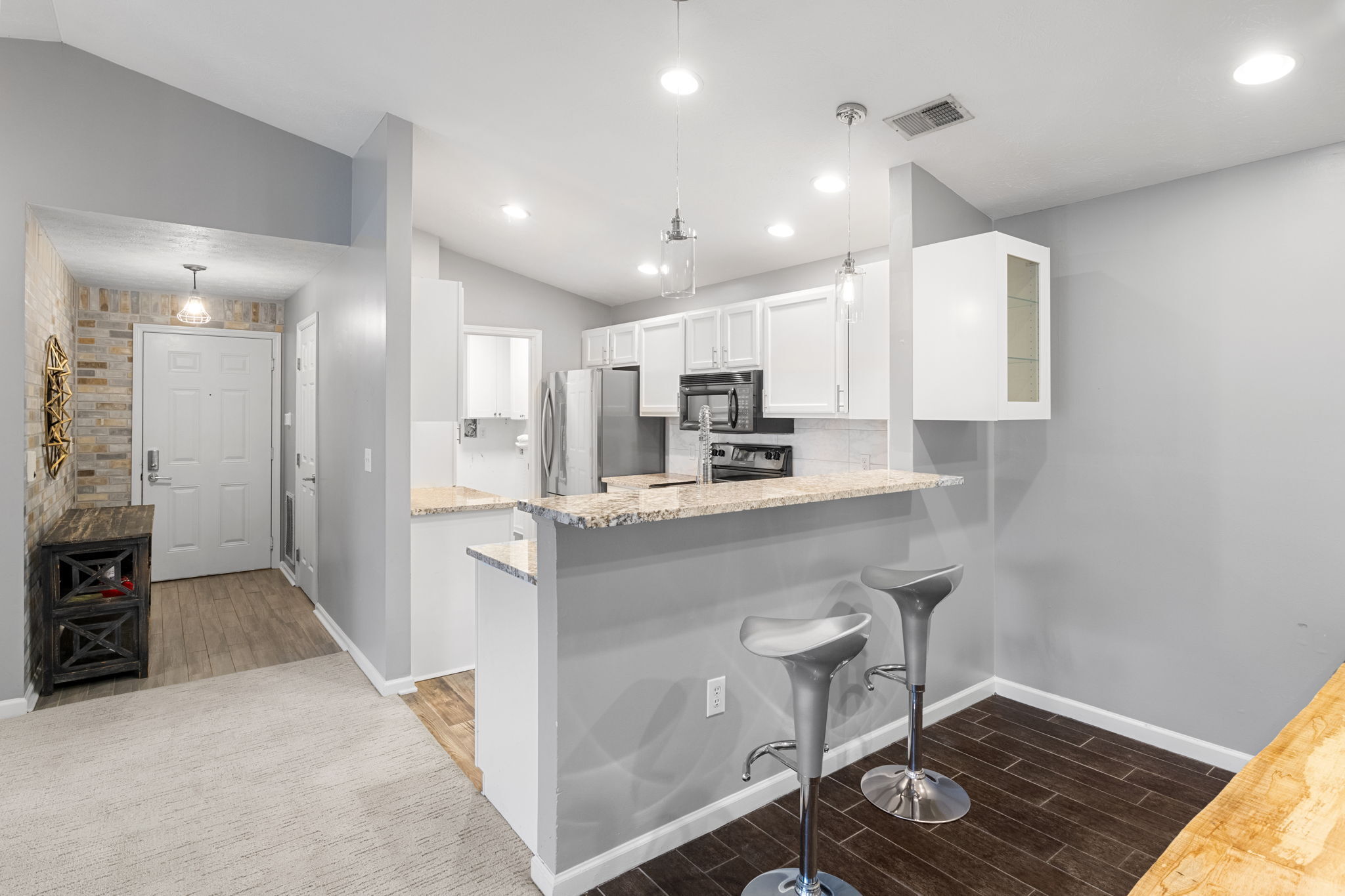 One of a kind two bedroom/ 2 bath with loads of updates. Kitchen updates include granite counter tops, new pulls, and painted cabinets. Custom faux painted brick entry, upgraded down lighting, custom tile shower/floor, 2 rainmaker shower heads, and heated master bath floor. New water heater in 2021, custom built in bunk beds w/shelving & storage, vaulted ceilings, HVAC less than 6 years old, custom built office space & liquor cabinet, walk-in closet w/built-in shelving & shoe racks, carpet and vinyl plank new in 2021. What’s not top love about this! The HOA of $283 includes sewer, water and trash. So not a bad deal! Intercom system to buzz in guest for extra security!