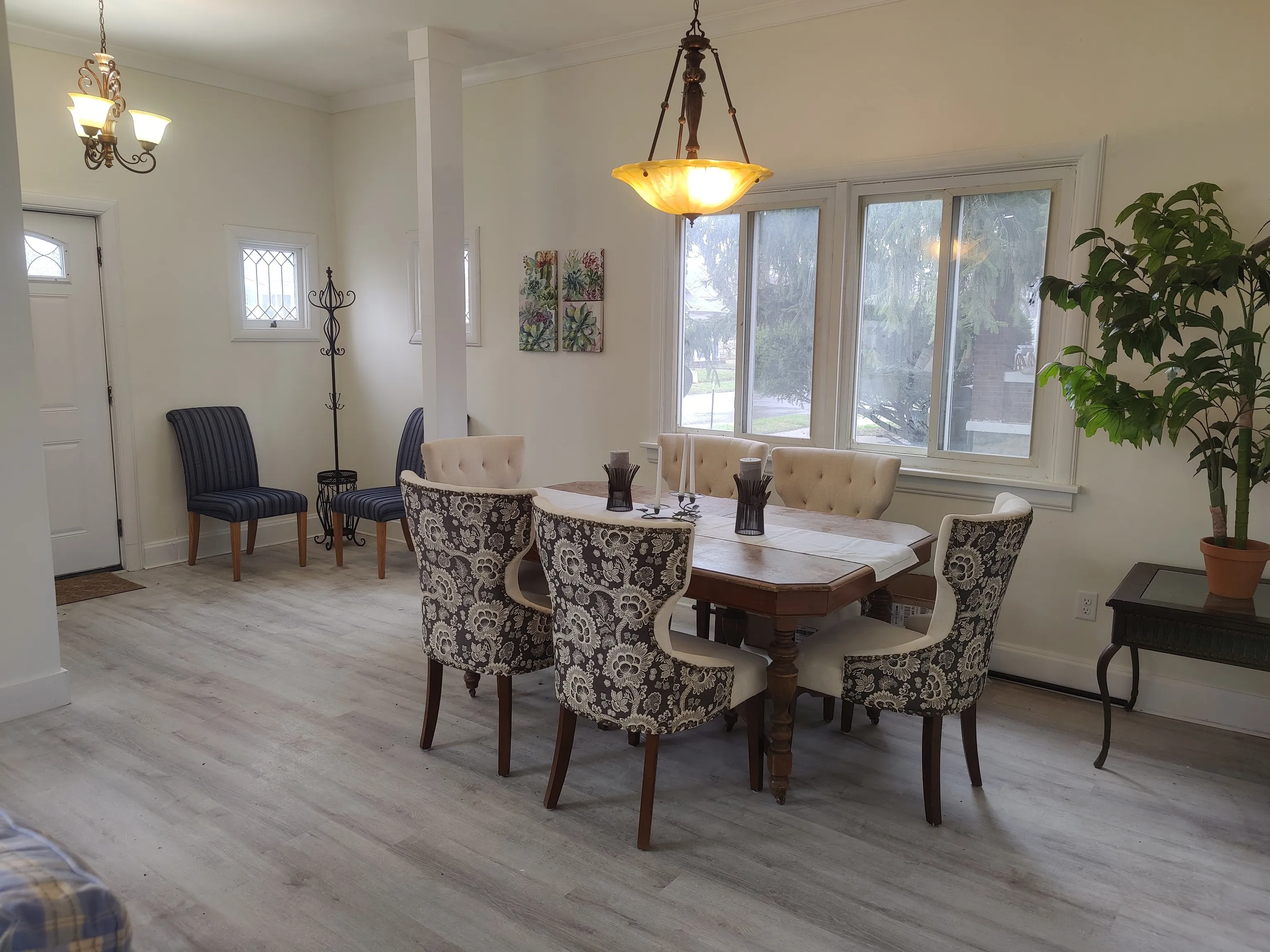 Spectacular renovation created the perfect family floorplan. 9′ ceilings in the open living, dining and foyer area, 15’+ ceiling in the central kitchen. Tons of daylight through oversized windows. Lots of original leaded glass accent windows, wood burning fireplace accented by original art deco side vents and flanked with built in bookshelves. New Furnace, hot water heater, sump pump, electrical, plumbing, kitchen stainless appliances, kitchen cabinets, vanities, plumbing fixtures, flooring, paint, and hardware throughout. New 2 car metal garage with 2 overhead doors. Brick paver patio at back with antique bricks stamped “1893” Basement has ample storage. All furniture & decor stays unless buyer prefers it be removed. This house has good energy!