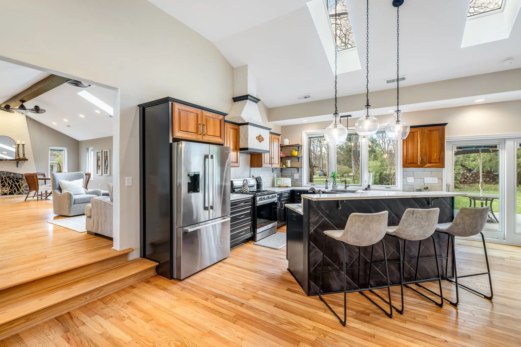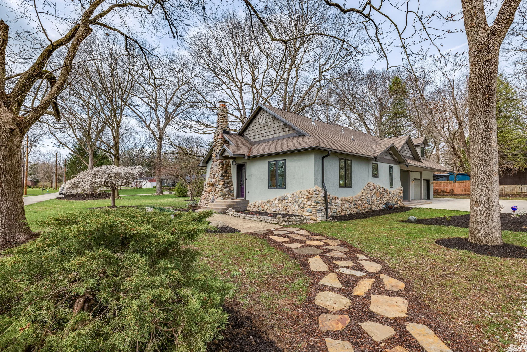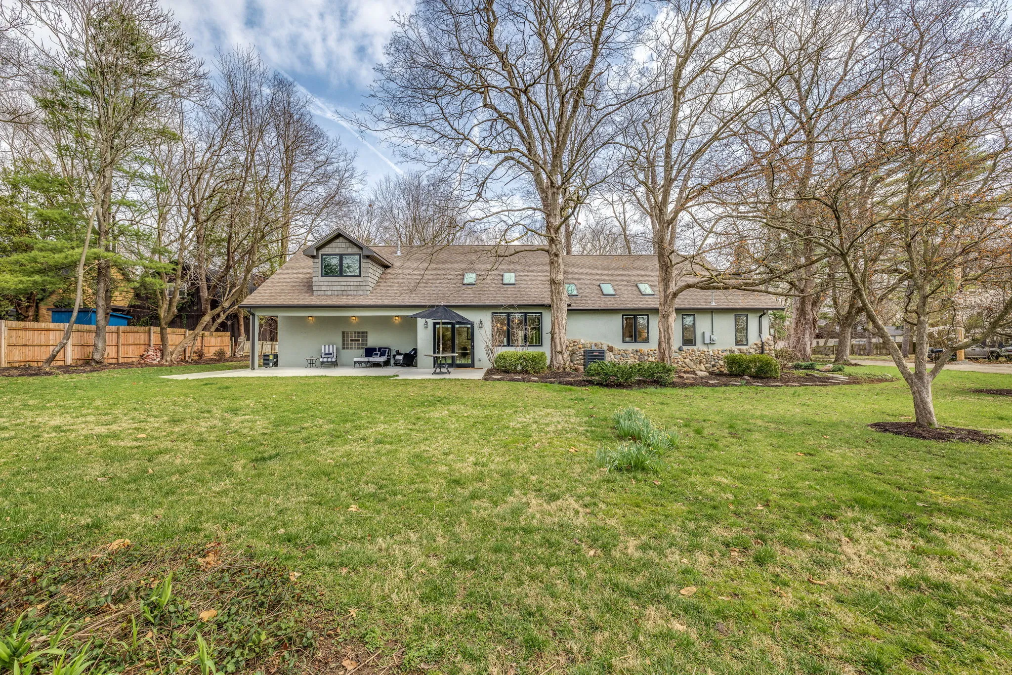 The seller is motivated! Completely updated inside and out, this fully remodeled home is inviting with an open floor plan, vaulted ceilings, tons of natural light, and added character throughout, on over half an acre! From the real hardwoods to the Pella windows with built-in shades, the owner spared no expense in remodeling this home. The kitchen has all new custom cabinetry with soft close doors, Calacatta Quartz countertops with countertop seating, dual sinks, and all new appliances. The hearth room’s fireplace has been completely restored and the vaulted ceilings, wall of windows and skylights, make it perfect for a combined living and dining room. When you walk-in, you will understand how these words don’t capture the warm, inviting, and open feel of this room. On the main level, you will find an ensuite with a beautiful bathroom featuring a tiled shower with 3-way diverter rain shower head, an additional bedroom/office, a second full hallway bath, and a dedicated laundry room. Upstairs, the primary suite is huge with custom built-ins which blend in as art, a custom bathroom with high-end finishes including the rain shower head, a walk-in closet, and a private balcony. The HVAC for the main level and upstairs are separate for Zone controls. The unfinished basement is perfect for storage. The lot is over half an acre, with a large concrete patio for outdoor dining and relaxation with a covered area for enjoying nature and the beautiful landscaping. It’s truly an oasis! And, it’s also a short walk to the Monon Trail and White River!