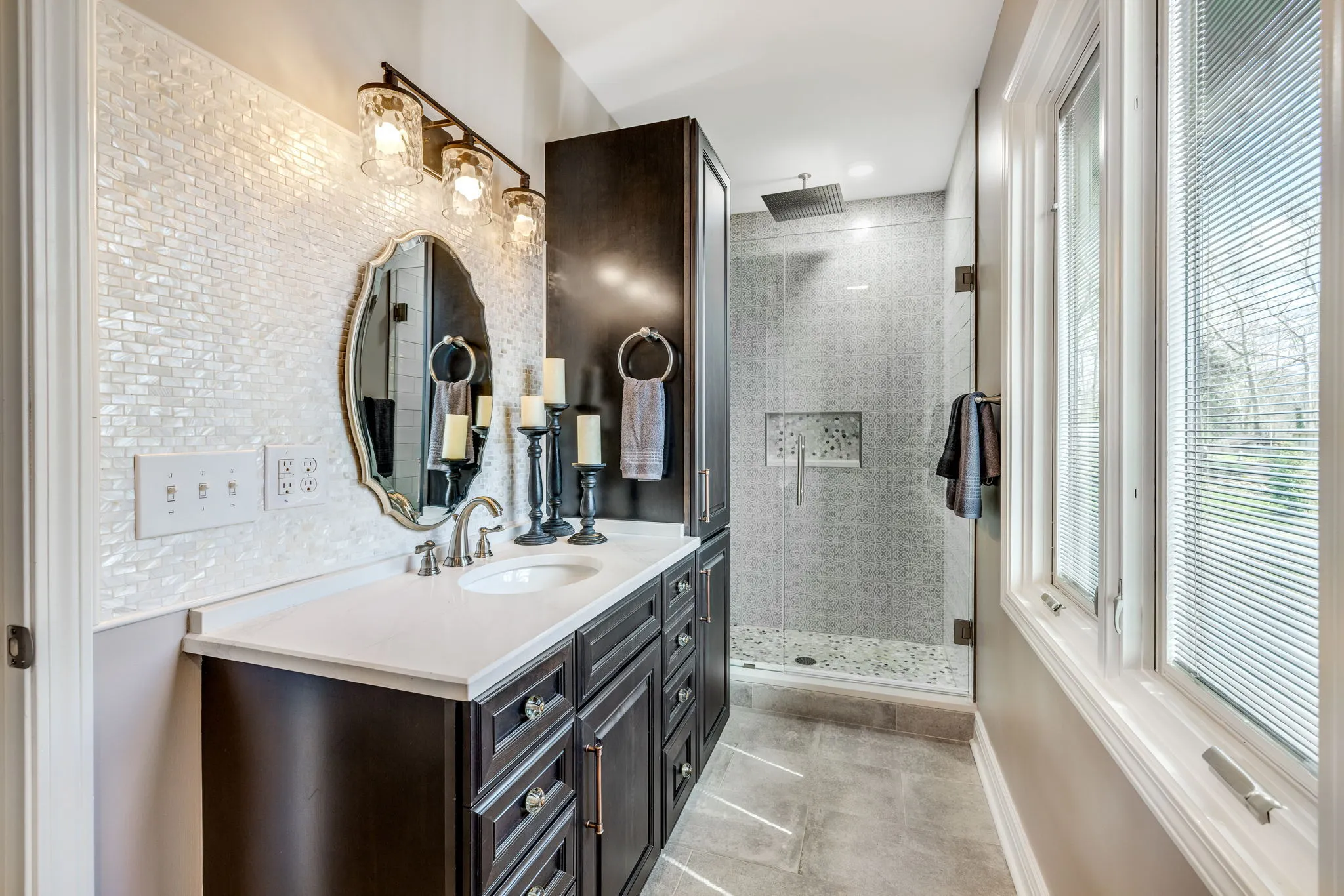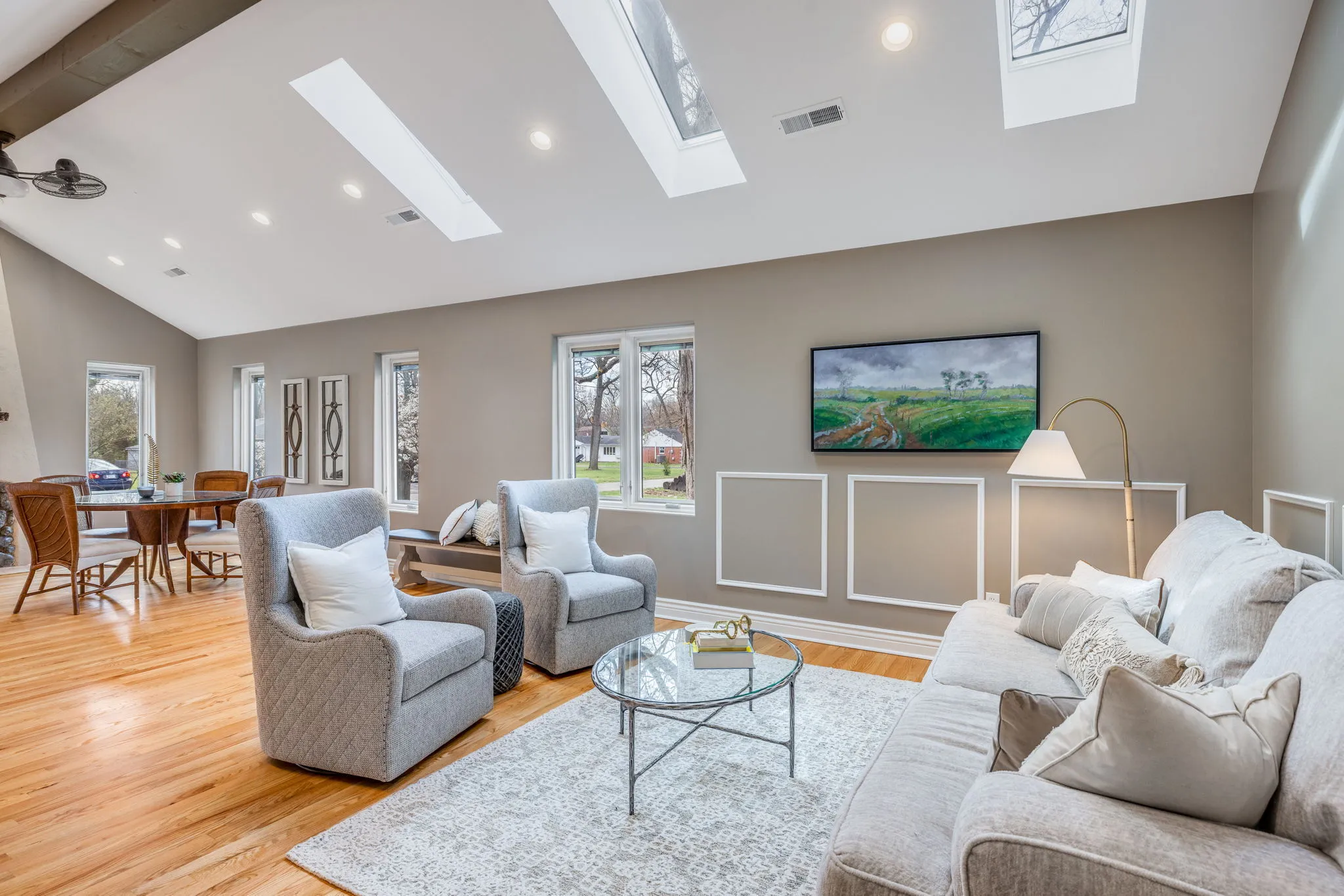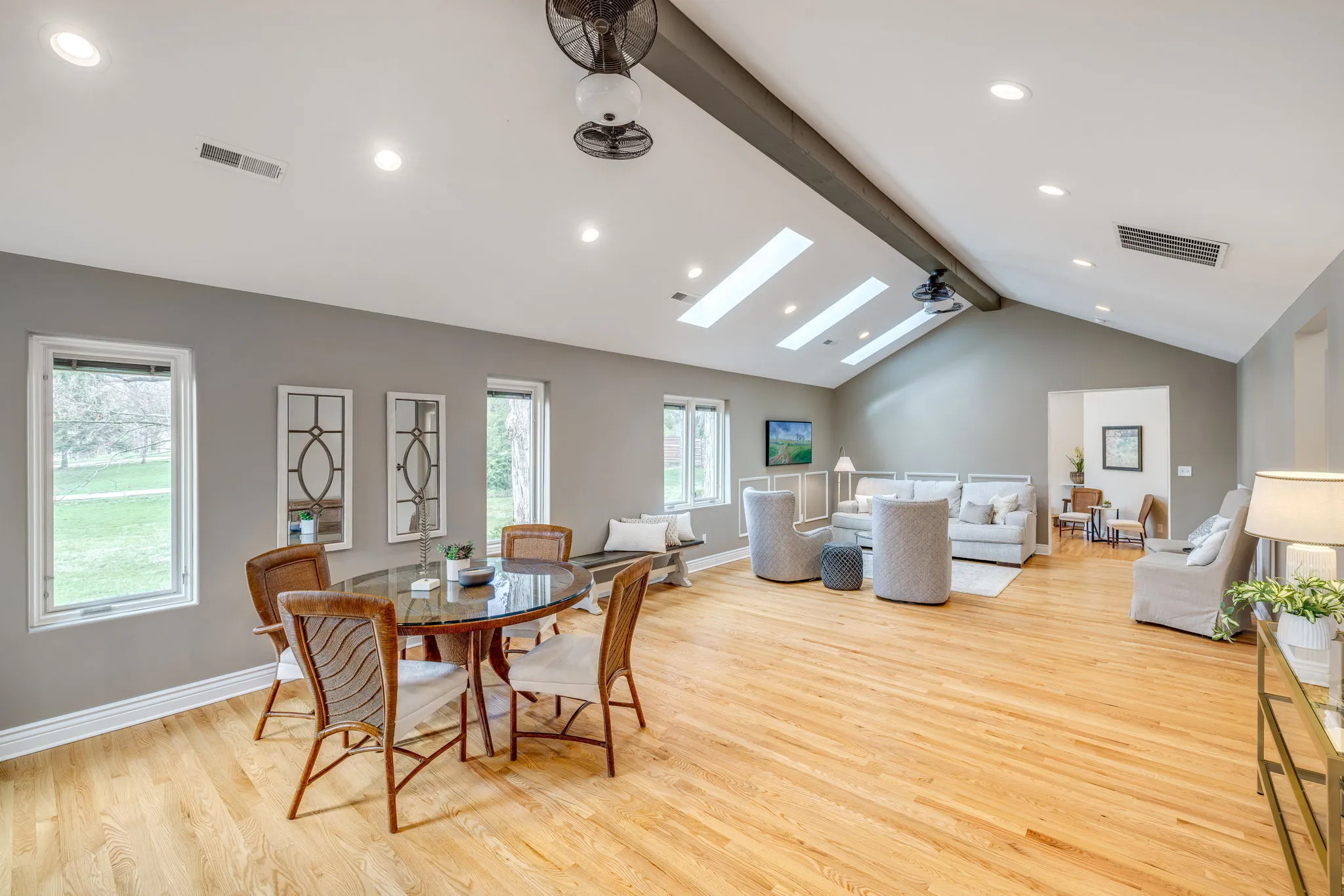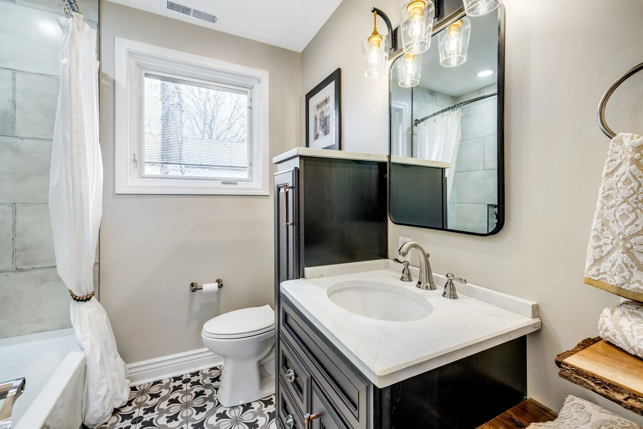 The seller is motivated! Completely updated inside and out, this fully remodeled home is inviting with an open floor plan, vaulted ceilings, tons of natural light, and added character throughout, on over half an acre! From the real hardwoods to the Pella windows with built-in shades, the owner spared no expense in remodeling this home. The kitchen has all new custom cabinetry with soft close doors, Calacatta Quartz countertops with countertop seating, dual sinks, and all new appliances. The hearth room’s fireplace has been completely restored and the vaulted ceilings, wall of windows and skylights, make it perfect for a combined living and dining room. When you walk-in, you will understand how these words don’t capture the warm, inviting, and open feel of this room. On the main level, you will find an ensuite with a beautiful bathroom featuring a tiled shower with 3-way diverter rain shower head, an additional bedroom/office, a second full hallway bath, and a dedicated laundry room. Upstairs, the primary suite is huge with custom built-ins which blend in as art, a custom bathroom with high-end finishes including the rain shower head, a walk-in closet, and a private balcony. The HVAC for the main level and upstairs are separate for Zone controls. The unfinished basement is perfect for storage. The lot is over half an acre, with a large concrete patio for outdoor dining and relaxation with a covered area for enjoying nature and the beautiful landscaping. It’s truly an oasis! And, it’s also a short walk to the Monon Trail and White River!
