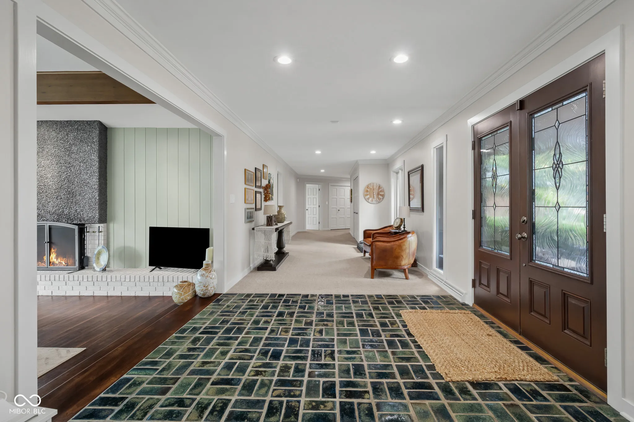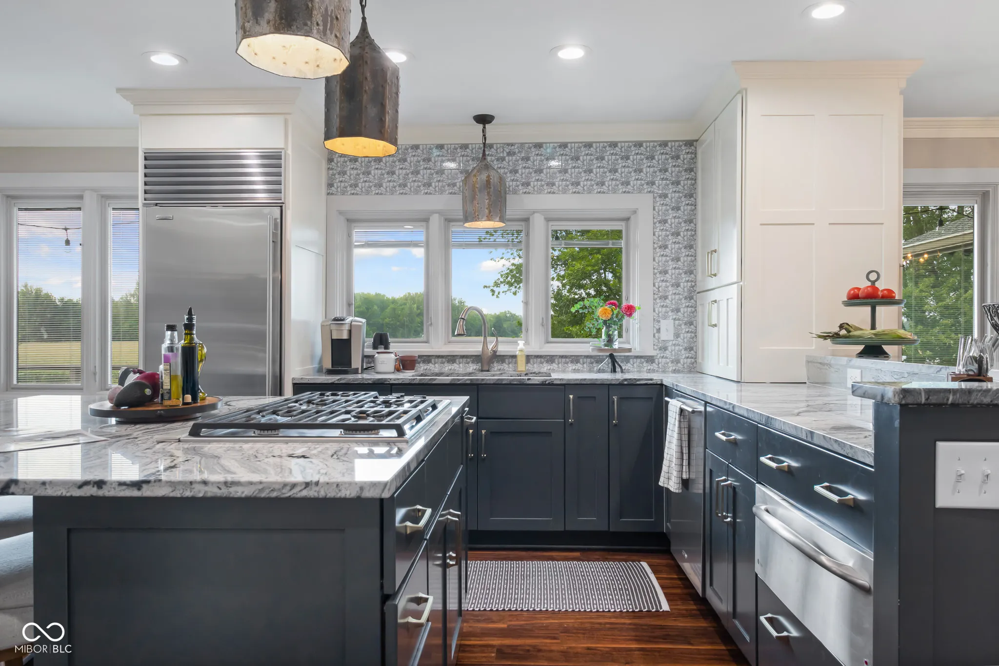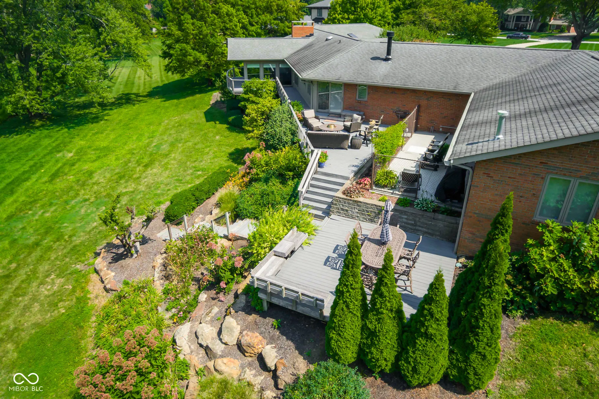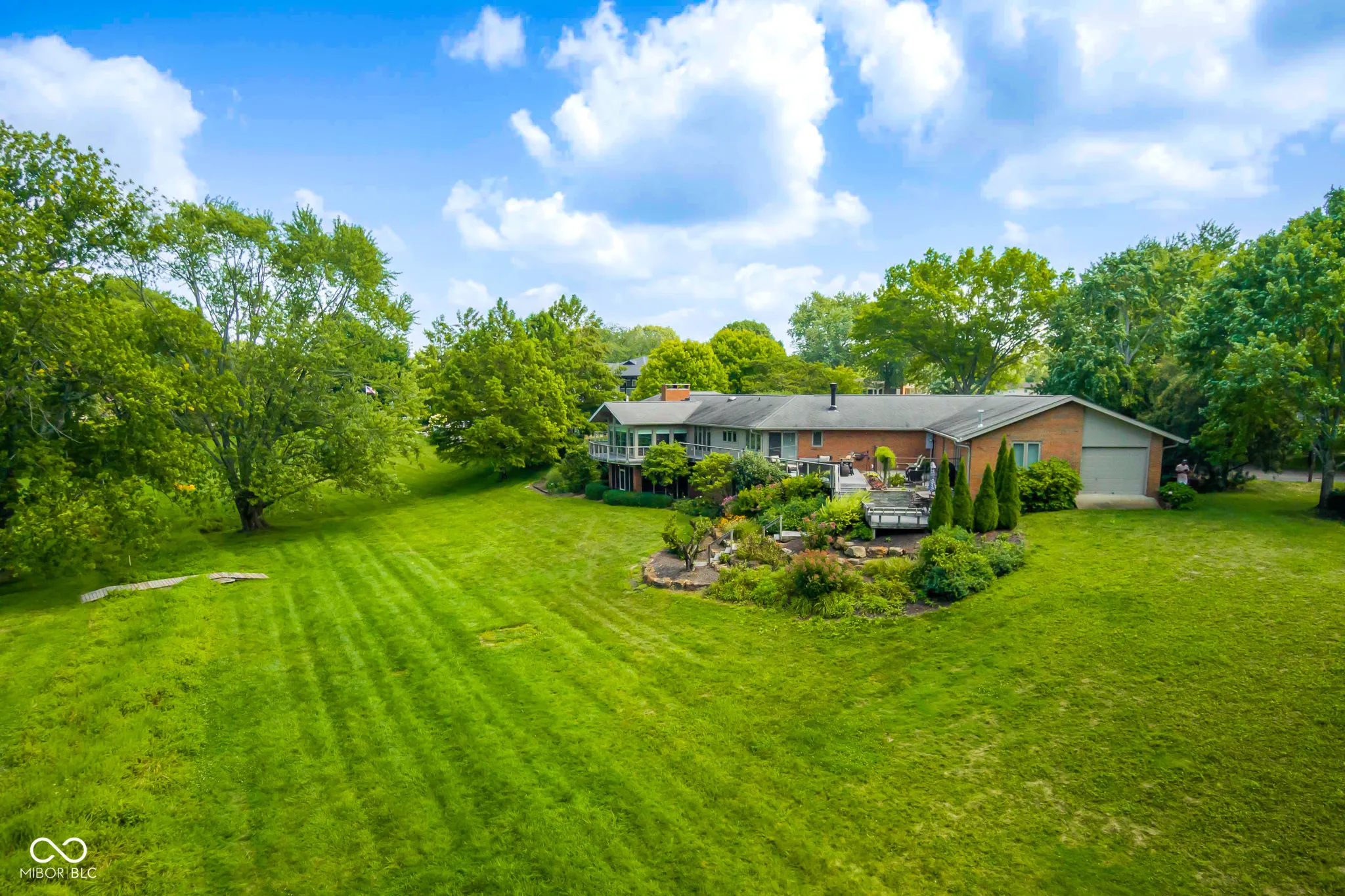 Fabulous, updated executive home on almost 2 acres overlooking the bluff on North Riverside Drive. Large ranch with finished walk out lower level. 5 bedrooms, 2 kitchens, attached garage that will hold 7 cars. Home has been completely updated throughout with new flooring, lighting, paint, kitchens, baths, and more. MAIN LEVEL-Brick, covered front porch leads to double doors that open to a 28×10 Entry. Living room has unique brick/stone FP, large windows overlooking the expansive rear lawn. Main level kitchen has 2 Sub-Zero refrigerators, Wolf Cooktop, Cove dishwasher, warming drawer, and granite along with a Breakfast area with fireplace, and a center island with Breakfast bar. Large Primary bedroom has large attached bath with tile shower, dbl bowl vanity w/quartz counter, walk in closet. Hall bath has split plan with single and double bowl vanities with quartz counters. Dining Room features built in cabinet wall that is great for entertaining. Breakfast room has stone fireplace. Library w/Oak flooring, wood paneling and built in shelves. Unique brick accent, circular stairway leads to the LOWER LEVEL- features huge great room and Rec Rm w/Brick FP, 2nd kitchen, exercise room, 2 bedrooms, bath, 15×13 screened porch. Large deck that extends the length of home in the rear overlooks the sweeping, manicured lawn, and provides lots of seating area for viewing wildlife, enjoying an evening sunset, or outdoor entertaining. See attached list of updates, extras.