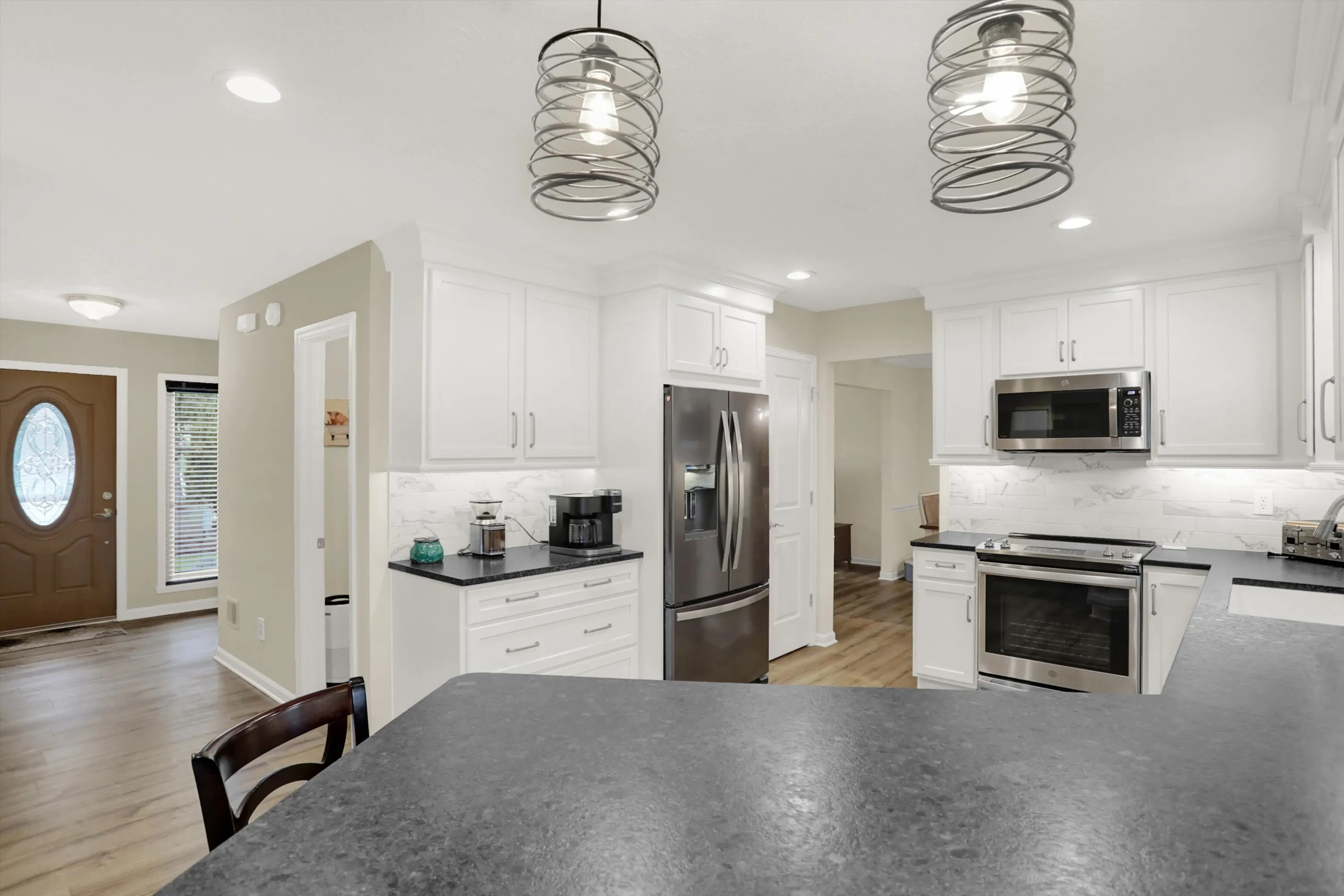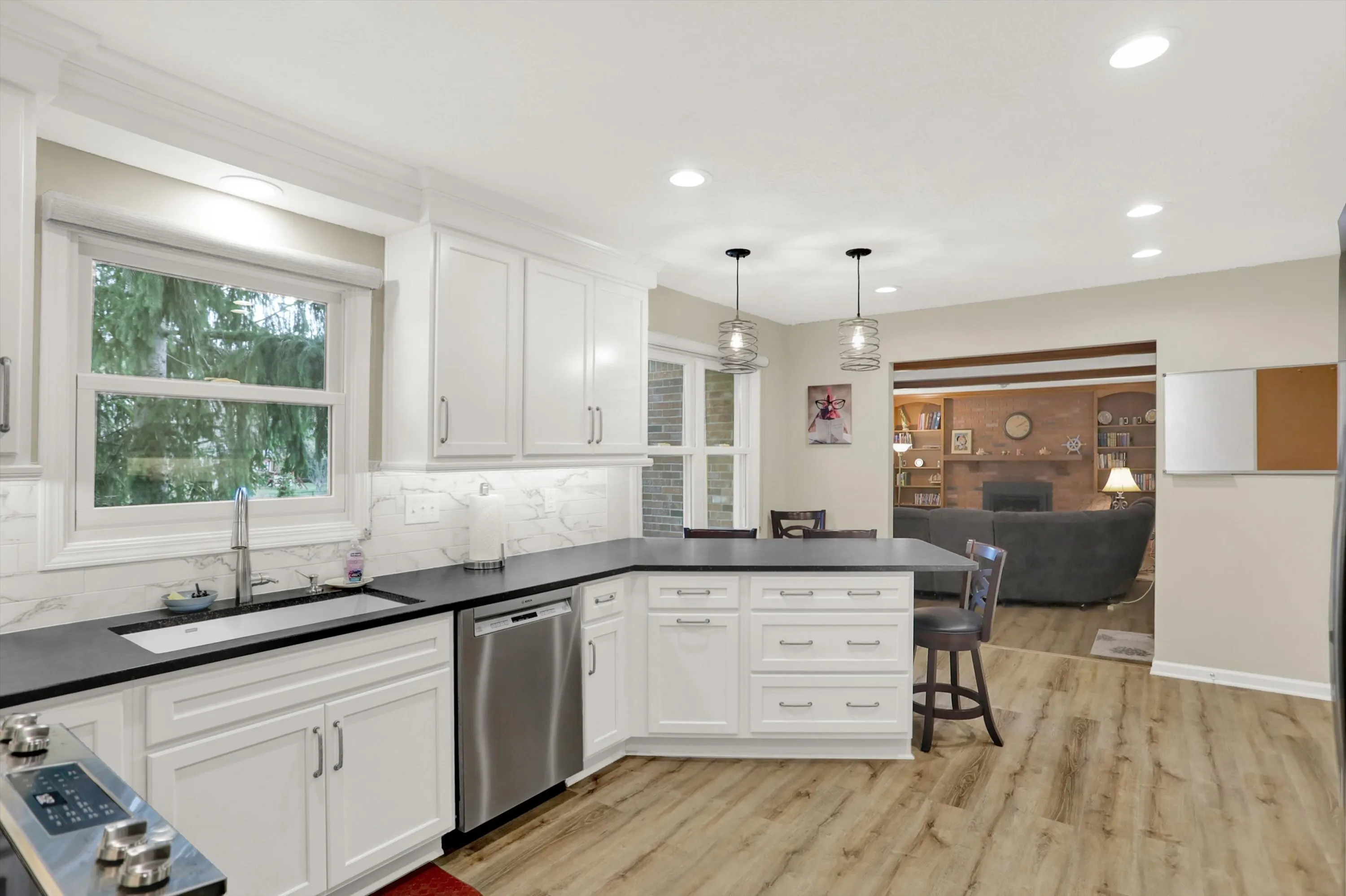 Nestled in the heart of Carmel, Indiana, on a tranquil cul-de-sac, this charming two-story residence exudes warmth and modernity. Boasting four bedrooms, two and a half baths, and a meticulously updated interior, this home offers the epitome of comfort and style. As you approach, the curb appeal is evident, with lush, mature landscaping framing the exterior. The wedge-shaped lot provides ample space and privacy, creating a serene oasis within a bustling neighborhood. Upon entry, you are greeted by a welcoming foyer that leads seamlessly into the main living areas. The downstairs has been completely renovated, showcasing contemporary finishes and an open-concept design. Gleaming hardwood floors flow throughout, complemented by fresh neutral tones that create an airy ambiance. The gourmet kitchen is a chef’s delight, featuring stainless steel appliances, granite countertops, and ample cabinetry for storage. A spacious island offers additional prep space and doubles as a casual dining area, perfect for morning coffee or quick meals on the go. The kitchen overlooks the cozy family room, complete with a fireplace, creating an ideal space for entertaining or simply relaxing with loved ones. Upstairs, the four bedrooms provide plenty of room for the whole family to spread out and unwind. The master suite is a luxurious retreat, boasting a spa-like ensuite bath with dual sinks and a large shower. Three additional bedrooms share a well-appointed full bath, ensuring comfort and convenience for all. Outside, the backyard beckons with its expansive patio, ideal for al fresco dining or enjoying the serene surroundings. The hardy landscaping requires minimal maintenance, allowing you to spend more time enjoying the outdoors. Located in the highly sought-after Carmel school district, this home offers access to top-rated schools and a vibrant community atmosphere. With its prime location, modern updates, and abundant charm, this property truly