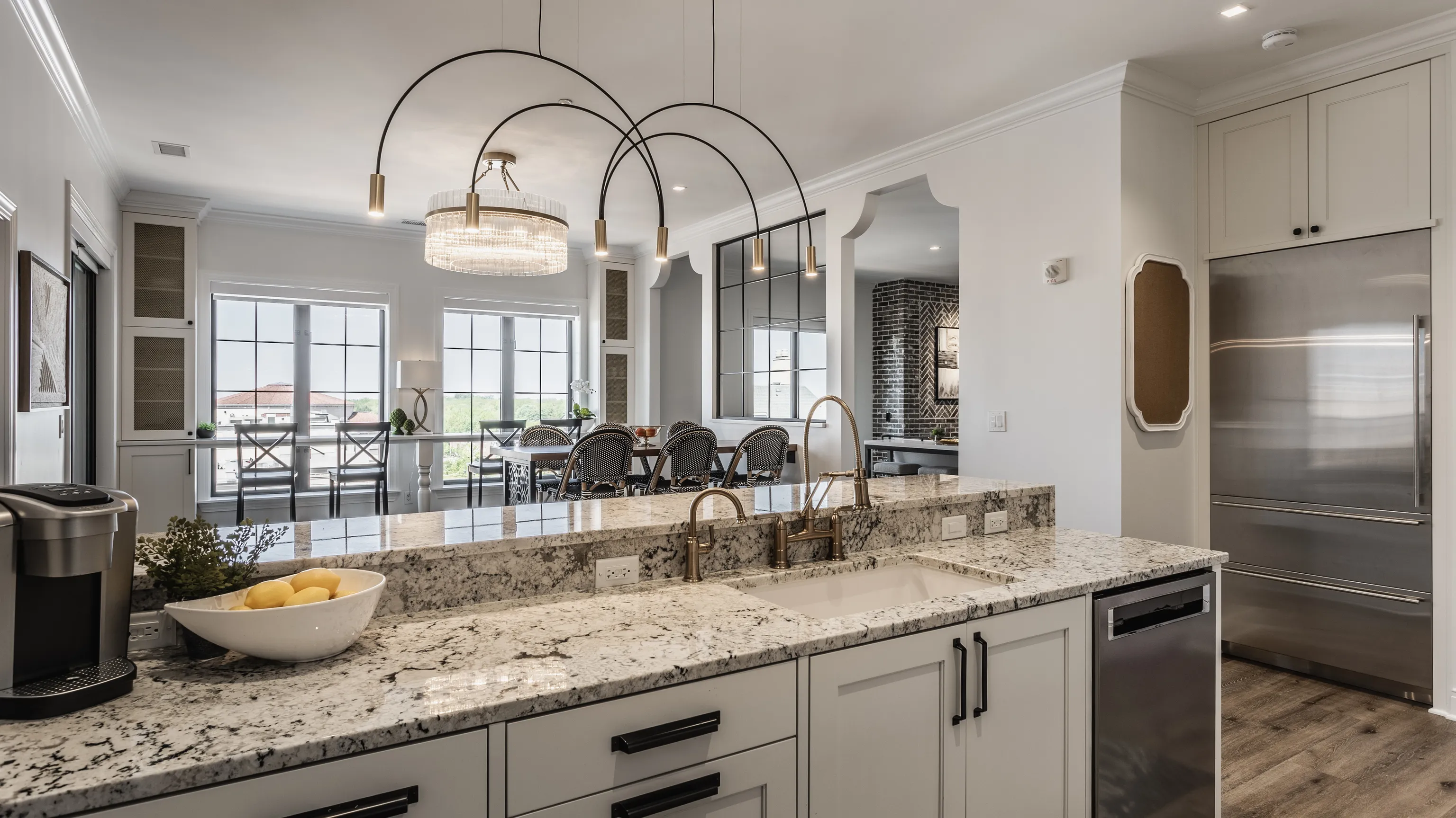 Indulge in redefined luxury within this exquisite transitional modern sanctuary ideally situated in downtown Carmel. Perfectly crafted for hosting gatherings, this spacious single-level 2900 sq ft sixth-floor condo flat accommodates large-scale furnishings and guest circulation effortlessly. Enjoy breathtaking views of lush treetops and cityscape architecture through the architectural store-front slider windows, offering a serene atmosphere amidst city life. This unit stands out as one of the quietest condos on the market, thanks to custom upgraded sliders that provide a city vibe without the noise. Thoughtful design includes abundant storage with floor-to-ceiling custom cabinets, a china credenza, and a large storage room. The custom brick fireplace and entryway infuse European charm into the modern design aesthetic. Featuring generously sized bedrooms and three full baths, this layout ensures comfort and convenience. The off-suite master closet sets a new standard for condo living. Private gated parking with room for ample locker storage adds to the convenience and exclusivity of ownership. Every detail in this home exudes luxury, catering to the demands of contemporary living. Seize this unique opportunity to make this exceptional residence yours. Additional upgrades include a brand new state-of-the-art HVAC and humidification system that is condo specific and provides a consistently comfortable environment. All windows feature wireless remote controlled shades, along with sun shades on the private porch.