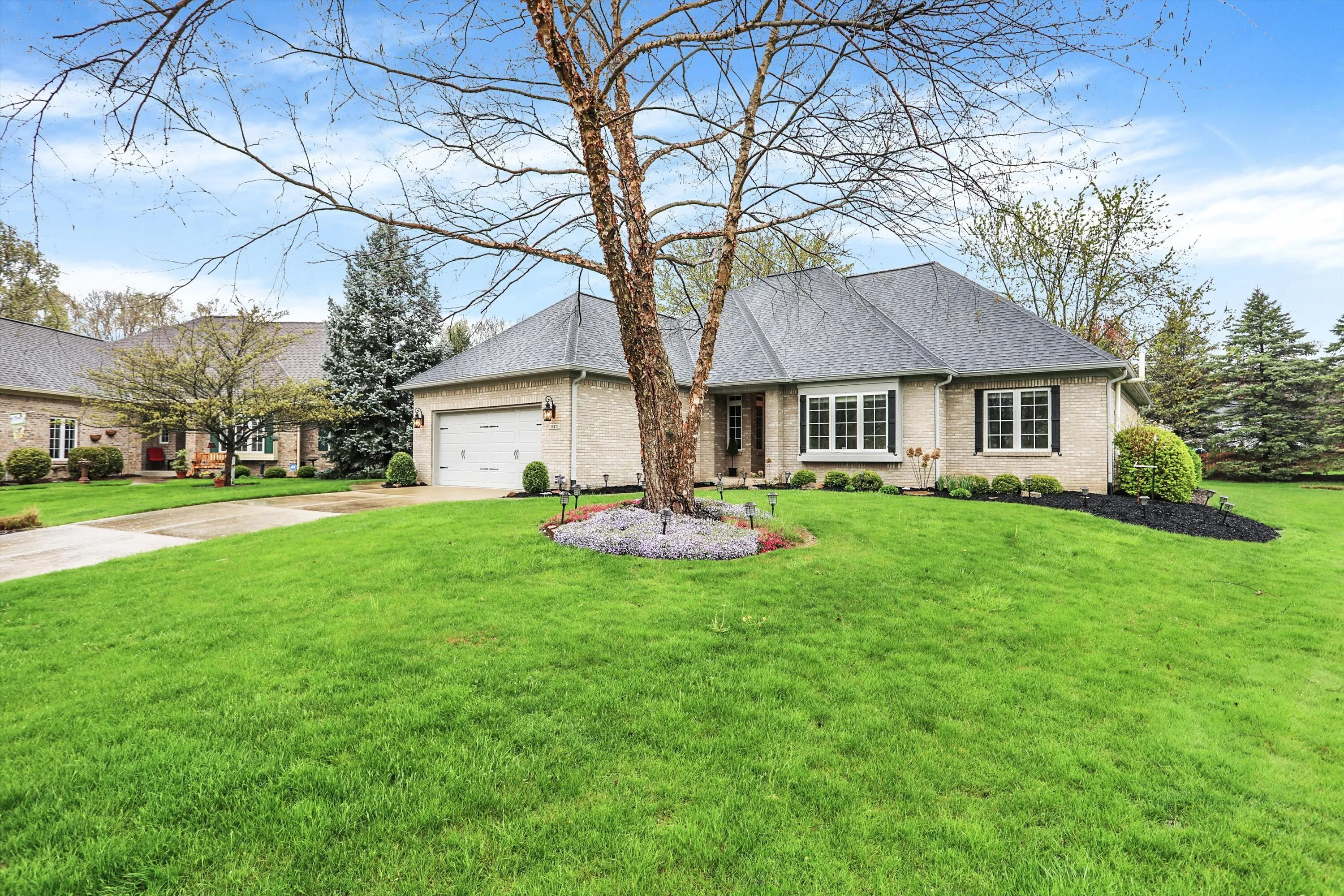 Gorgeous, custom, all brick ranch w/finished basement on a quiet cul-de-sac, only 2 owners! This is a perfect location to enjoy the beautiful neighborhood with no through traffic. Spacious light filled kitchen with island and screened porch overlooking large back yard, great room with gas fireplace, vaulted ceiling, and open to the dining area. Separate office has custom wood floor to ceiling shelving. All appliances stay. Suite w/whirlpool tub, sep. shower & walk-in closet plus a main floor laundry room. Washer & dryer stay! Finished basement with huge windows has 3 flexible rooms & half bath plus egress windows. Updates include roof, gutters and guards, garage door, security doors, interior and exterior lighting, kitchen and master bath granite, water softener, basement carpet, batt.backup sump, main toilets, refrigerator, interior door hardware, and landscaping.The 2 car garage and beautiful lot/landscaping top off this fabulous home. Enjoy the neighborhood park, pool, and easy access to main roads. Don’t miss out!