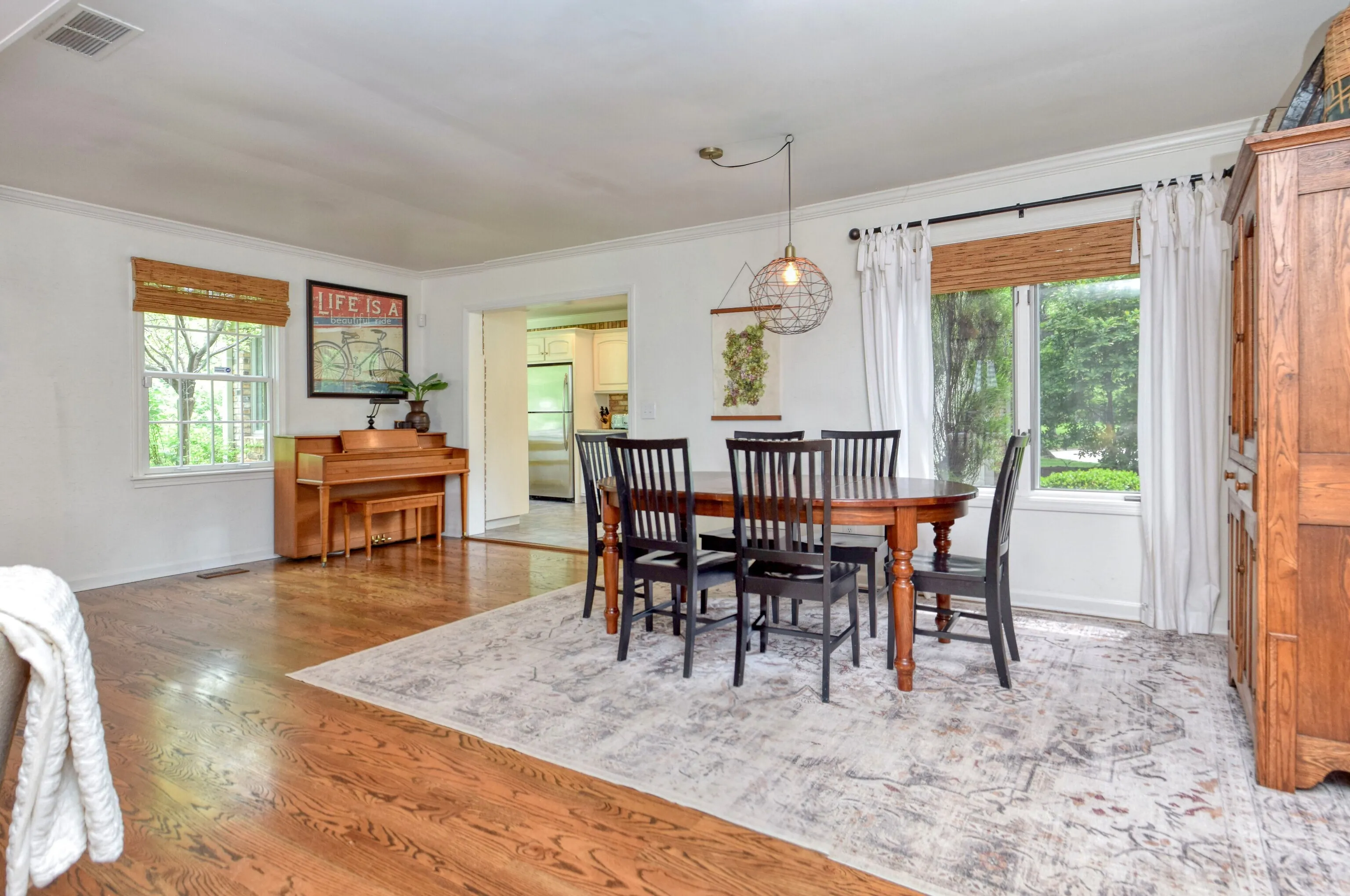 A blend of modern amenities and classic charm in this west Carmel home, set on a rare one-acre lot with abundant natural light. As you enter through the beautiful new front door, you’re greeted by a spacious entryway with built-in cubbies. The main level features an inviting open floor plan with new engineered hardwood floors, a cozy fireplace, built-ins, and seamlessly transitions into the dining area, perfect for entertaining guests or enjoying family meals. The adjacent newer kitchen is a chef’s dream, complete with heated tile floors, stainless steel appliances, exposed brick accents, and a charming breakfast room. For those who work from home or need a versatile space, the main floor office with built-in shelving could easily serve as a fourth bedroom if desired. Upstairs, all bedrooms feature hardwood floors, with the primary bedroom offering a spacious 15 x 12 layout, a great walk-in closet, and an ensuite bathroom with double sinks and a walk-in shower. Recent upgrades include new ceilings and additional insulation for enhanced comfort. The lower level of the home provides additional living space with an L-shaped family room featuring built-in shelves and a recreational area, all freshly carpeted and painted. Convenient amenities such as a half bath and laundry room with a clothes chute from upstairs streamline daily tasks. The garage boasts an epoxy floor, ample storage, and a workbench, with a new garage door and opener. Enjoy this park-like yard from your deck, firepit and/or playset.