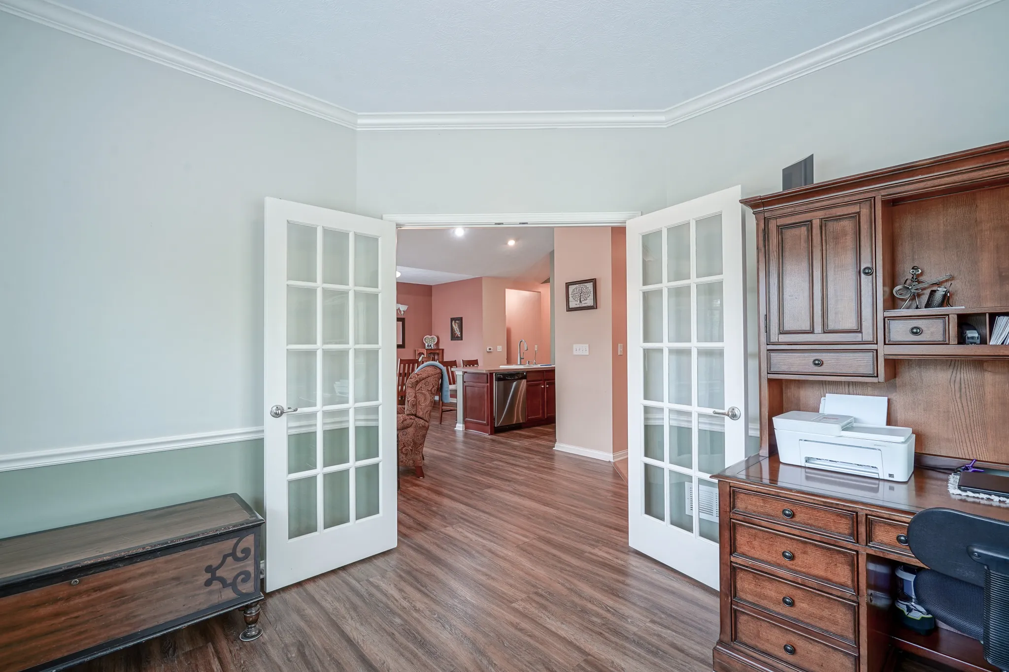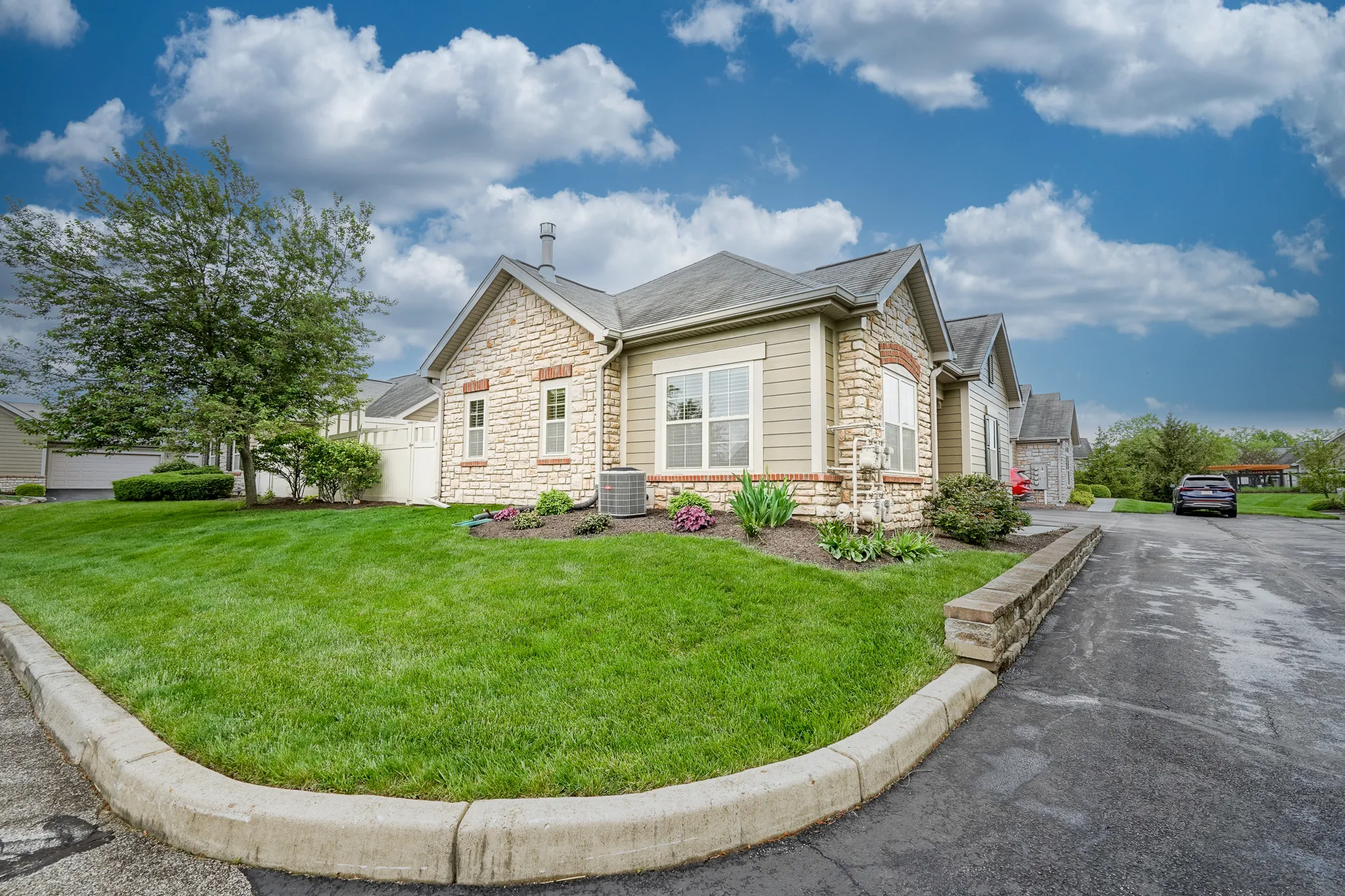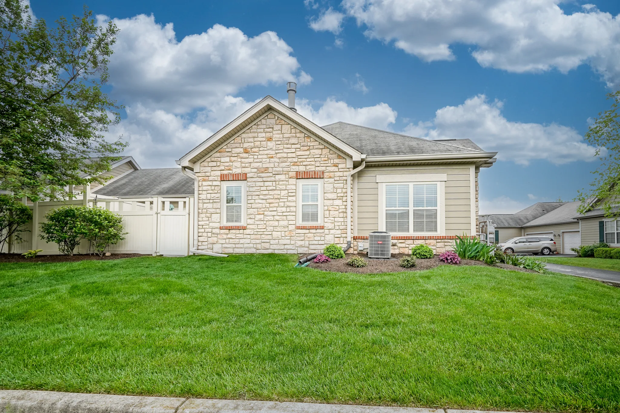 IMPECCABLE TASTE AND SUPERBLY DETAILED! Gorgeous low-maintenance RANCH condo home with open cathedral floor plan! You will notice the great care the seller has taken when you first walk into this condo. This well-constructed Epcon built condo has 2 spacious bedrooms, a functional separate office area, lots of storage, FINISHED 2-car garage, and very nice cosmetic details. The kitchen has center island with breakfast bar, and is open to dining room and great room. The great room gets an abundance of sunshine and is equipped with cozy gas fireplace. Check out the privatized and fully enclosed patio which is off the great room and works superbly for bar-b-ques and get-togethers. There is even a separate gas line to the patio for that perfect firepit! Enjoy sitting on the covered front porch and walking in this very quiet community with a private clubhouse and pool for the community residents. You will love it. Set up a showing today. Welcome home!