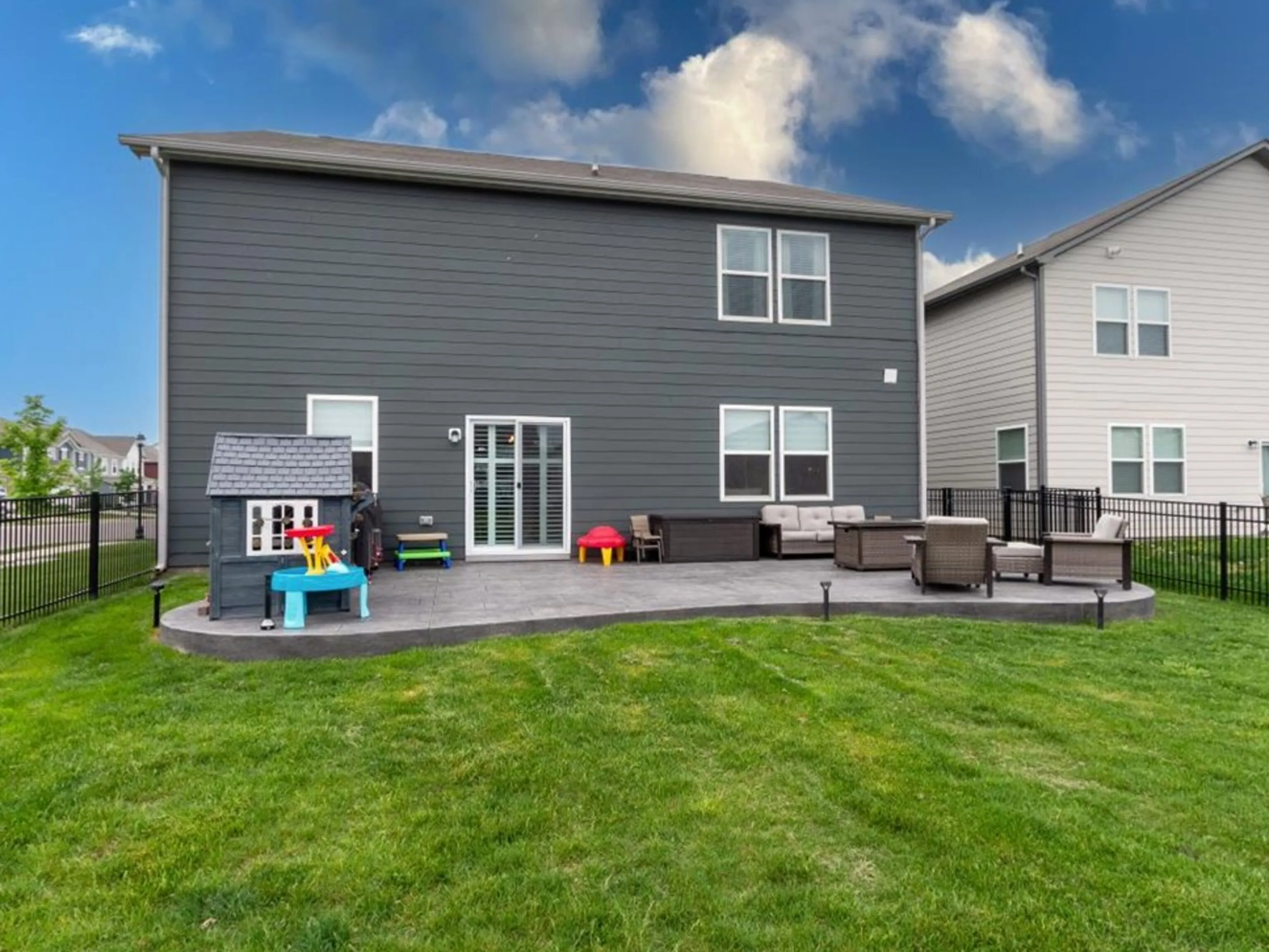 Beautiful two story home in Copperstone addition! This home is move in ready, featuring five bedrooms and a loft(Kids playroom, man cave, office, teen space). Standard features include multiple en-suite bathrooms, walk in closets, upstairs laundry, upstairs primary w/trey ceiling, modern kitchen w/large walk in pantry, custom light fixtures throughout, and vinyl plank flooring(1st floor). Recent upgrades include crown molding, custom living room built-ins, modern linear fireplace, modern stair railings/steps, custom blinds, stamped concrete patio, and black aluminum fence in back yard. Wonderful landscaping. Great entertaining space! New Palestine school district. Close to restaurants and shopping. This is a fantastic home!
