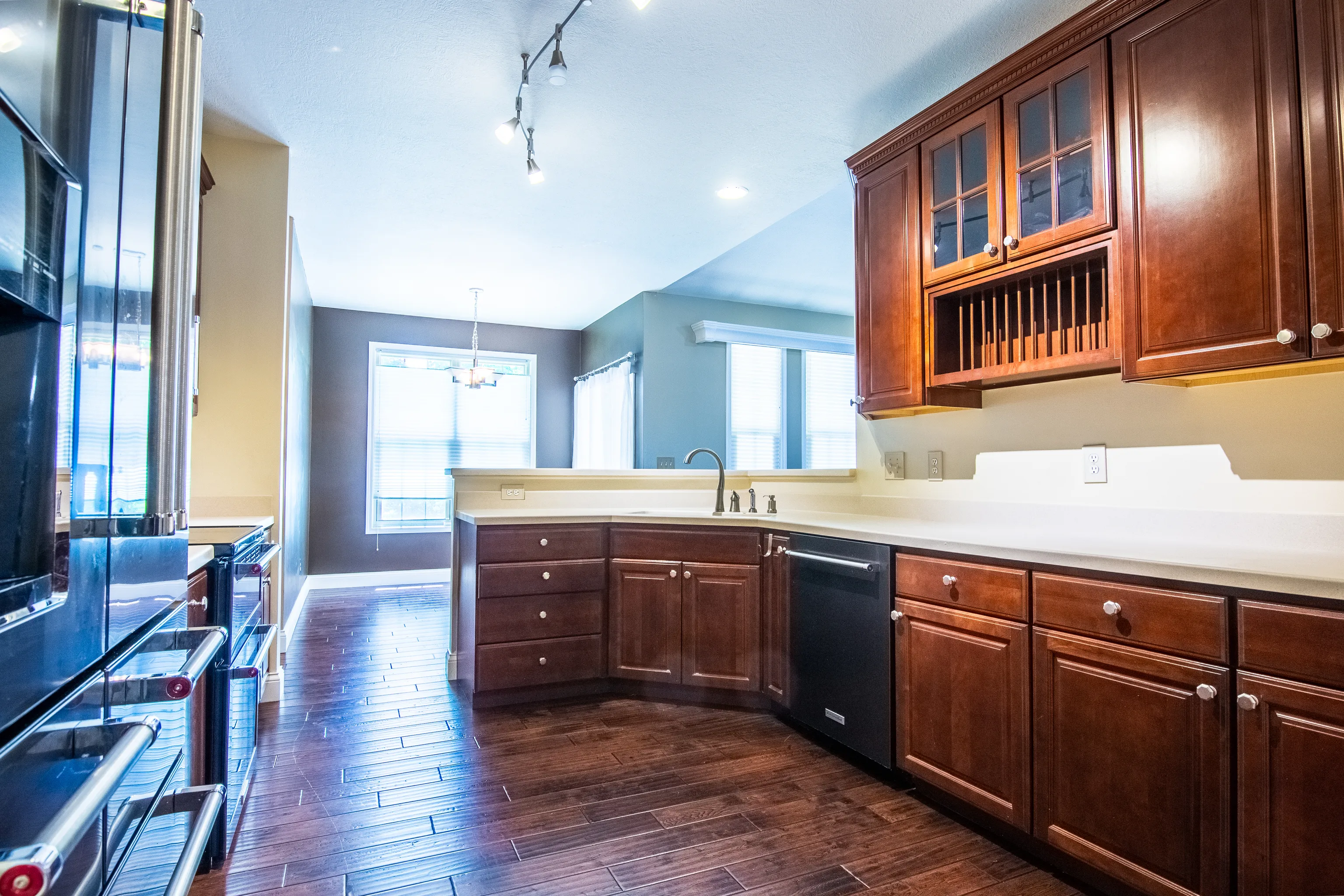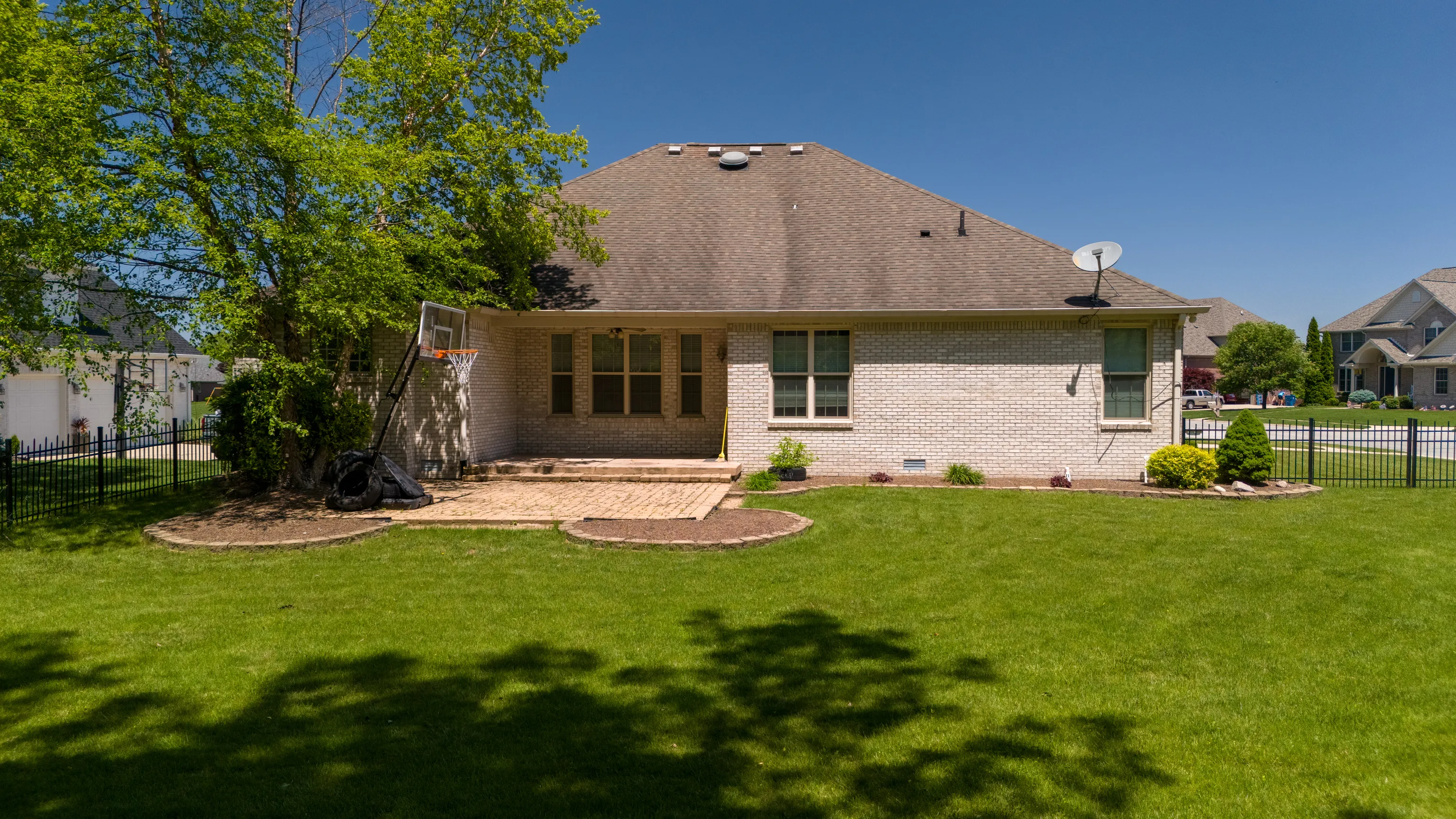 This 2264 sq ft beautiful custom Ranch home sits spaciously on a sprawling corner lot of popular Timberlake neighborhood in Franklin Township, Indianapolis, IN. This 3 bedrooms, 2.5 baths home has beautiful soaring vaulted ceilings in living room and in Primary bedroom. Engineered hardwood throughout in foyer, Office room, Breakfast Room, Dining room and in Kitchen. All bedroom has carpet flooring. Kitchen has beautiful wood cabinets and a large walk in pantry. It comes complete with kitchen appliances. From spacious foyer to office room with french door, this custom home’s primary suite comes with his and hers closets, bathroom with separate sinks, a garden tub and tiled walk in shower. An oversized garage can easily be access from spacious laundry room or mud room which comes complete with ceremic tile flooring and a W/D. Other features include a large fenced in treelined back yard with a concrete covered porch, 16×16 beautiful paver brick patio and customized walking path from the driveway to front of the home. A must see.