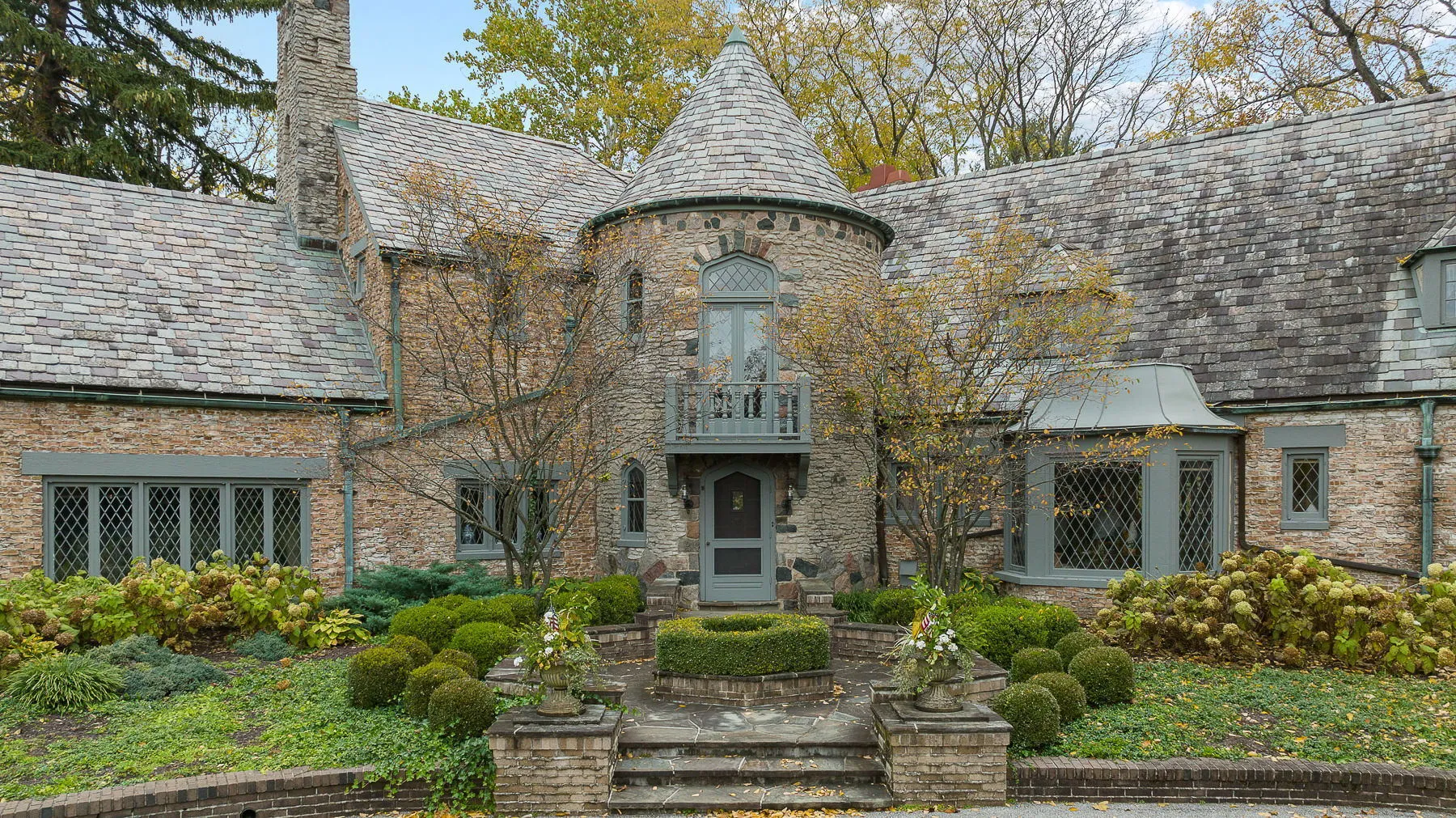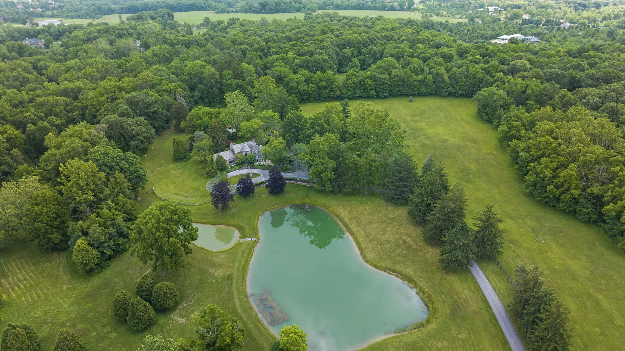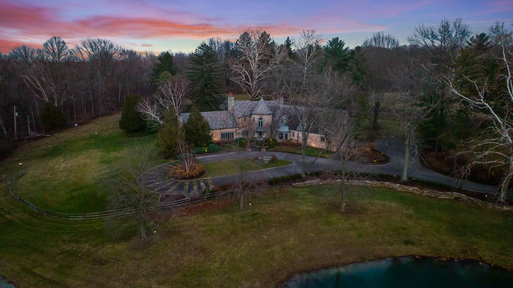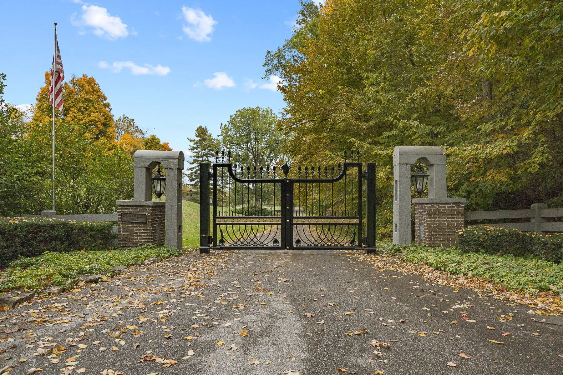 Covington Manor Farms is an elegant luxury estate and distinctive country home seated on over 63 acres of prestigious Southwest Fort Wayne landscape. A 6,846 sqft. English Tudor home sits at the end of a long tree-lined drive just beyond two ponds. Endless possibilities await a new owner, as the property also includes a workshop/three car garage in addition to the attached 2 car, horse arena and stables, a separate business office and a party barn. The historic stone-wrapped landmark home sits secluded atop a hill with pristine landscaping. The grand 2 story entry features a circular stairwell that wraps up towards the Juliet window on the front of the home. Entertainment awaits in the elegant and spacious living room, with soaring ceilings, hand-hewn oak beams with timber native to the property, and a 2 story English stuccoed fireplace, which tapers as it extends upward. All of your guests will find ample room to feast in the large formal dining room with fireplace. The cozy library on the main level also features a fireplace and built-ins. The kitchen features Imperial Danby honed marble countertops, built-in Sub-Zero freezer and refrigerator, butler’s pantry with wet bar, and a dine-in area with windows to take in the morning views outside. On a beautiful day, meals can be cooked and enjoyed in the expansive screened-in porch, with kitchen featuring built-in grill and honed soapstone counters. A home office is located off of the kitchen, as well as a large laundry room and a bath and another half-bath on the main level. Utilize a rec room, exercise room, plus a wine bar and additional kitchen space. The possibilities are truly whatever one can imagine at Covington Manor Farms! Exact duplicates of the White House gates sit at the front of the property. The past location of the historic Fort Wayne charity horse show and multiple on-site weddings, this grand estate is ready for generations of family and friends to explore and enjoy.