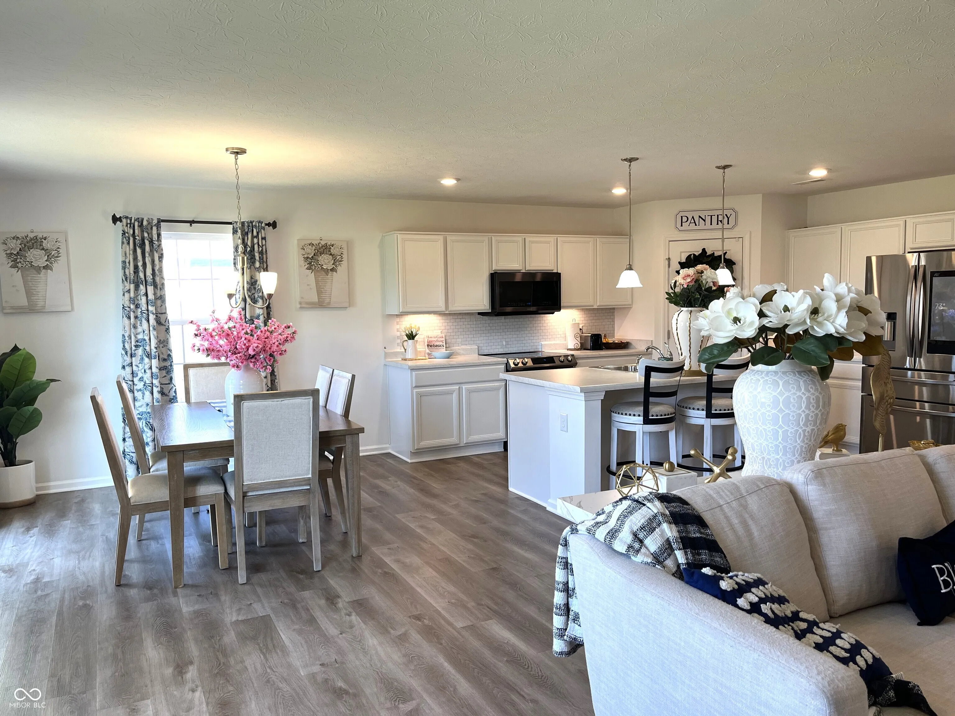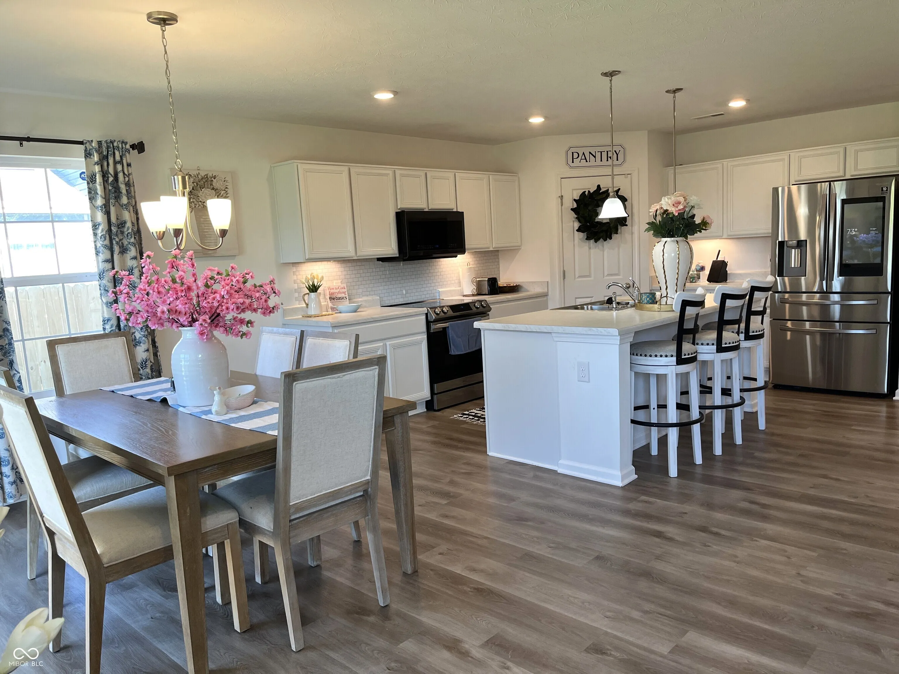 Spacious 3 bedroom, 2 bath ranch with over 1,800 sq. ft. Great family space w/open open floor plan and cozy corner electric fireplace. White kitchen w/easy soft close cabinets & under cabinet lighting, giant center island, includes smart Samsung appliances (excludes refrigerator) and walk in pantry. Updated luxury vinyl flooring everywhere except bedrooms. 18 ft primary bedroom w/walk in closet and access to laundry room, double bowl vanity, soaking tub & separate shower. 2 guest bedrooms and full bath are separated from primary for nice privacy. Lots of closet storage. Separate laundry room, water softener owned. Front & back cameras, ring doorbell and front door code entry included. HOA includes community playground and Pool.