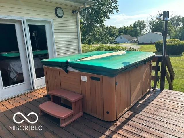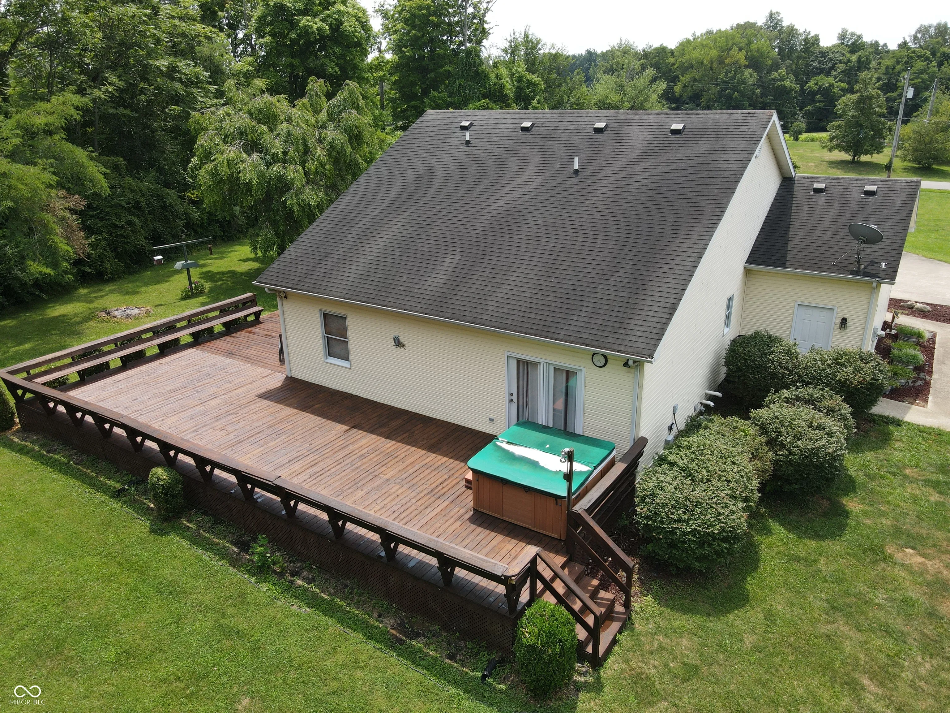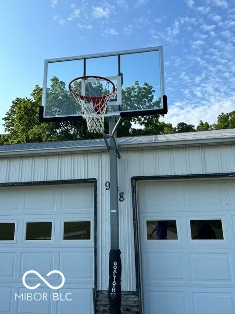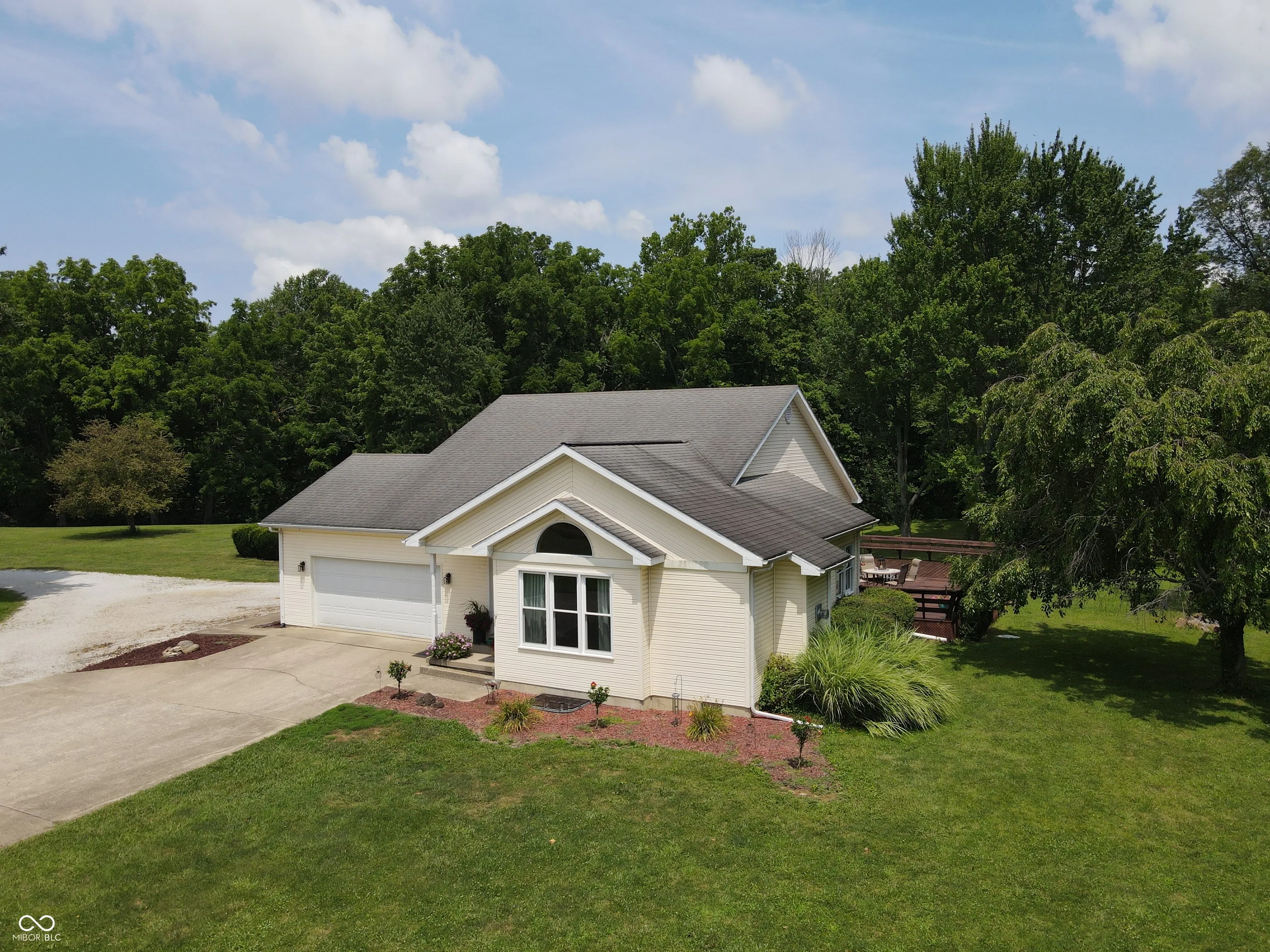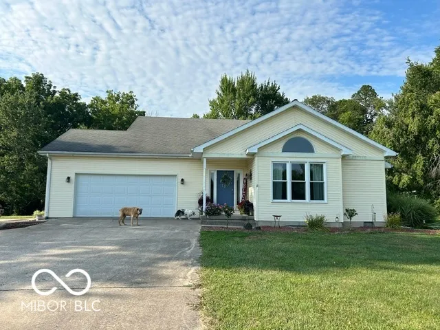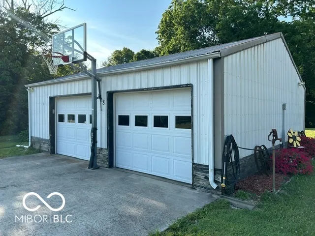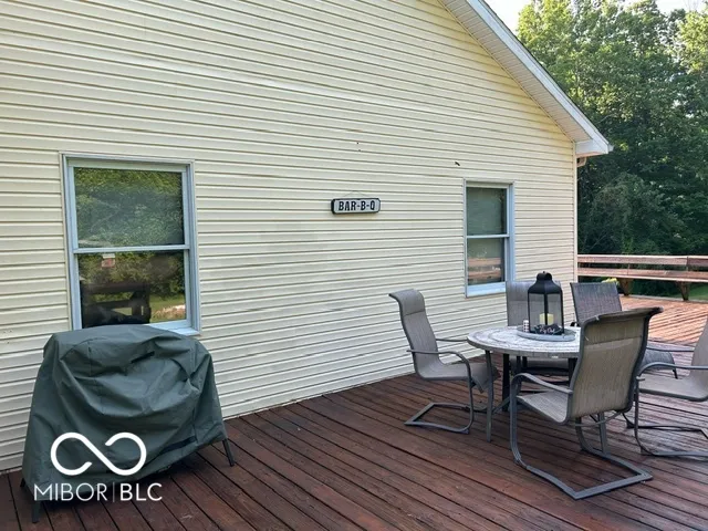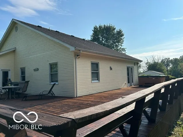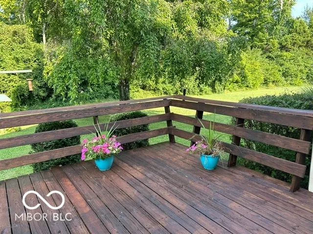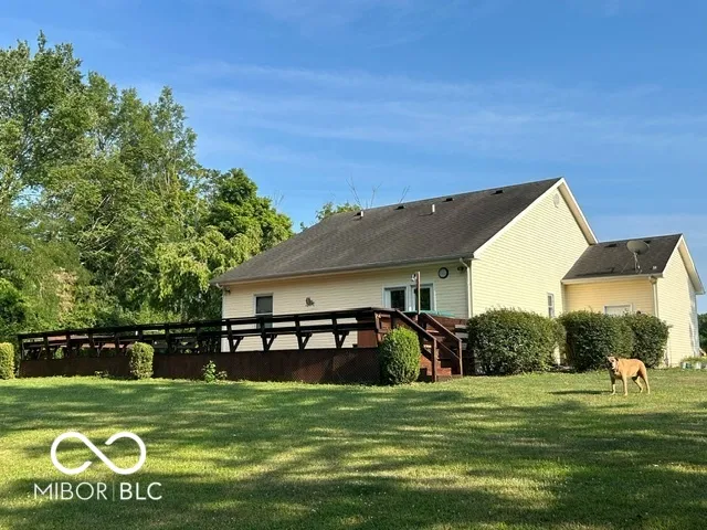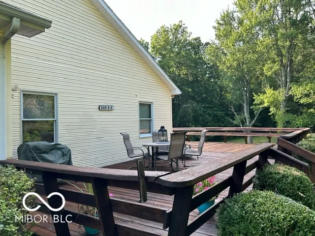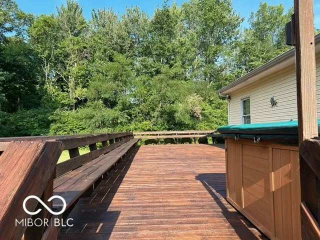 Four bedroom three bath open concept home with finished basement sitting on 2.624 acres, close to town but with a country setting. Vaulted ceiling in living room. Nine foot ceilings through out the main level, and nine foot ceilings in the finished basement, also. Two car attached garage as well as 28×28 detached garage with gas furnace. Gorilla adjustable basketball goal on concrete court. Gas log fireplace. Huge 1200+ sq ft wrap around deck. Mature trees and landscaping. GAS WELL! Underground pet fence by Stay Put Doggie. Galley kitchen opens to dining area, with patio door. Master suite features a walk in closet, jetted garden tub, separate shower, and exterior doors to hot tub on deck. Xfinity internet. All appliances may stay. Approximately 15-20 minutes to Columbus, Greensburg, or North Vernon. Motivated Seller!