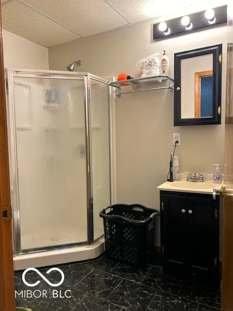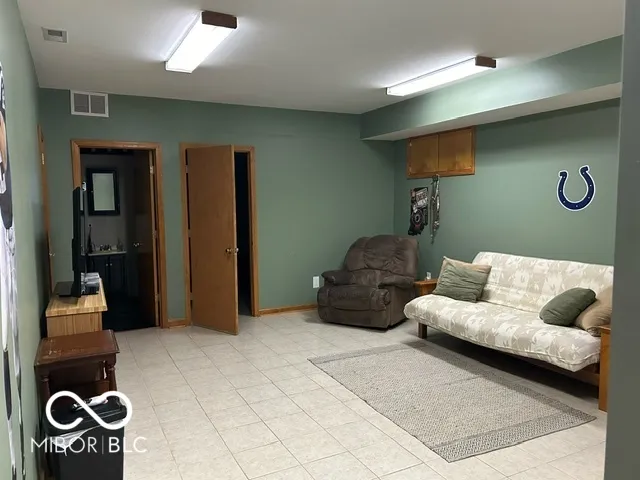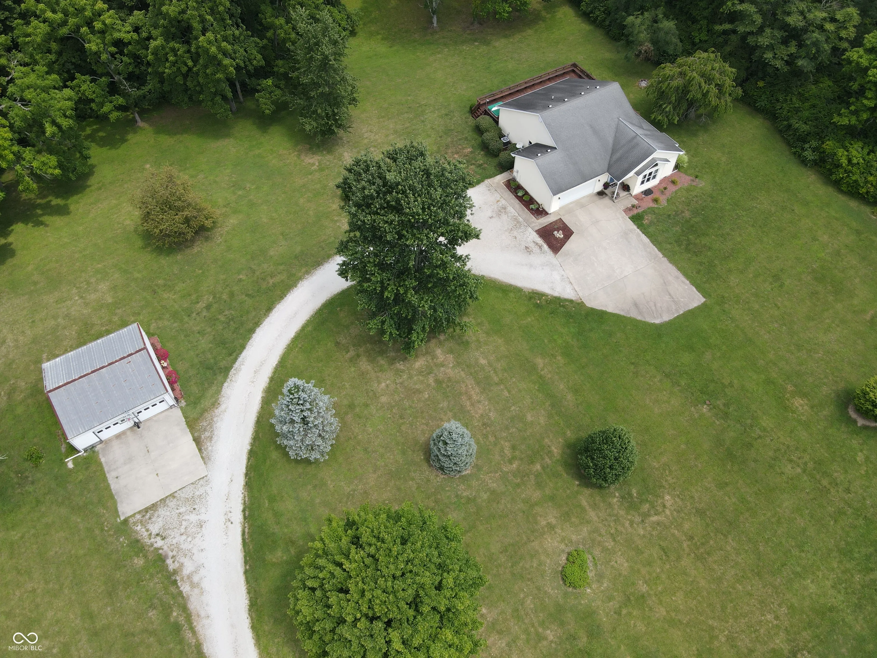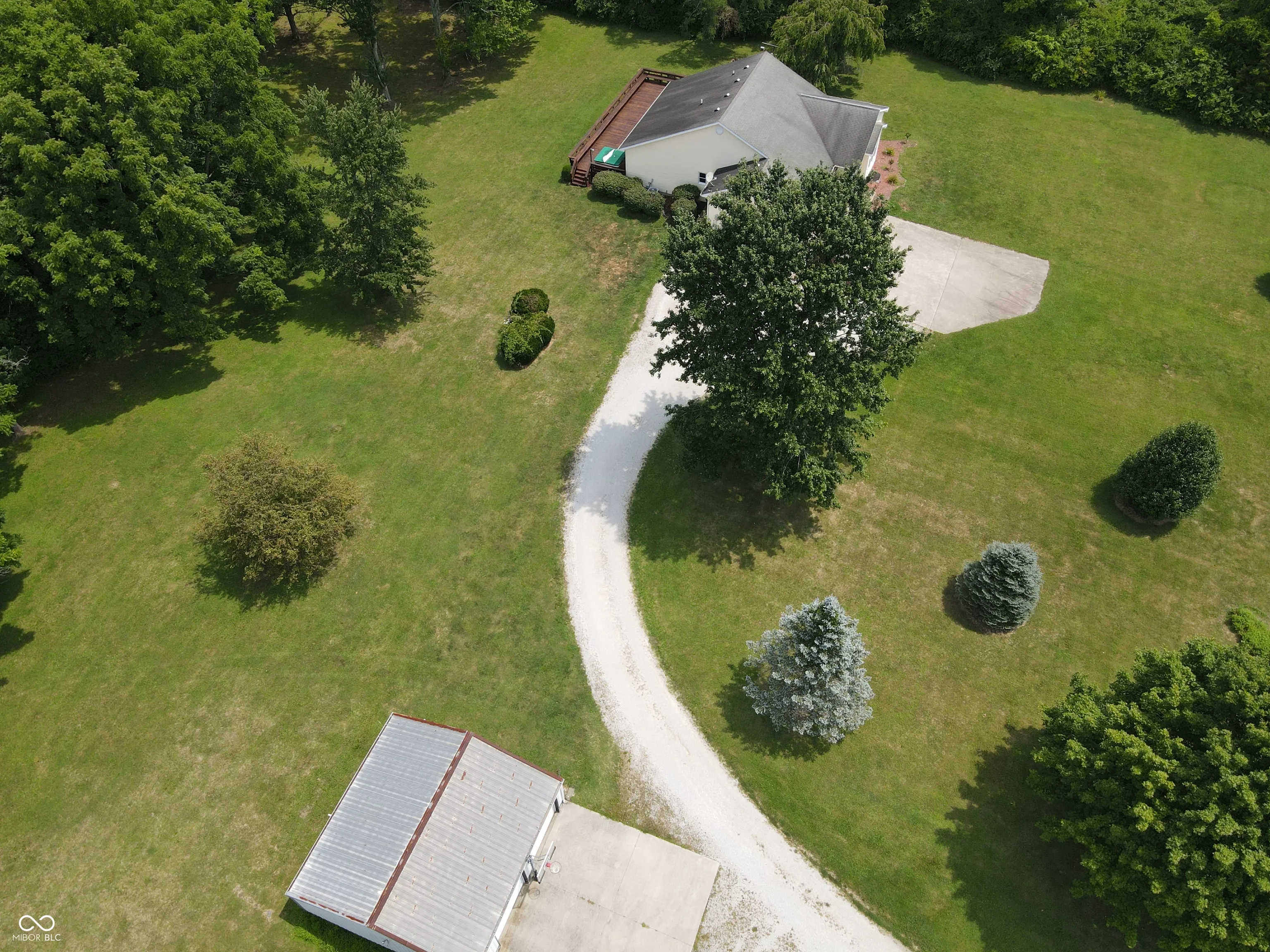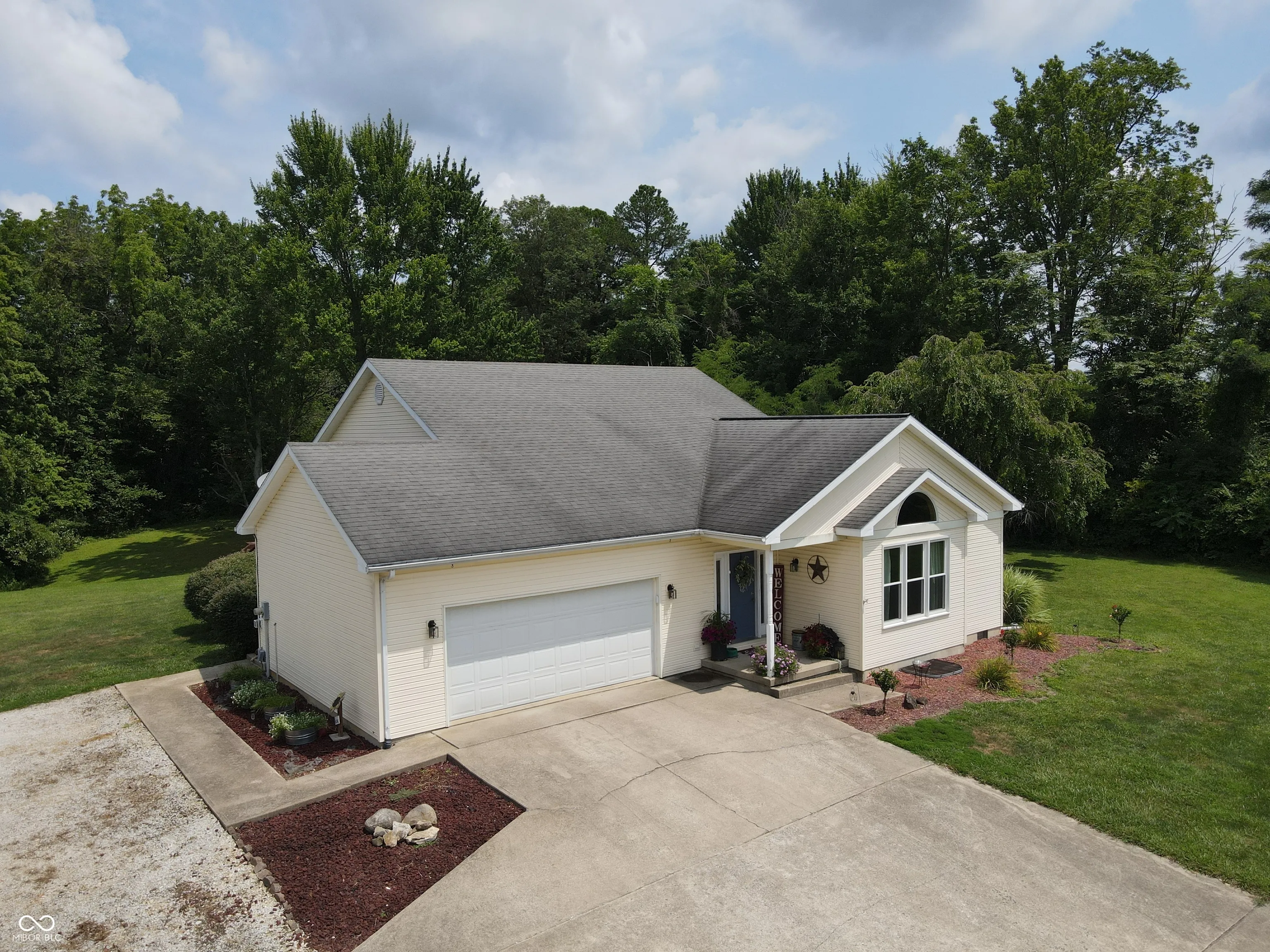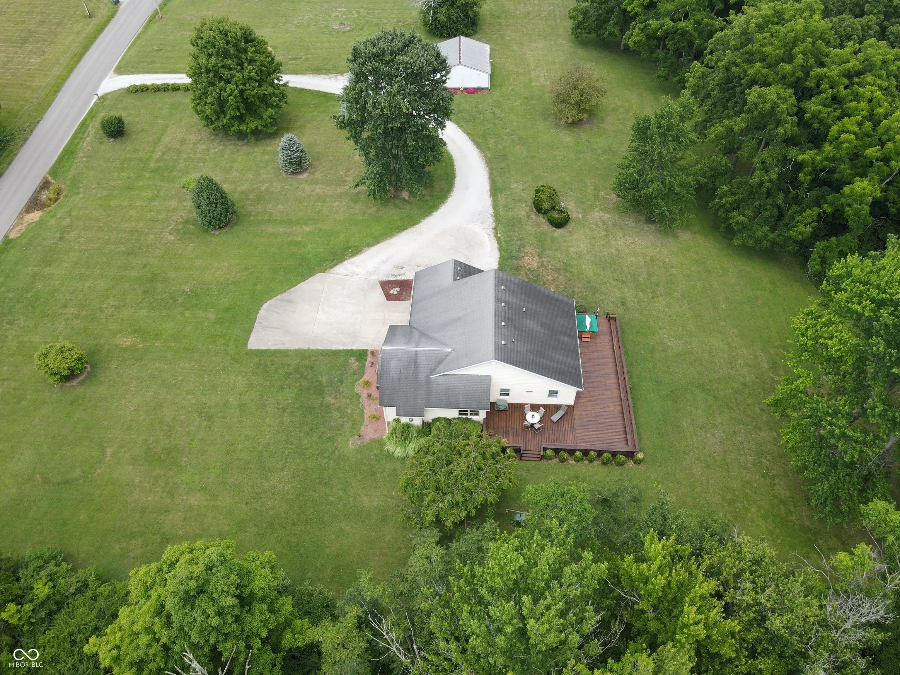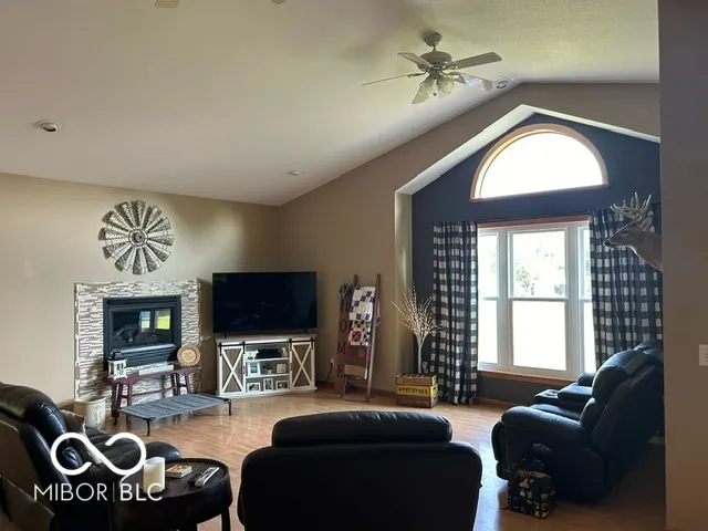 Four bedroom three bath open concept home with finished basement sitting on 2.624 acres, close to town but with a country setting. Vaulted ceiling in living room. Nine foot ceilings through out the main level, and nine foot ceilings in the finished basement, also. Two car attached garage as well as 28×28 detached garage with gas furnace. Gorilla adjustable basketball goal on concrete court. Gas log fireplace. Huge 1200+ sq ft wrap around deck. Mature trees and landscaping. GAS WELL! Underground pet fence by Stay Put Doggie. Galley kitchen opens to dining area, with patio door. Master suite features a walk in closet, jetted garden tub, separate shower, and exterior doors to hot tub on deck. Xfinity internet. All appliances may stay. Approximately 15-20 minutes to Columbus, Greensburg, or North Vernon. Motivated Seller!