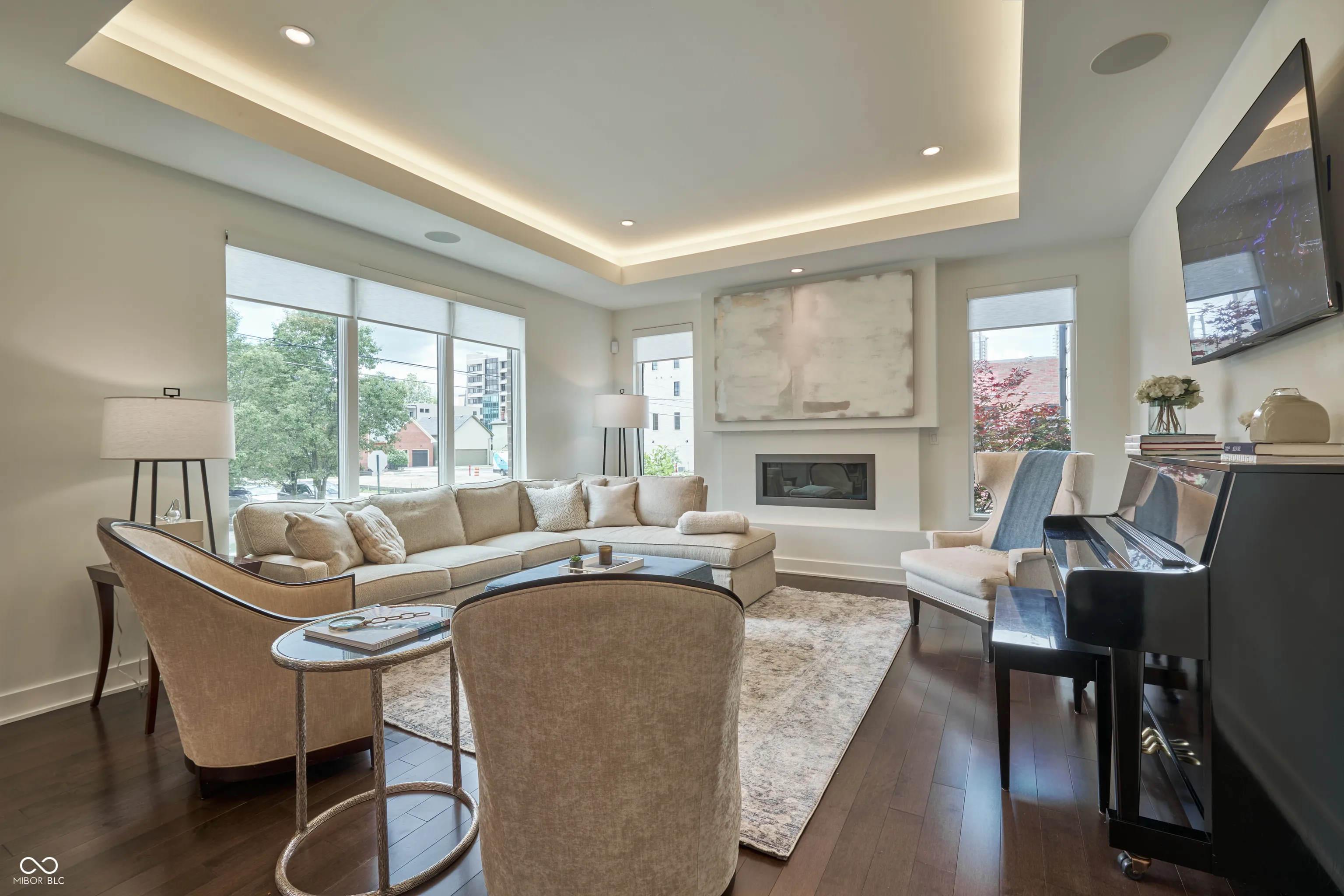 Immerse Yourself in Urban Luxury. This stunning contemporary townhome offers the ultimate in urban living. Spread across four levels, it offers a perfect blend of spaciousness and functionality, ideal for entertaining and comfortable everyday life. Four bedrooms, three with ensuite baths, provide a haven for family or guests. The luxurious primary suite features a spa-like bath, a spacious walk-in closet and private balcony. The third level features a comfortable den with an exposed brick wall and a stylish bar, perfect for hosting gatherings. A guest suite with its own bath provides comfortable accommodation for guests. Step out onto the expansive rooftop terrace, complete with a built-in grill, inviting outdoor fireplace and skyline views for memorable nights under the stars. The lower level offers a versatile space with a bedroom, a full bath, and a game room/family room, ideal for additional living needs. Other features include an elevator, main floor terrace, perfect for al fresco dining and a fenced front courtyard. This incredible townhome is situated within walking distance of the vibrant energy of Gainbridge Fieldhouse, the historic Murat Theatre, the trendy Bottleworks District, an array of restaurants, galleries and museums.