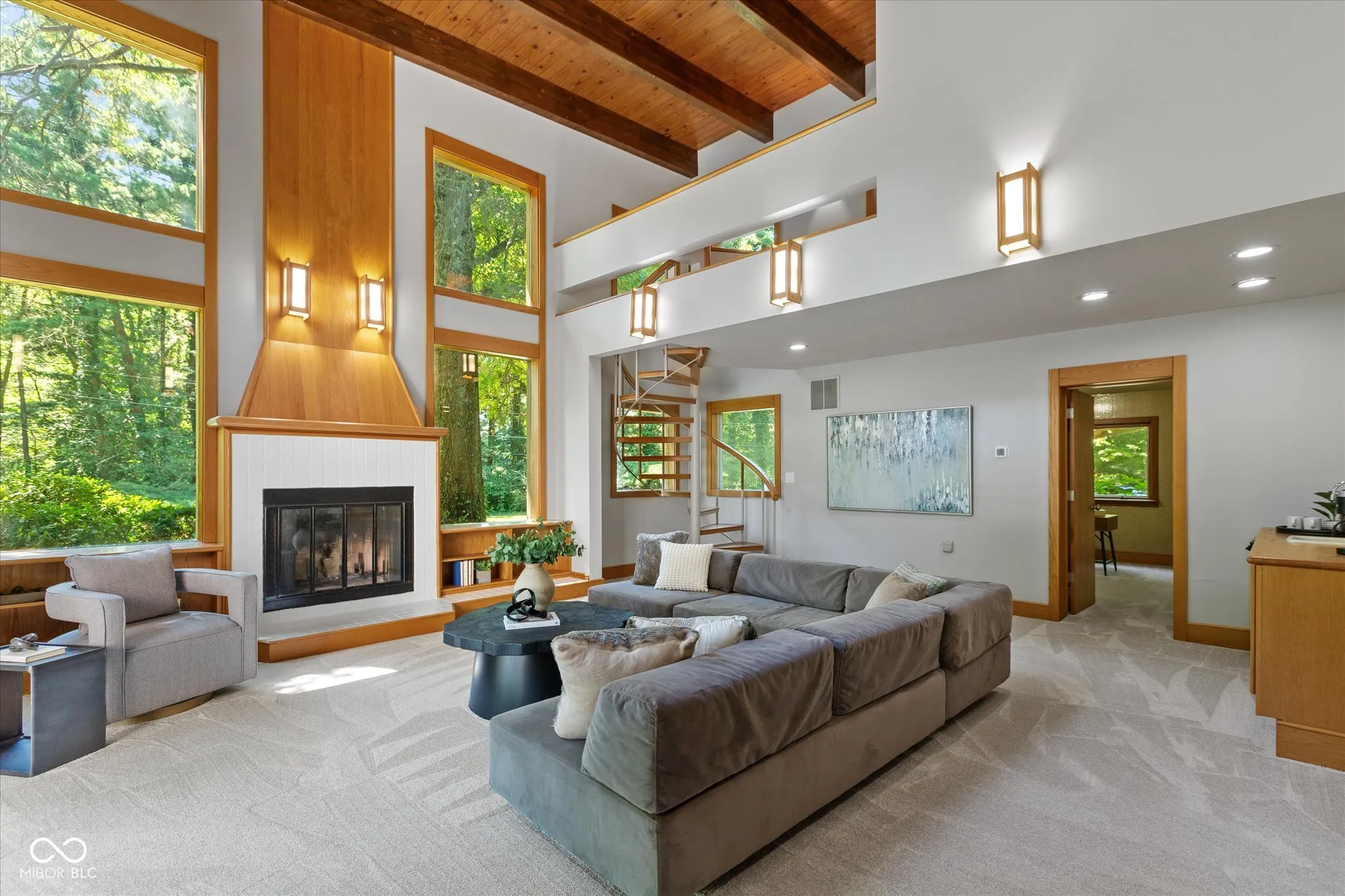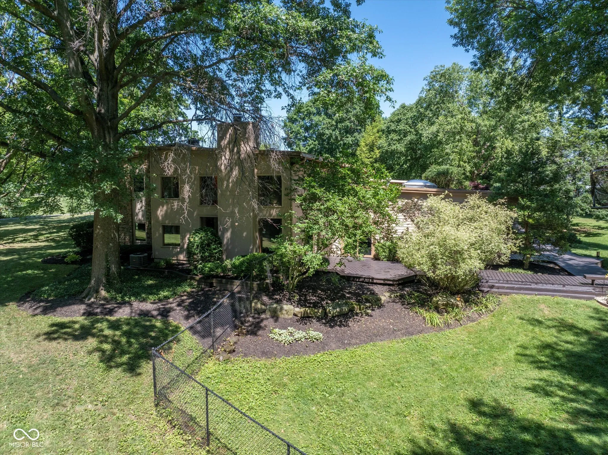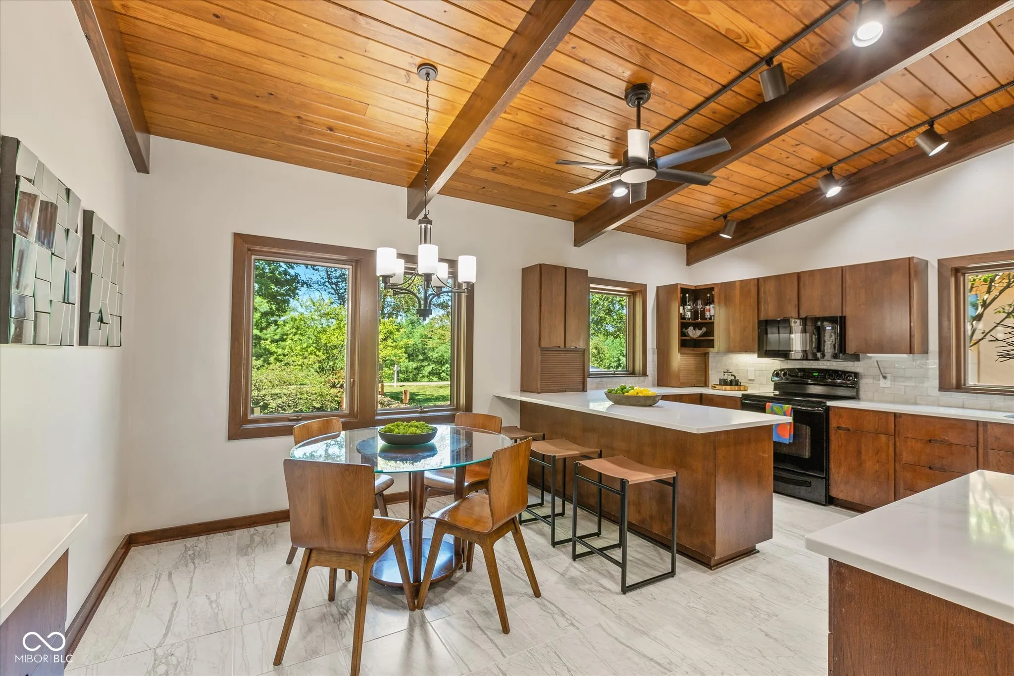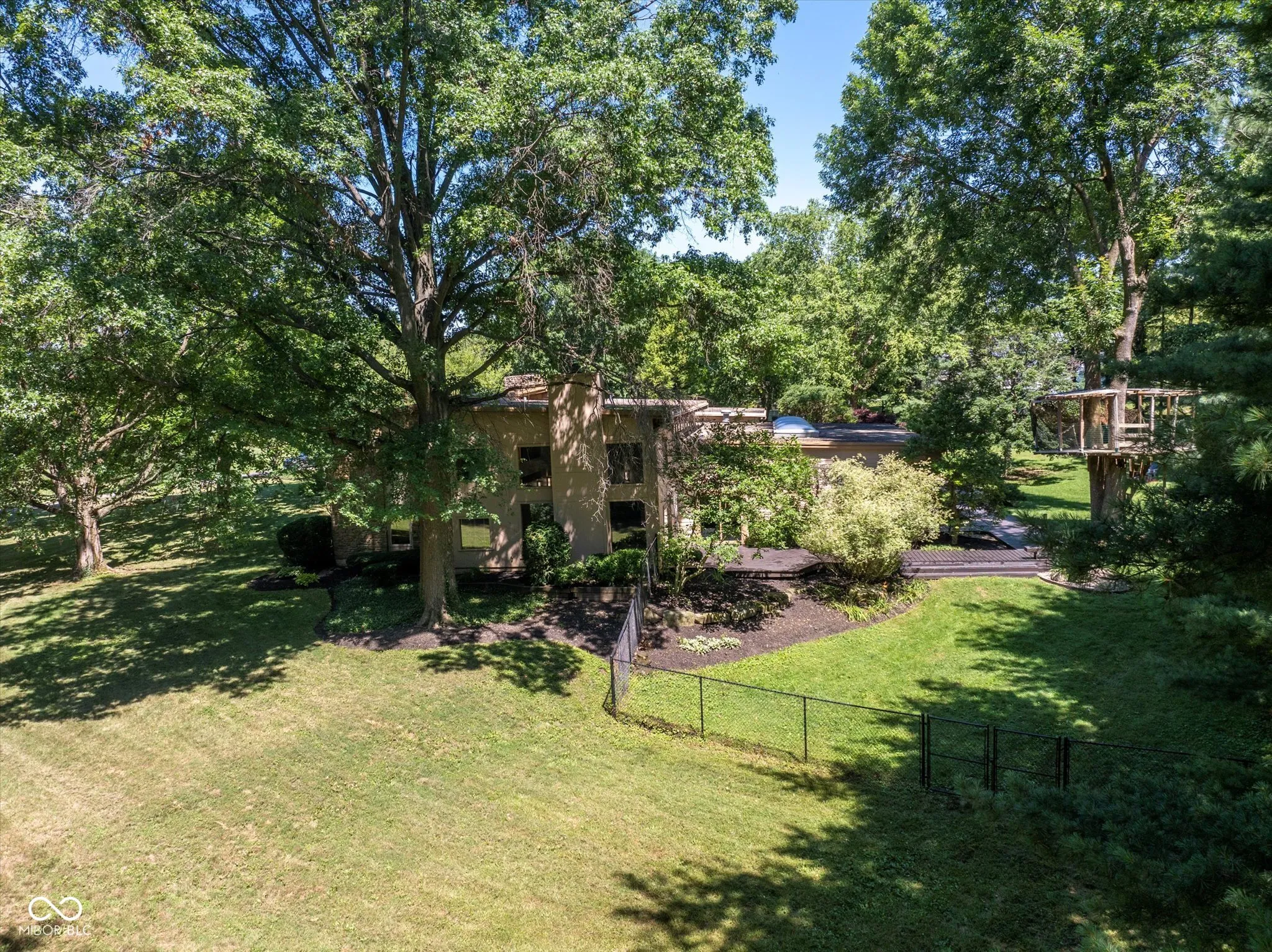 This exceptional property is one of a kind. Whether you seek a peaceful retreat or a home designed for entertaining, this midcentury modern gem exceeds expectations. The timeless design is characterized by exposed solid wood beams, expansive windows, an open floor plan, and a plethora of storage spaces. This charming home has an abundance of areas to host gatherings as it includes an indoor pool, rec room, wet bar, guest suite, tree house, trampoline, full wrap around deck, and sun room on 2 private acres in the heart of Carmel. Only a few minutes away from Carmel High School, the Carmel Arts & Design District, the Palladium, Hotel Carmichael, and Cafe Patachou the location could not be any more convenient. Highlights of this home include: an updated kitchen with solid wood cabinets, built in pantry, new backsplash, quartz countertops, undermount sink, & plumbing fixtures; new ceiling fans & light fixtures, new flooring (carpet/tile/LVP), and remodeled indoor pool area. Additionally, the garage features a transom window along with three clerestory windows to allow for both, privacy and natural light, an upper level storage space, built in cabinets with a work surface, & new Galaxy floor coating.