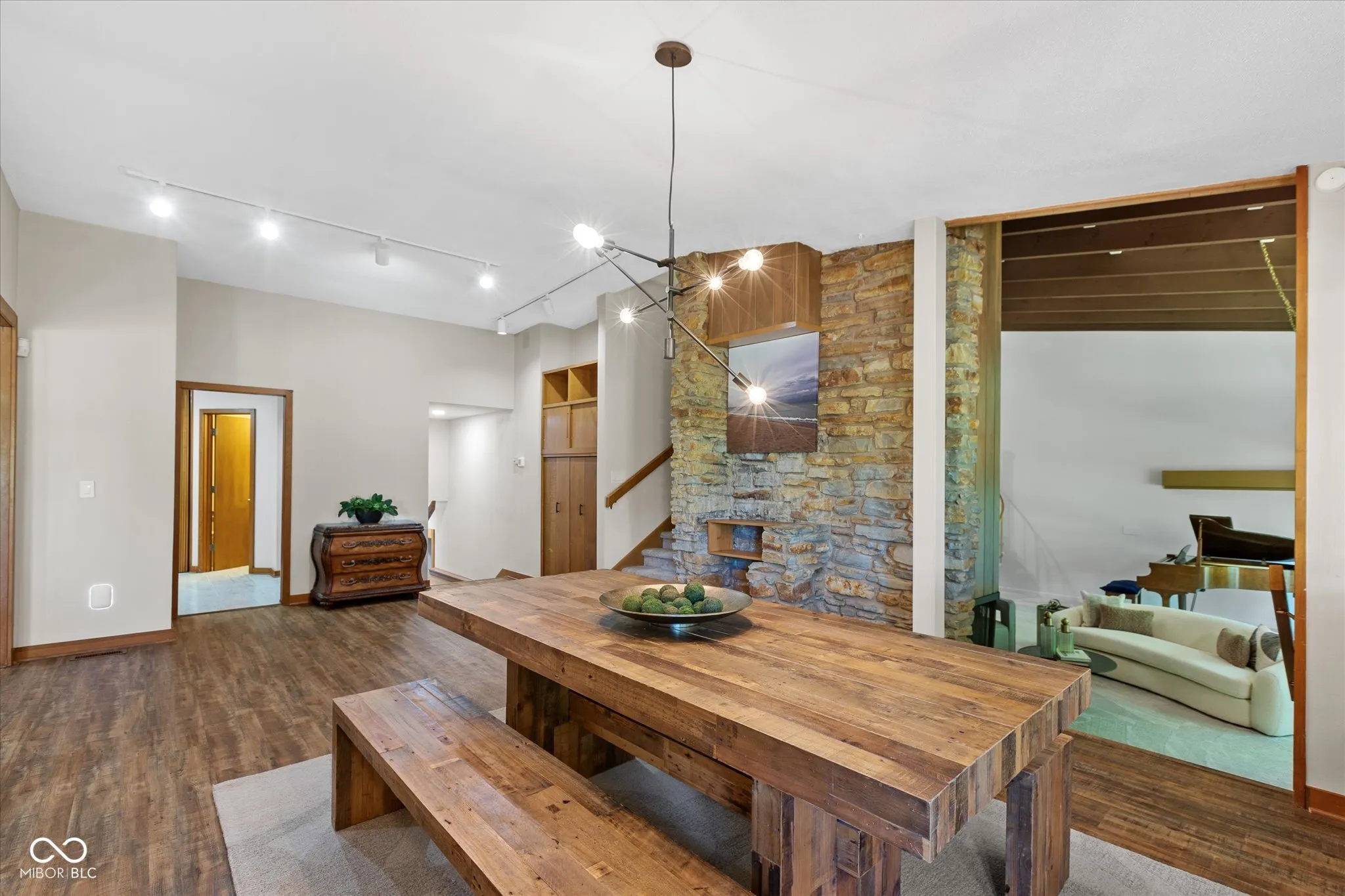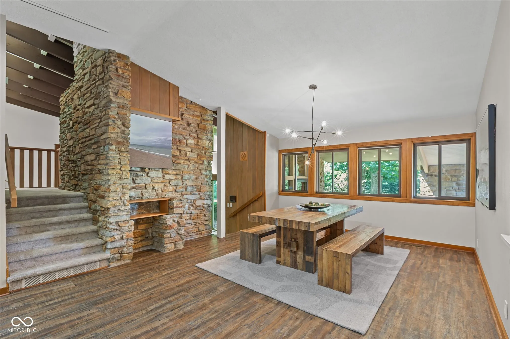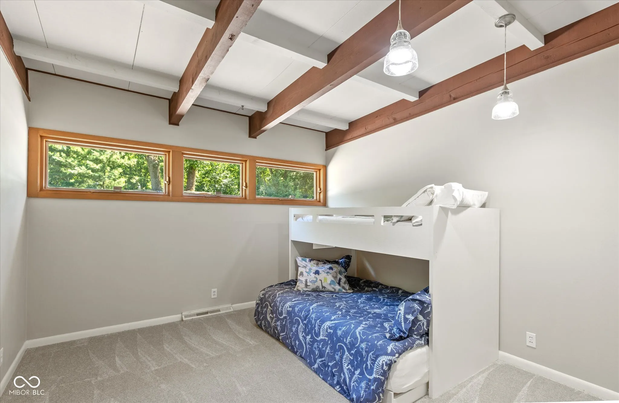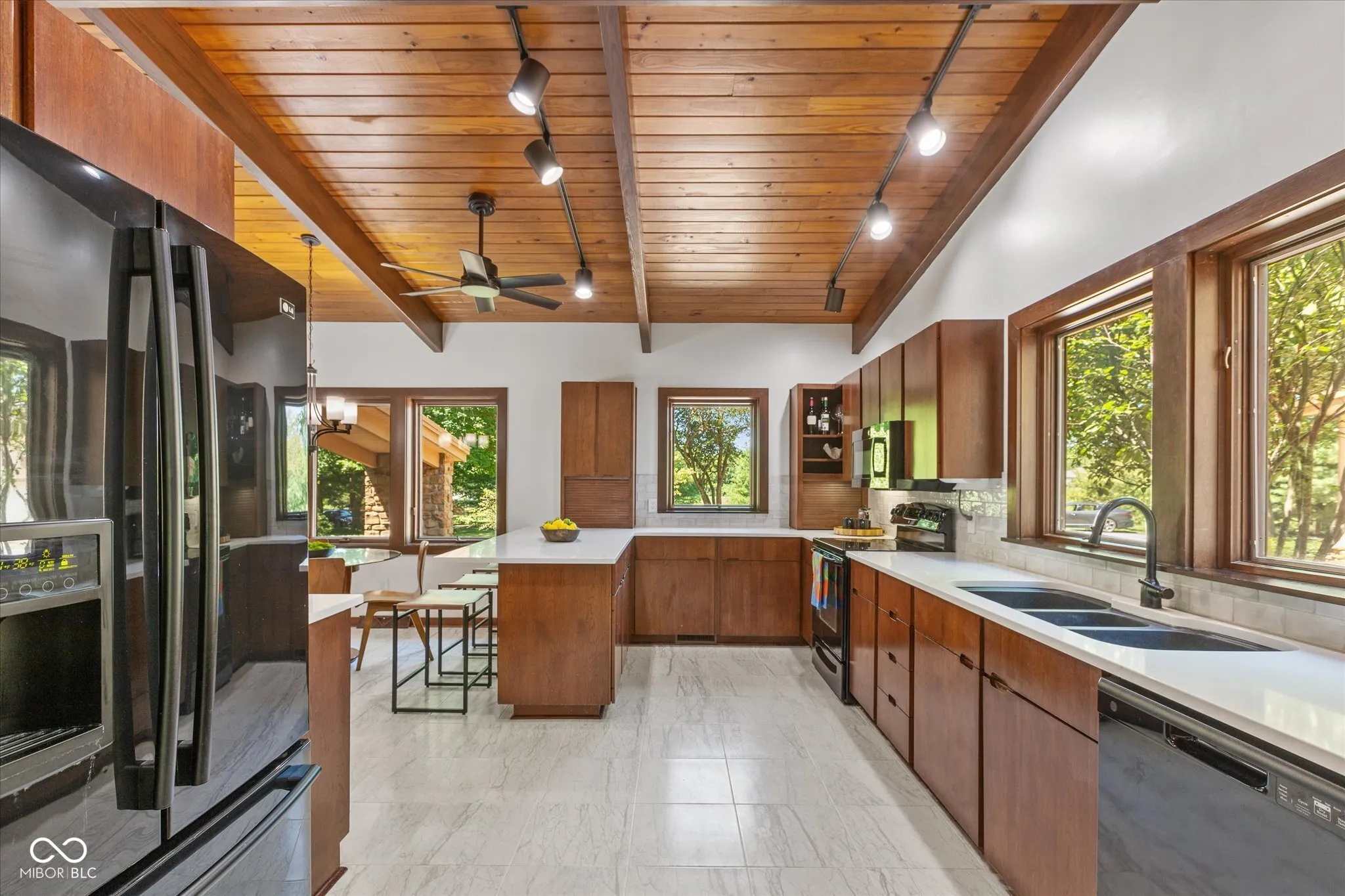 This exceptional property is one of a kind. Whether you seek a peaceful retreat or a home designed for entertaining, this midcentury modern gem exceeds expectations. The timeless design is characterized by exposed solid wood beams, expansive windows, an open floor plan, and a plethora of storage spaces. This charming home has an abundance of areas to host gatherings as it includes an indoor pool, rec room, wet bar, guest suite, tree house, trampoline, full wrap around deck, and sun room on 2 private acres in the heart of Carmel. Only a few minutes away from Carmel High School, the Carmel Arts & Design District, the Palladium, Hotel Carmichael, and Cafe Patachou the location could not be any more convenient. Highlights of this home include: an updated kitchen with solid wood cabinets, built in pantry, new backsplash, quartz countertops, undermount sink, & plumbing fixtures; new ceiling fans & light fixtures, new flooring (carpet/tile/LVP), and remodeled indoor pool area. Additionally, the garage features a transom window along with three clerestory windows to allow for both, privacy and natural light, an upper level storage space, built in cabinets with a work surface, & new Galaxy floor coating.