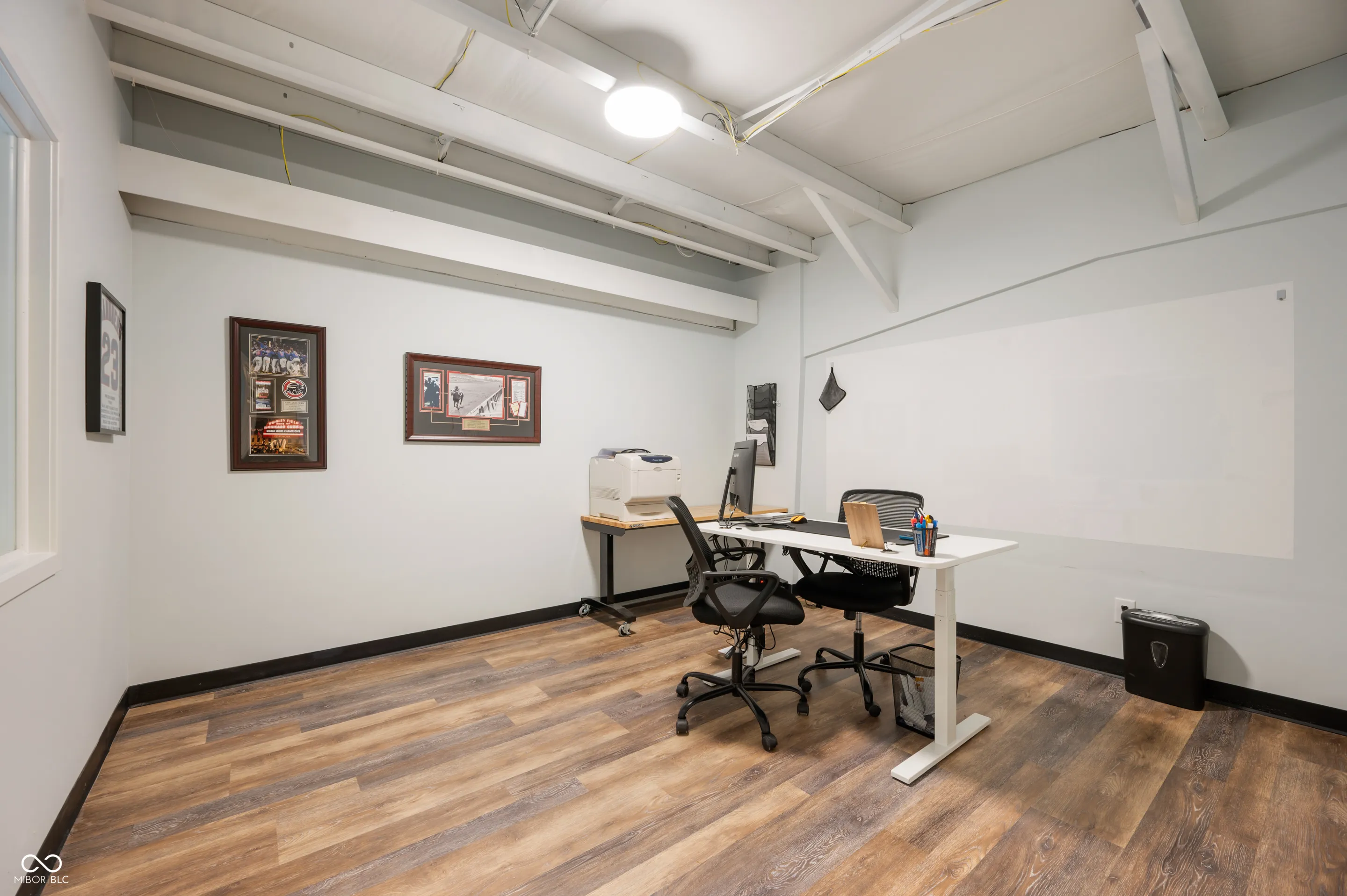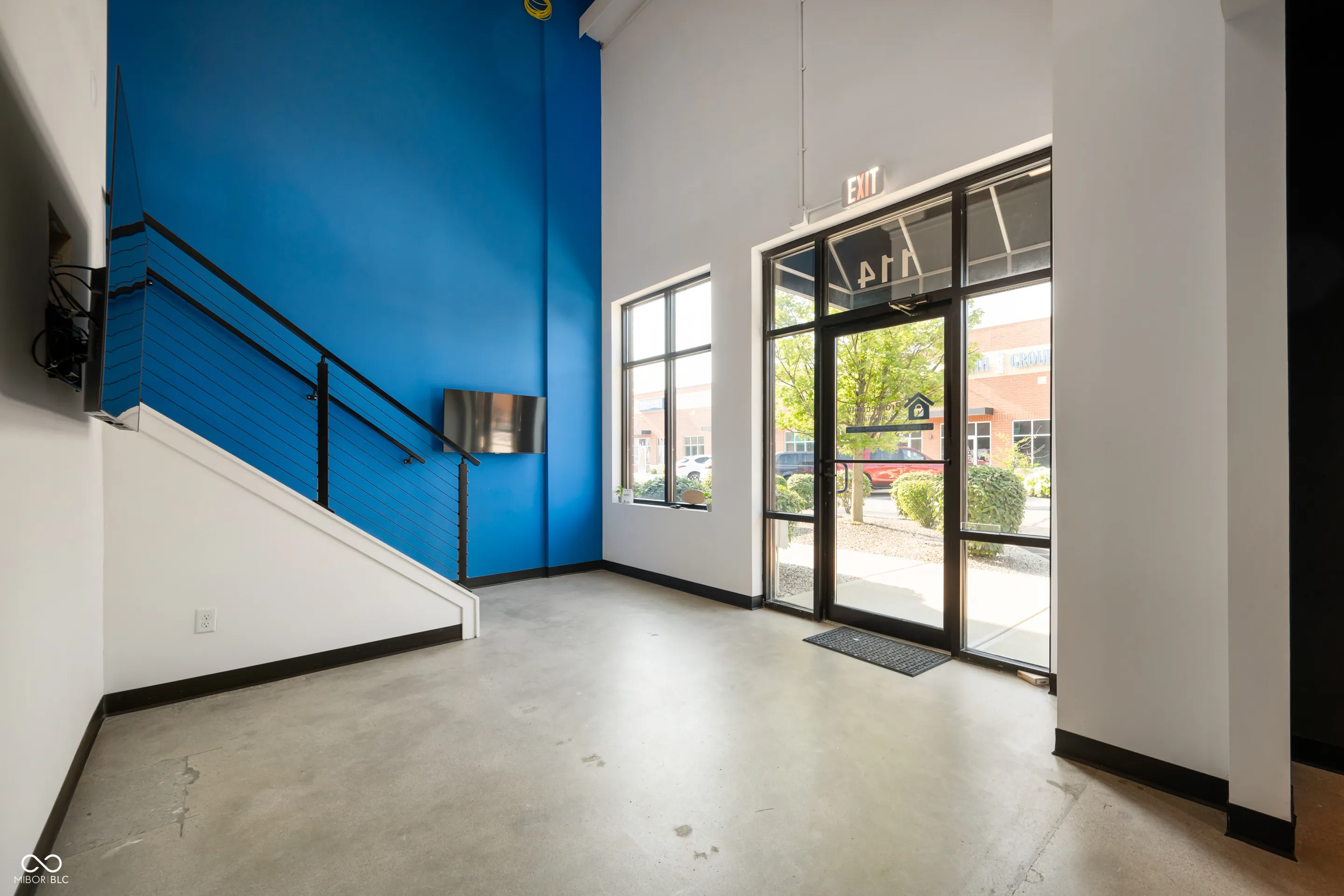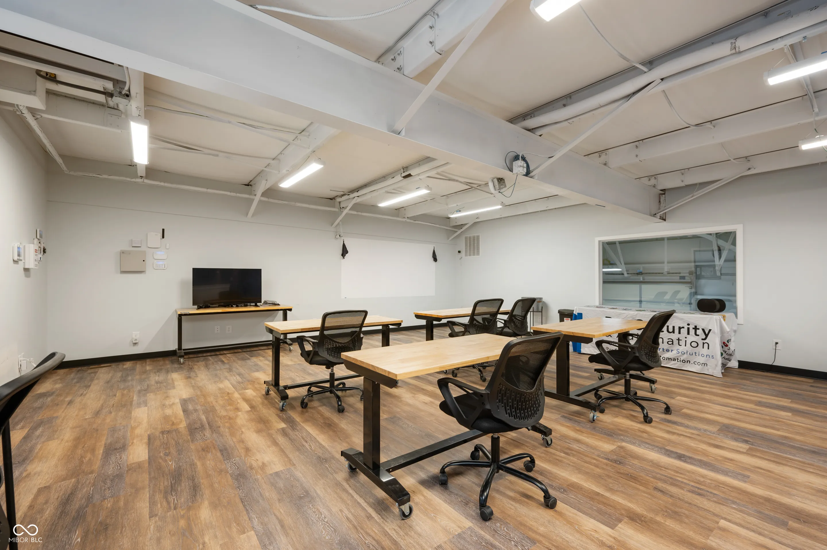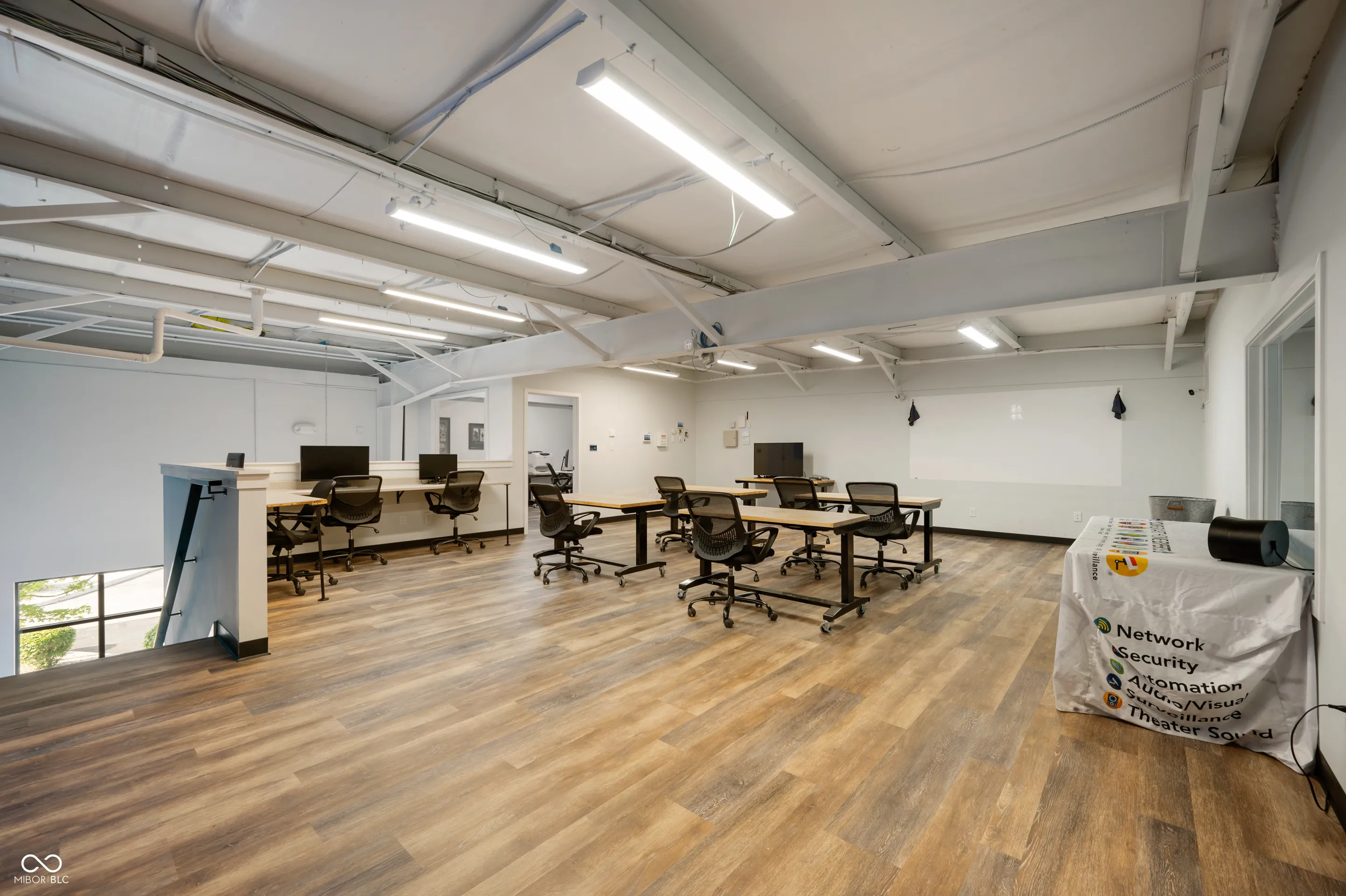 Great location, close to downtown Fishers and I-69! This new construction office and warehouse space was finished in 2023. The main level includes a conference room, office, bathroom and kitchen with quartz countertops, oversized sink, refrigerator, microwave and coffee bar. Finishes include 10 ft ceilings, concrete floors, recessed LED lighting, smart thermostat, built-in speakers, security system w/ monitored smoke alarm, fiber optic boosted internet and is loaded in the tech dept. The warehouse provides 1,000 sqft, two 14 ft overhead garage doors, 2 rear access doors, 21 ft ceilings, concrete floors, built in cabinets and countertops for additional workspace and a 2nd bathroom. The upper level has LVP flooring, an executive office and large training room that is pre-wired for approximately 15 desk spaces with data jacks located every 6 ft. Oversee the warehouse space from the large window in the training room. Take advantage of this well designed space for your business!