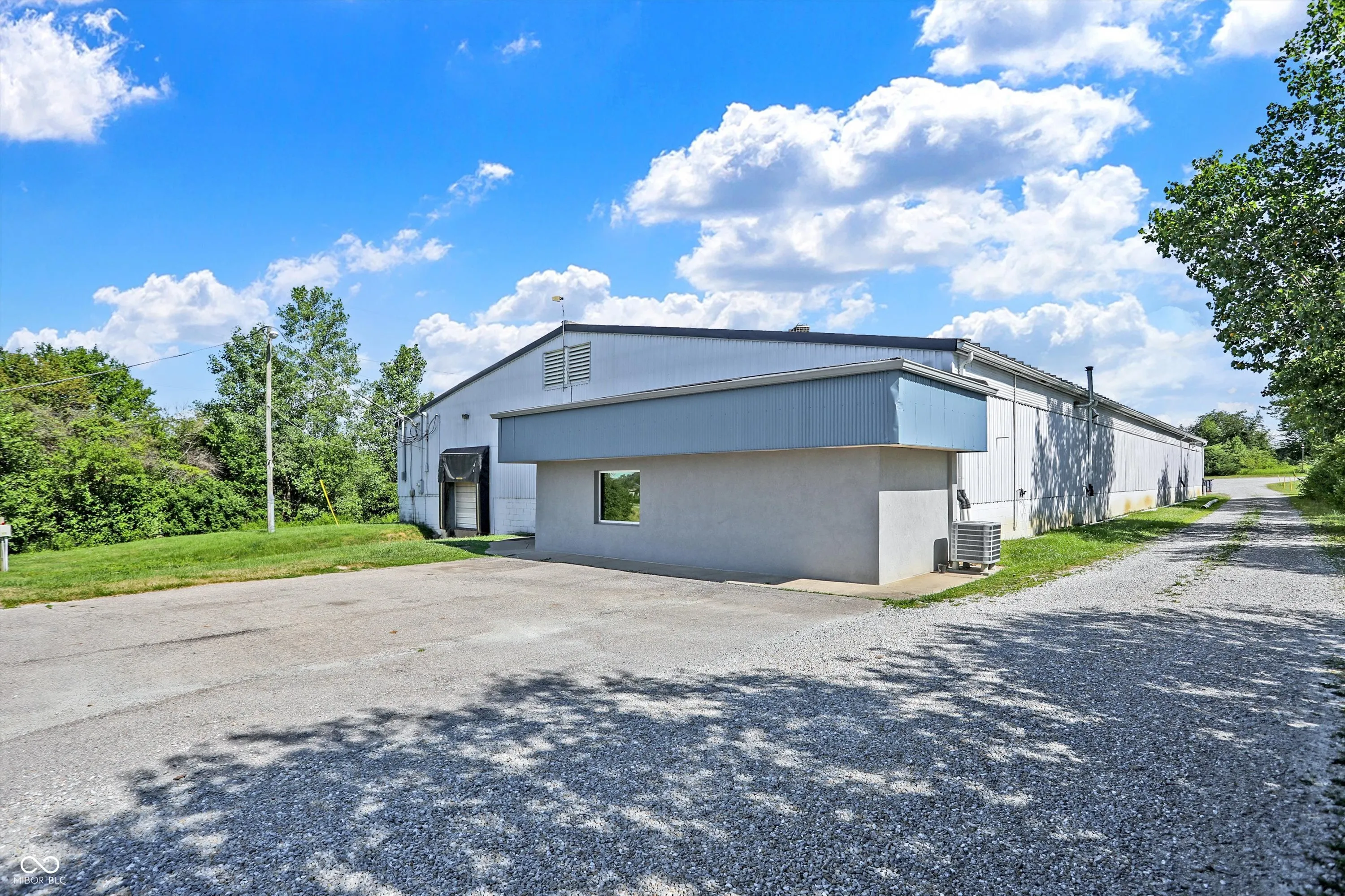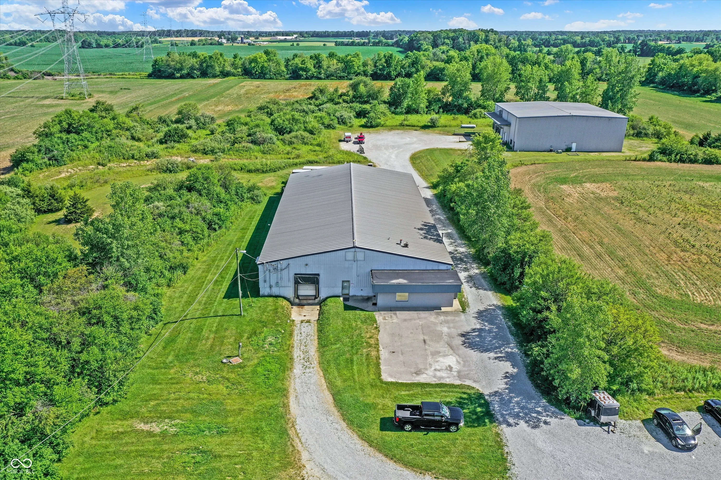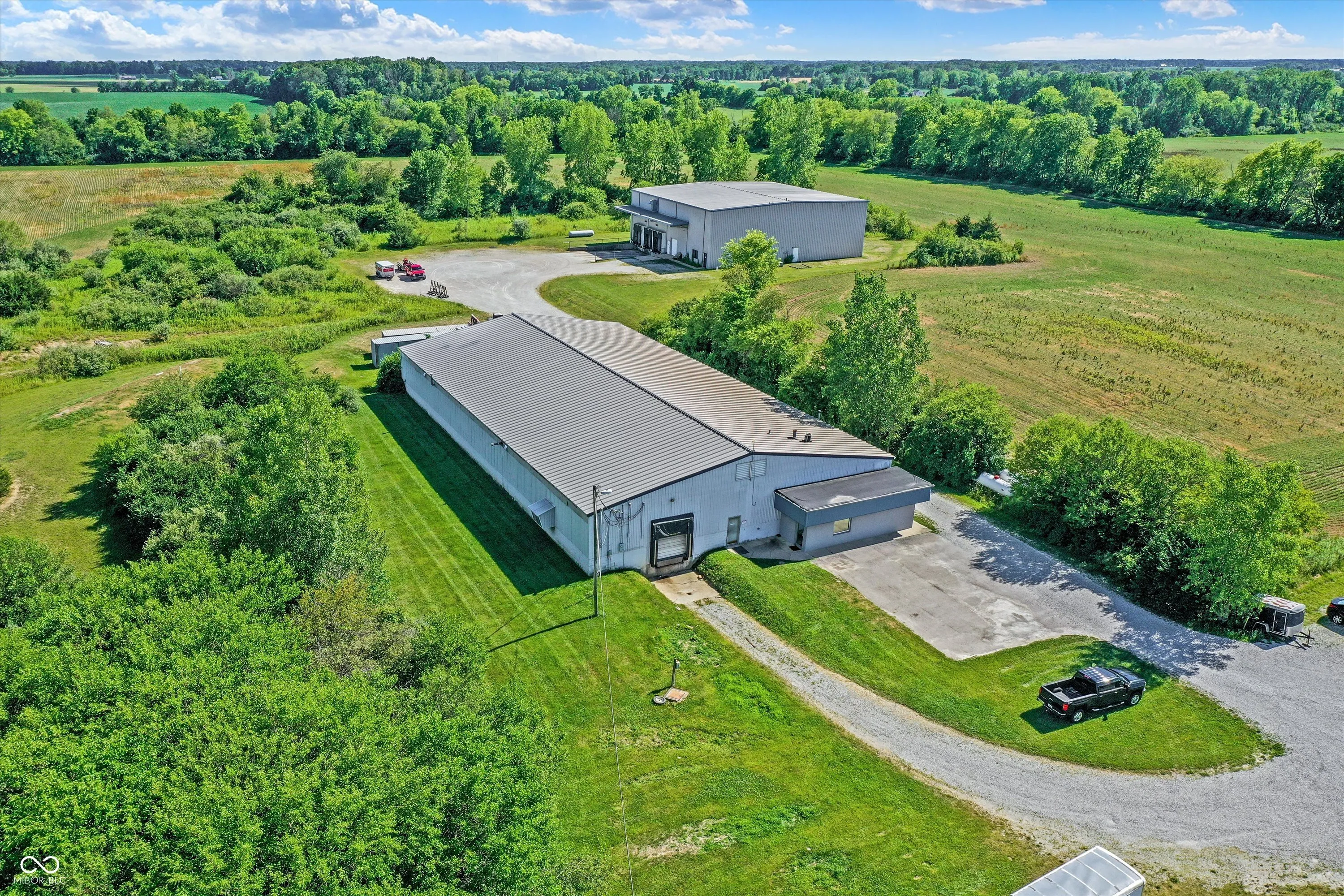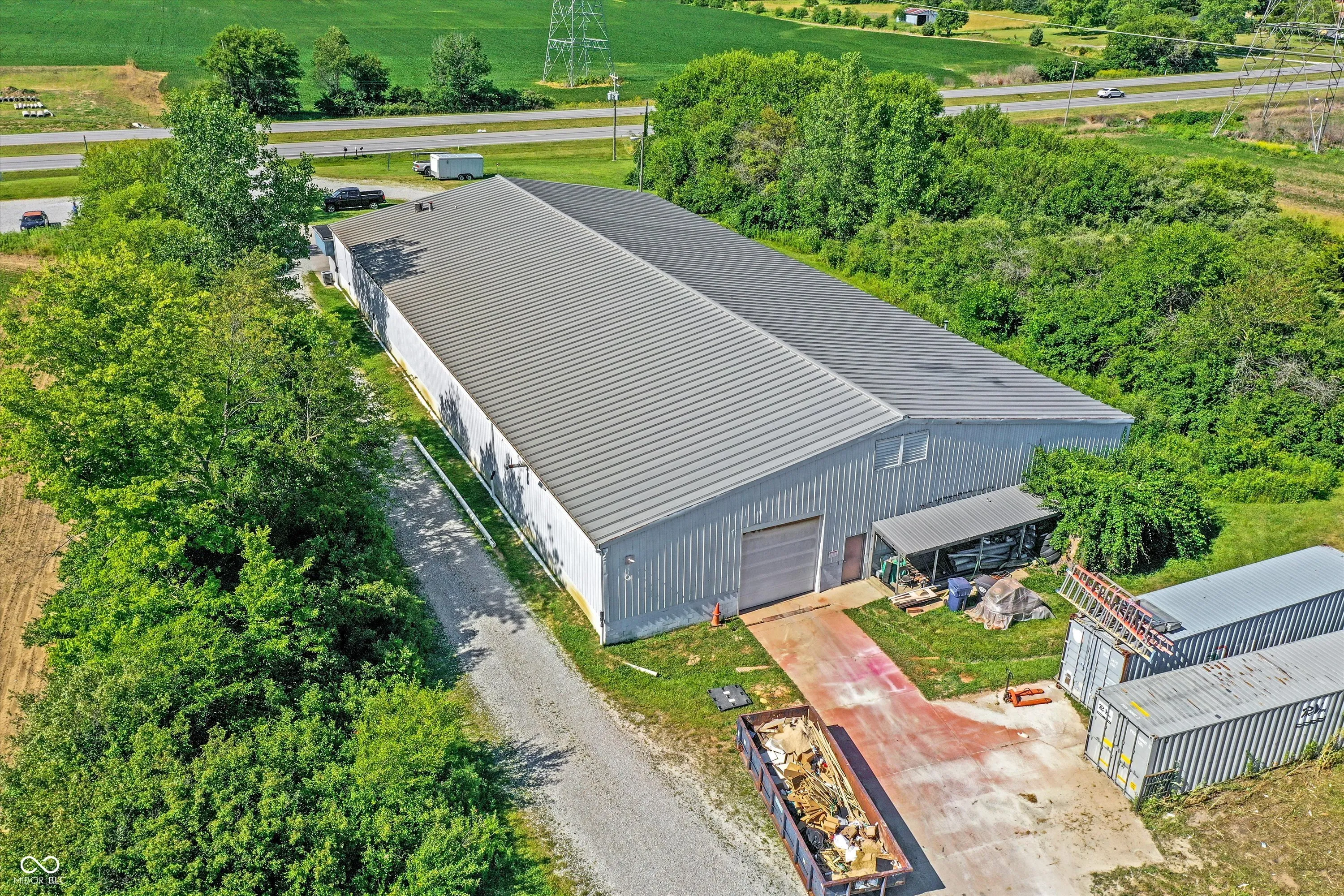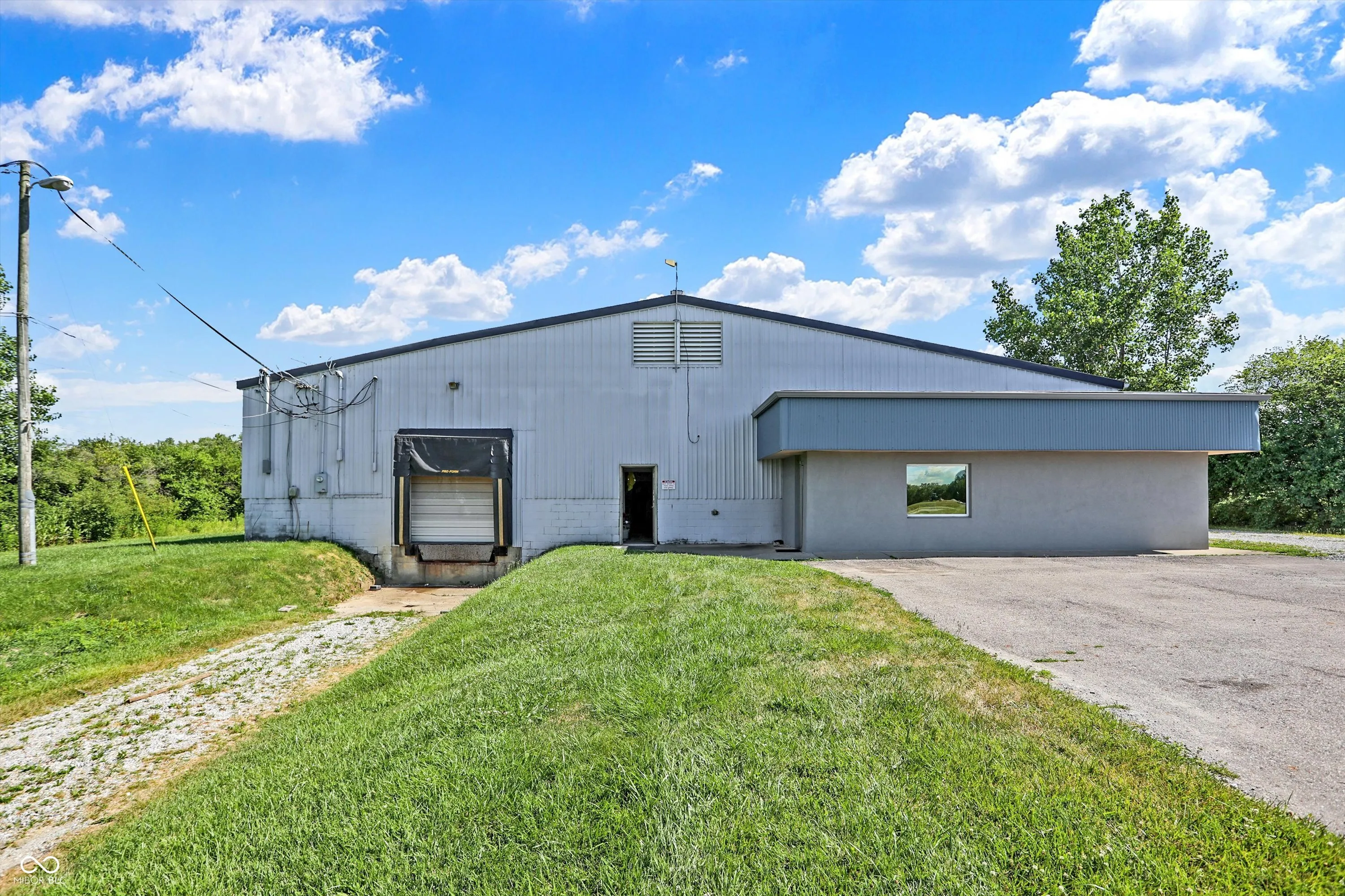 Steel building with loading dock & leveler, plus rear overhead door access. Present (cabinet company) and past use has been for manufacturing zoned “Industrial Light”. Small office area has gas forced air heat & central air, manufacturing area has gas space heaters. Has 12′ overhead door and 14′ ceiling height, center post support. Adjacent 16 acres can also be purchased for another owner. Driveway on west side of building has a permanent easement for use by adjacent property south.