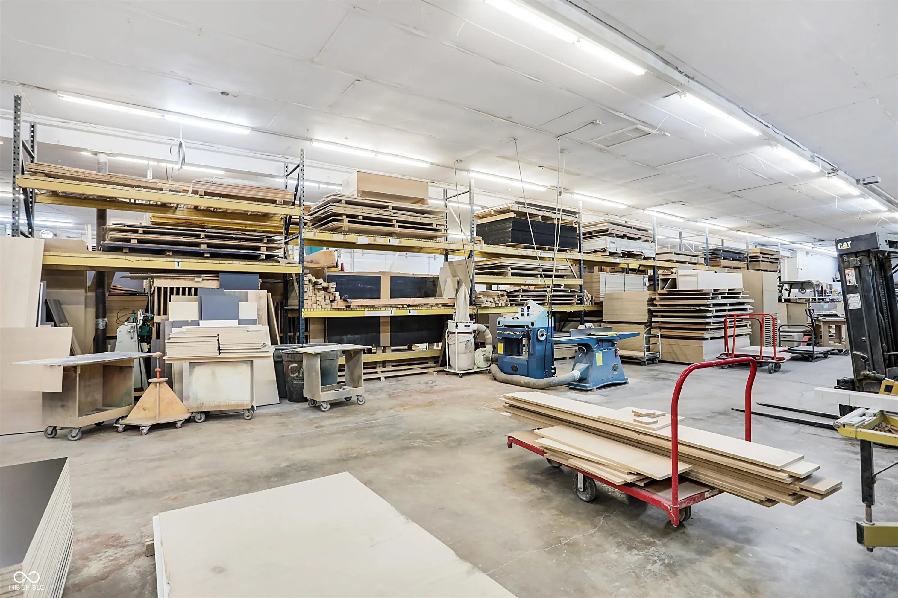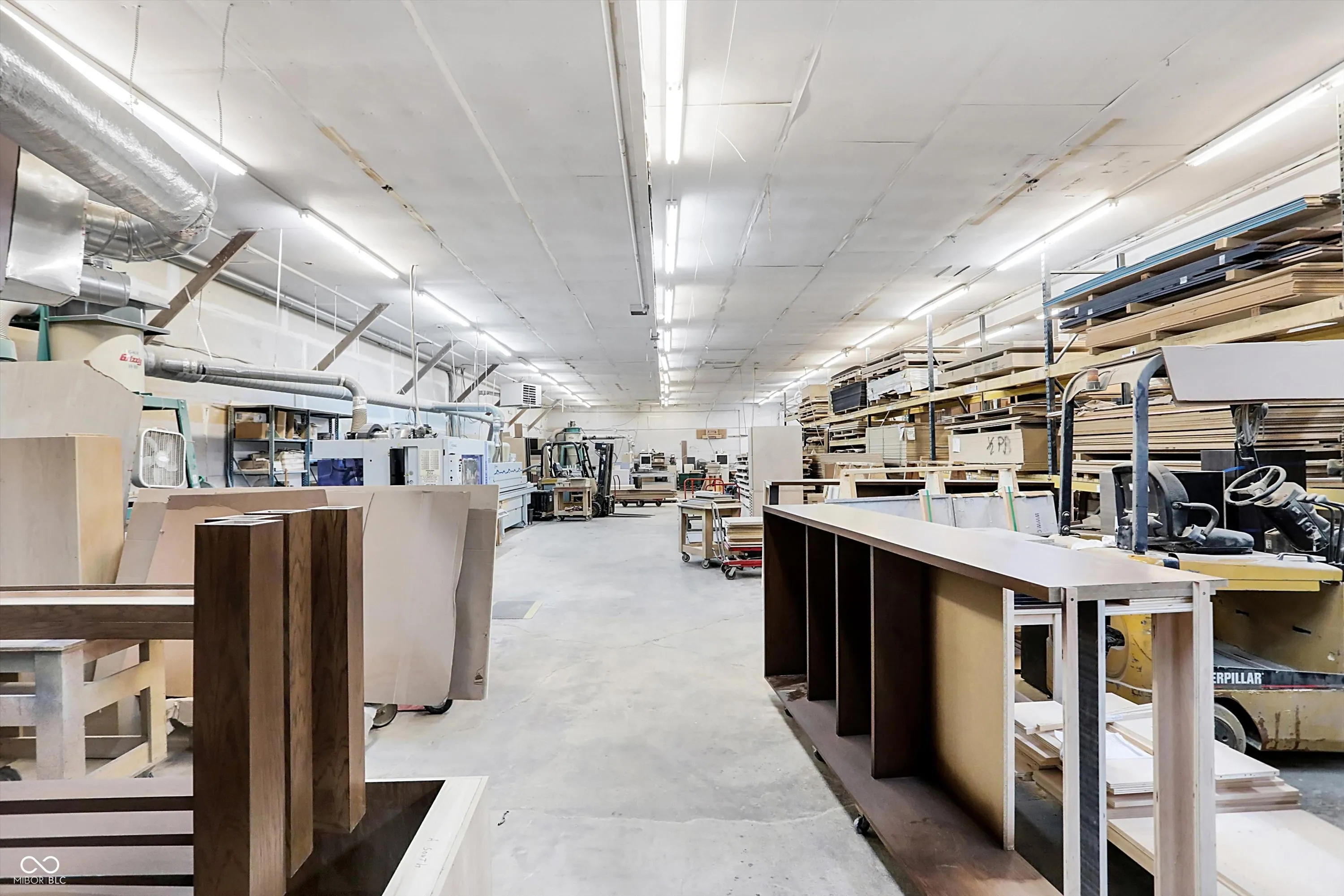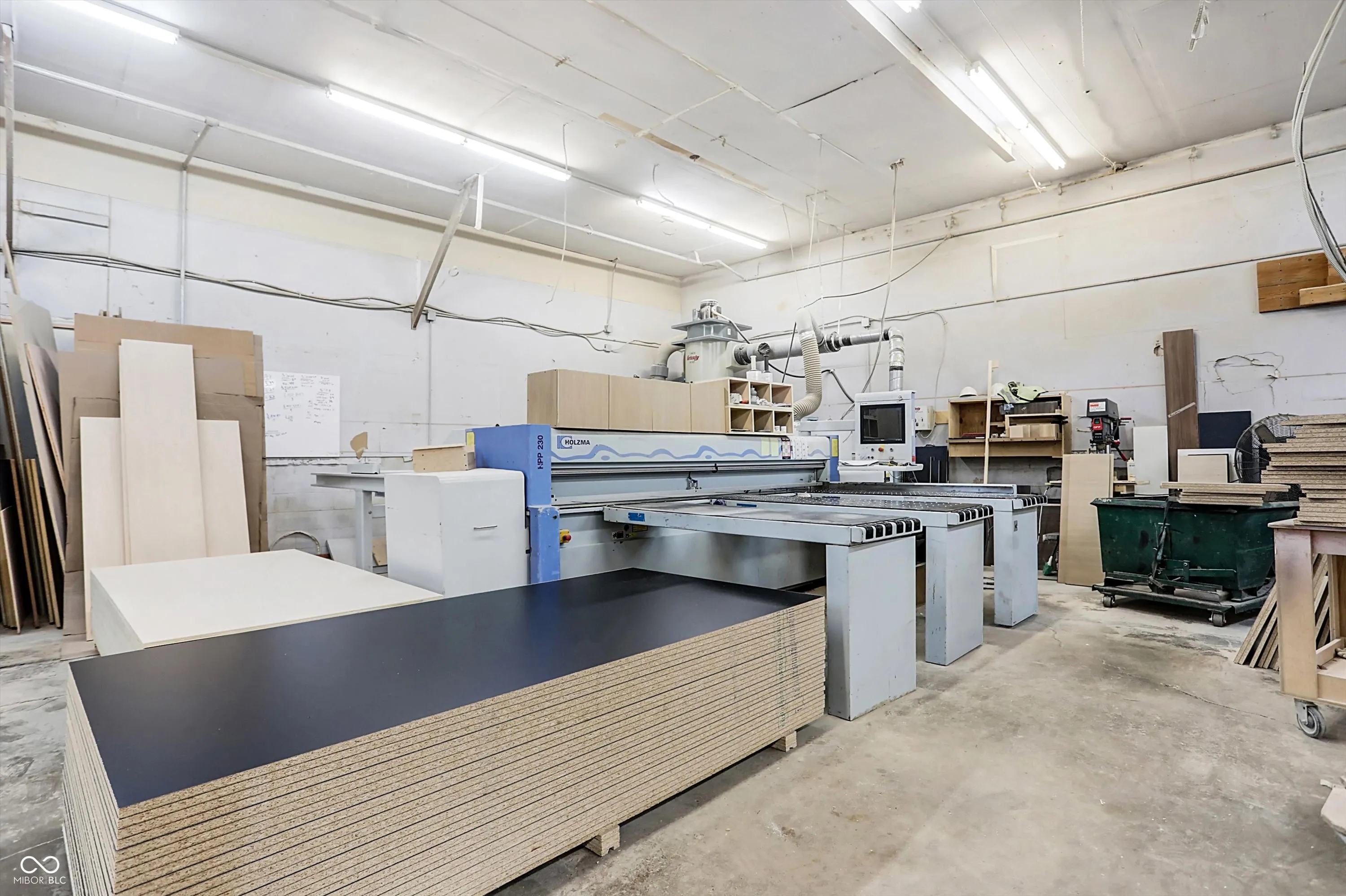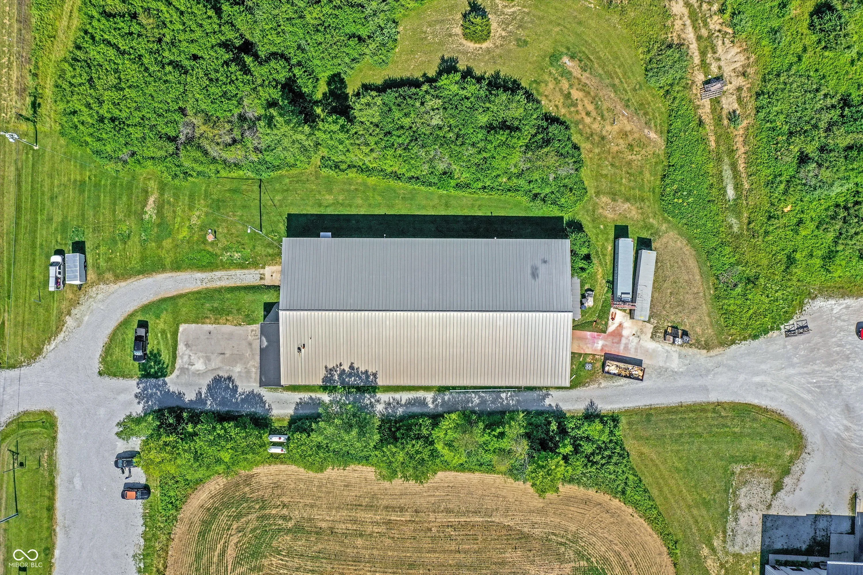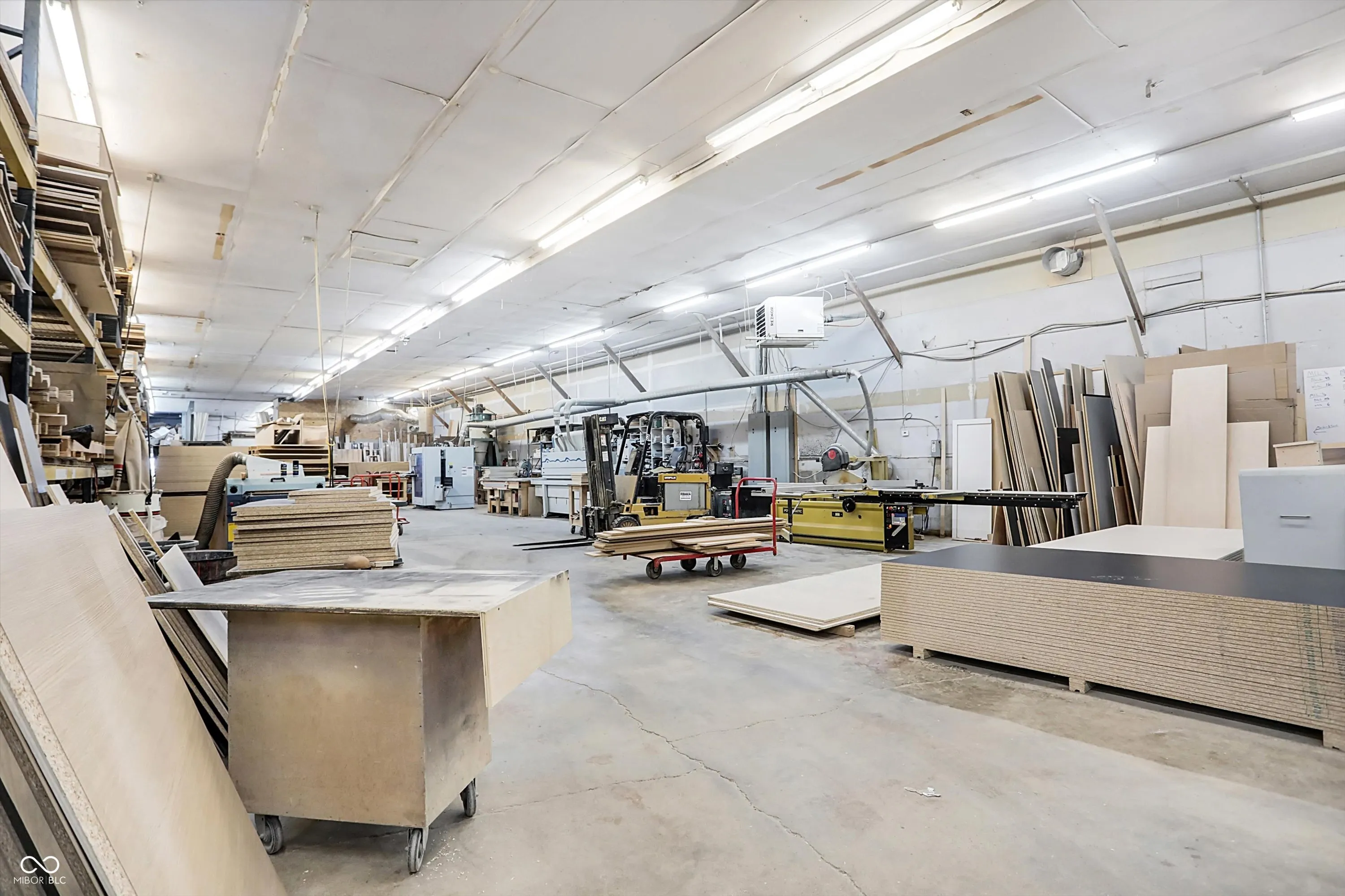 Steel building with loading dock & leveler, plus rear overhead door access. Present (cabinet company) and past use has been for manufacturing zoned “Industrial Light”. Small office area has gas forced air heat & central air, manufacturing area has gas space heaters. Has 12′ overhead door and 14′ ceiling height, center post support. Adjacent 16 acres can also be purchased for another owner. Driveway on west side of building has a permanent easement for use by adjacent property south.
