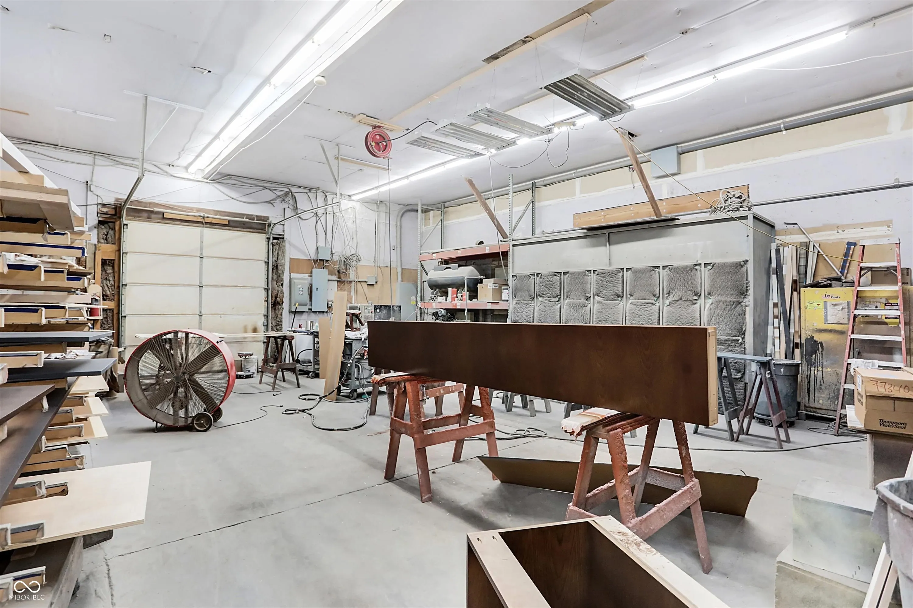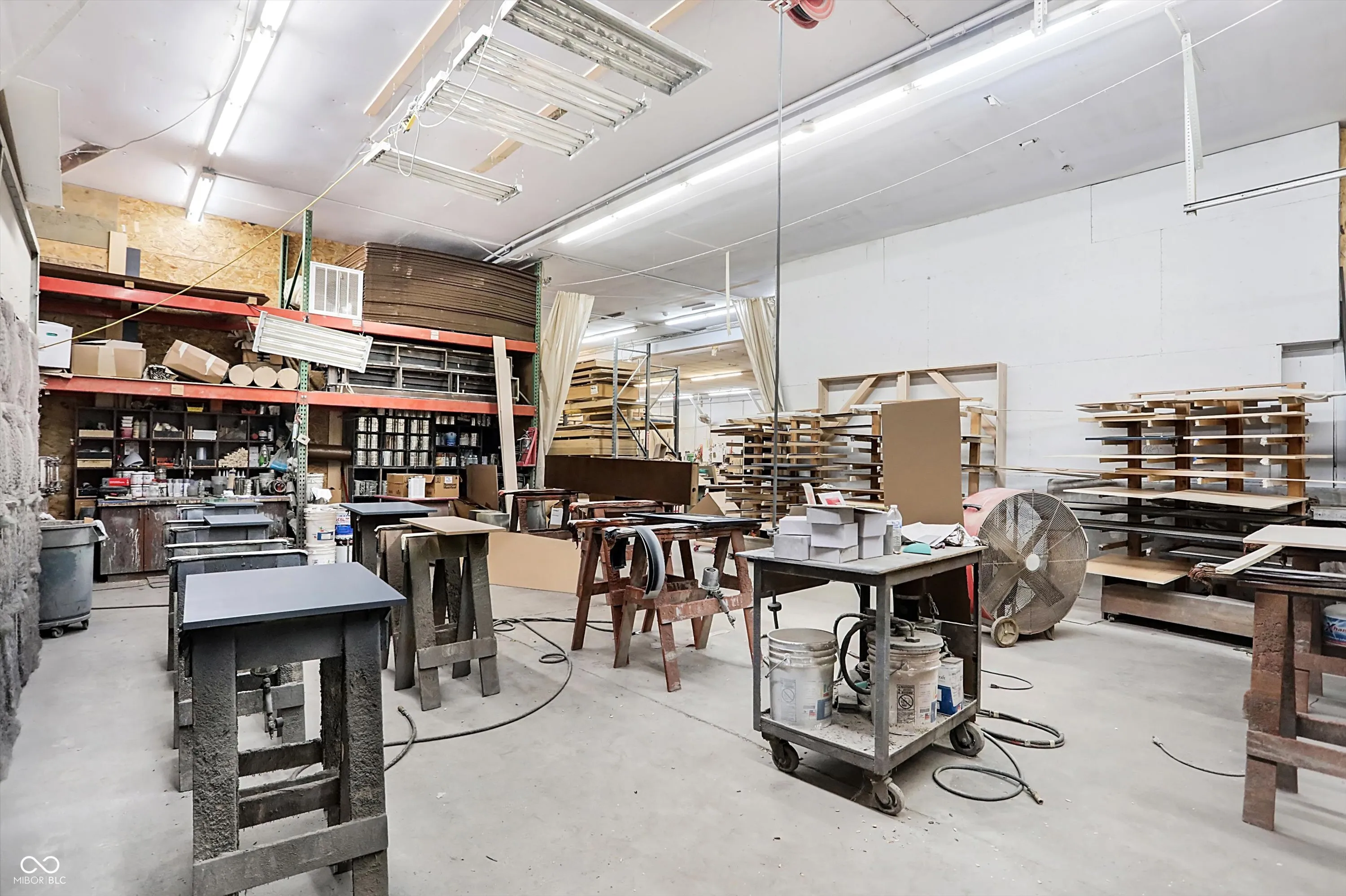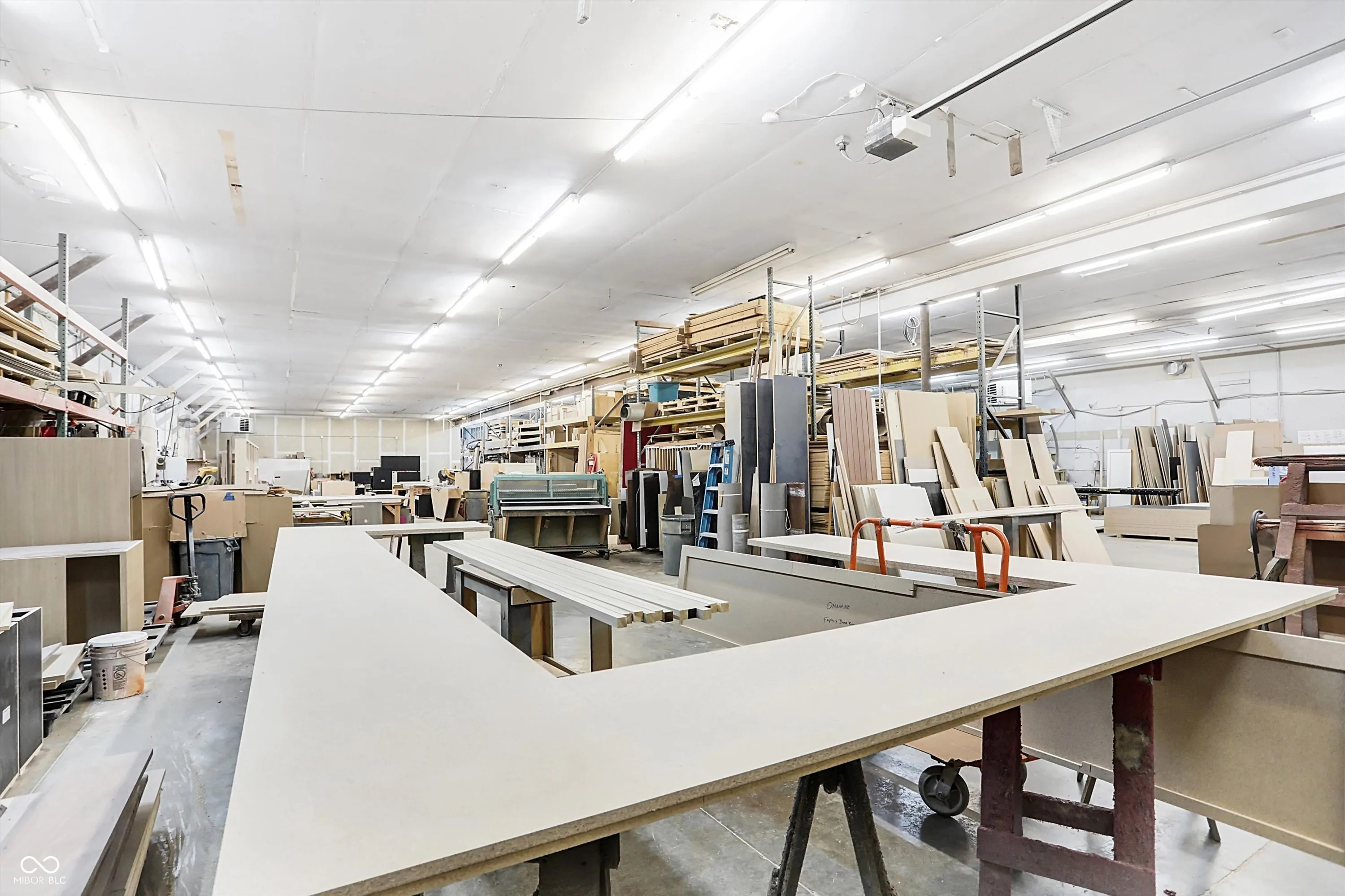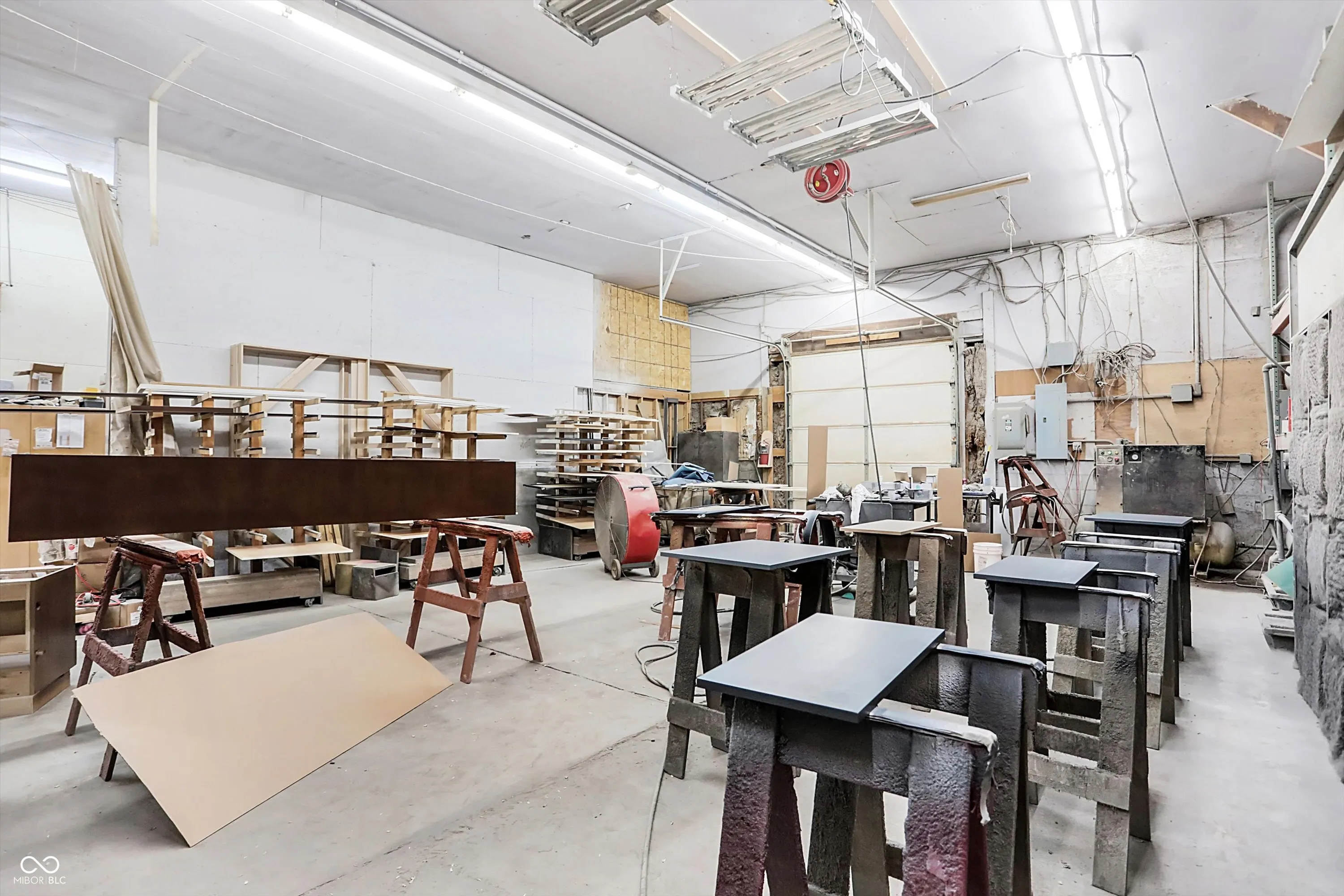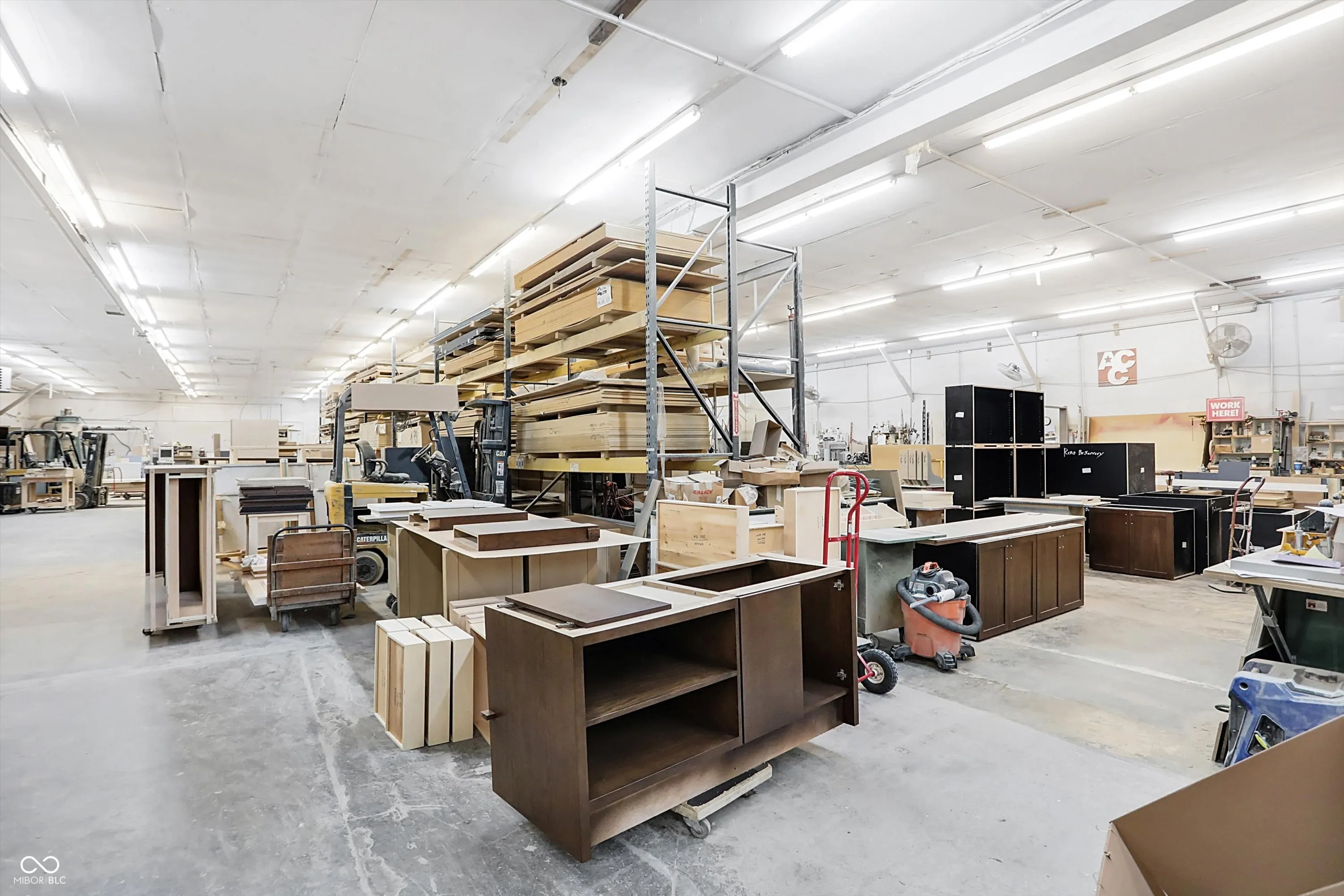 Steel building with loading dock & leveler, plus rear overhead door access. Present (cabinet company) and past use has been for manufacturing zoned “Industrial Light”. Small office area has gas forced air heat & central air, manufacturing area has gas space heaters. Has 12′ overhead door and 14′ ceiling height, center post support. Adjacent 16 acres can also be purchased for another owner. Driveway on west side of building has a permanent easement for use by adjacent property south.