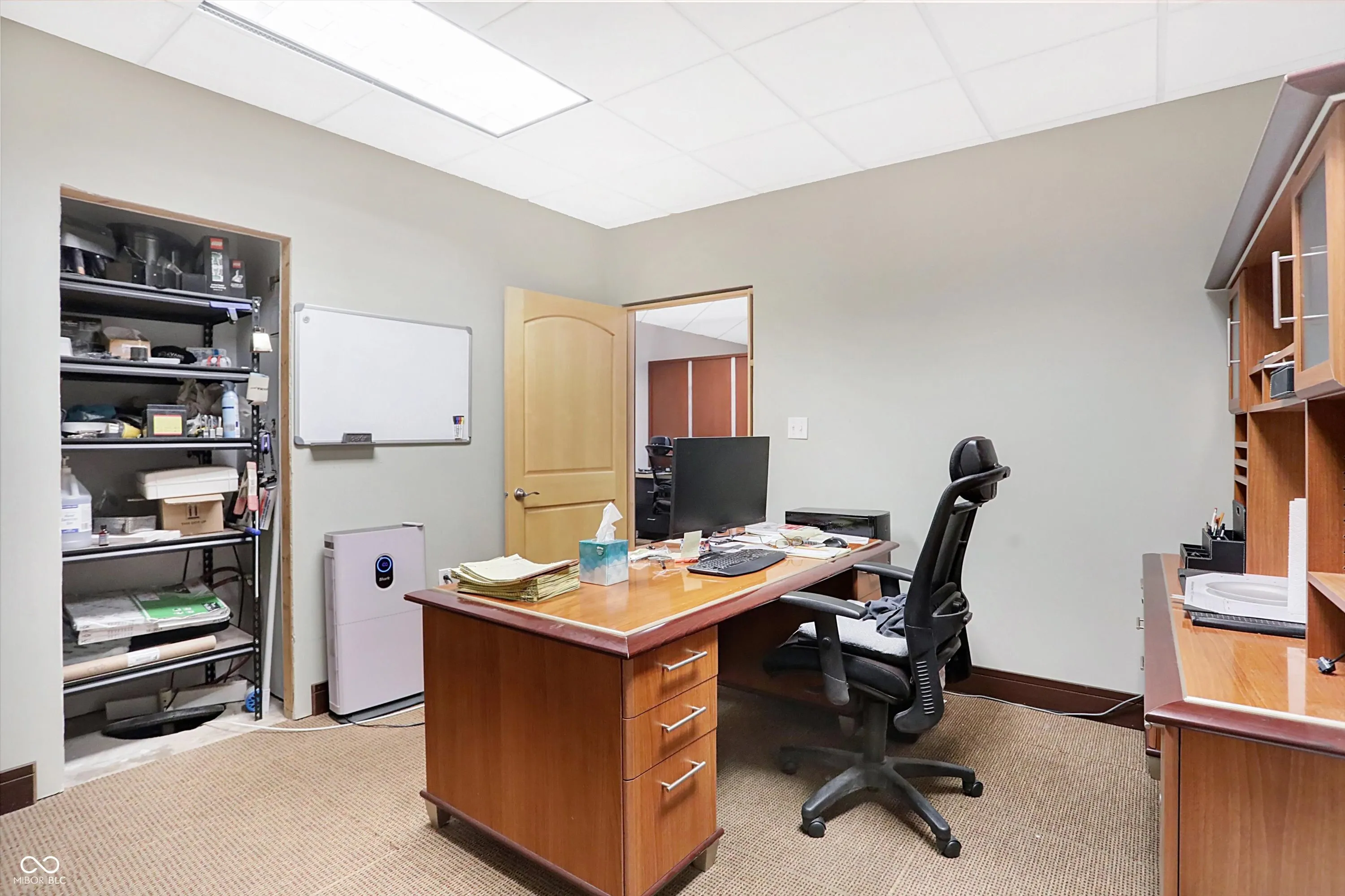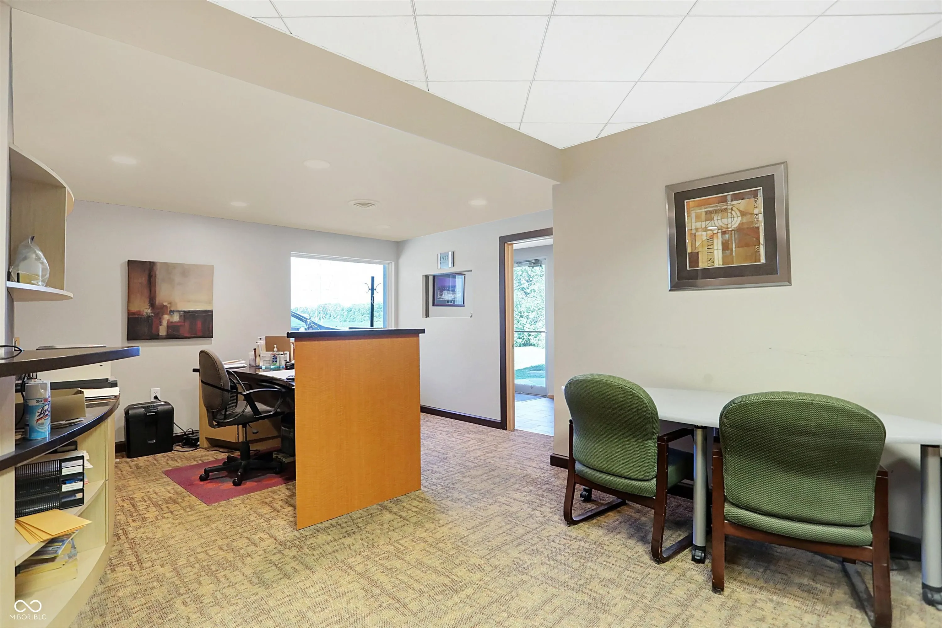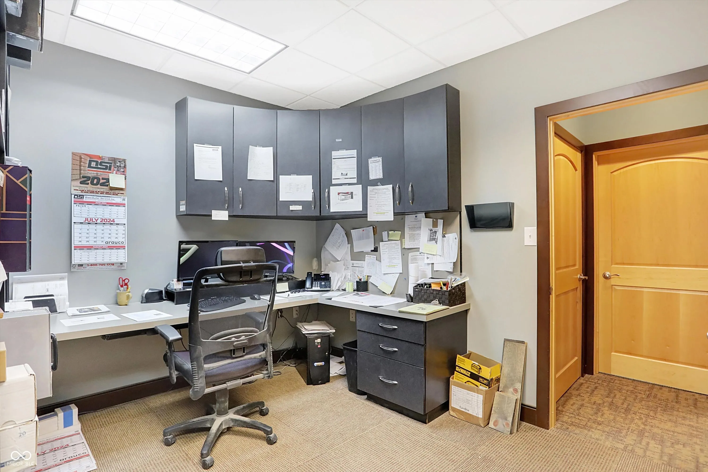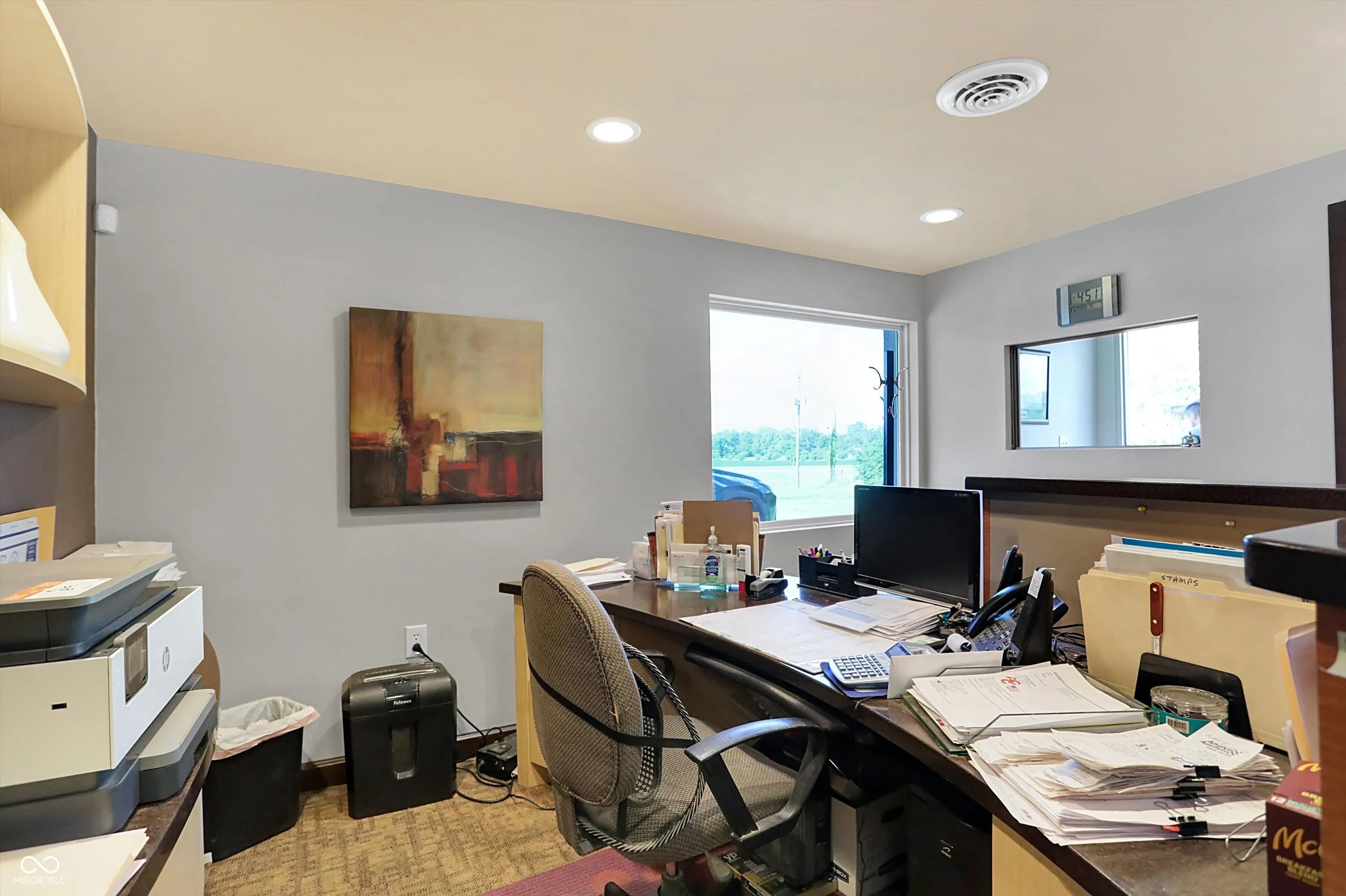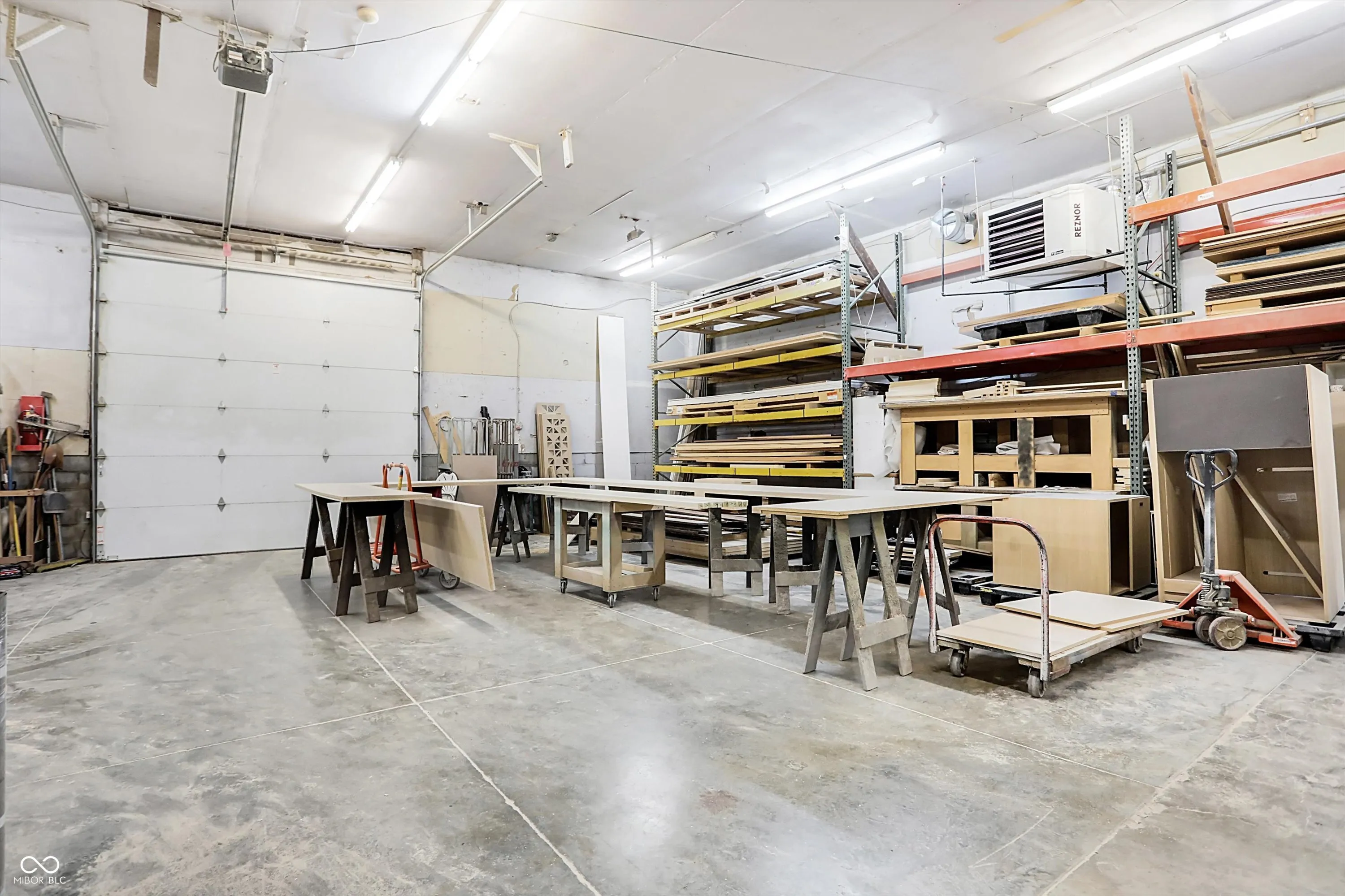 Steel building with loading dock & leveler, plus rear overhead door access. Present (cabinet company) and past use has been for manufacturing zoned “Industrial Light”. Small office area has gas forced air heat & central air, manufacturing area has gas space heaters. Has 12′ overhead door and 14′ ceiling height, center post support. Adjacent 16 acres can also be purchased for another owner. Driveway on west side of building has a permanent easement for use by adjacent property south.