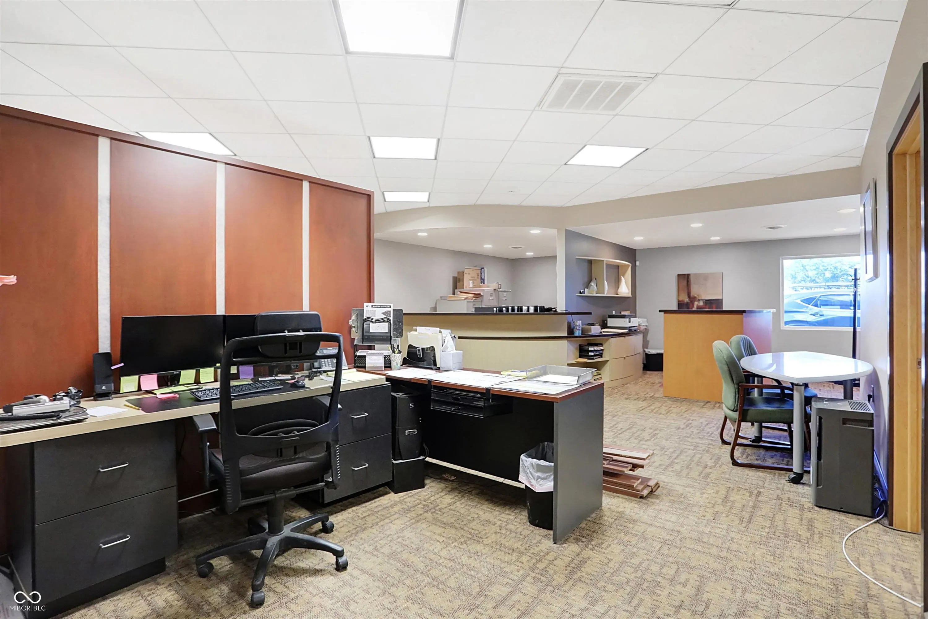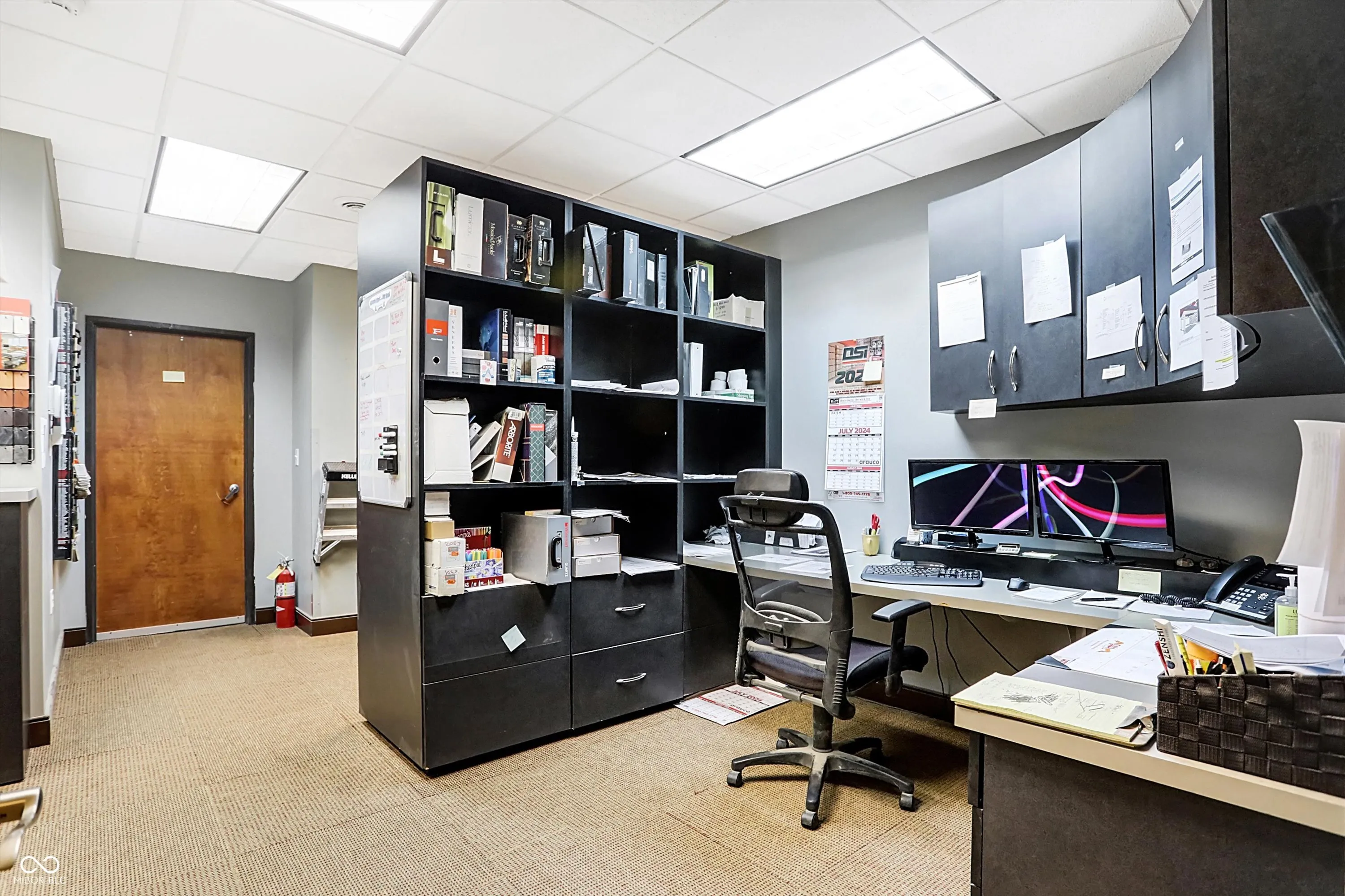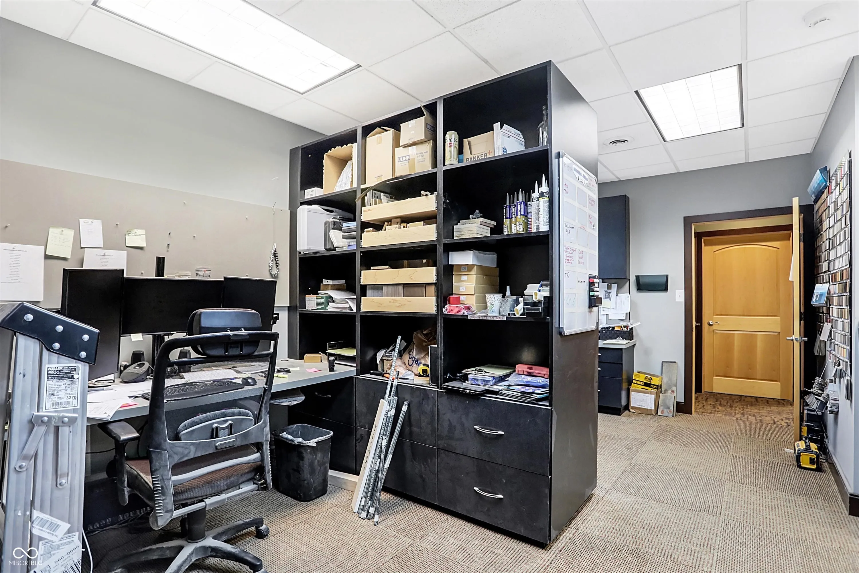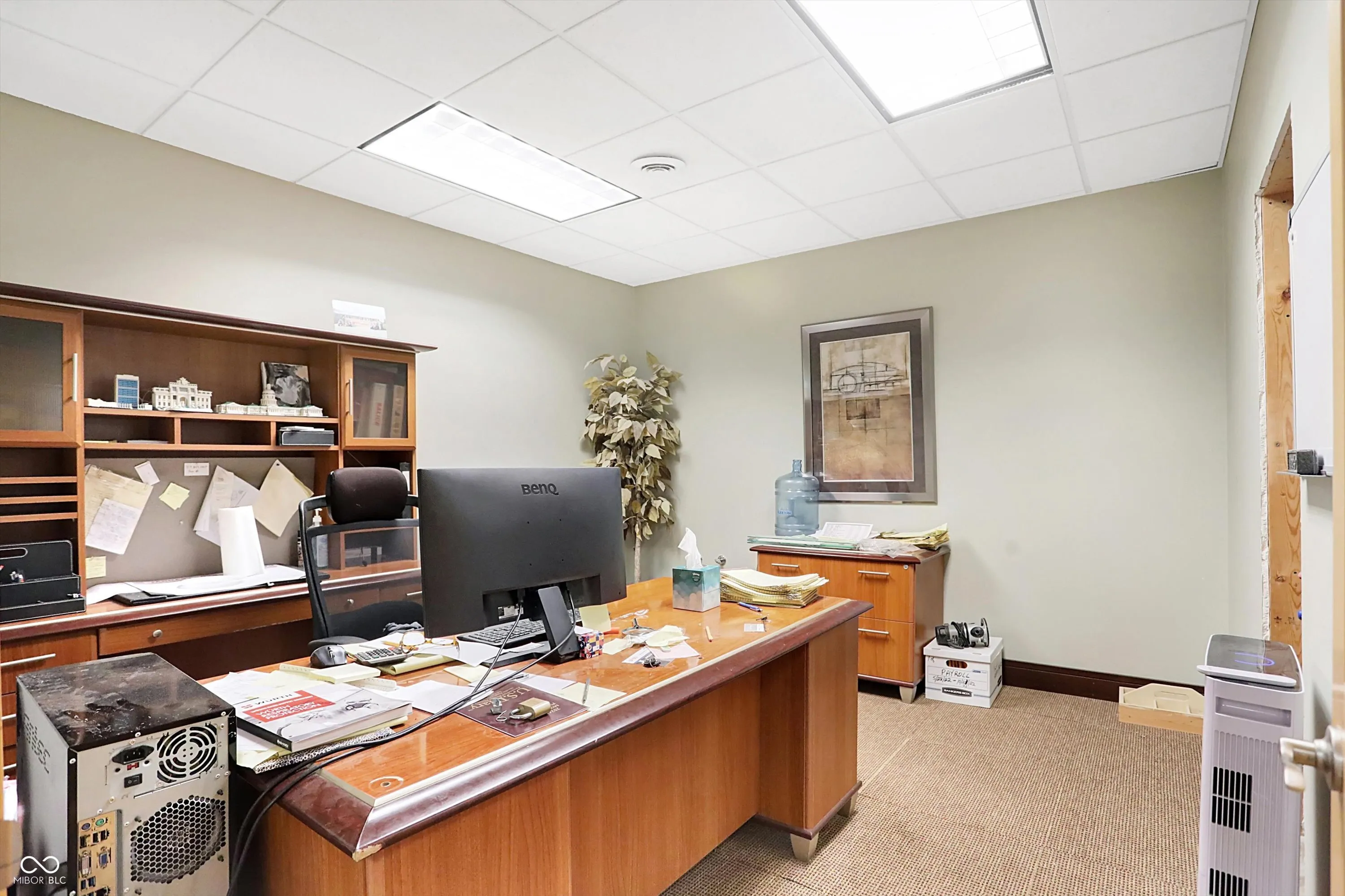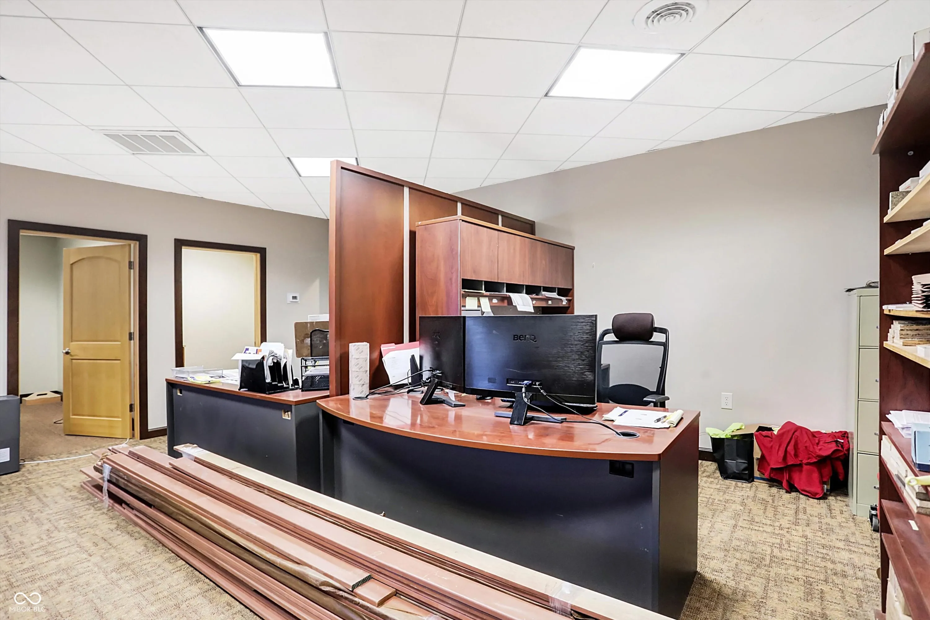 Steel building with loading dock & leveler, plus rear overhead door access. Present (cabinet company) and past use has been for manufacturing zoned “Industrial Light”. Small office area has gas forced air heat & central air, manufacturing area has gas space heaters. Has 12′ overhead door and 14′ ceiling height, center post support. Adjacent 16 acres can also be purchased for another owner. Driveway on west side of building has a permanent easement for use by adjacent property south.