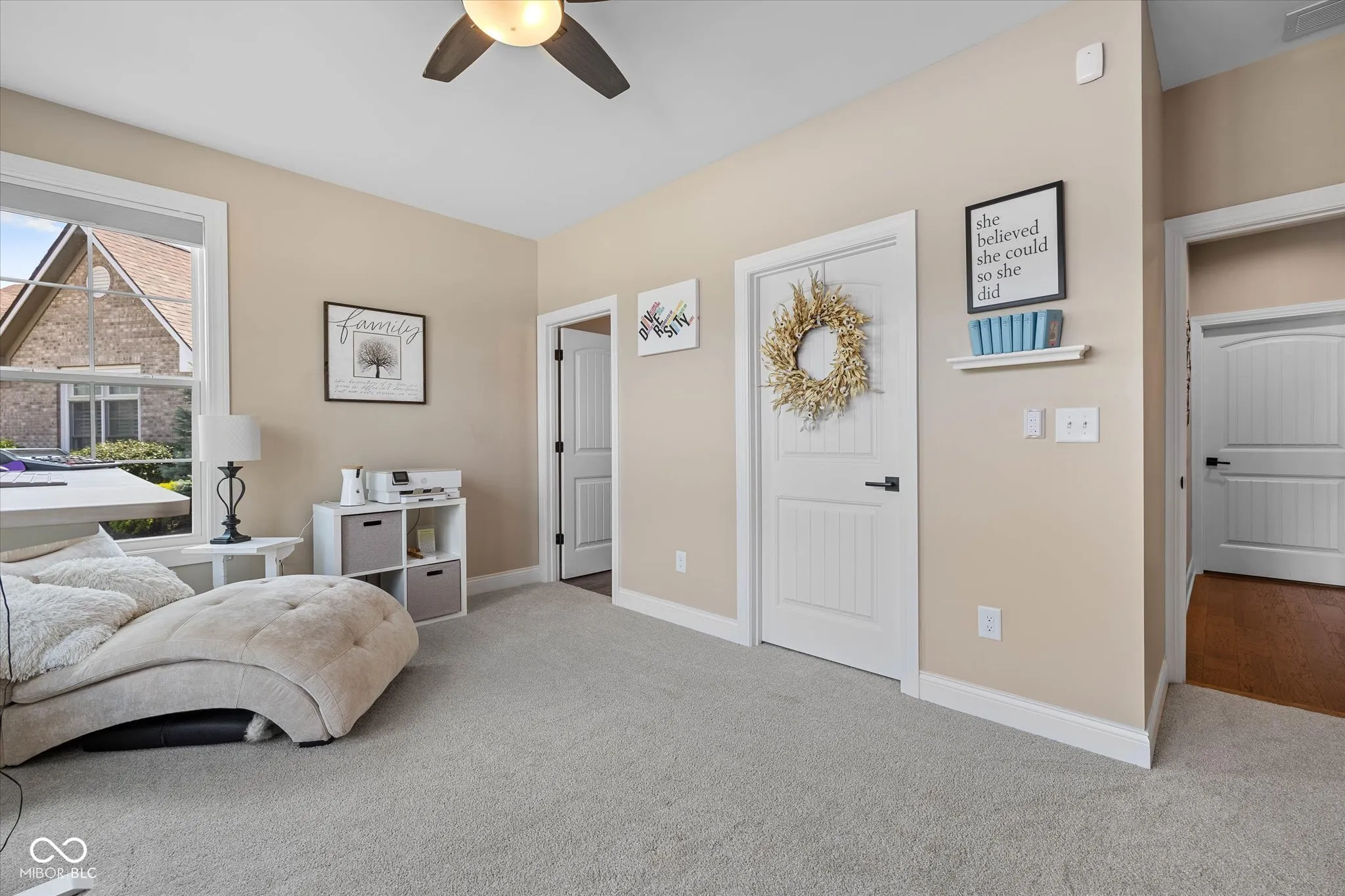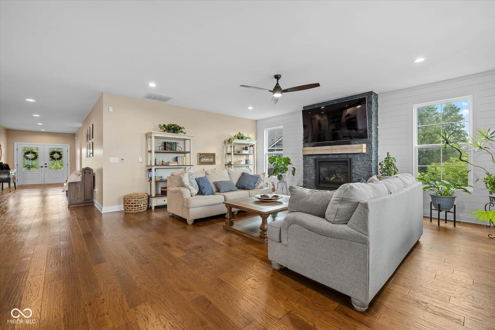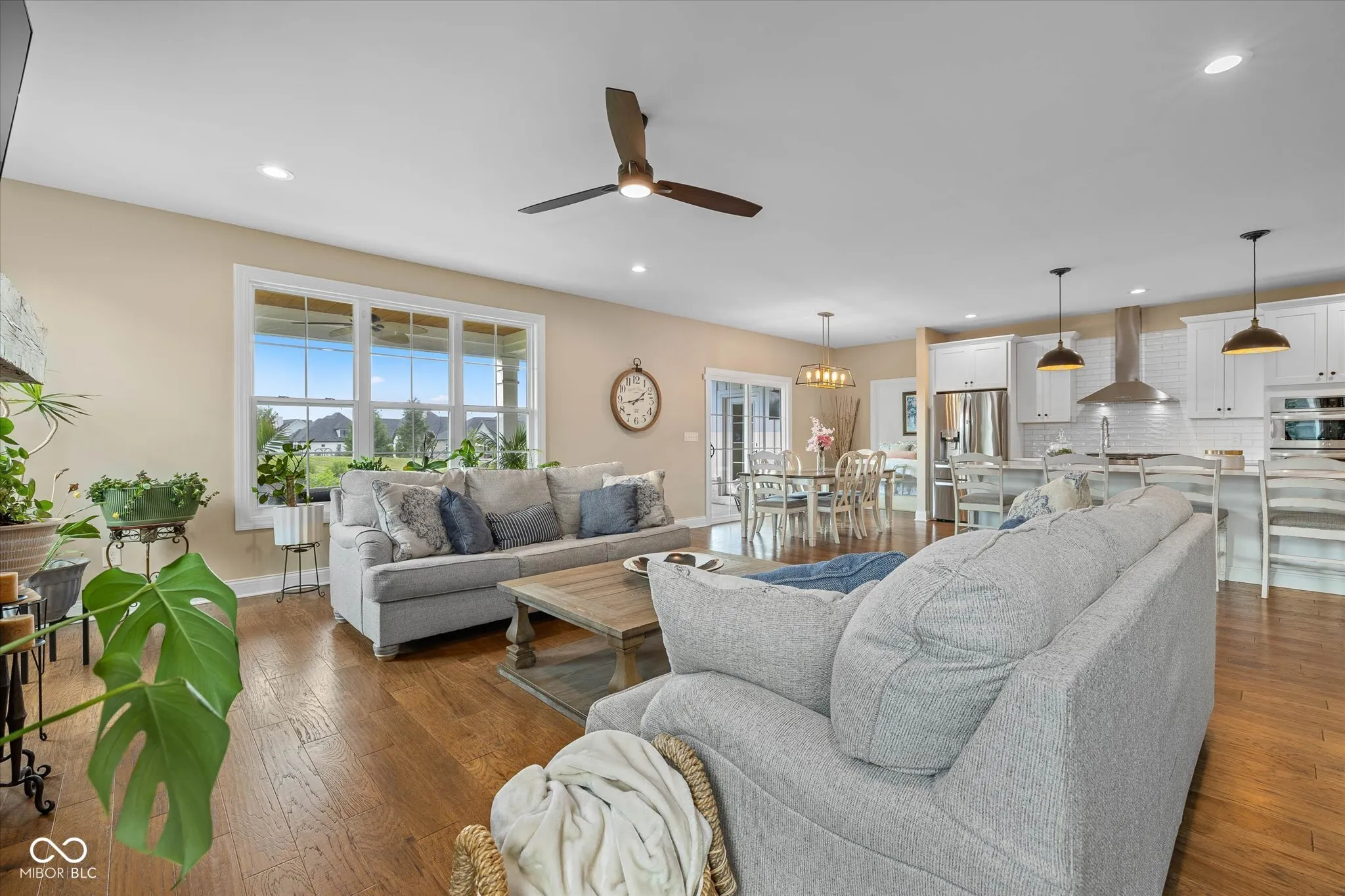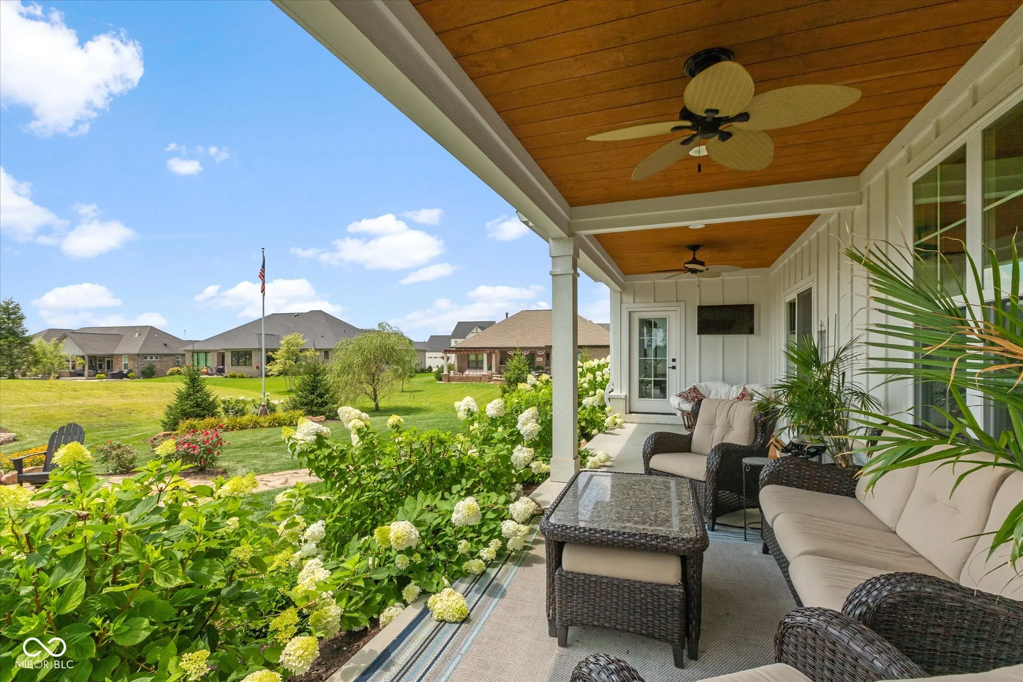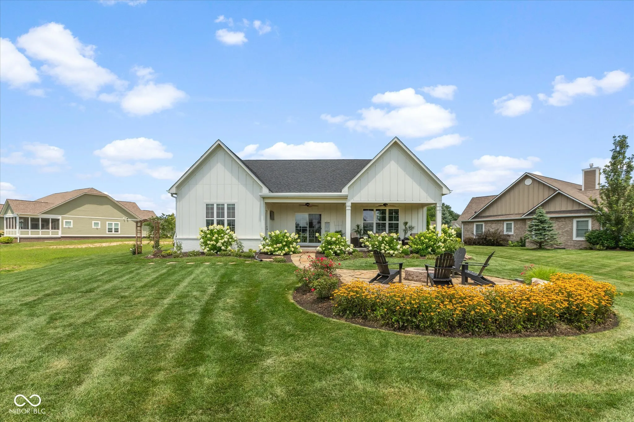 Modern Farmhouse on The 11th hole of the Hillview Golf Course! Nestled in a cul-de-sac, this custom home w/tons of landscaping has much to offer. Large entry w/9′ ceilings, recessed lights & Engineered Hardwood flooring invite you into this spacious living area. Custom kitchen w/Quartz counters, SS farm sink, Cabinets w/soft close drawers & doors & tons of pull-outs. Zline 6-burner gas range w/exhausted hood & Blt-in double oven add to the highlights along with the Walk-in Pantry & Pot filler at your coffee center w/Bev. Refrigerator. Kitchen is open to the large Living area w/Ship-lap wall accenting the slate brick fireplace & wood beam mantle. Windows line back of the house filling the living/kitchen/dining area w/tons of natural light & looks out to the large 33×9 covered back porch area w/cedar plank ceiling. Primary Bedroom W/trayed ceiling & private door to back porch & lots of windows as well. Primary bath has 9′ vanity w/Double sinks & lots of drawers, Tiled Walk-in shower & custom organized walk-in closet. Bedroom 2 & 3 BOTH have walk-in closets & their OWN full bathrooms as well! Loft has 1/2 bath & closet & is setup to be a 4th bedroom or a movie theater space w/the 120″ motorized screen that drops from the ceiling to be used with the included projector & sound system. Walk-in Attic could be finished for Bdrm. Garage has back bump for A golf cart w/electric charger station. Enjoy view of the golf course from your covered porch. Stone walk-way leads from covered porch to custom stone gas fireplace to enjoy the dark starry nights. HOA fee includes water for irrigation system, lawn cutting, bush trimming and front area mulching. Amazing views of Hillview Golf & Country Club which is one of the most affordable private clubs in central Indiana. Membership gives you access to golf, swimming pool, pickle ball courts, short game & practice range along with enjoying food at Lou’s Den or Big Woods. All just a couple minute walk/golf cart drive from your back yard.