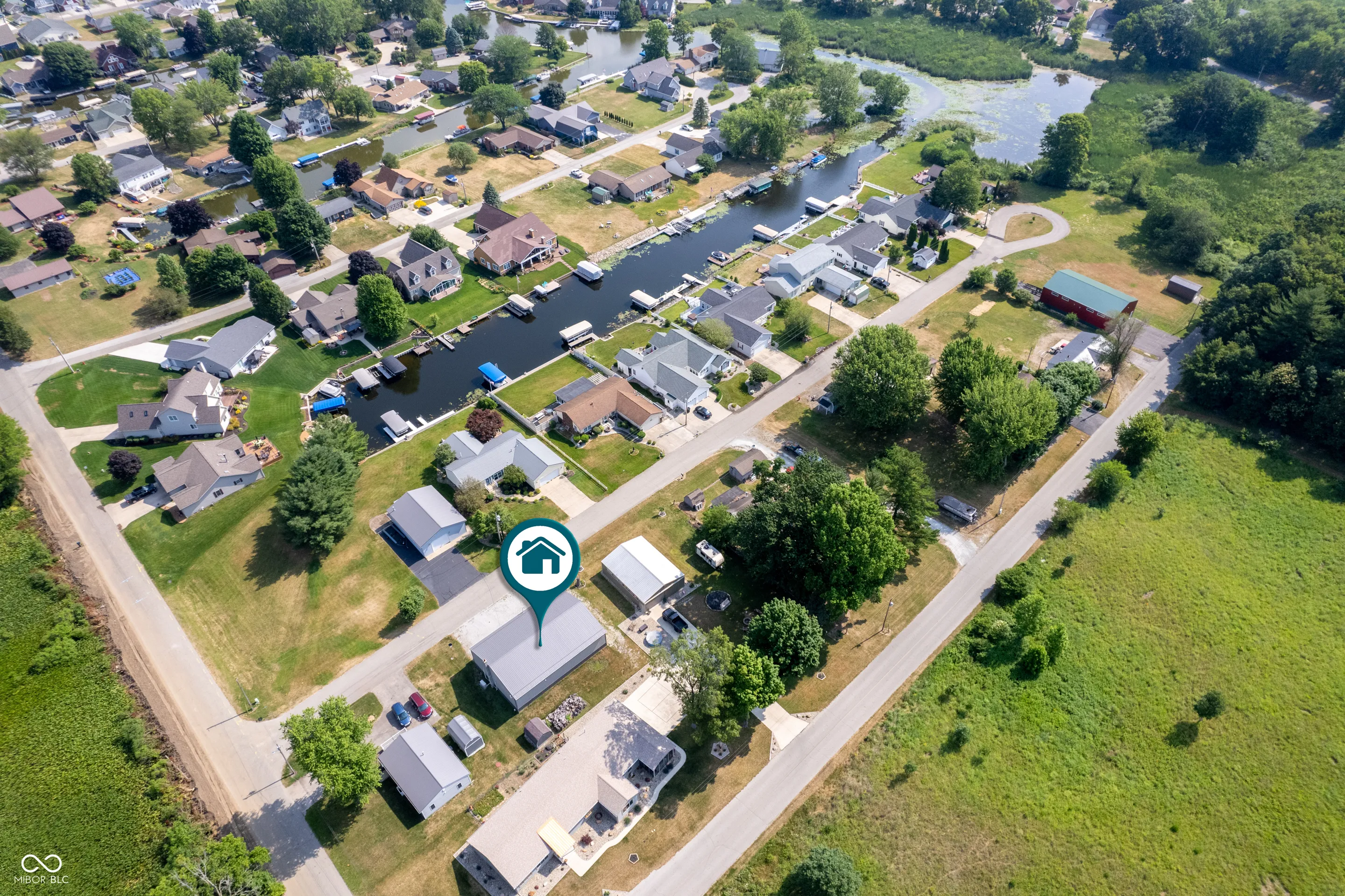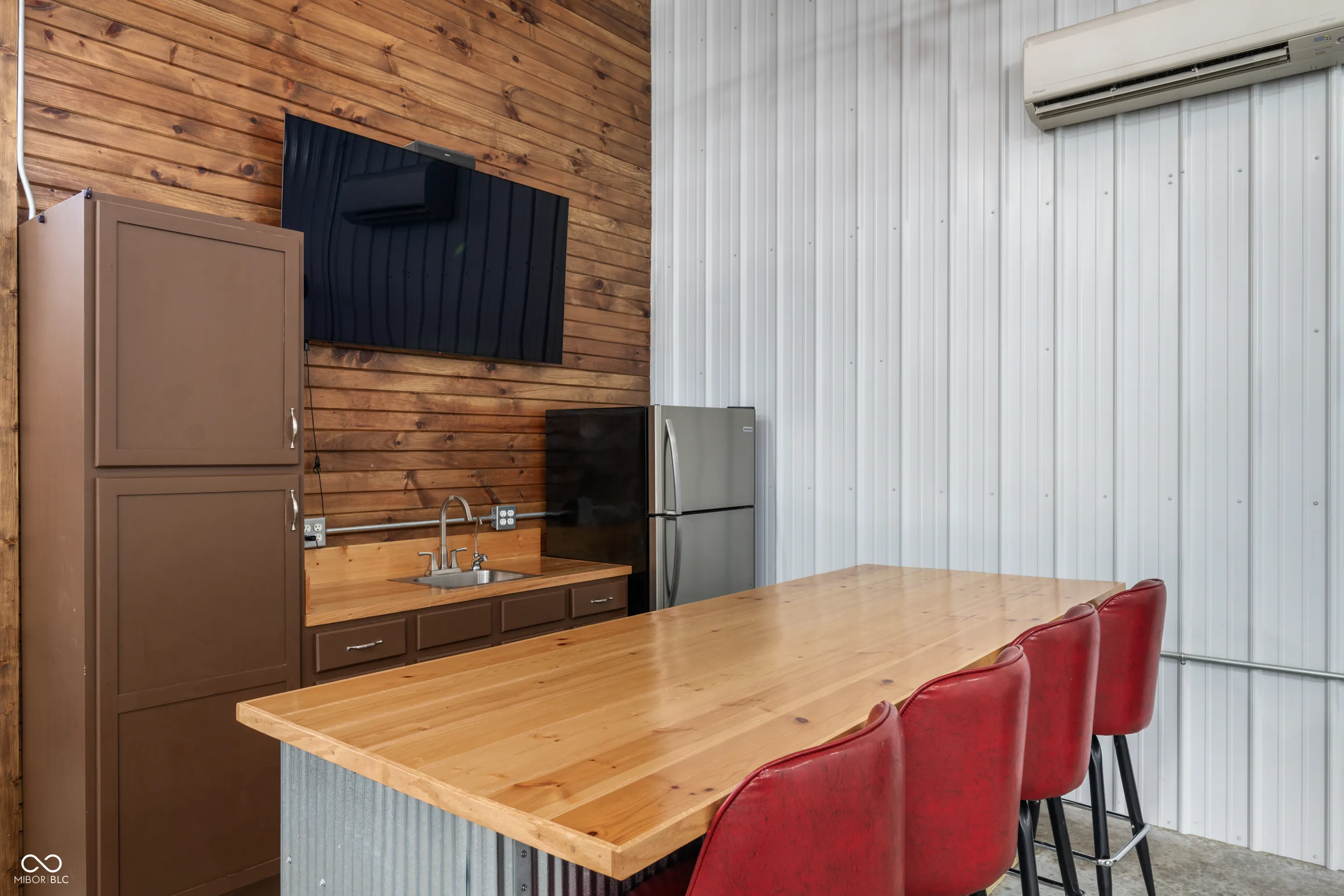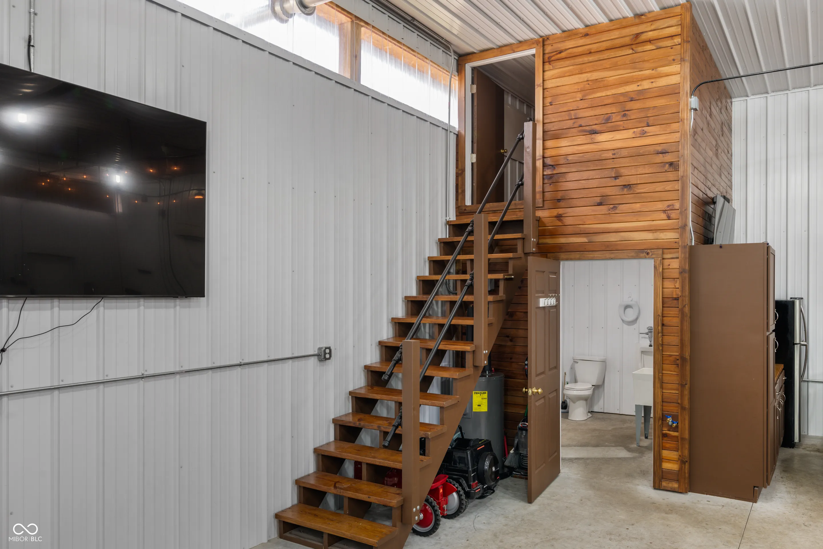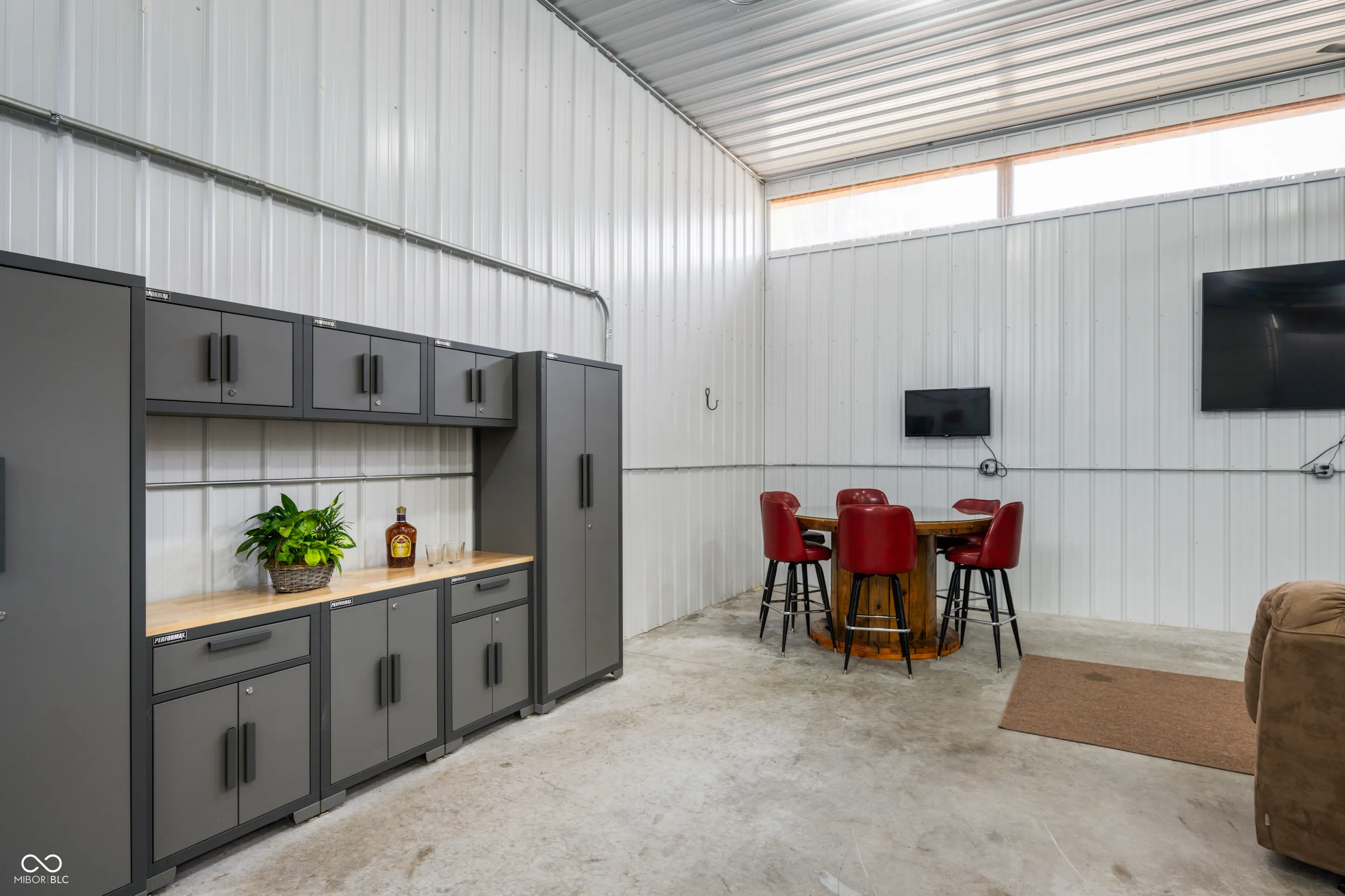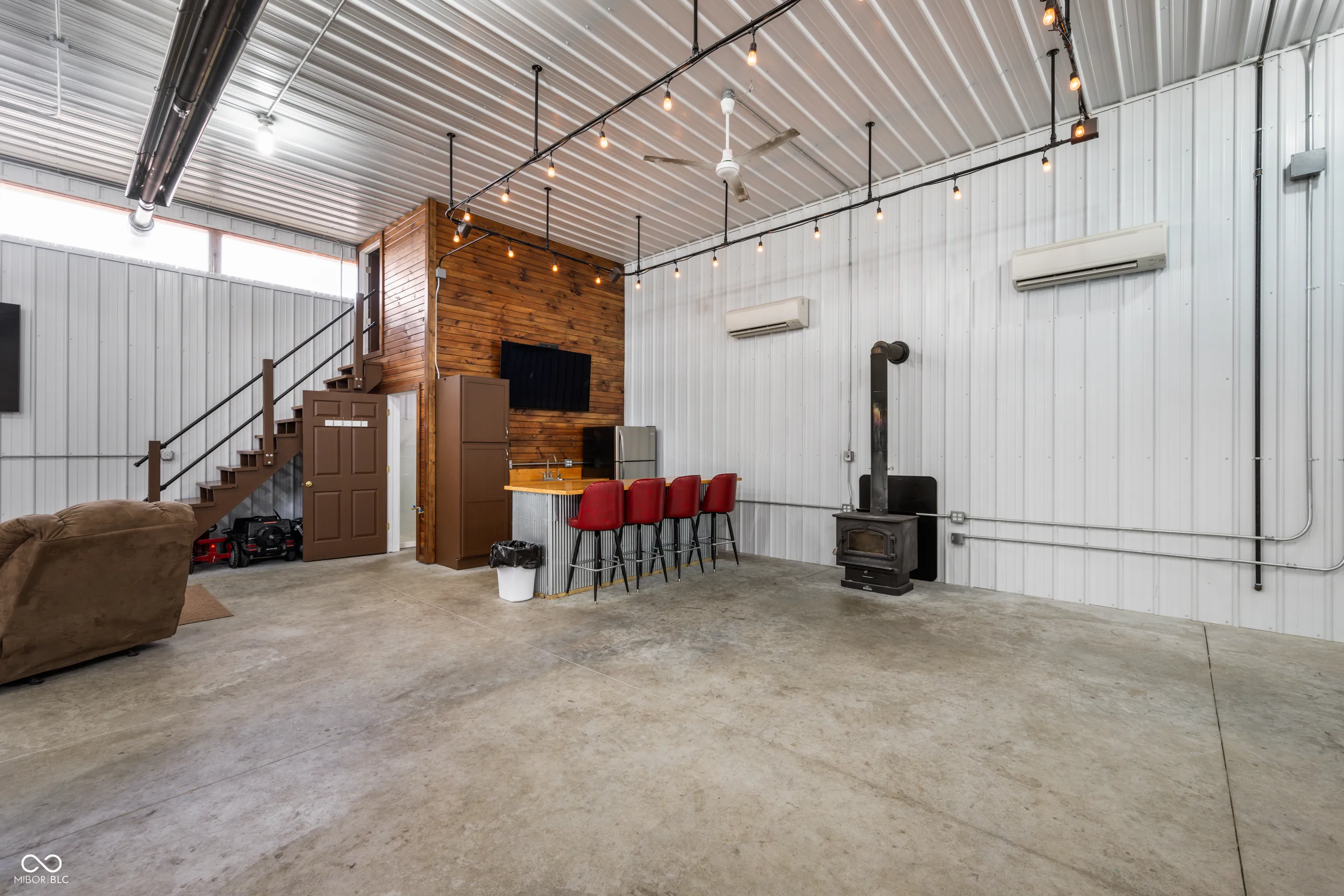 Desirable 60×40 LUXURY Pole Barn on quiet neighborhood street! Updates include: A/C & Shower ’22! This storage facility is 40×40 heated/cooled and then 20×40 cold storage. What comes in a fancy pole barn? How about a fun wood burning stove, Furnace, A/C, built-in Bar or Work Bench, Huge Air Compressor, Kitchen area, Bath Area, Game Table & 2 Lazy Boy recliners! This exceptional Pole Barn has a kitchenette (refrigerator and sink) and upper Bonus Room used as a bedroom for overflow guests! Everyone on a lake needs storage!! You will LOVE having this much coveted multi-use storage building with 2 large overhead doors perfect for HUGE special occasion family parties! Although you can live in this Pole Barn, the current owner used it for storage and large social gatherings! Go ahead and treat yourself to this wonderful & useful amenity, you deserve it!