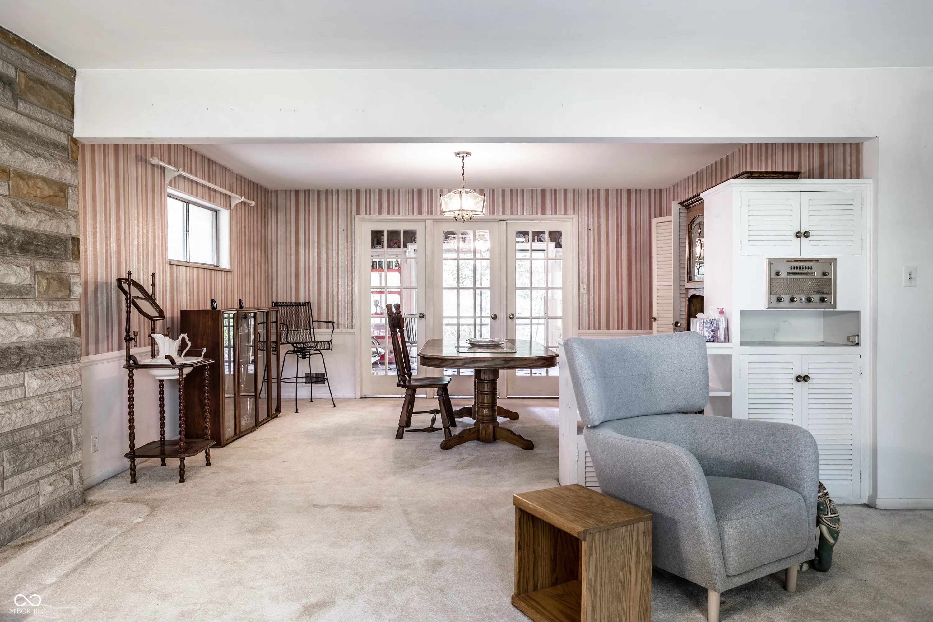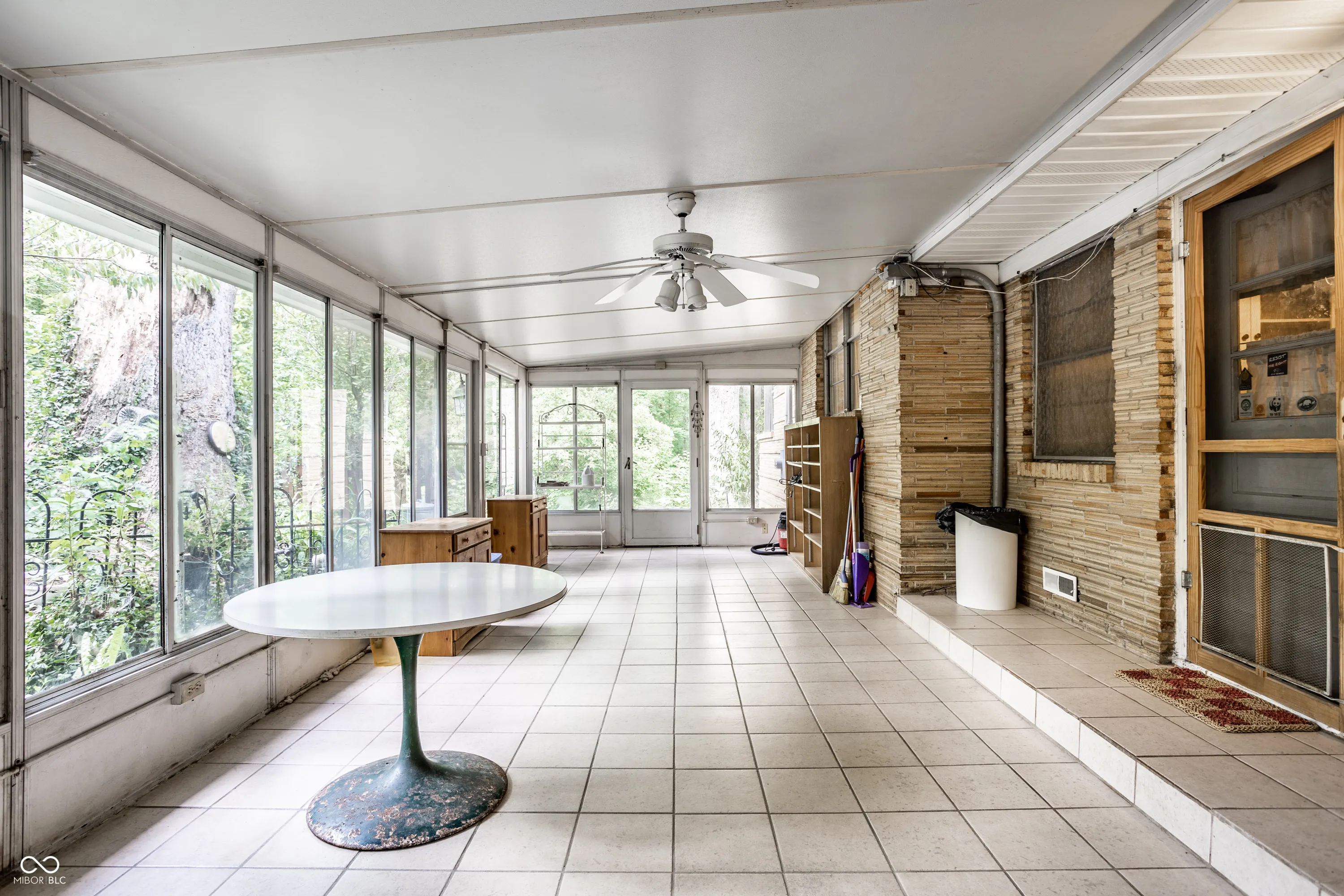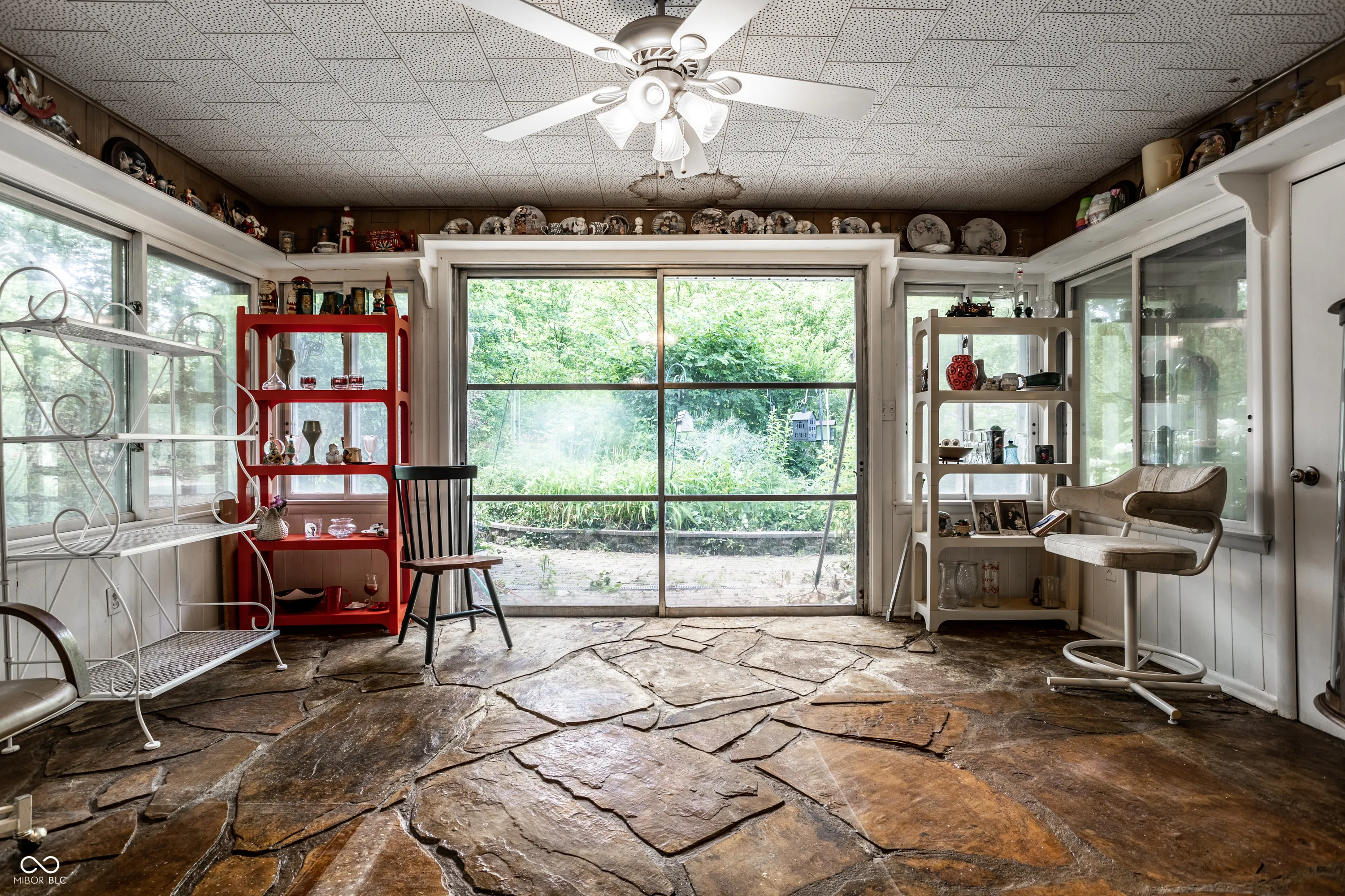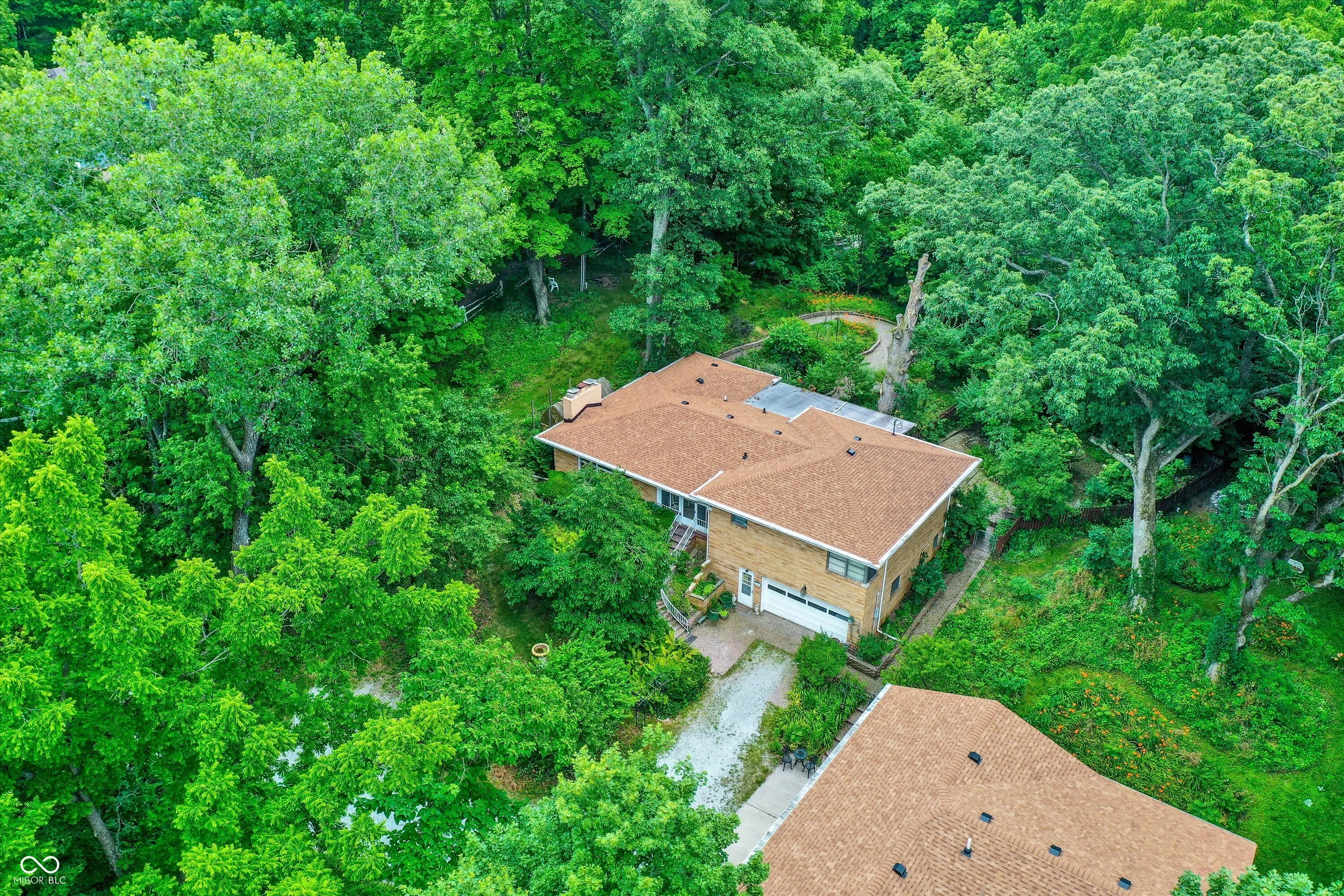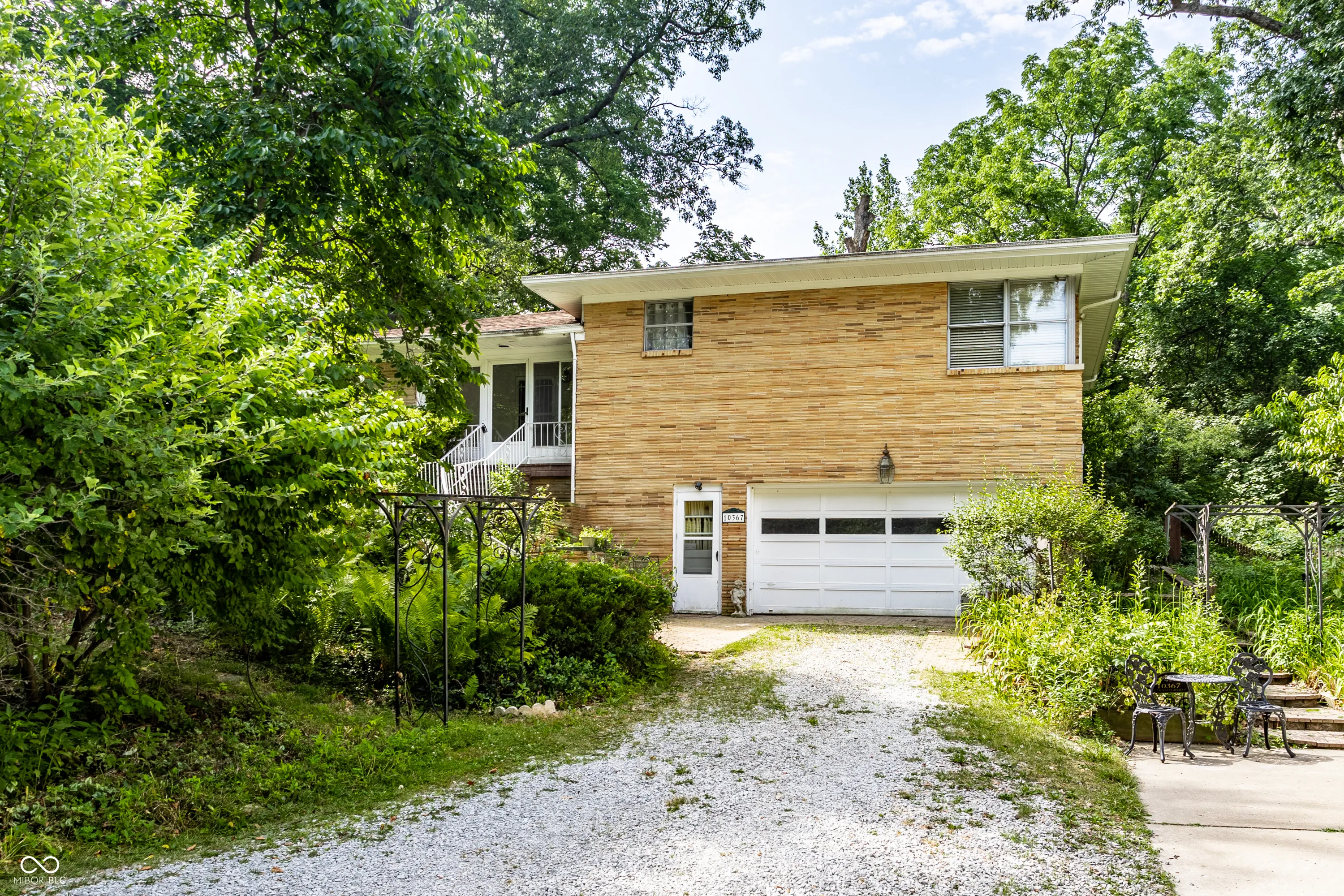 Welcome to this remarkable property located less than 2 miles north of popular Fortville. Situated on over 17.23 rolling acres along serene Lick Creek, this vintage mid-mod home embraces the surrounding natural beauty. The main house boasts a cozy stone fireplace and a picture window in the spacious living room, perfect for admiring the breathtaking views. With hardwood floors and corner windows, the main level bedrooms offer a touch of charm. A country kitchen connects to the adjacent dining room, while the sunroom bathes the home in natural light. Step onto the large covered back porch and revel in the tranquility of your private oasis. Additionally, the guest house showcases three bedrooms, including a primary bedroom with vaulted ceilings. The open living concept creates a seamless flow, leading out to a huge deck overlooking the expansive green expanse. Plus, the lower level provides additional storage/shop space and garage parking.