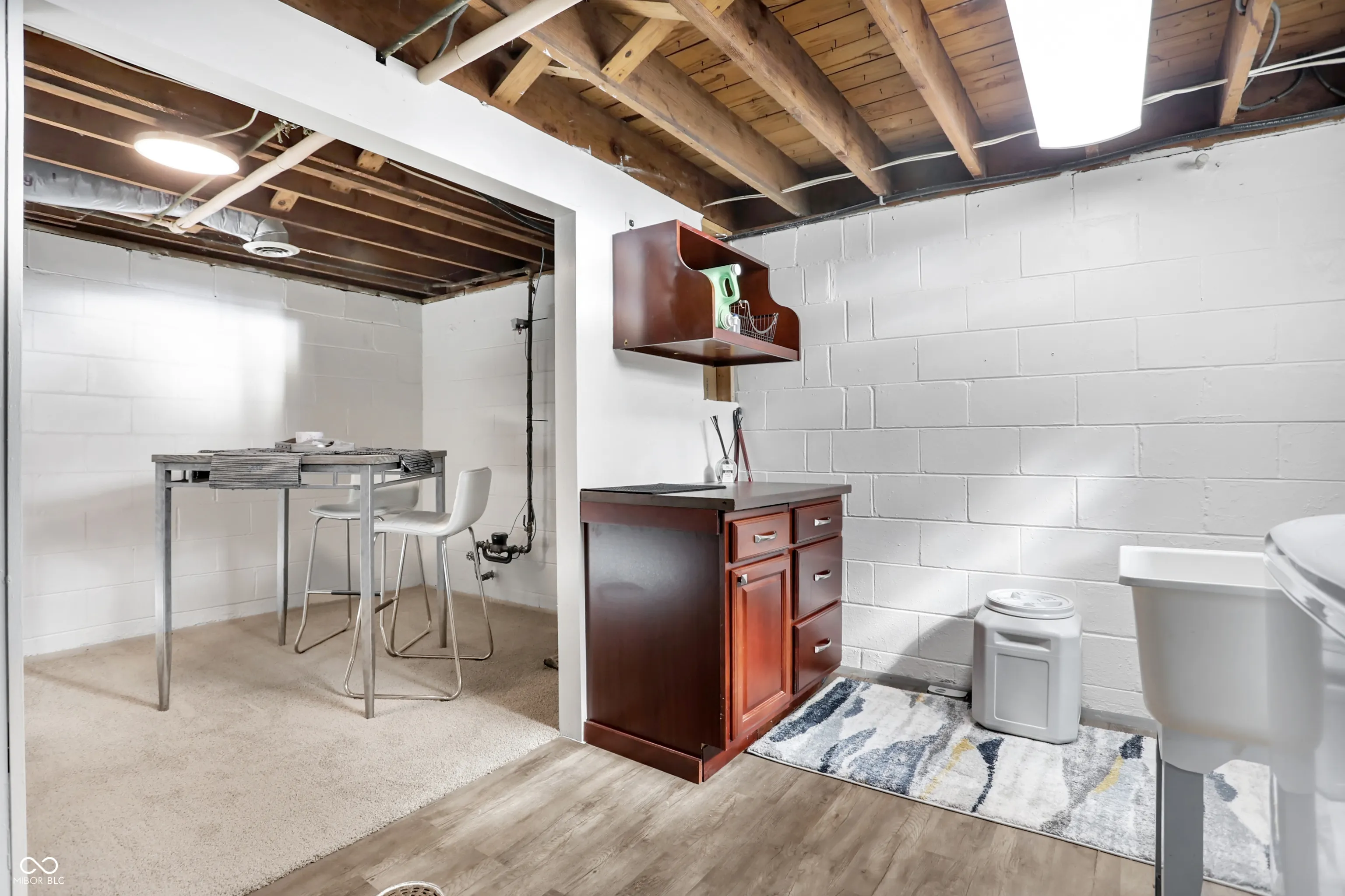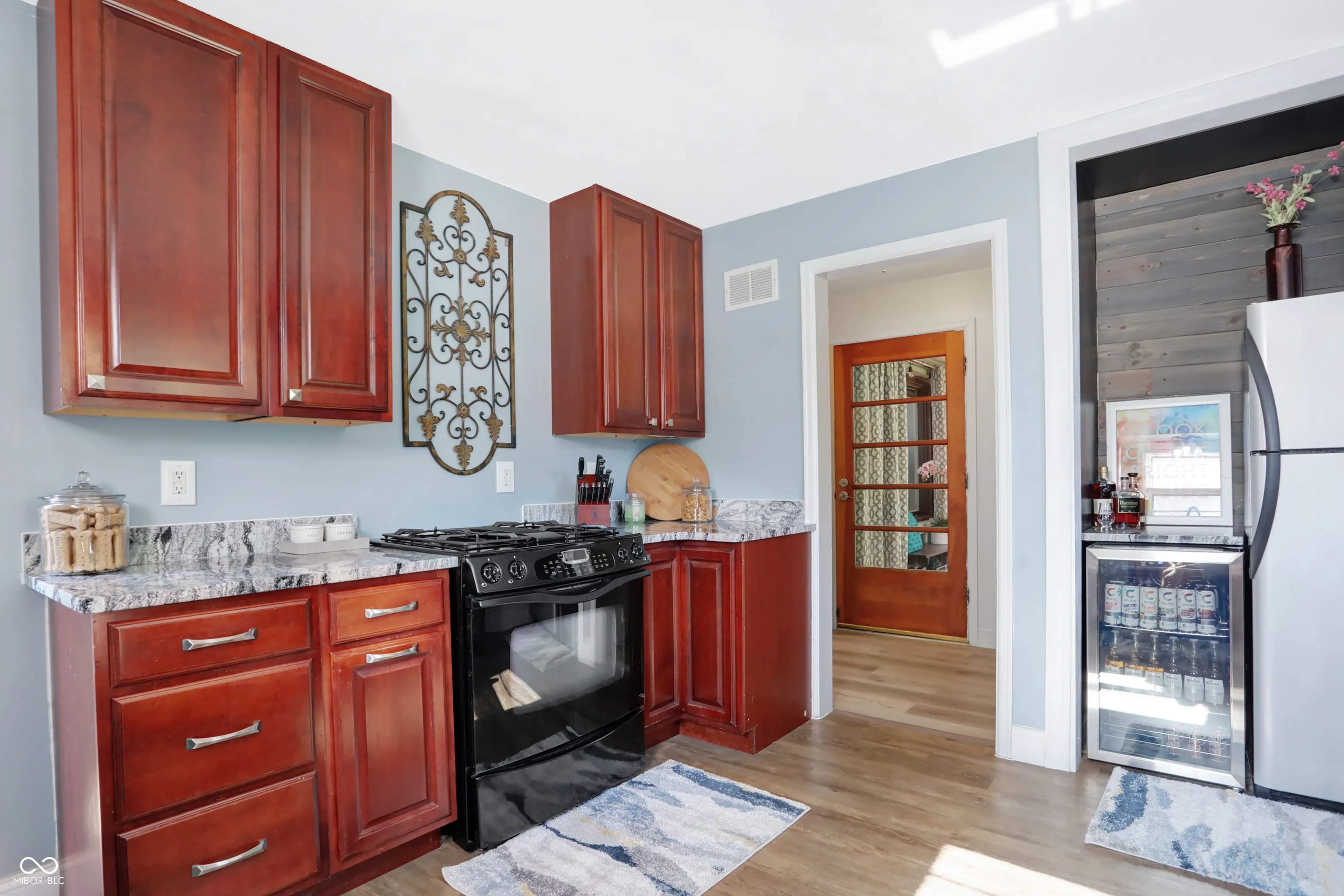 Broad Ripple Mid-Century Modern like, ALL BRICK exterior which means low maintenance, step into the charming glass enclosed front porch to sit and relax enjoying summer nights, updated kitchen, cherry cabinets, granite counter tops, wonderful sunlight shines in the kitchen making it a great space to start your morning making a cup of coffee, open layout between the dining room and family room, spacious family room w/ wood fireplace, newly installed luxury laminate flooring on the main level makes the space feel modern and clean, large window in family room overlooks front porch to allow further light and give the home open & airy feeling, 2 BEDROOMS on main level share a full bathroom, the color tone of the walls/floors is cool and soothing neutral, wait until you step down into the waterproofed finished basement, new carpet and laminate flooring lower level, the room sizes are simply amazing in the basement, you will find space to entertain with a second family room or recreational room, 3rd BEDROOM (basement) with a private bathroom and another large room could be a killer bedroom closet or exercise room the options are endless, laundry room in basement feels fresh & clean makes it a pleasure to do laundry, family room has wet bar hook-up material, wonderfully sized backyard is fully fenced and deceivingly large for pets or social activities, driveway has just been resealed, home has new plumbing, this home is in complete move-in condition.