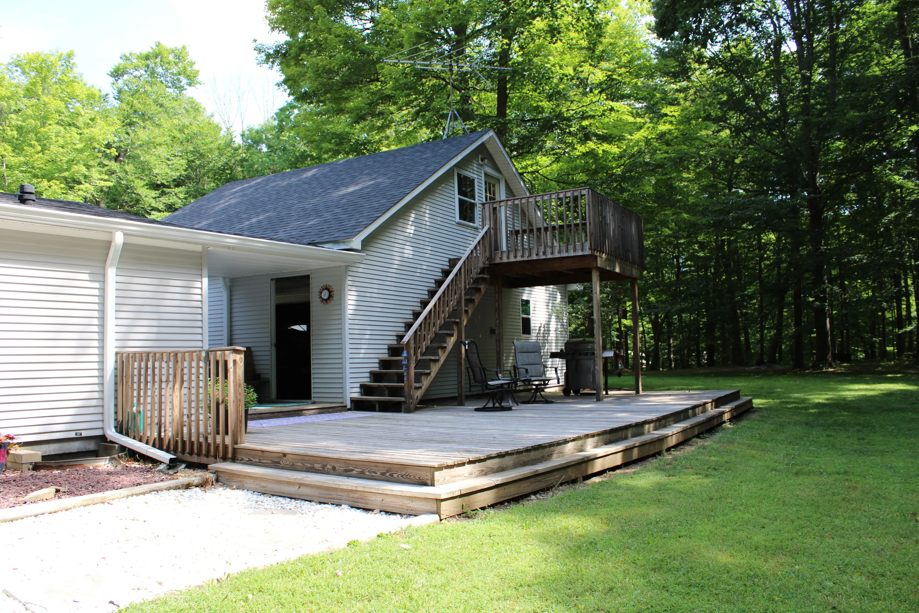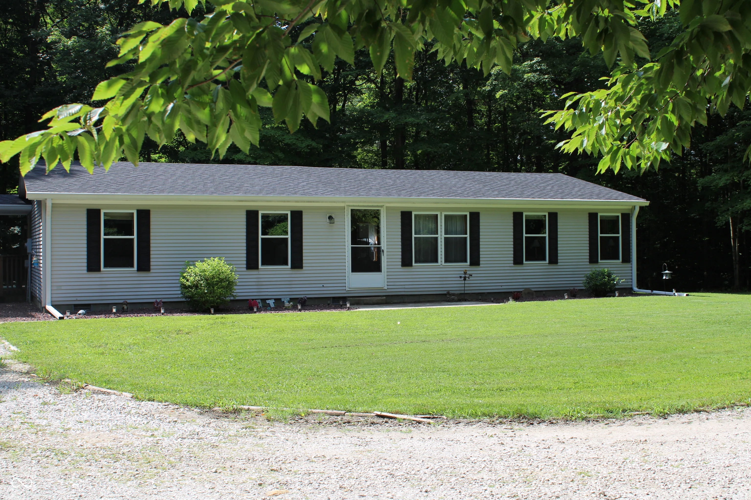 Nestled amidst a serene landscape of 5 sprawling wooded acres, this charming, updated and well-cared-for, double wide (on foundation) offers a blend of comfort, space, and natural beauty. Located in a tranquil setting, this property promises privacy and a retreat-like atmosphere. Upon entering, you are greeted by a spacious living area that boasts ample natural light and a cozy atmosphere, perfect for relaxing or entertaining guests. The home features three bedrooms, each offering peaceful views of the surrounding woods and ample closet space. The master bedroom includes an updated en-suite bathroom with a walk-in shower and walk-in-closet for added convenience and privacy. The updated kitchen is equipped with modern appliances and plenty of cabinet space, making meal preparation a breeze. Cabinets are high-end wood (granite counter tops) with all the bells and whistles! The Eat-In Kitchen provides a welcoming space for family meals or gatherings with friends. There is also a breakfast bar connecting the kitchen and living room. A standout feature of this property is the expansive three-car garage, ideal for storing vehicles, tools, or even converting into a workshop. The garage offers flexibility and ample storage space for outdoor equipment and recreational gear as well as a large second-story storage space that could become an additional “get-away”. Step outside to discover the true allure of this property-the vast, wooded grounds that surround the home. Imagine enjoying morning coffee on the spacious deck, listening to the sounds of nature, or exploring the woods throughout the property. This outdoor space is perfect for nature lovers and those seeking a peaceful retreat. Situated in a desirable location, a short drive from I69 in Martinsville, Hwy 142 in Monrovia, I70 Indianapolis. This won’t last long! Schedule your showing immediately!
