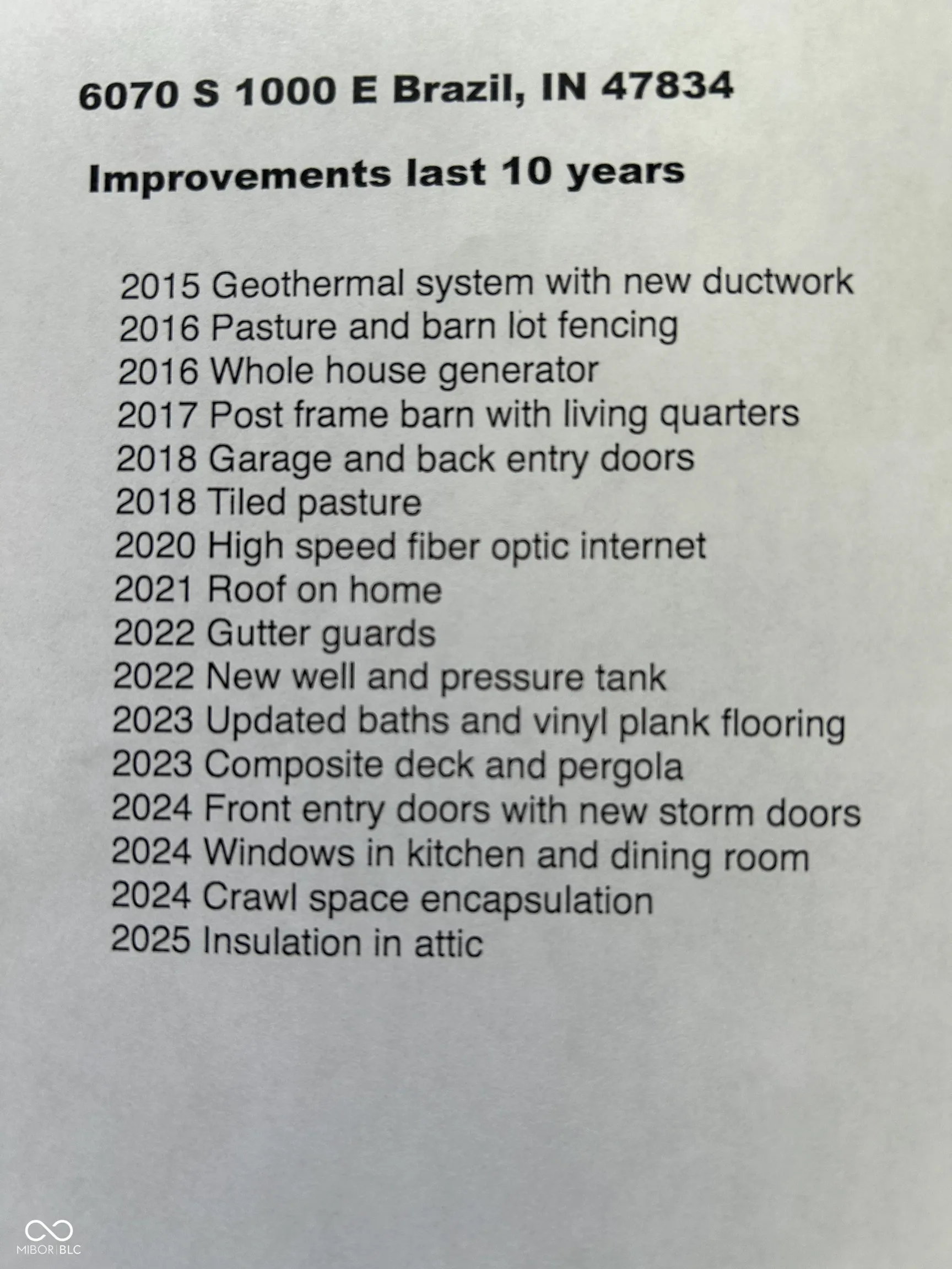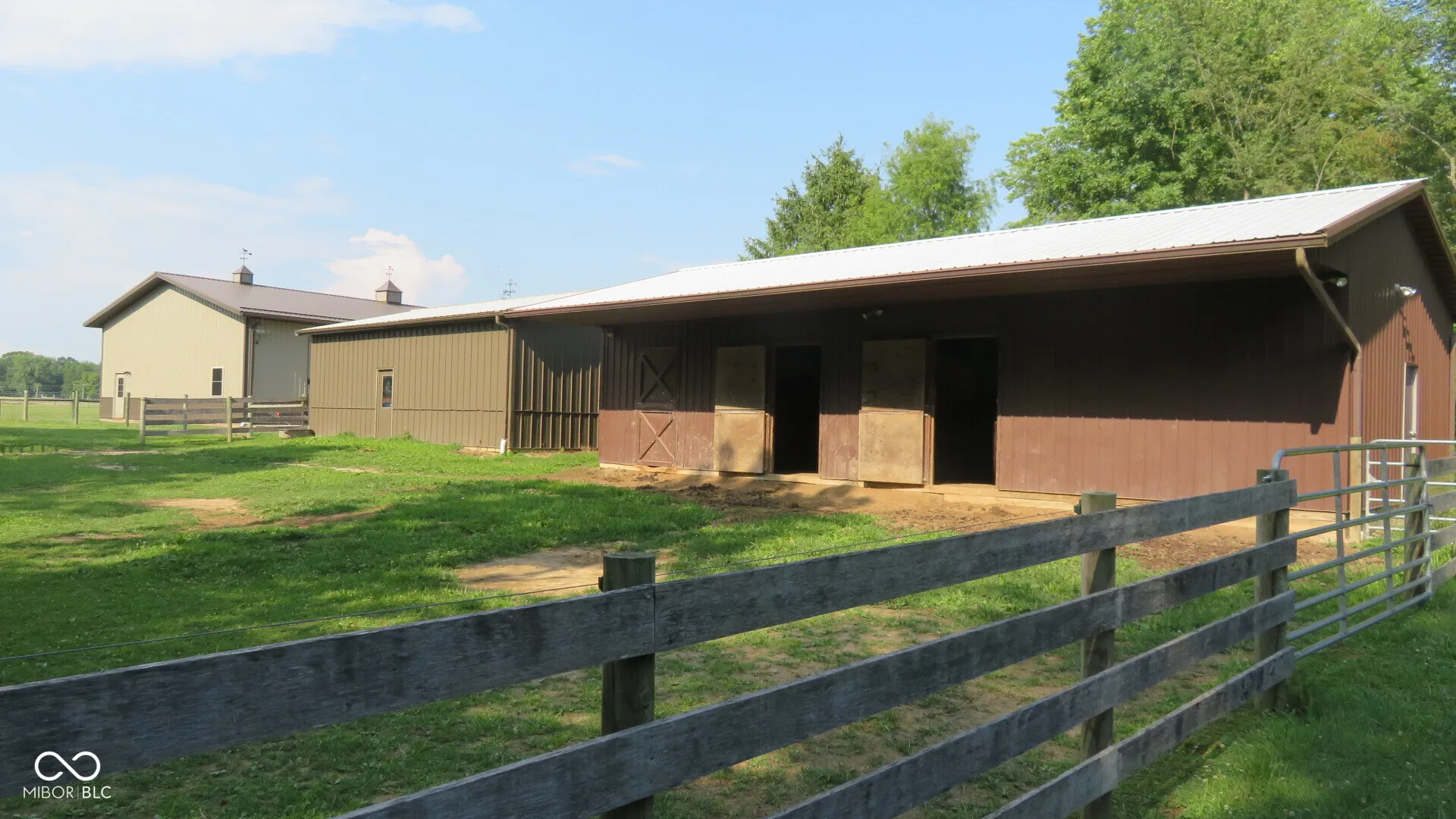 10.15 acres with updated brick ranch home and 3 pole buildings, 1 building with living quarters. Home offers 3 bedrooms, 3 baths, large primary bedroom/suite with double sinks, walk-in shower, built-in cabinets/storage, walk-in closet and office area, 2nd bedroom/suite with walk-in shower, 3rd bedroom, living room opens to large(composite)deck with covered area and beautifully landscaped yard, updated kitchen, formal dining room, bonus room(mud room, office, breakfast area) 2-car attached garage, geothermal heating/cooling, whole house generator and more. Bldg 1: 40×74 pole building with wrap-around porch and has 20×40 living area, with full kitchen, center island, sleeping room, full bath with shower & laundry hook-up(this building has it’s own septic system), the remaining 40×54 has 2-overhead doors with openers & 1-sliding door. Bldg 2: 24×36 pole barn with 2-overhead doors with openers. Bldg 3: 24×48 pole barn with 3-horse stalls, overhead door, sliding door, storage area & small office area. Small 3-sided shed/shelter building. Fenced pasture area, 2-lot water hydrants, separate electric meter for home and 2nd meter feeds the 3 barns. Many recent updates/improvements see attached list or also in pictures