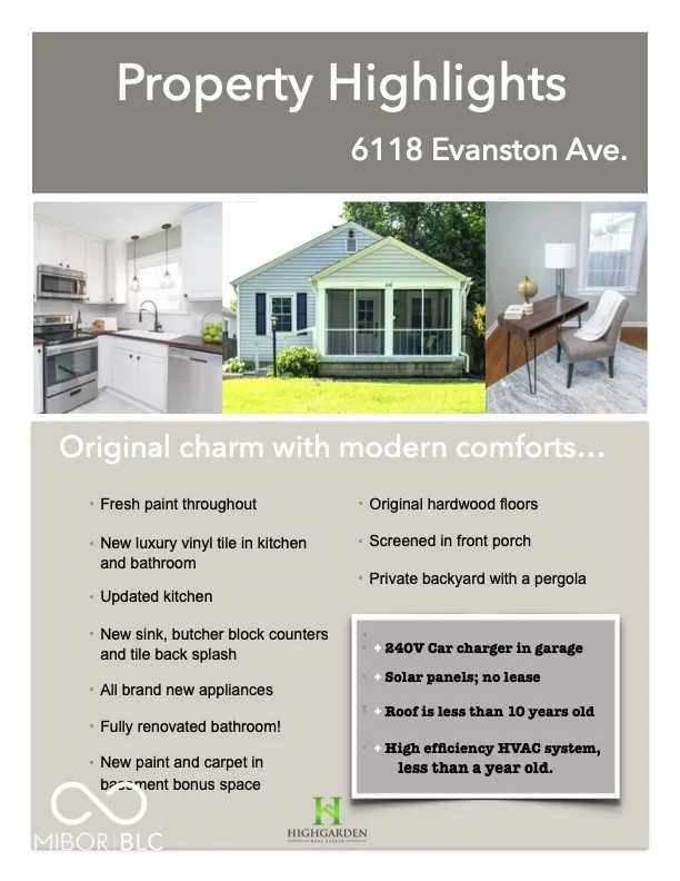 Discover the charm of this exceptional Broad Ripple 2BR/1BA bungalow, redefined for sustainable modern living. Nestled in a tranquil setting, this home boasts a remarkable array of features designed for comfort, efficiency, and entertainment. Step into a home where sustainability meets style: roof-mounted SOLAR PANELS ensure a near-zero electricity bill, while new insulation enhances energy efficiency year-round. An oversized drive-thru detached garage offers alley-way access and features a LEVEL 2 EV CHARGER-perfect for eco-conscious homeowners. Enjoy outdoor living at its finest with a fully enclosed backyard, ideal for pets and gardening enthusiasts alike. Relax on the newly re-screened front porch, a picturesque spot for morning coffee, or retreat to the extended-height backyard fence for complete privacy. Entertain effortlessly with low-maintenance landscaping, a charming pergola, and ample space for BBQs, outdoor movies, or evening bonfires. Inside, the partially finished basement presents a cozy home-movie space and accommodates a home office or workout area. Additional storage and a workbench are found in the unfinished portion of the basement. The main floor features recently refinished hardwood floors, fully remodeled bathroom and kitchen with brand new appliances. Embrace sustainable, stylish living in the heart of Broad Ripple-schedule your tour today!