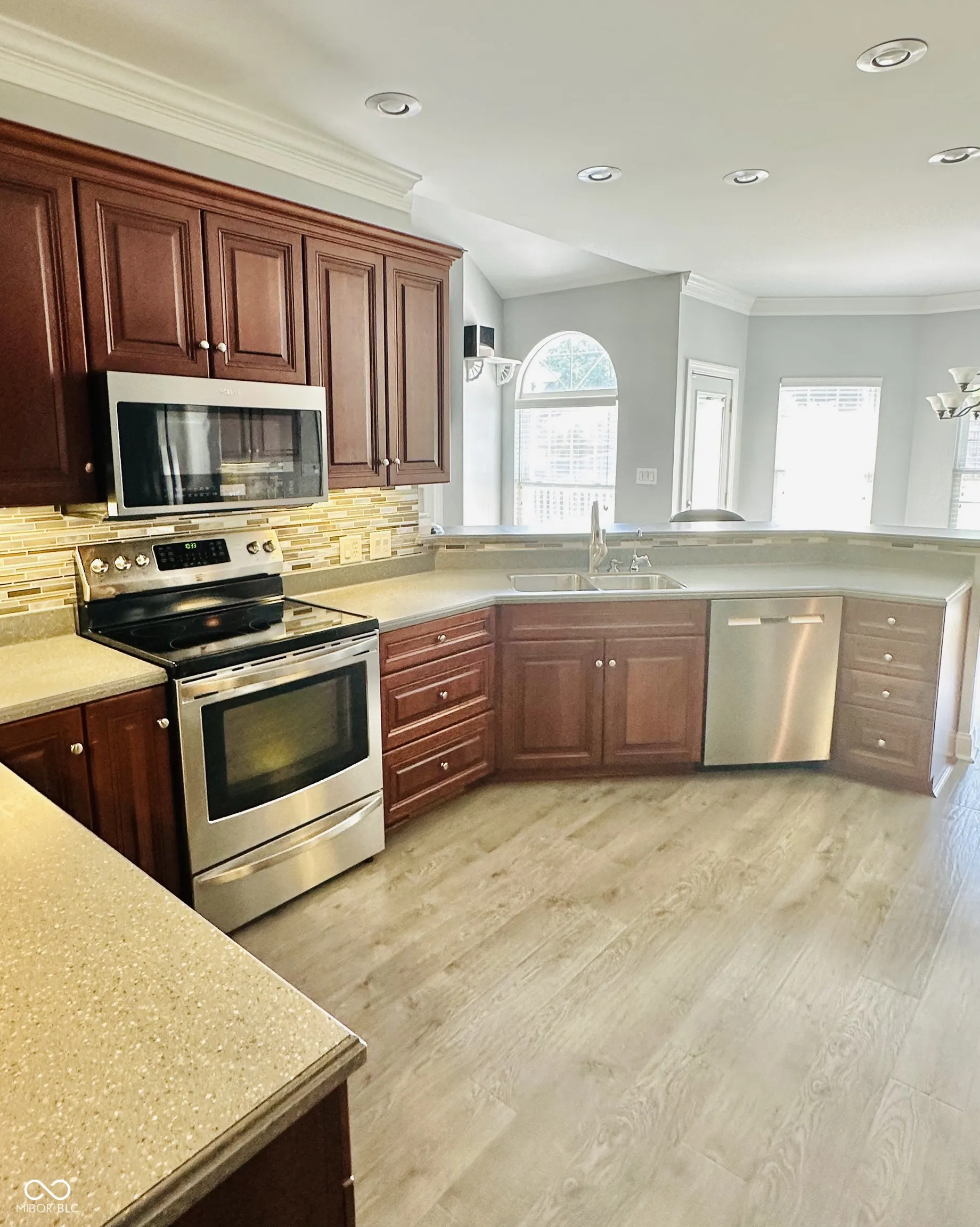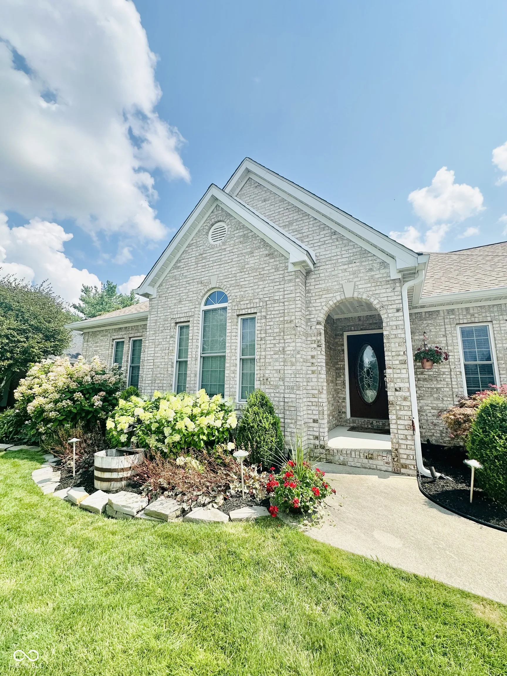 Built in 2002, this home is located in Yorktown Schools in Deerbrook Village. The great room features a gas log fireplace flanked by 2 windows and the cathedral ceilings have recessed lighting. Adjacent is the kitchen and informal dining area with access to the open deck and privacy fenced yard There are cherry cabinets and corian counter tops. The dishwasher(2019), microwave(2024), range, refrigerator(2019), washer and dryer remain. The formal dining area has coffered ceilings as well as the master bedroom. The master bath has a corner tub and separate shower, dual sinks and a water closet. The 2 other bedrooms share a 4 piece bath. Updates include: Wireless Thermostat(2023), Wireless Irrigation System(2020), Garage Sink(2021), Wireless Garage Door Opener(2021), Roof(2020), Gutters w/ guards(2020), Exterior Paint(2020), Water Softener(2020), Water Heater(2023), Privacy Fence(2021), Tile Backsplash(2021), Carpet in Primary bedroom and Dining Room(2024) and Waterproof Laminate Flooring(2021). Furnace has an Ionizer(hospital quality air) w/ powered air filter. Reverse Osmosis. Gas fireplace with remote controlled blower. Oversized 2 car garage. Whole home surge protector. Carpets and tile floors just cleaned by Stanley Steemer.
