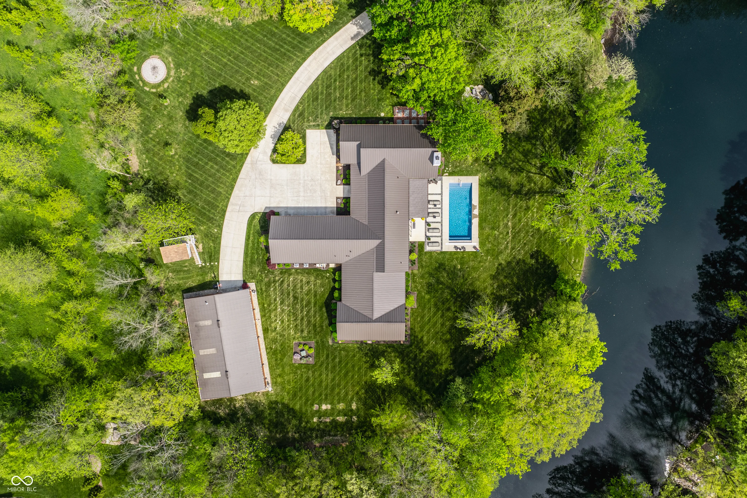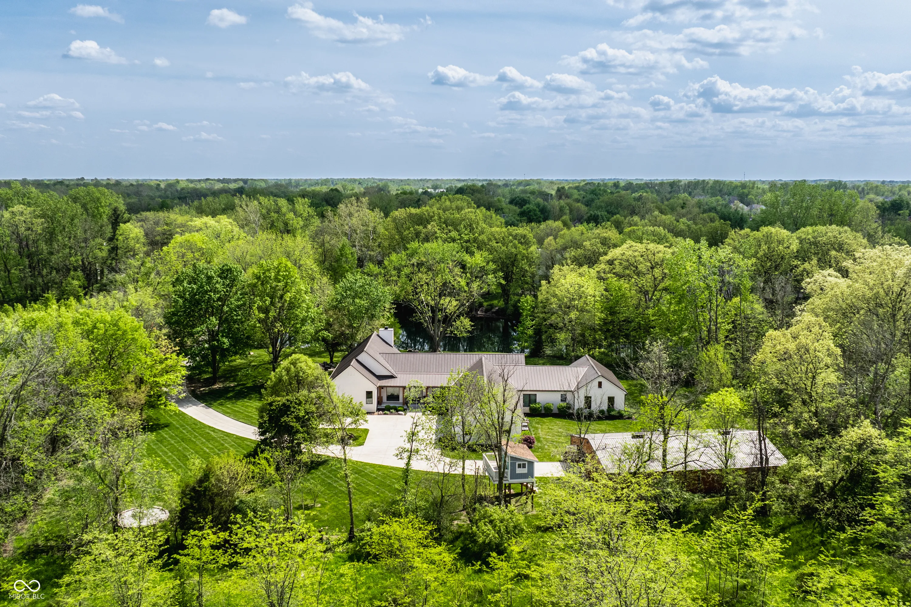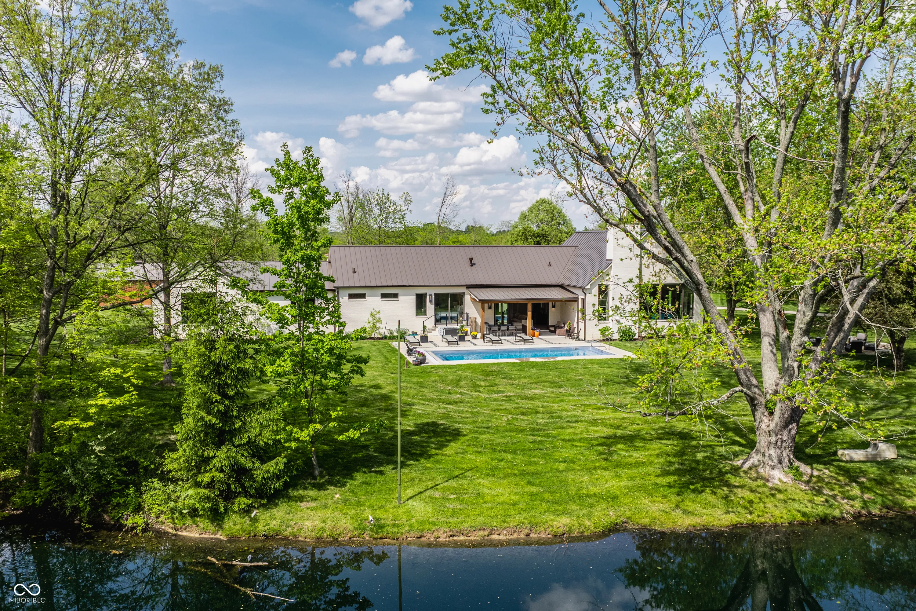 Stunning! Over 3 acres of privacy in the popular Stonegate neighborhood, 5,200 sq ft RANCH, 3 car extra deep garage for car lovers and hobbyists, 64×40 custom barn w beams for gatherings, parties, entertainment or a car aficionado, custom tree house w windows and screens for a breezy kid/teen hangout space, endless greenspace to entertain while enjoying picturesque pond views, the large fire pit area with boulder seating, and an outdoor oasis with 20 x 40 gas heated pool, fountains, and privacy all around. A winding driveway leads you over the creek and through the woods to this massive custom-built one-owner ranch. NO expense spared, this property is truly a work of art. Enter and step down from the gallery to a heated floor in the gathering room that features one of two stone fireplaces (gas), a bar area, and a folding slider that opens the wall up to the vacation-like views and pool. Step up to luxury with the continuation of heated floors throughout the kitchen (specifically leaving the large dining space unheated for the potential use of area rugs. Kitchens by Designs created a thoughtful and functional flow equipped with wolf and Marvel appliances, huge island, huge walk-in pantry and sitting area for family gatherings by 2nd fireplace, (wood-burning). Additional special features include vaulted ceilings with custom beams, a master closet the size of a department store, marble floors in bathroom, w direct pool access from the master suite, and a control 4 system that operates custom blinds, light switches, security and thermostats. The luxury of privacy meets silence and serenity in a fantastic display of craftsmanship on the perfect lot in Zionsville. Great location to commute to downtown on 65, shopping, dining, and nearby downtown Zionsville (owner owns almost half of the pond, and the HOA includes pond maintenance)