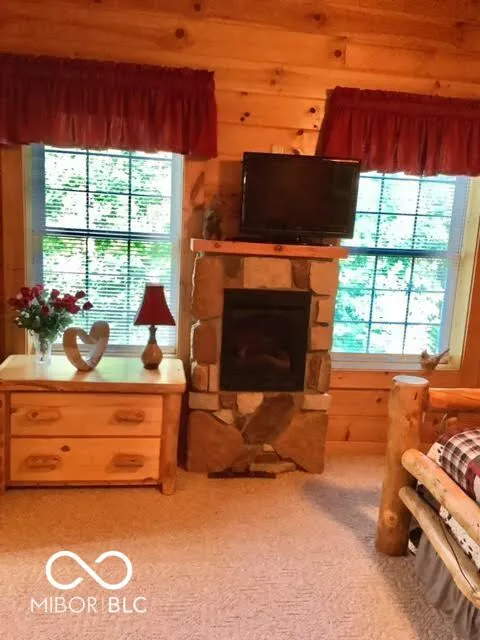 This beautiful log cabin has everything you could want or need tucked away in the hills of Brown County. The front porch features a swing, seating and two paddle fans. As you enter the front door, the massive stone, gas fireplace and pine log walls set the tone of cabin living. The main floor features an en-suite with corner fireplace, walk-in closet and full bath with walk-in shower. The upstairs loft is open and looks down over the great room. The second bedroom is also an en-suite with fireplace and bath. The 3- season sunroom features a whirlpool tub and sitting area. The back door leading you to the grilling area and fire pit. The ADT alarm system secure doors and windows. This beautiful home comes furnished with new fridge, dishwasher, garbage disposal and water heater, even the TV’s stay with the home. All bedding, sheets, towels and brown county decoration stay. The 24 x 24 garage is heated. All major components have been replaced including the metal roof. Just bring your toothbrush and start living the peaceful hills of Brown County! It is six minutes to downtown Nashville and twelve miles to Bloomington. Easy to show! (Sunroom lawn furniture, curio cabinets, some kitchen items do not stay.) (Broker is related to Seller)