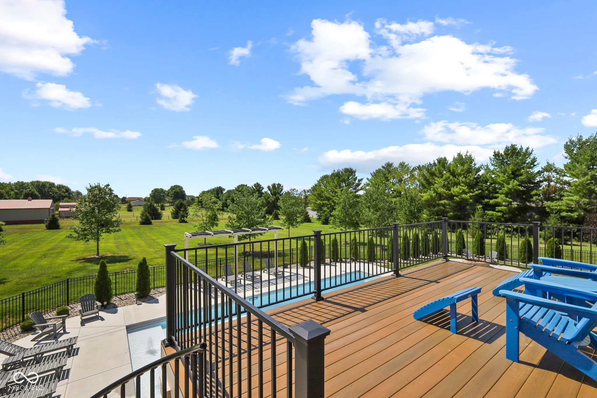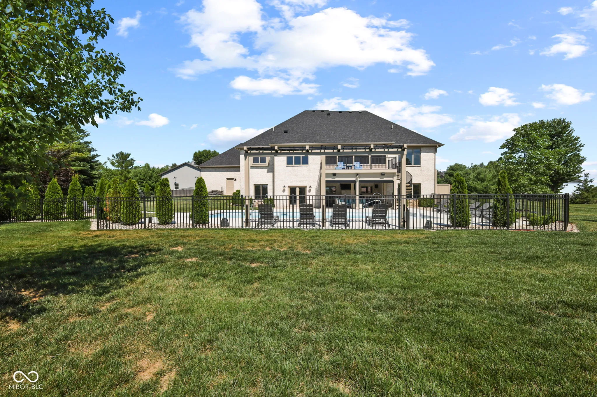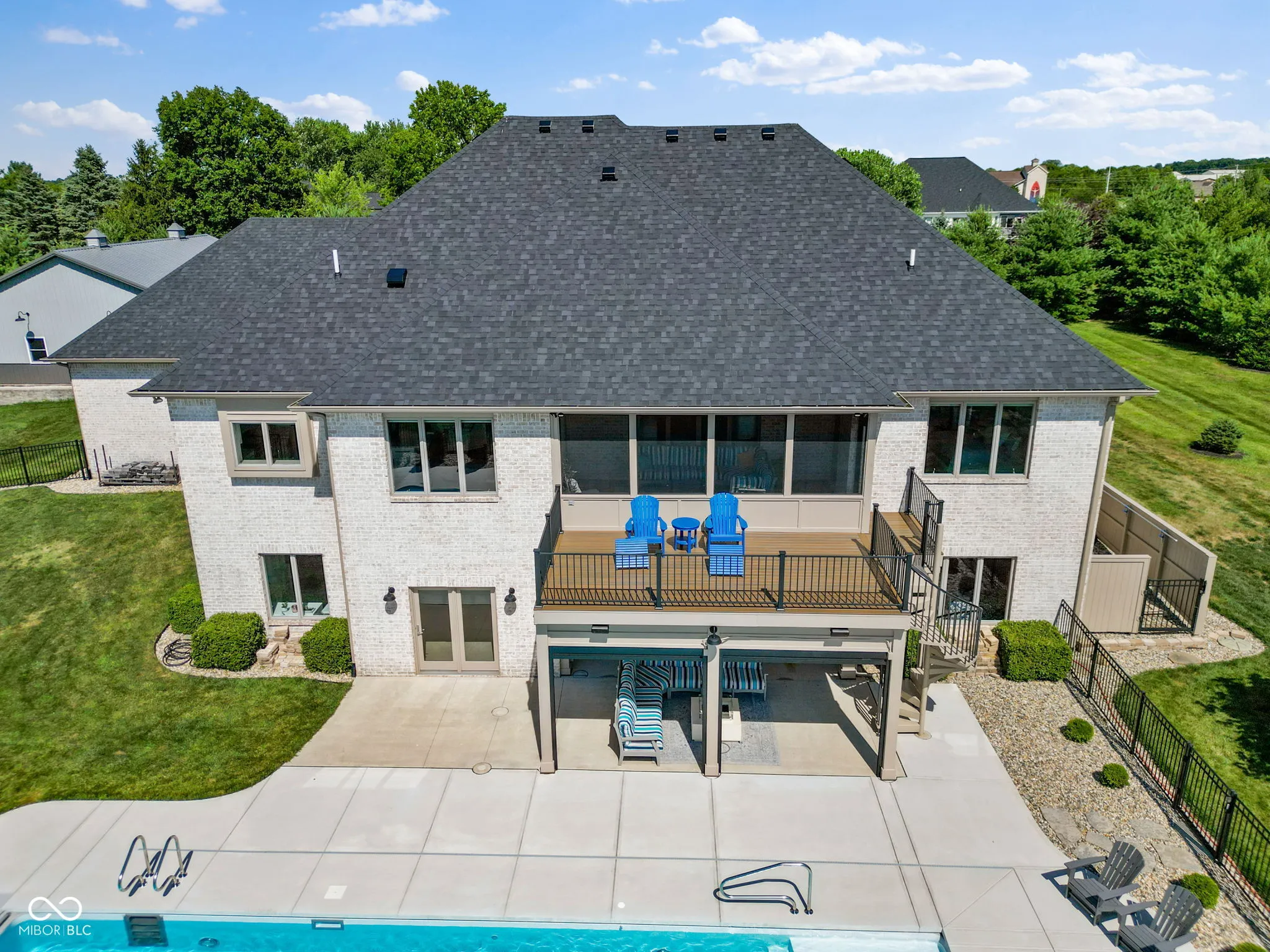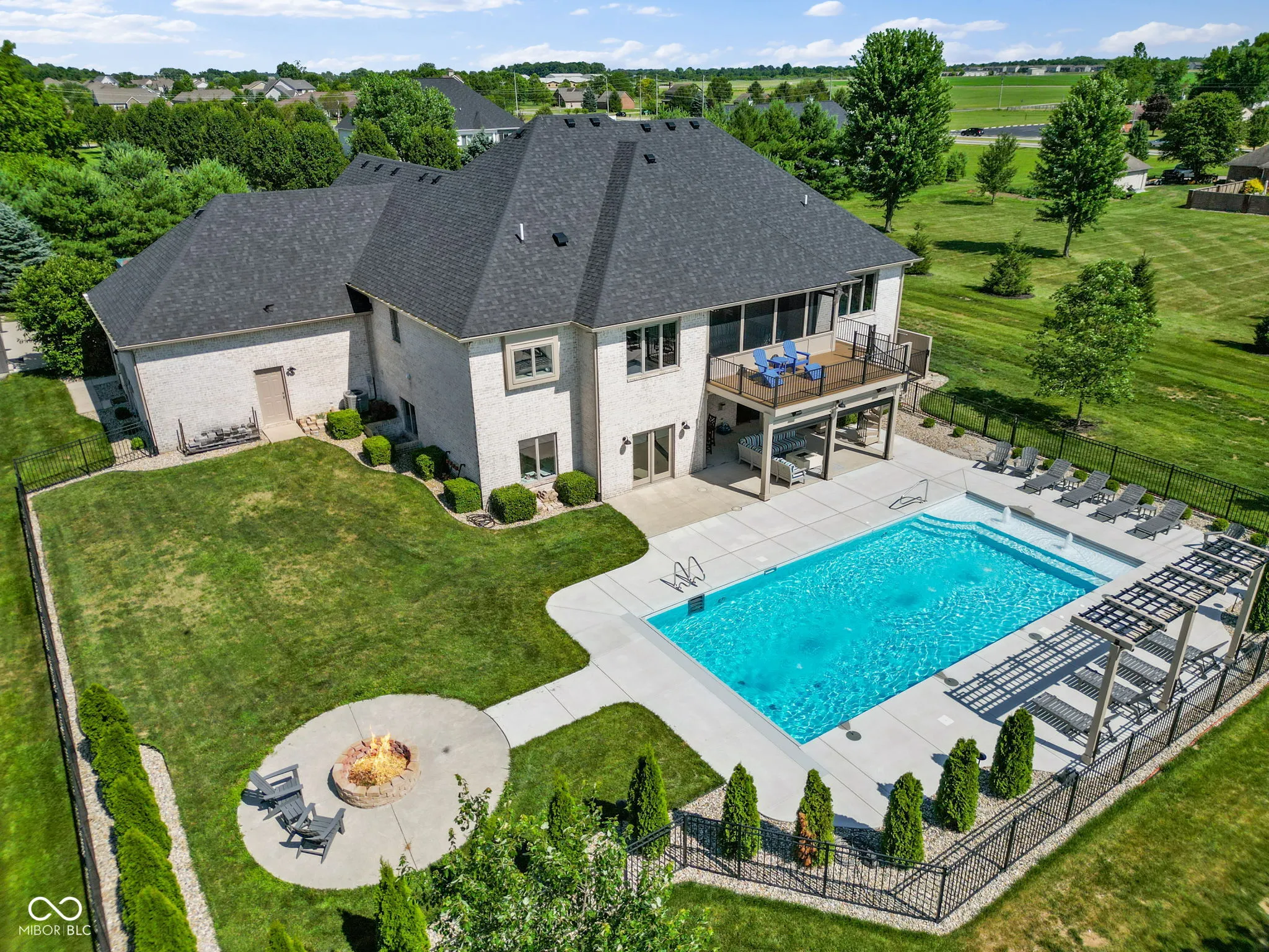 Nestled on a 2.79-acre estate in the heart of Center Grove, this completely remodeled 5-bedroom ranch with a walk-out basement offers luxurious living with a 4-car garage, a spacious pole barn, and a newly installed in-ground pool. High-end upgrades throughout will impress the most discerning buyer. Inside, custom-milled and stained 8″ wide white oak hardwood floors, new lighting, doors, and trim create an elegant ambiance. The Great Room and Kitchen feature a dual-sided Venetian plaster Dimplex LED humidifier fireplace. The kitchen boasts Quartzite countertops, Wolf and Subzero appliances, a 12″ kitchen exhaust, walk-in pantry, vegetable sink, and a two-zone wine refrigerator. The Primary suite includes a custom-built double bowl vanity with Dolomite counters, a double-headed walk-in shower, a garden tub, an LED fireplace, and a walk-in closet. Upstairs half bath counter is quartz Downstairs bathroom counter is Dolomite, the basement bar, have Quartzite counters and custom cabinetry. The basement features three additional bedrooms, a Family Room with a wet bar, a bonus room, and custom-built wine storage. The laundry room includes custom cabinetry and a pet shower. The versatile loft upstairs can serve as an in-law suite or home office with its own HVAC system, private exterior entrance, two bonus rooms, a bedroom, and a full bathroom. Outdoor living is enhanced by Klipsch speakers, a screened-in porch off the kitchen leading to a composite deck overlooking a 20×44 pool by Angie’s Pools, complete with a 1500 sq. ft. pool deck, auto cover, deck jets, bubblers, LED lighting, and an InteleCenter system. A covered patio beneath the deck features an underdeck system and automatic screens, while a custom pergola adds privacy and shade with its own automatic screen (not installed). The firepit area is perfect for cozy gatherings on cool Indiana nights. This estate combines luxury and practicality, offering an unparalleled lifestyle in Center Grove.