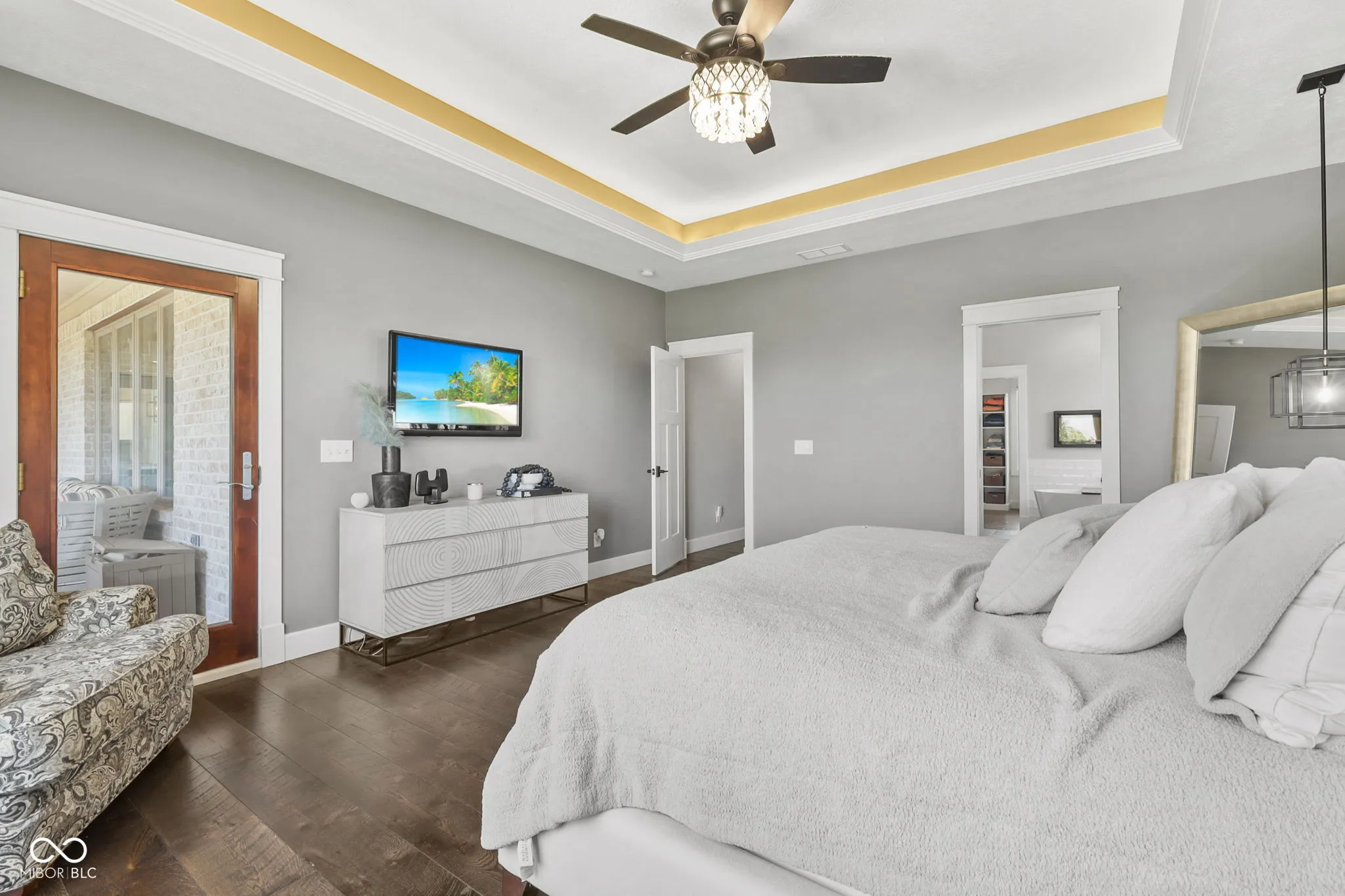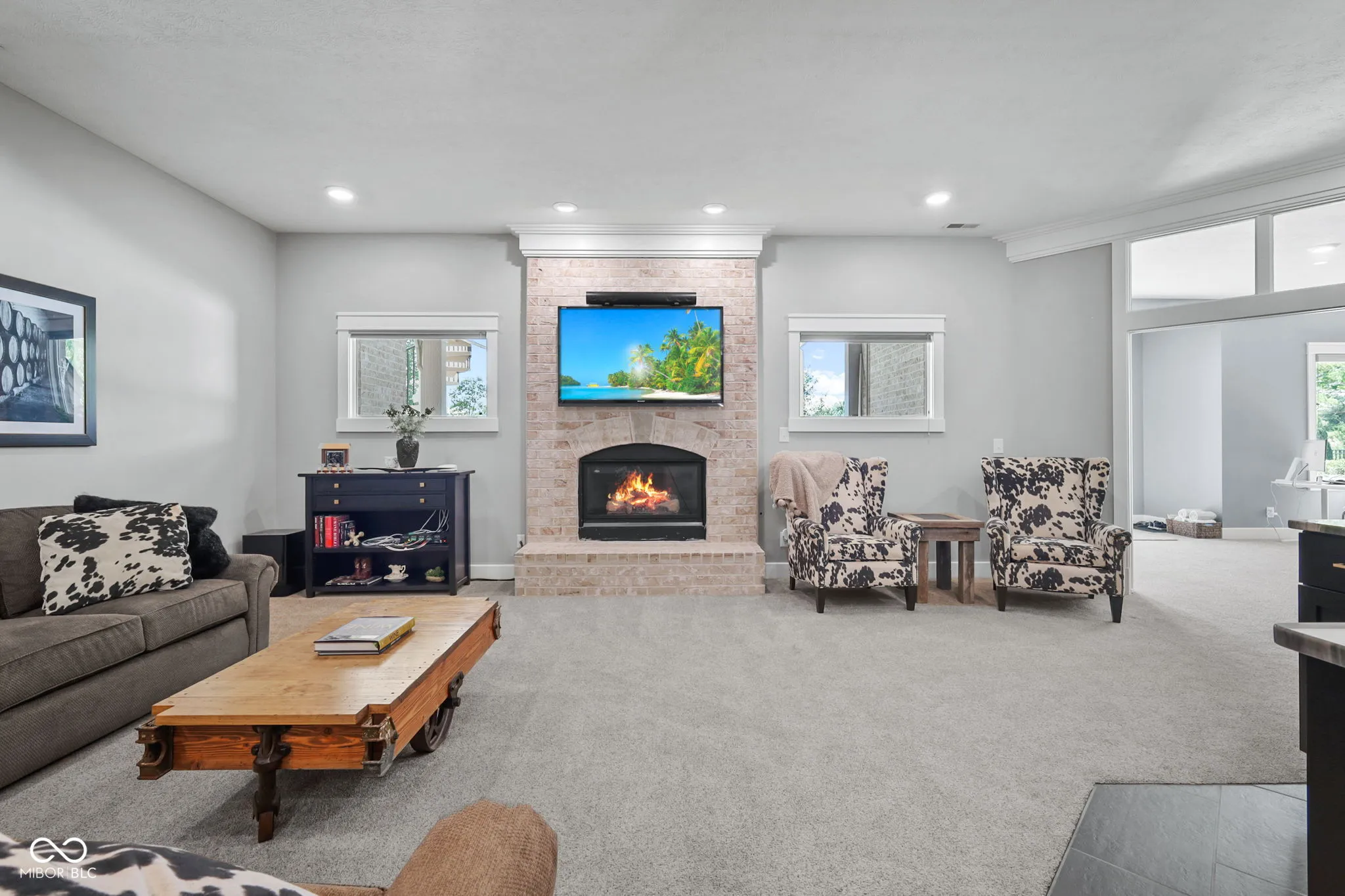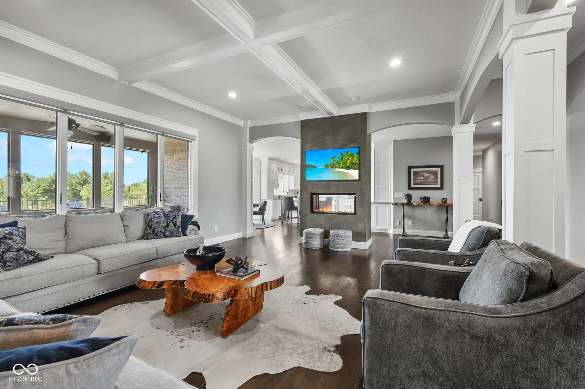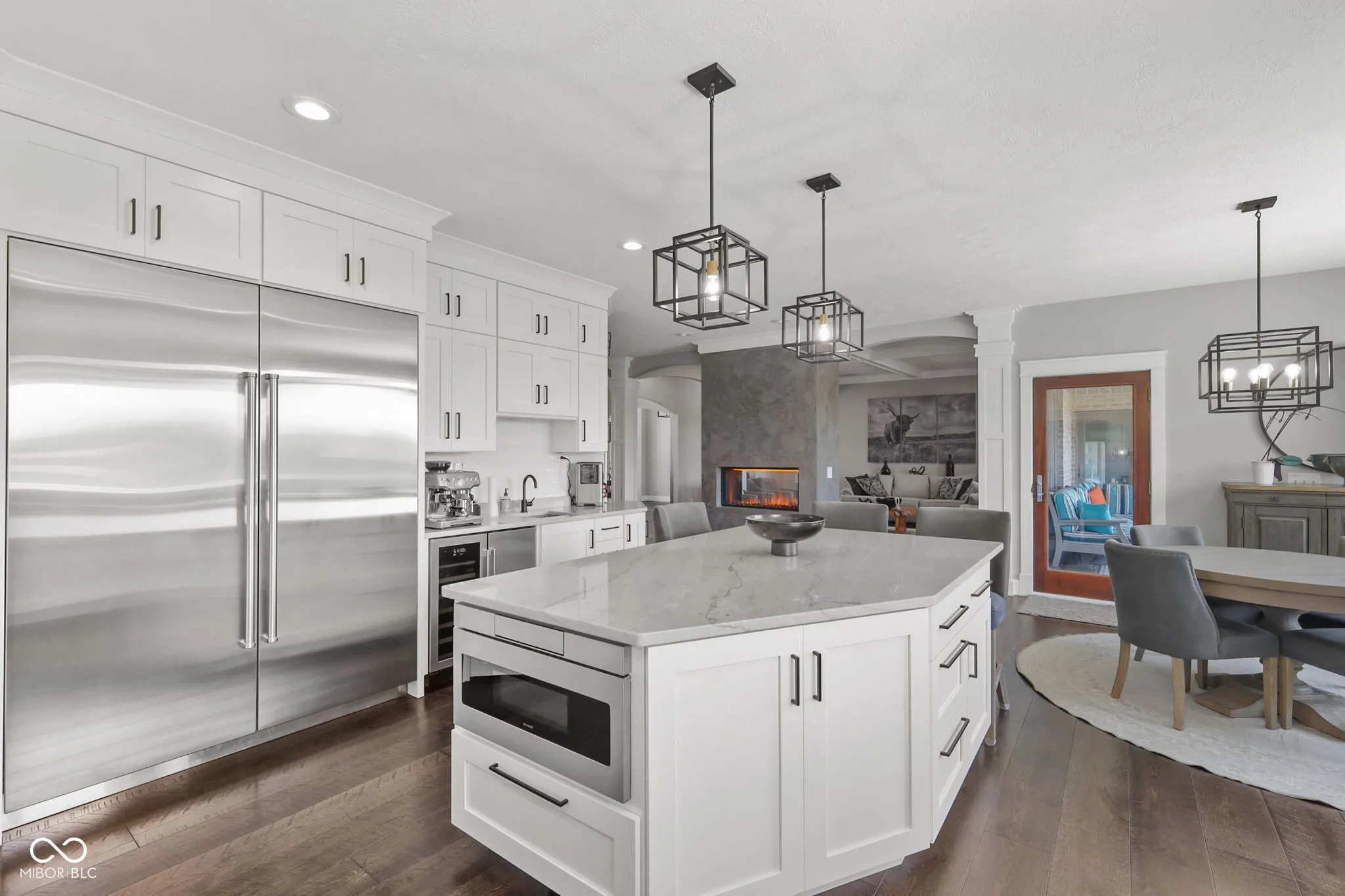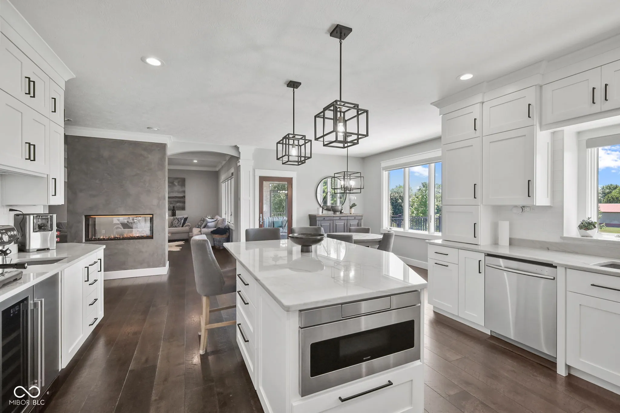 Nestled on a 2.79-acre estate in the heart of Center Grove, this completely remodeled 5-bedroom ranch with a walk-out basement offers luxurious living with a 4-car garage, a spacious pole barn, and a newly installed in-ground pool. High-end upgrades throughout will impress the most discerning buyer. Inside, custom-milled and stained 8″ wide white oak hardwood floors, new lighting, doors, and trim create an elegant ambiance. The Great Room and Kitchen feature a dual-sided Venetian plaster Dimplex LED humidifier fireplace. The kitchen boasts Quartzite countertops, Wolf and Subzero appliances, a 12″ kitchen exhaust, walk-in pantry, vegetable sink, and a two-zone wine refrigerator. The Primary suite includes a custom-built double bowl vanity with Dolomite counters, a double-headed walk-in shower, a garden tub, an LED fireplace, and a walk-in closet. Upstairs half bath counter is quartz Downstairs bathroom counter is Dolomite, the basement bar, have Quartzite counters and custom cabinetry. The basement features three additional bedrooms, a Family Room with a wet bar, a bonus room, and custom-built wine storage. The laundry room includes custom cabinetry and a pet shower. The versatile loft upstairs can serve as an in-law suite or home office with its own HVAC system, private exterior entrance, two bonus rooms, a bedroom, and a full bathroom. Outdoor living is enhanced by Klipsch speakers, a screened-in porch off the kitchen leading to a composite deck overlooking a 20×44 pool by Angie’s Pools, complete with a 1500 sq. ft. pool deck, auto cover, deck jets, bubblers, LED lighting, and an InteleCenter system. A covered patio beneath the deck features an underdeck system and automatic screens, while a custom pergola adds privacy and shade with its own automatic screen (not installed). The firepit area is perfect for cozy gatherings on cool Indiana nights. This estate combines luxury and practicality, offering an unparalleled lifestyle in Center Grove.
