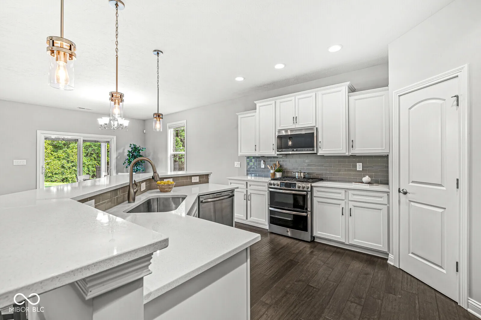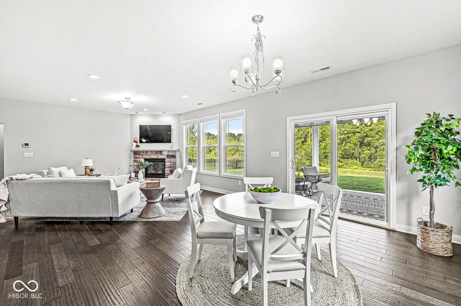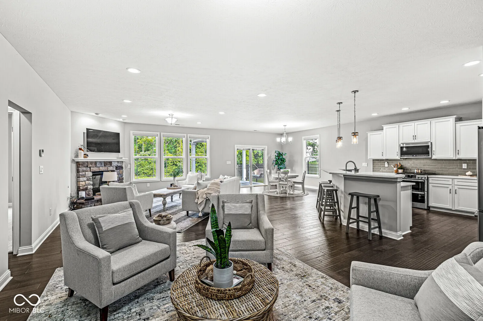 NEWER beautifully maintained 3-bedroom RANCH on a quiet CUL DE SAC. Step in through the covered porch to a spacious Living Room where you can warm yourself by the cozy stone FIREPLACE. You’ll love the large EAT-IN KITCHEN with its full length breakfast bar & open view of the Living Room. Become the chef of your dreams with a GAS DOUBLE OVEN & gas cooktop, all stainless steel appliances (included), QUARTZ COUNTERTOPS and a beautiful tile backsplash. Just outside the Kitchen awaits a cozy Dining area with a view out to the covered patio & WOODED TRAIL just beyond the backyard. On one end of the home, a large MAIN LEVEL PRIVATE SUITE awaits, with WALK-IN CLOSET, dual sinks, private toilet & glass-enclosed TILE SHOWER. On the other end of the home, you’ll find 2 additional bedrooms and full bath. A separate LAUNDRY ROOM (washer & dryer included), half bath for guests and 3-CAR GARAGE complete this amazing home! Be sure not to miss the more subtle UPGRADES: 9-foot ceilings, tray ceiling, engineered HARDWOOD floors, ceramic tile, security system & FINISHED GARAGE with opener. Just 4 minutes from EAGLE CREEK PARK and nearby restaurants, and easy access to highways. Or stay close to home and enjoy a relaxed stroll down the nearby paved trail to the neighborhood lake. To WALK THROUGH this home in 3D, see the virtual tour included with this listing.