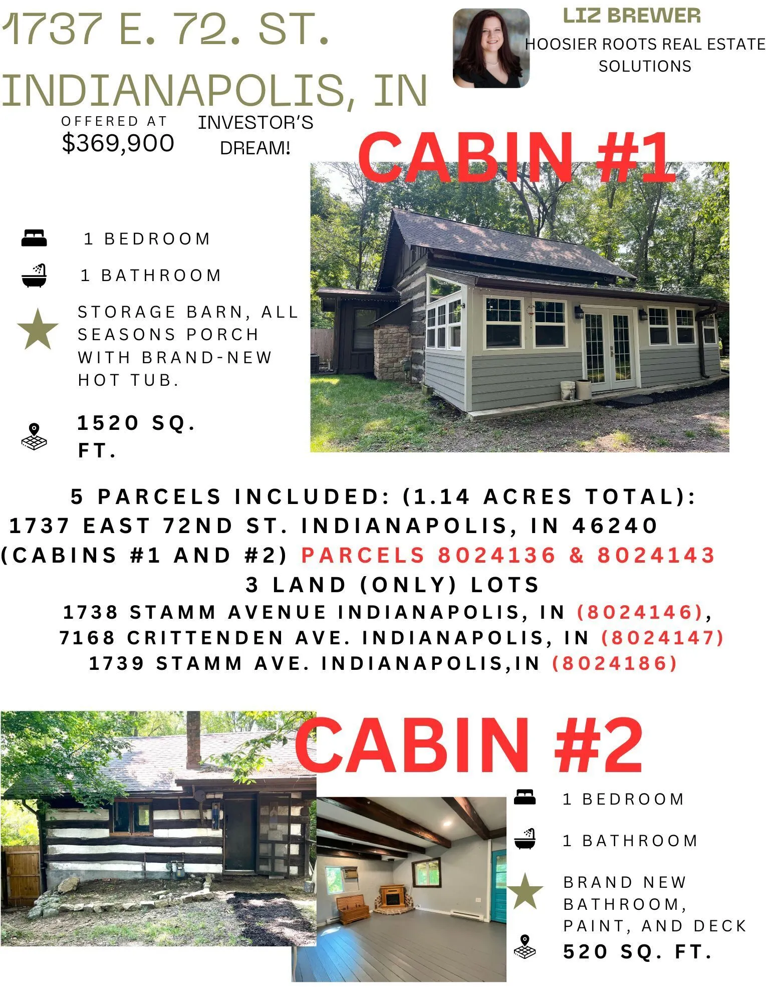Discover an unparalleled investment opportunity nestled amidst the serene woods of Ravenswood. This exceptional property spans 5 parcels totaling over an acre of wooded beauty. Convenient access to Broadripple, Downtown Indy, and the Northside. Boasting not just one, but two fully updated turn-key cabins, this offering is truly one-of-a-kind opportunity. The primary cabin exudes charm with its brand-new kitchen and bathroom, complemented by a cozy living room featuring a fireplace AND a fully enclosed wrap around porch with heating and air with a brand new 8-person luxury hot tub. An expansive loft upstairs offers flexibility for a large bedroom or two smaller ones, ensuring ample space for relaxation. Meanwhile, cabin two (520 sq. ft.) , a stylish studio, comes complete with a kitchen, laundry facilities, and a sprawling new deck ideal for outdoor gatherings and leisure. Both cabins have undergone meticulous updates, ensuring they are not only aesthetically pleasing but also fully functional and primed for immediate enjoyment. Whether envisioning your dream retreat or seeking a lucrative Airbnb venture, this property stands ready to fulfill your aspirations. Don’t miss this rare opportunity to own a slice of tranquility with limitless potential in the heart of Indianapolis’ most coveted locales.