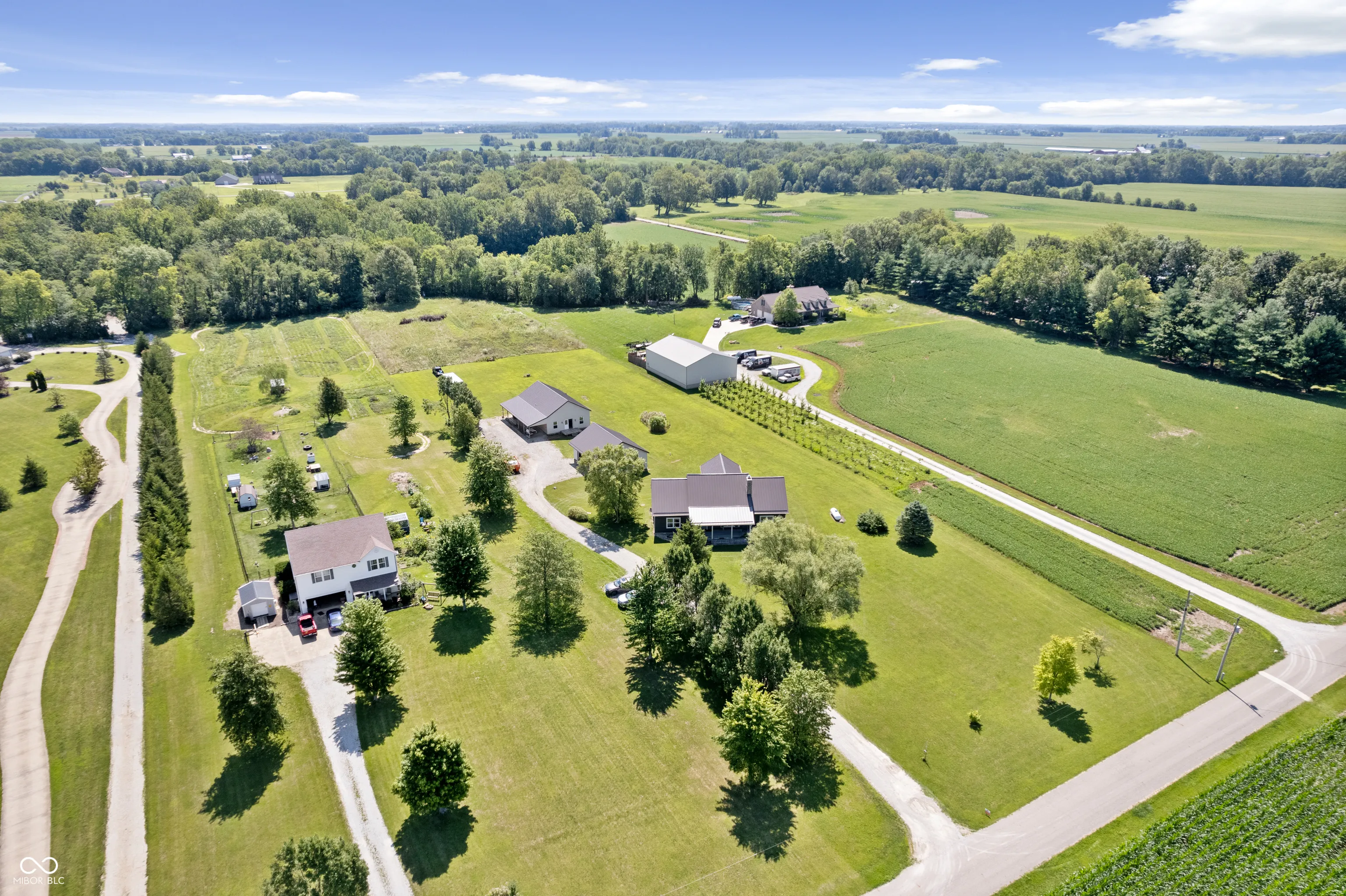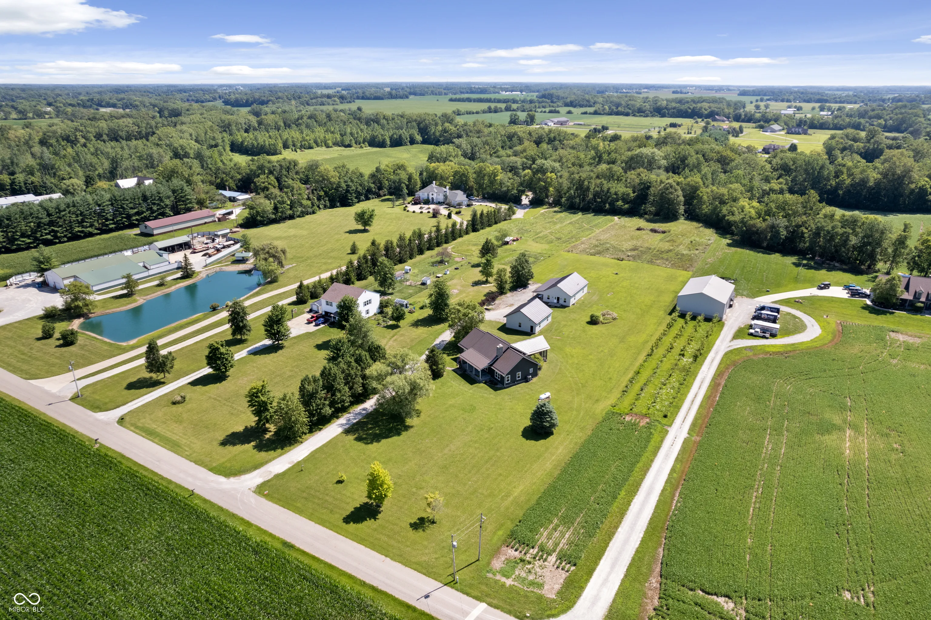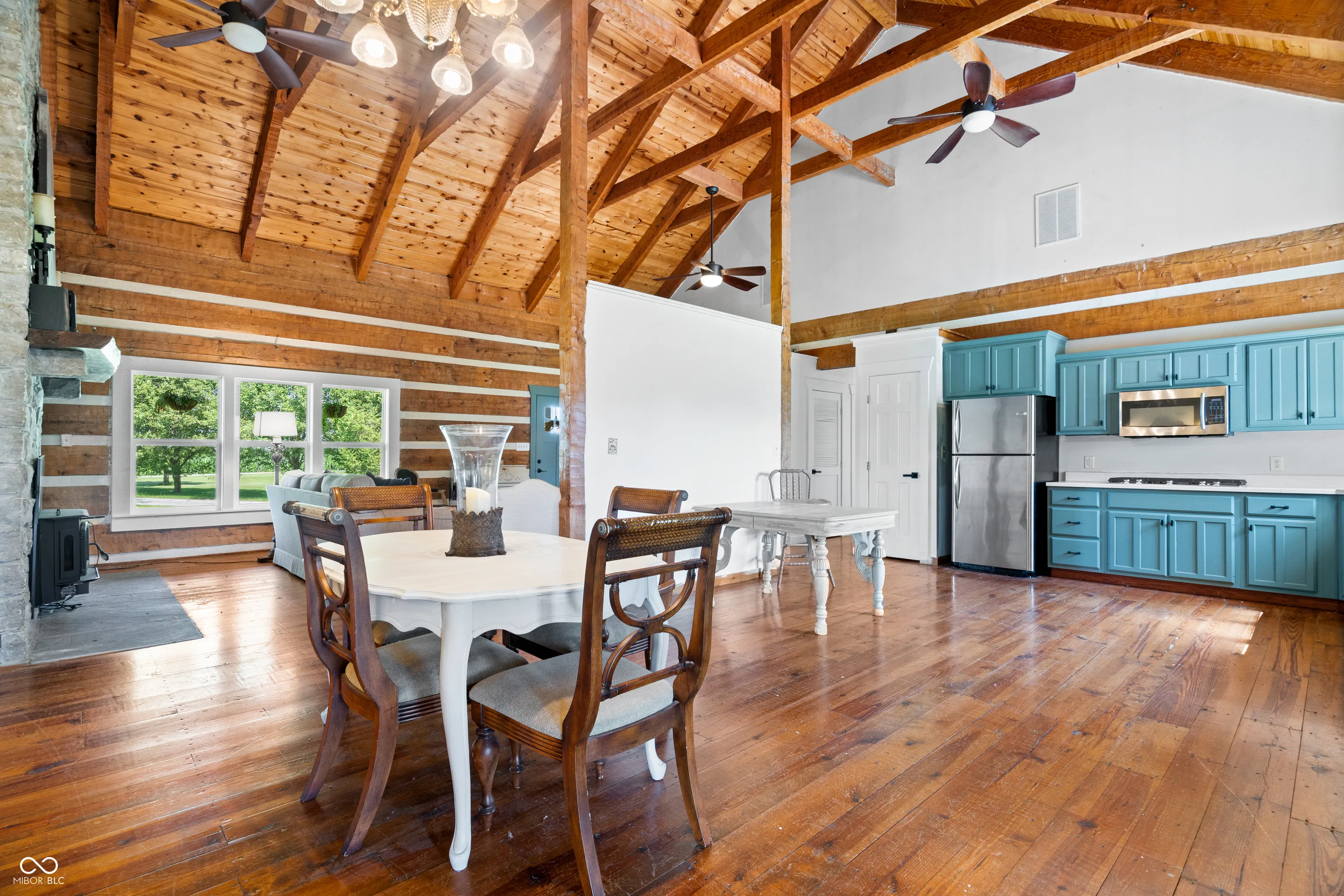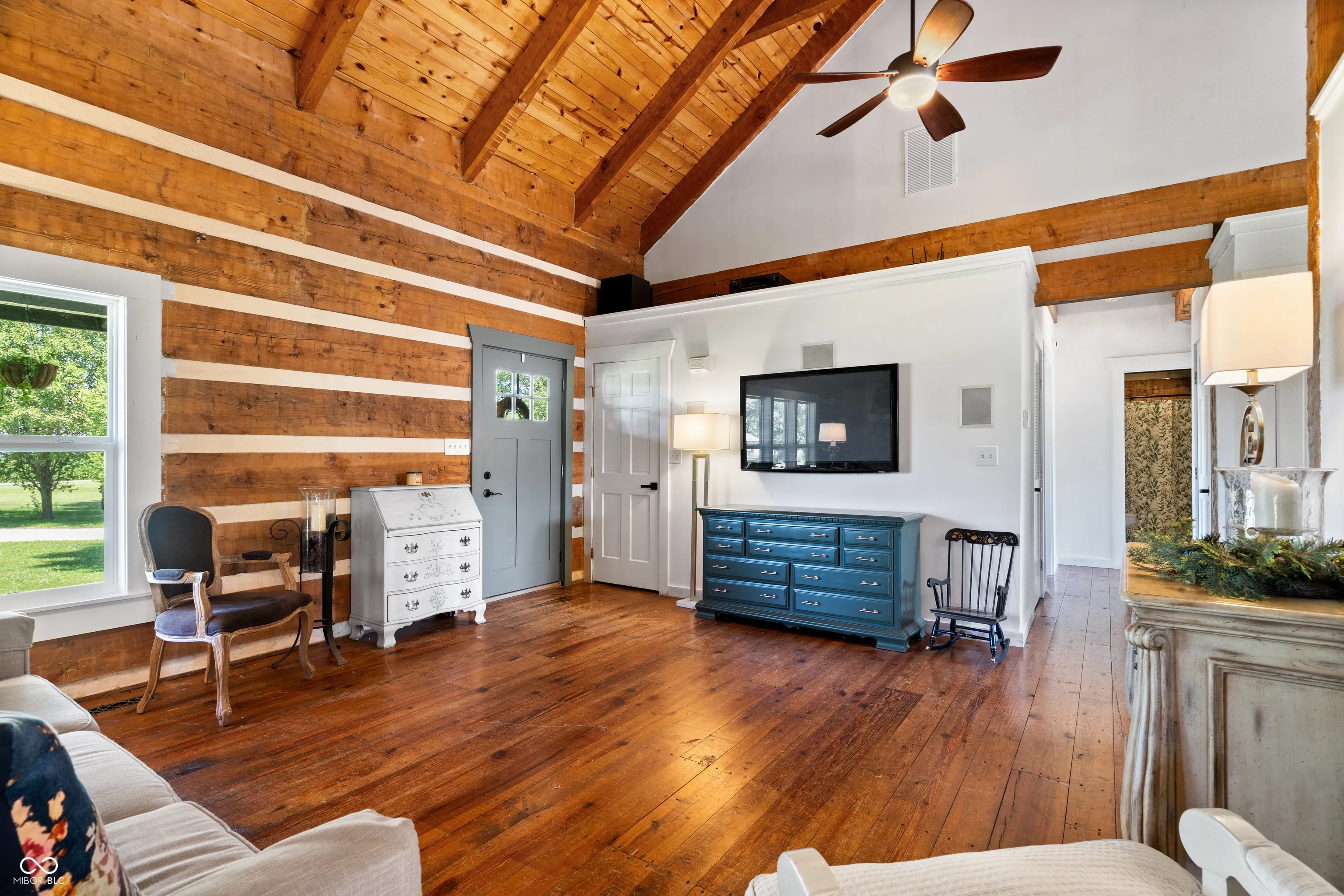 Your dreams of rural living in a charming chalet-style log home are ready to come true! Situated on 6 acres with Sugar Creek *on site,* you’ll enjoy both scenic views of expansive fields AND wooded terrain with kayaking just outside your backdoor! An oversized front porch makes a great first impression and serves as a perfect outdoor living area. Inside you are amazed by 23-foot soaring ceilings with open, exposed framework. Imagine your favorite lodge – this is it! Open concept main living/dining/kitchen areas are perfect for large family gatherings. This home is incredible during the holidays (ah-hem… HUGE Christmas tree opportunity)! An impressive floor-to-ceiling masonry fireplace is the focal point and features a blower insert that can heat your whole home in the winter if you desire! Gourmet kitchen with a cooktop and separate ovens plus a pantry – not to mention an oversized overflow pantry around the corner. Incredible storage! The primary suite is split from the spare bedrooms and offers tall ceilings that carry throughout, an enormous walk in closet and full en-suite bath with linen storage. Spare bedrooms are generous in size and adjacent to an updated full bath. Last but not least your expansive sunroom makes for the perfect flex room – great for a home office/hobby room/playroom/home gym… endless possibilities. The sunroom opens onto the rear porch and is just steps away from the 2 car garage. This outbuilding not only serves as a garage but also has a separate bonus room currently being used as an office. Great way to keep home life and business life separate! The 2nd outbuilding is even larger with both workshop/garage space and the most amazing “man cave” space! Heated too!! Previous owners outfitted this building with a bathroom and a kitchenette! Perfect opportunity for a home-based business! Updates include new HVAC, almost all new windows and brand new metal roofing with a 50 year transferrable warranty!