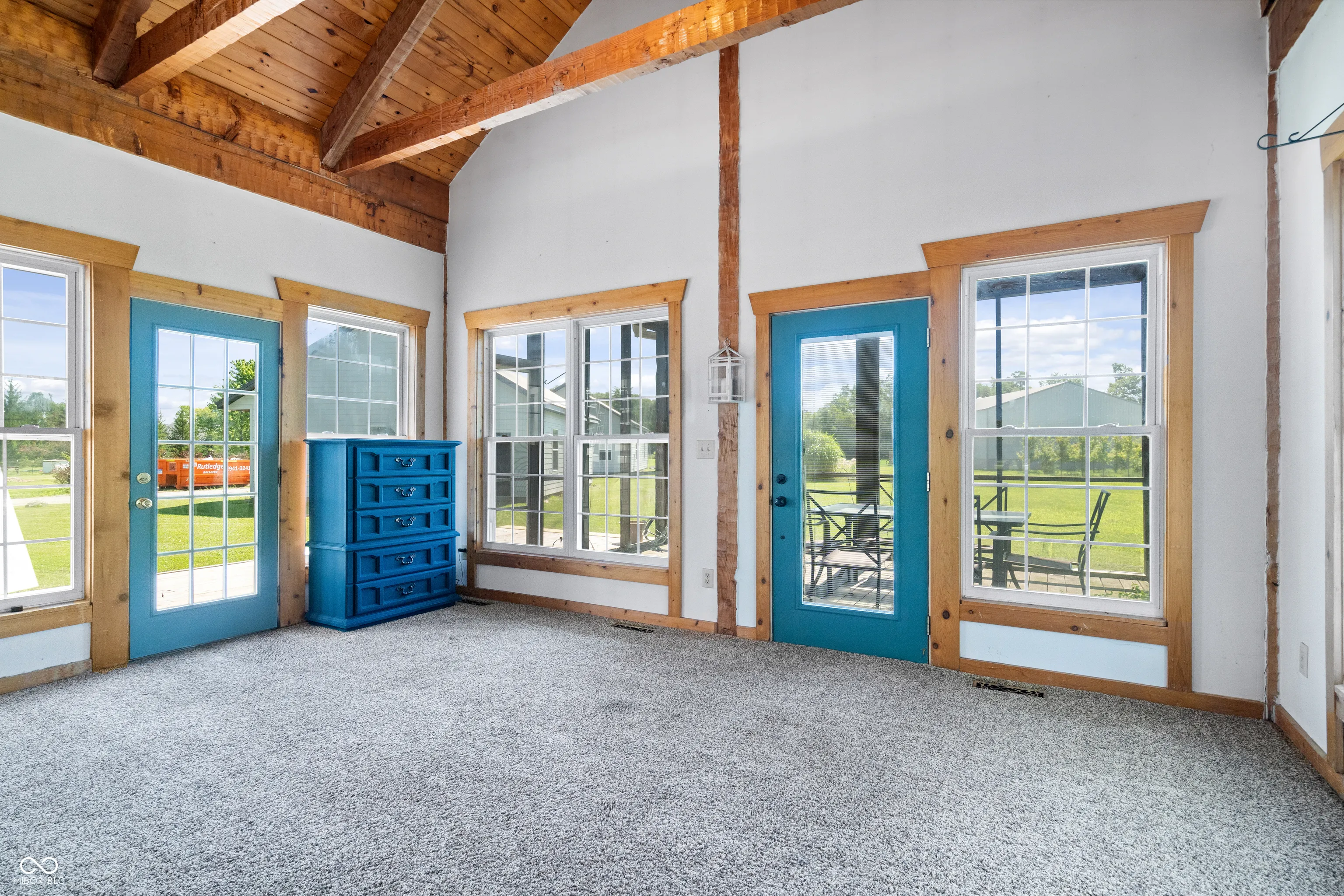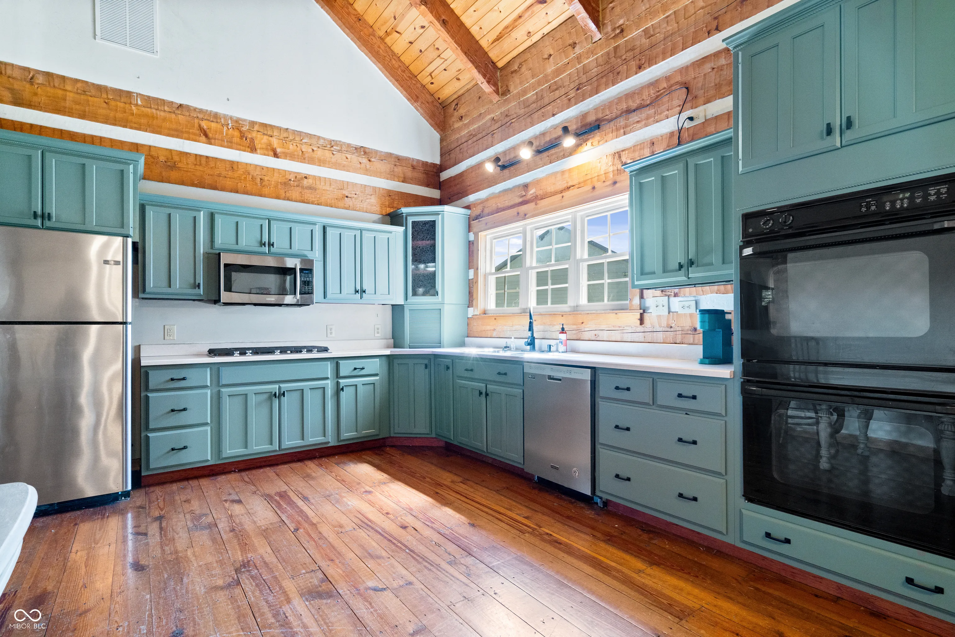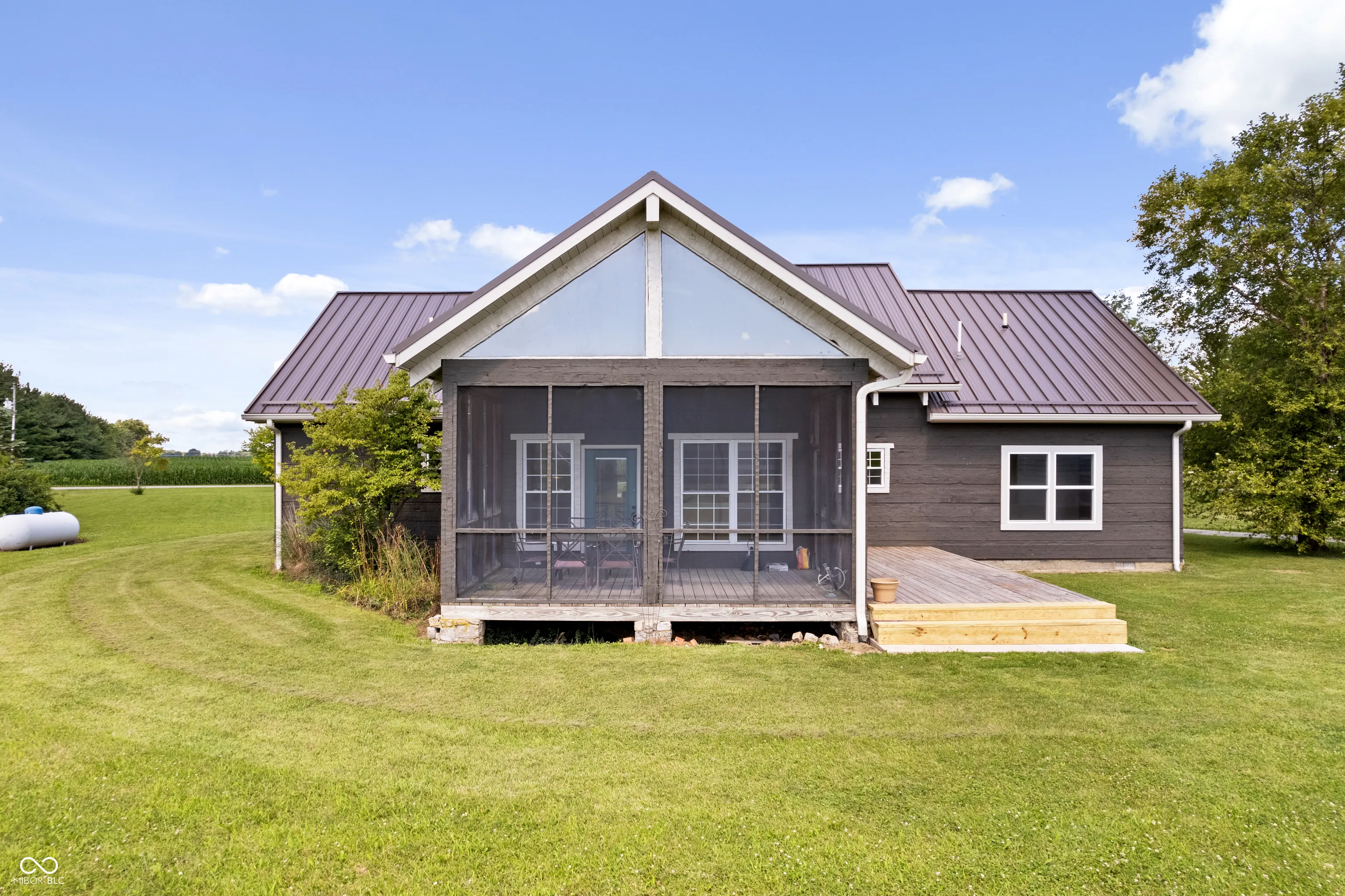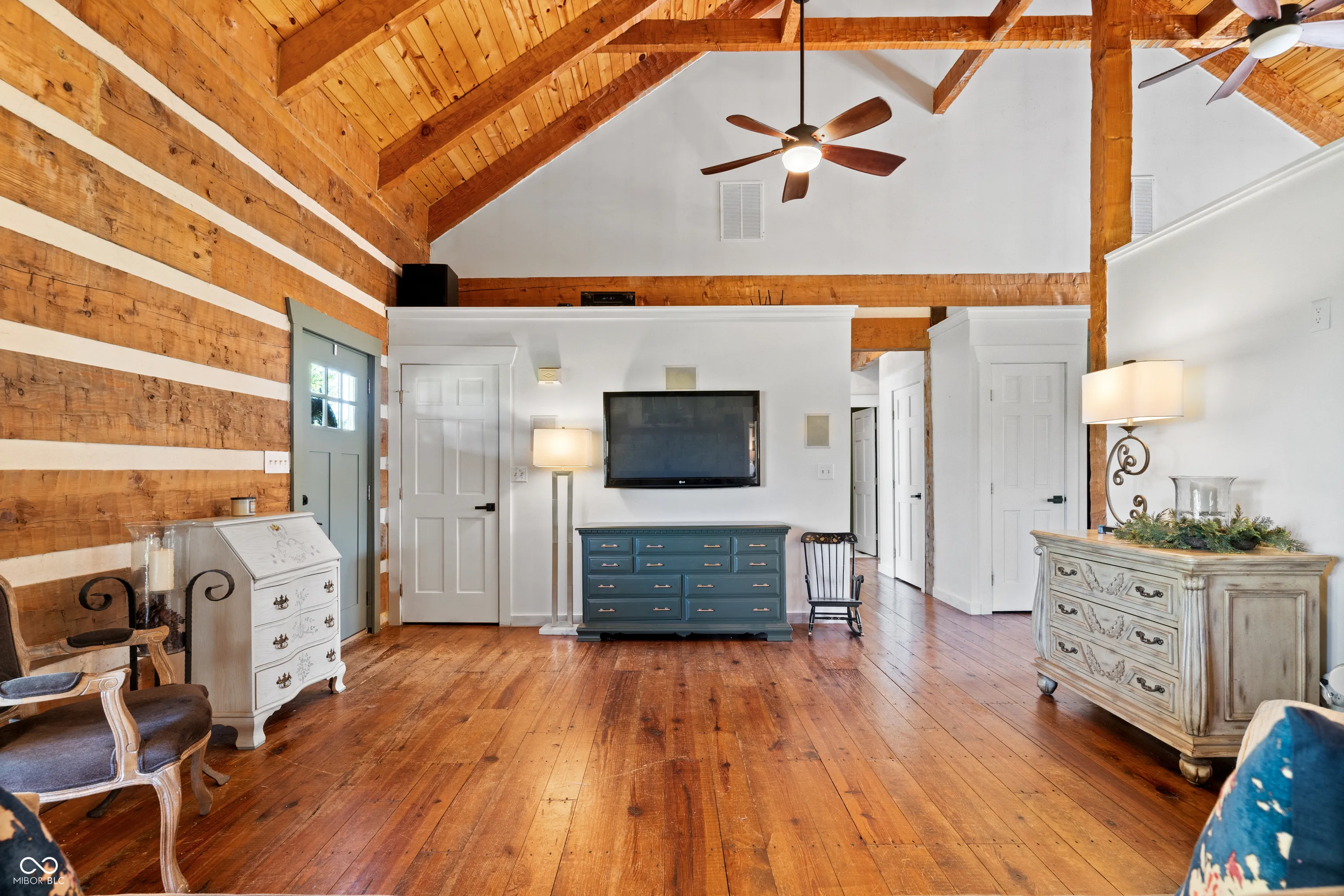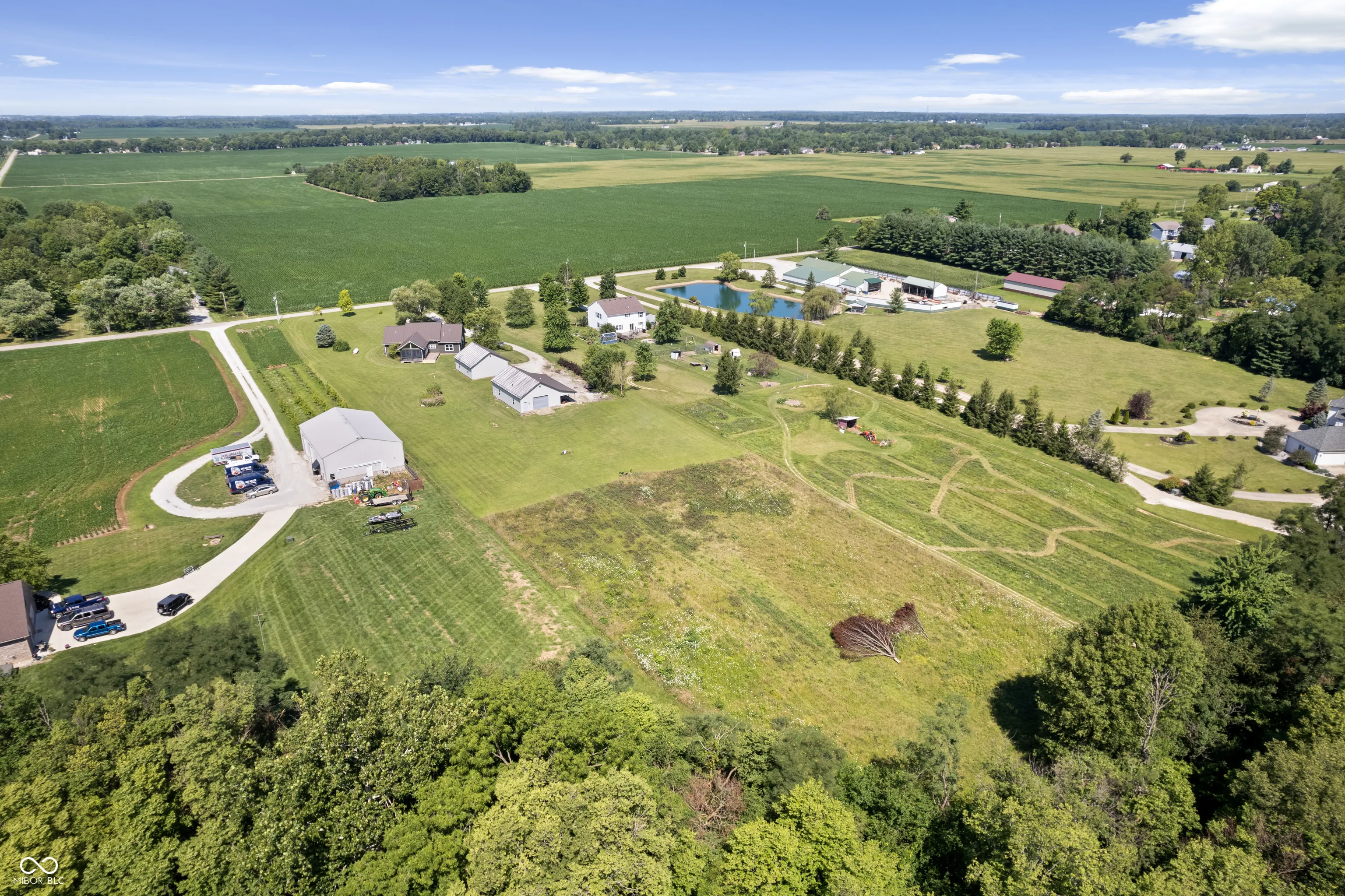 Your dreams of rural living in a charming chalet-style log home are ready to come true! Situated on 6 acres with Sugar Creek *on site,* you’ll enjoy both scenic views of expansive fields AND wooded terrain with kayaking just outside your backdoor! An oversized front porch makes a great first impression and serves as a perfect outdoor living area. Inside you are amazed by 23-foot soaring ceilings with open, exposed framework. Imagine your favorite lodge – this is it! Open concept main living/dining/kitchen areas are perfect for large family gatherings. This home is incredible during the holidays (ah-hem… HUGE Christmas tree opportunity)! An impressive floor-to-ceiling masonry fireplace is the focal point and features a blower insert that can heat your whole home in the winter if you desire! Gourmet kitchen with a cooktop and separate ovens plus a pantry – not to mention an oversized overflow pantry around the corner. Incredible storage! The primary suite is split from the spare bedrooms and offers tall ceilings that carry throughout, an enormous walk in closet and full en-suite bath with linen storage. Spare bedrooms are generous in size and adjacent to an updated full bath. Last but not least your expansive sunroom makes for the perfect flex room – great for a home office/hobby room/playroom/home gym… endless possibilities. The sunroom opens onto the rear porch and is just steps away from the 2 car garage. This outbuilding not only serves as a garage but also has a separate bonus room currently being used as an office. Great way to keep home life and business life separate! The 2nd outbuilding is even larger with both workshop/garage space and the most amazing “man cave” space! Heated too!! Previous owners outfitted this building with a bathroom and a kitchenette! Perfect opportunity for a home-based business! Updates include new HVAC, almost all new windows and brand new metal roofing with a 50 year transferrable warranty!