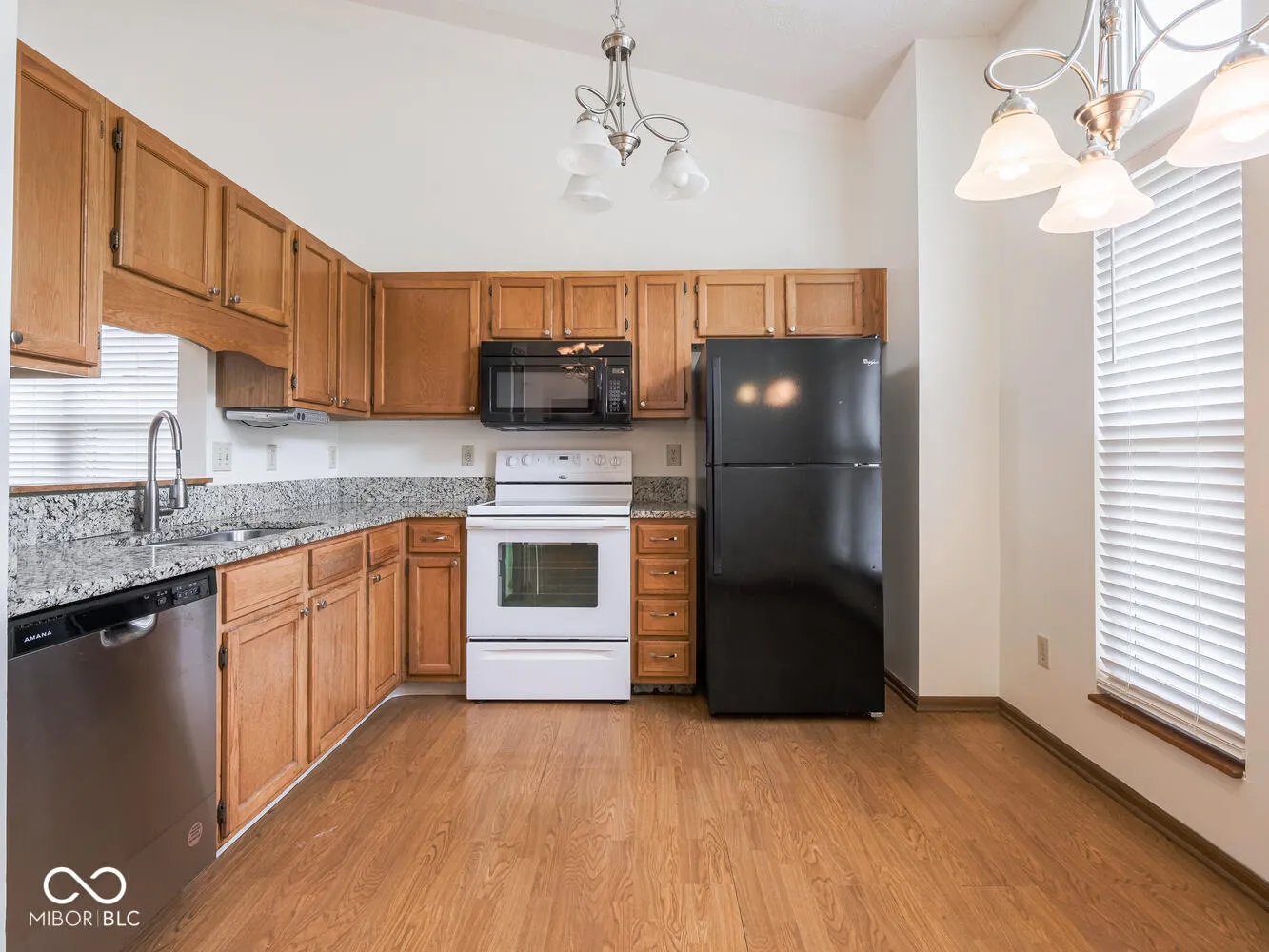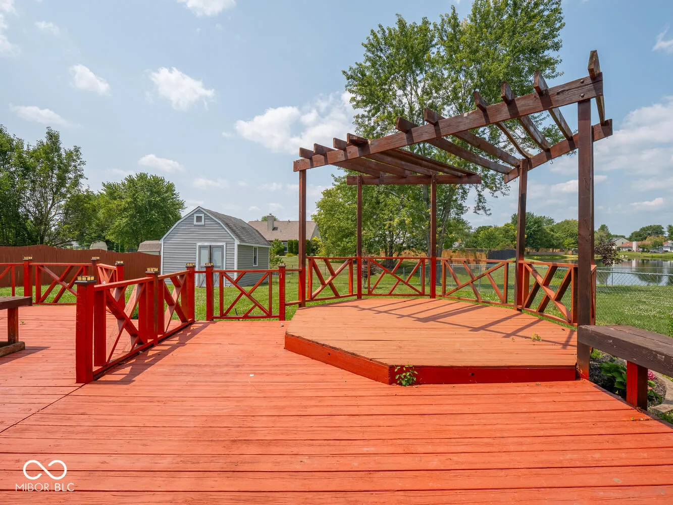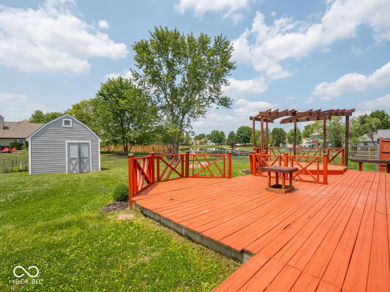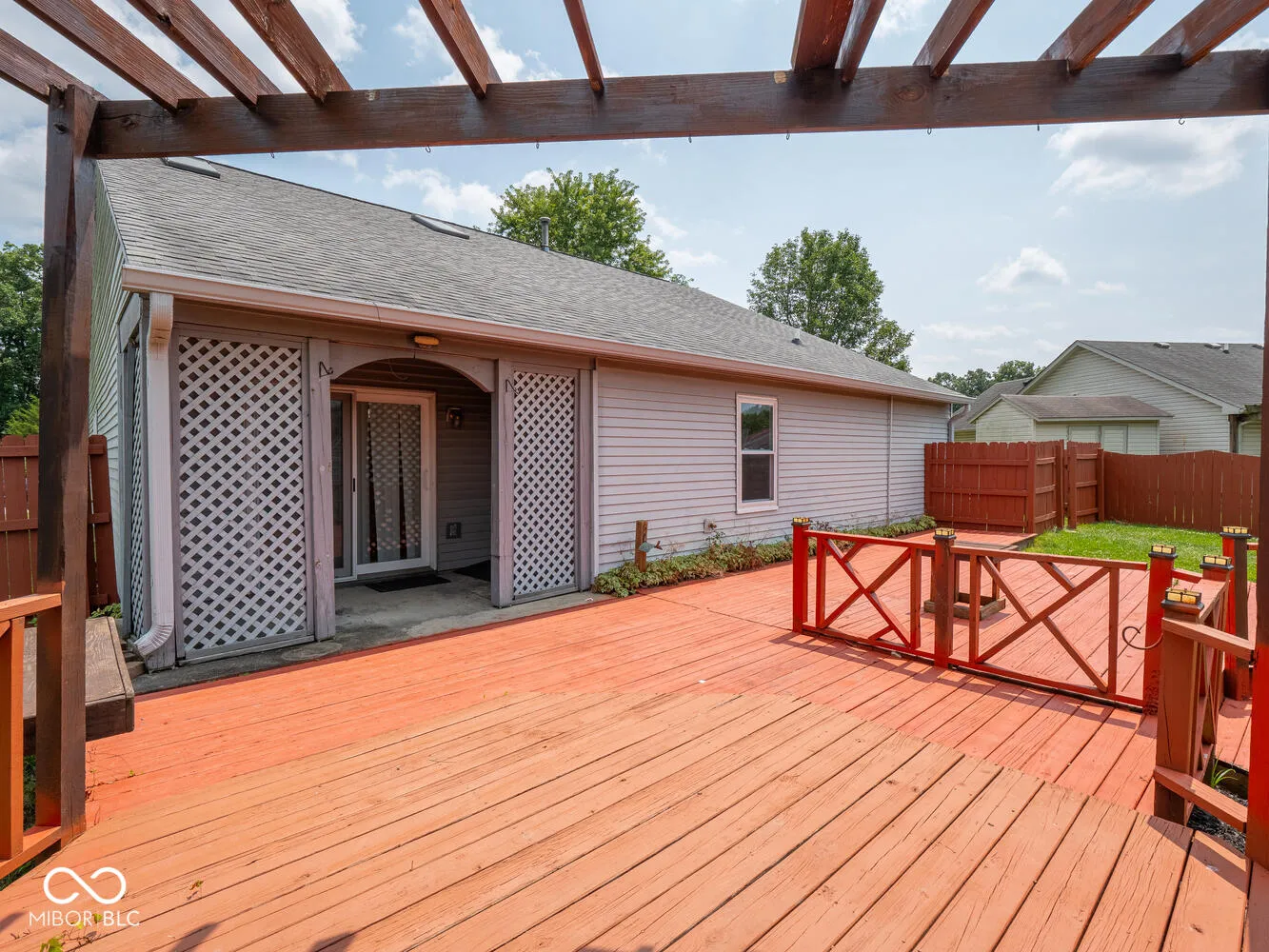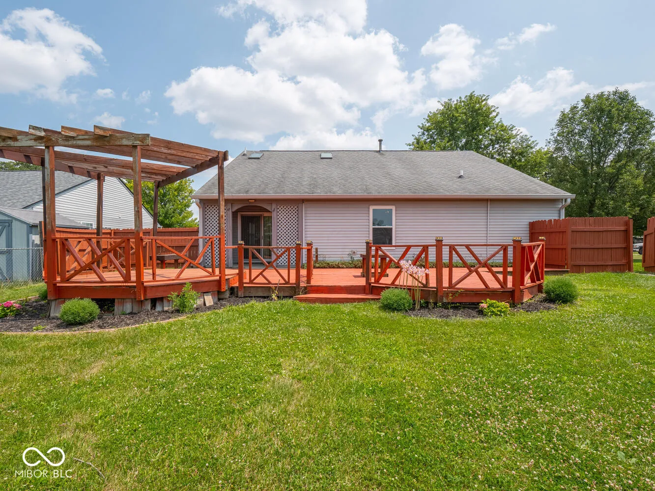 Enjoy peaceful evenings on the large deck overlooking a pretty backyard and one of the ponds in Austin Lakes subdivision. 3 bedroom 2 full bath ranch home. Large open great room with plenty of light from the replaced skylights. Cathedral ceilings. New custom blinds in kitchen and great room. Granite counter, eat in kitchen. Double sinks in primary bath. Fully fenced back yard. New A/C 2024, Furnace 2023, new vinyl sliding patio door 2023, Vinyl windows and doors 2012. Deck stained 2023. Access to pond allowed. Pull down stairs to attic. Shed with vinyl siding. Very convenient to all necessities in Avon!