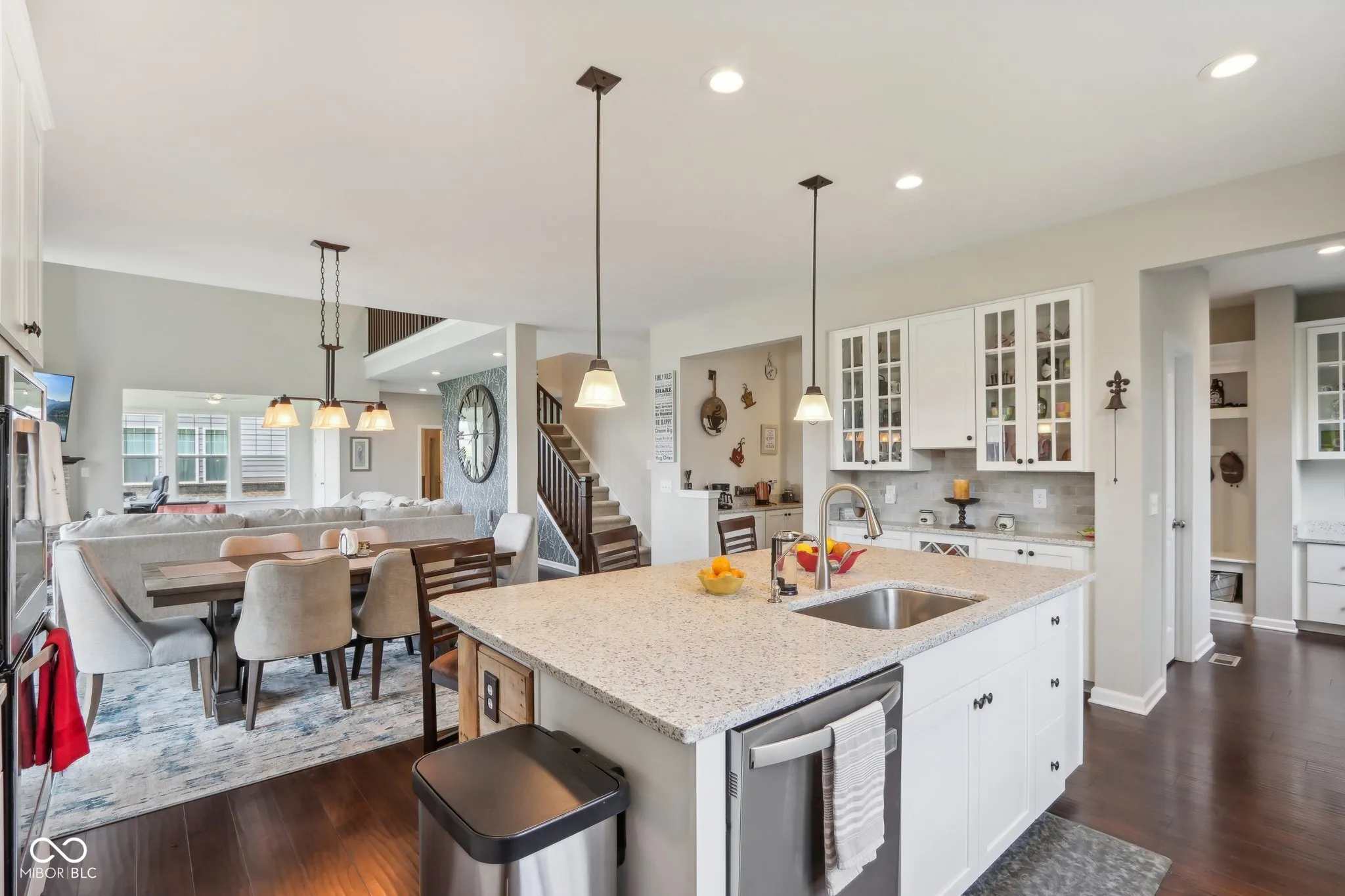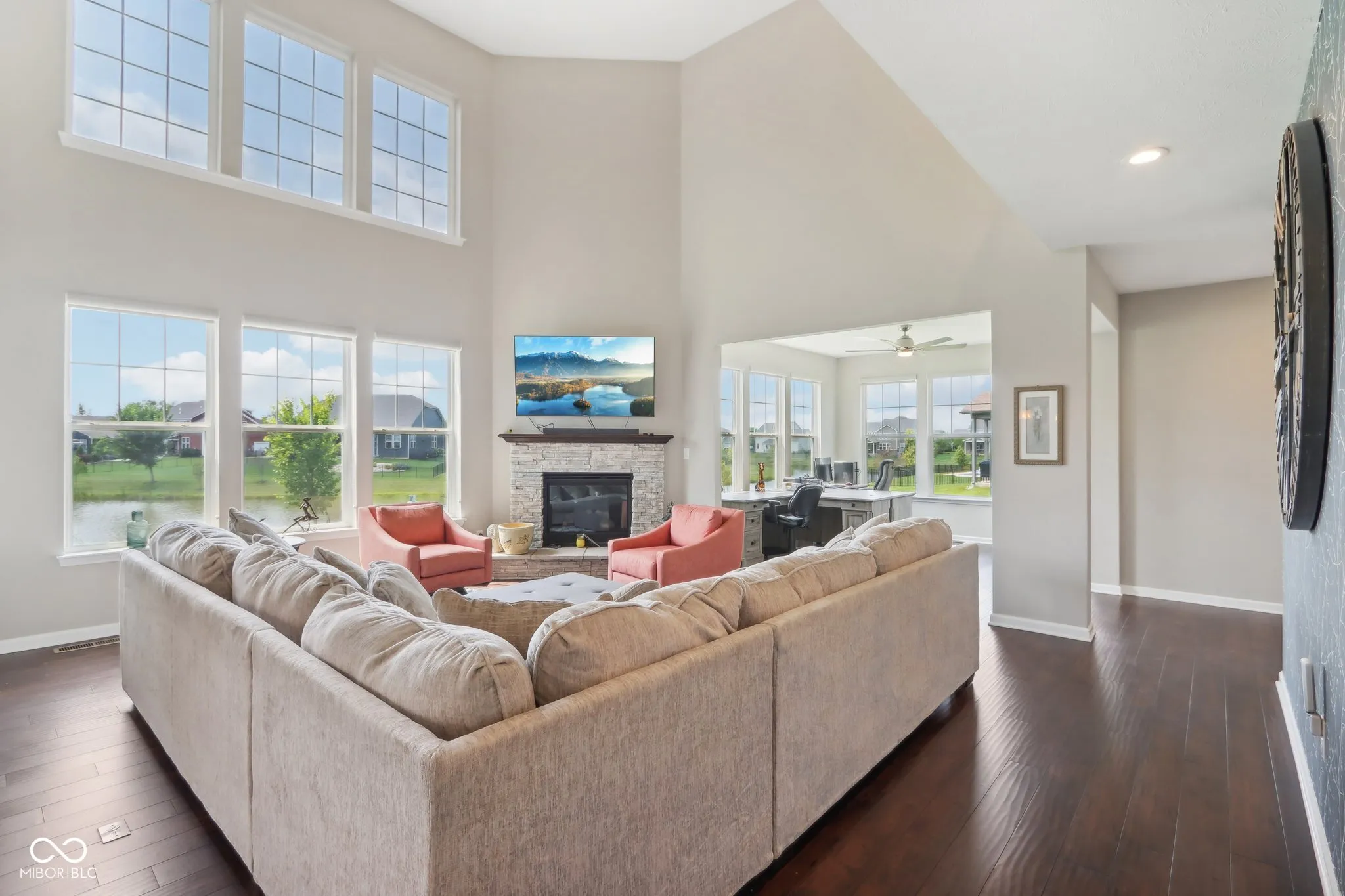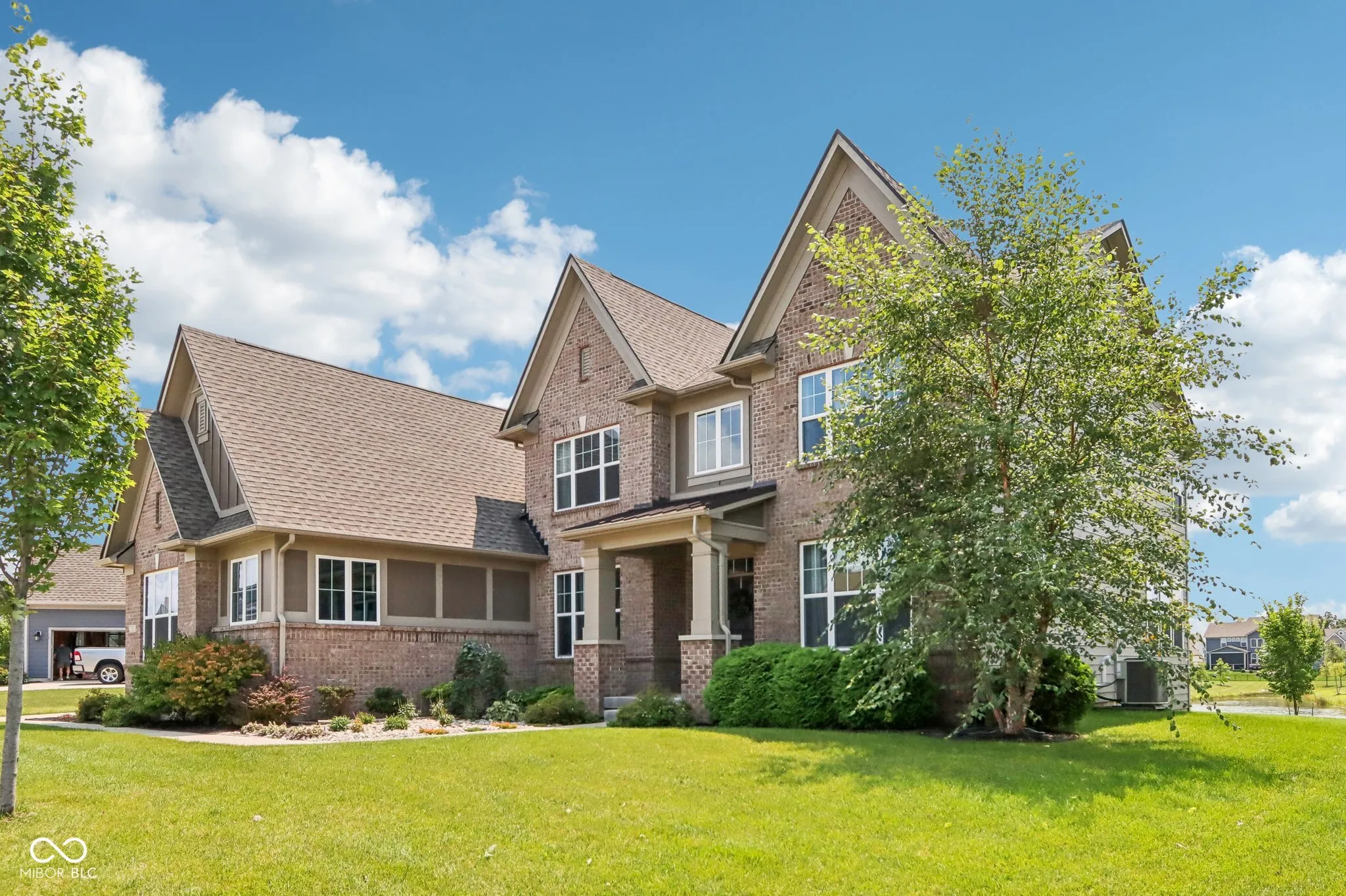 Sought after spacious brick home in Westfields popular Springmill Park! Home is nestled on a pond for serene views. This home has everything you could ask for! Great curb appeal shows pride of ownership that you will find through out. Covered porch leads to open foyer, stunning dark floors through out the main living areas. Two story great room with soaring ceilings, gas fireplace and tons of natural light. Solar shades along back windows for privacy. Eat in kitchen features, center island with shiplap, granite counters, tile backsplash, white glass front cabinets double oven, cooktop, dishwasher and microwave. Main floor bedroom, main floor bath has been updated to a full bath with walk in shower, tile walls and shiplap to complete the look! Sunroom/office is bright and airy! Rear mudroom space with custom boot bench and storage galore, perfect drop zone for a busy household. Formal dining room with tray ceiling could be second office or living room. Owners suite with tray ceiling and plenty of space for sitting area. Owners bath with separate sinks, tile floors, water closet, Walk in tile shower with convenient bench and soaker tub. Bedroom two and three have Jack n Jill bath. All 4 bedrooms are spacious. Laundry upstairs for added convenience, custom built in cabinet and laundry sink stay. Finished basement features can lights, theatre area, work out room and tons of storage. Screened in porch overlooking the lush backyard and pond. Home has irrigation front and back.