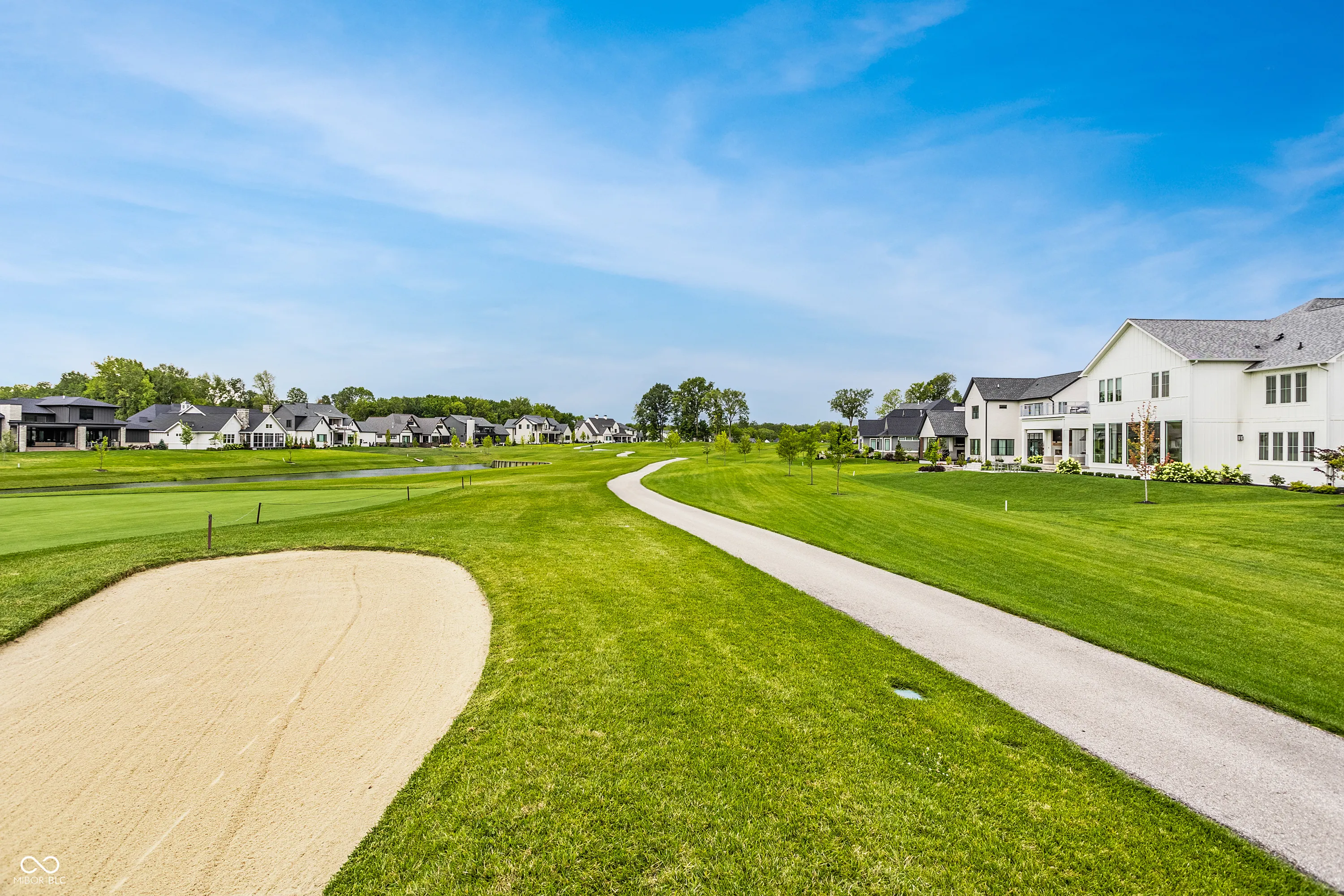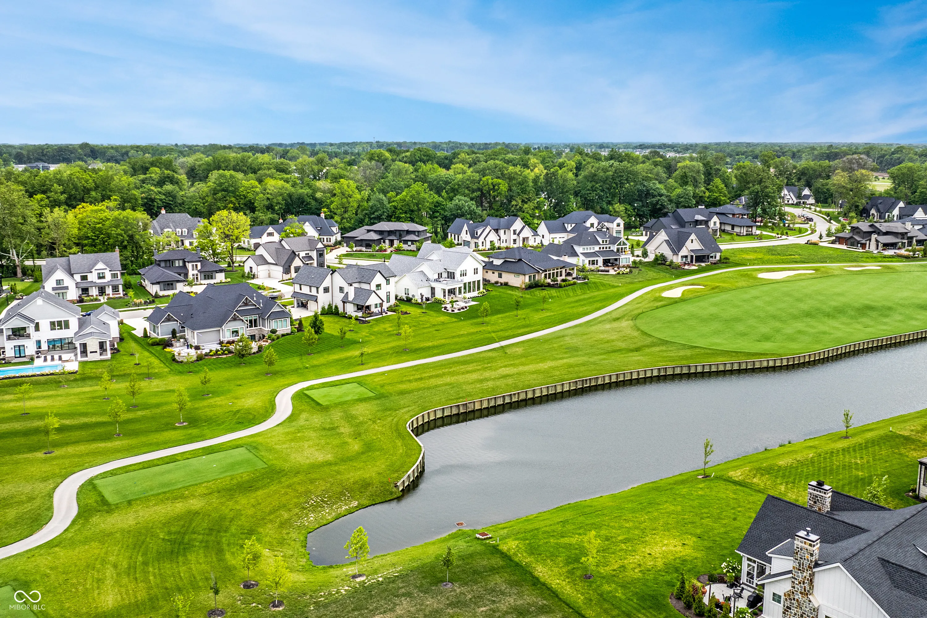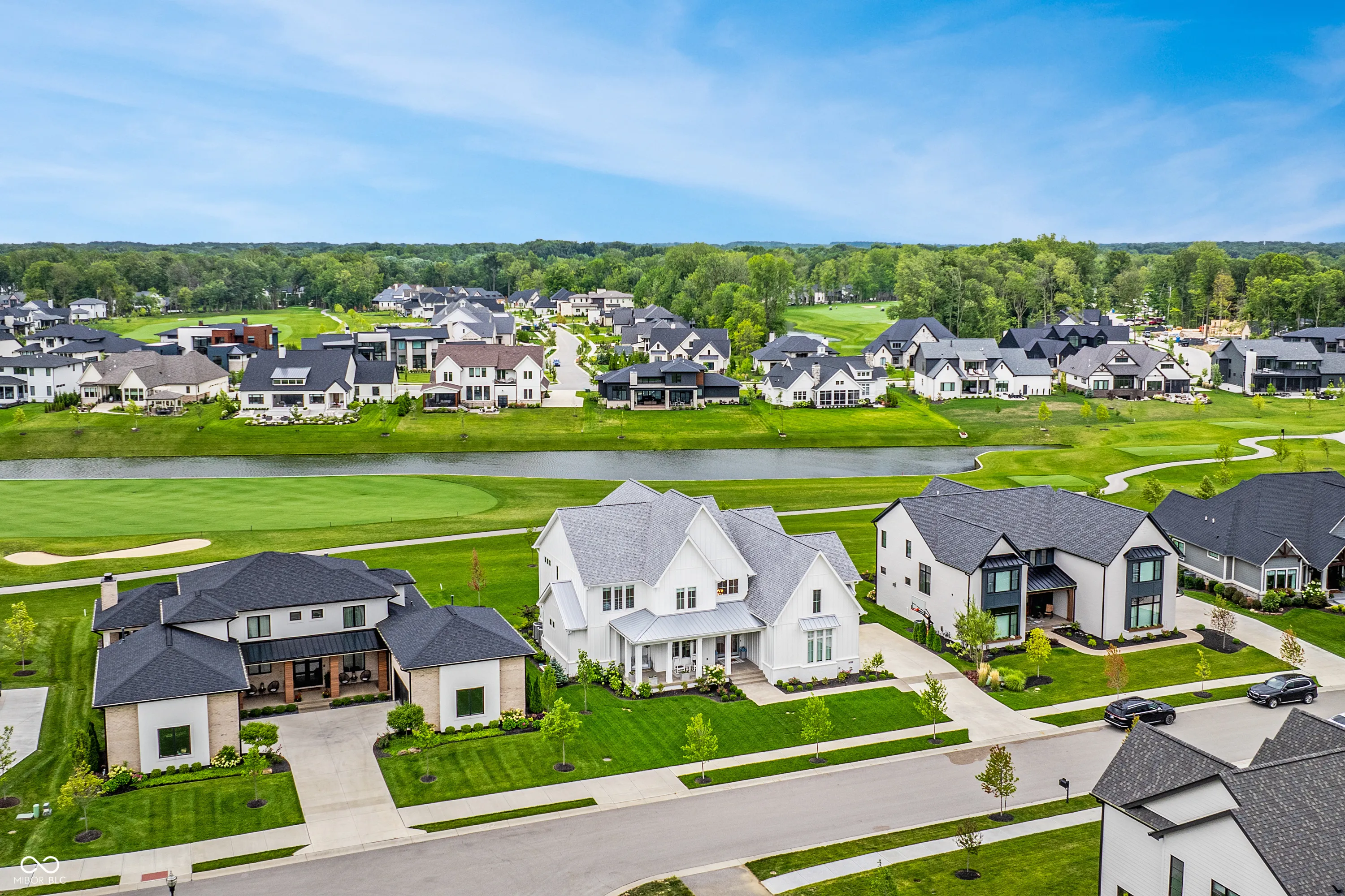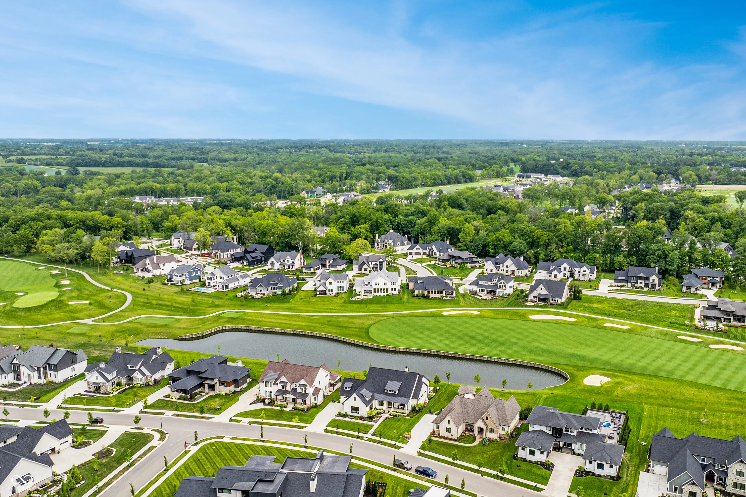 Nestled within the prestigious Holliday Farms of Zionsville, this exquisite custom home by renowned builder Kent Shaffer Homes awaits. The open-concept living spaces feature panoramic views of the second hole through expansive floor-to-ceiling windows. The great room, designed with a fireplace, built-ins, and soaring ceilings adorned with wooden beams, exudes charm and sophistication. Connected seamlessly to the kitchen, a culinary haven awaits with quartz countertops, a quartz backsplash, and a custom range hood, perfect for any cooking enthusiast. The magnificent main level primary suite, complete with a tray ceiling and beautiful beams, features a spacious walk-in closet and a spa-like bath. Ascending to the upper level reveals an expansive media room with vaulted ceilings and custom built-in desks, a wet bar, three bedrooms, two full baths, and a large balcony overlooking the second hole and a serene pond. Additionally, the upper level boasts two exquisite bonus rooms, thoughtfully finished by the seller. The impeccable lower level offers entertainment options, including a media room and a well-appointed wet bar, ideal for hosting guests. Additionally, the lower level features a bedroom, full bath, and an exercise room, offering versatility and functionality. Outside, the covered lanai with invisible screens beckons, providing a tranquil setting to admire the breathtaking views alongside an outdoor fireplace, completing this exceptional residence. This home epitomizes luxury living.