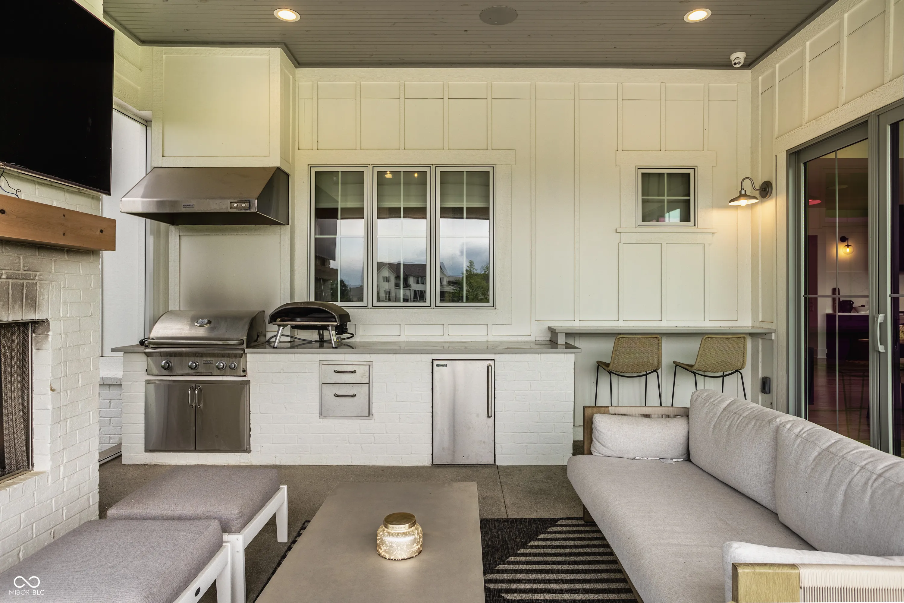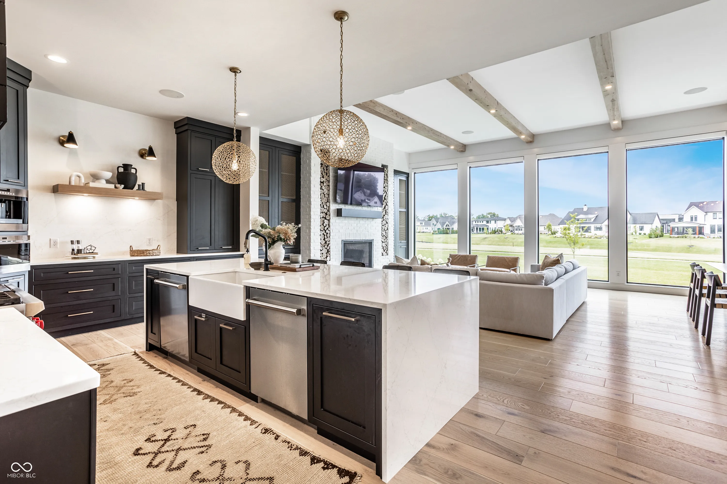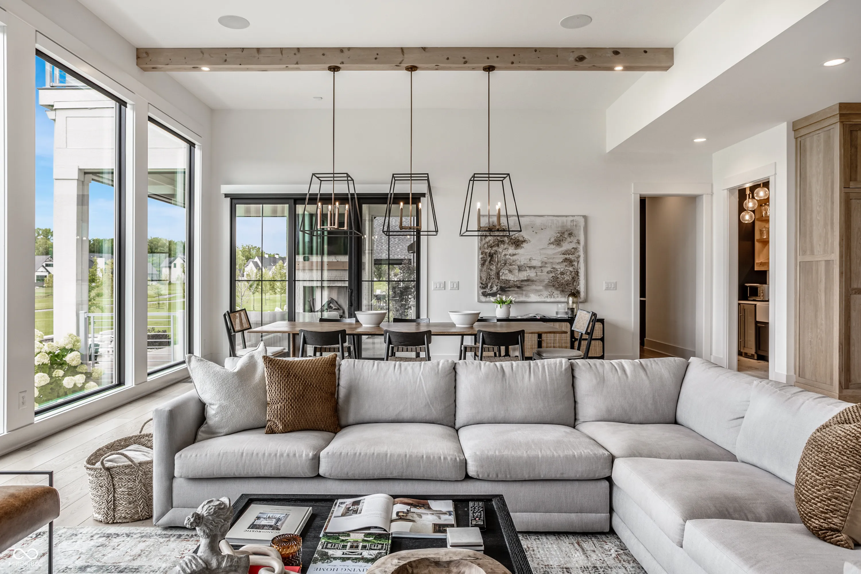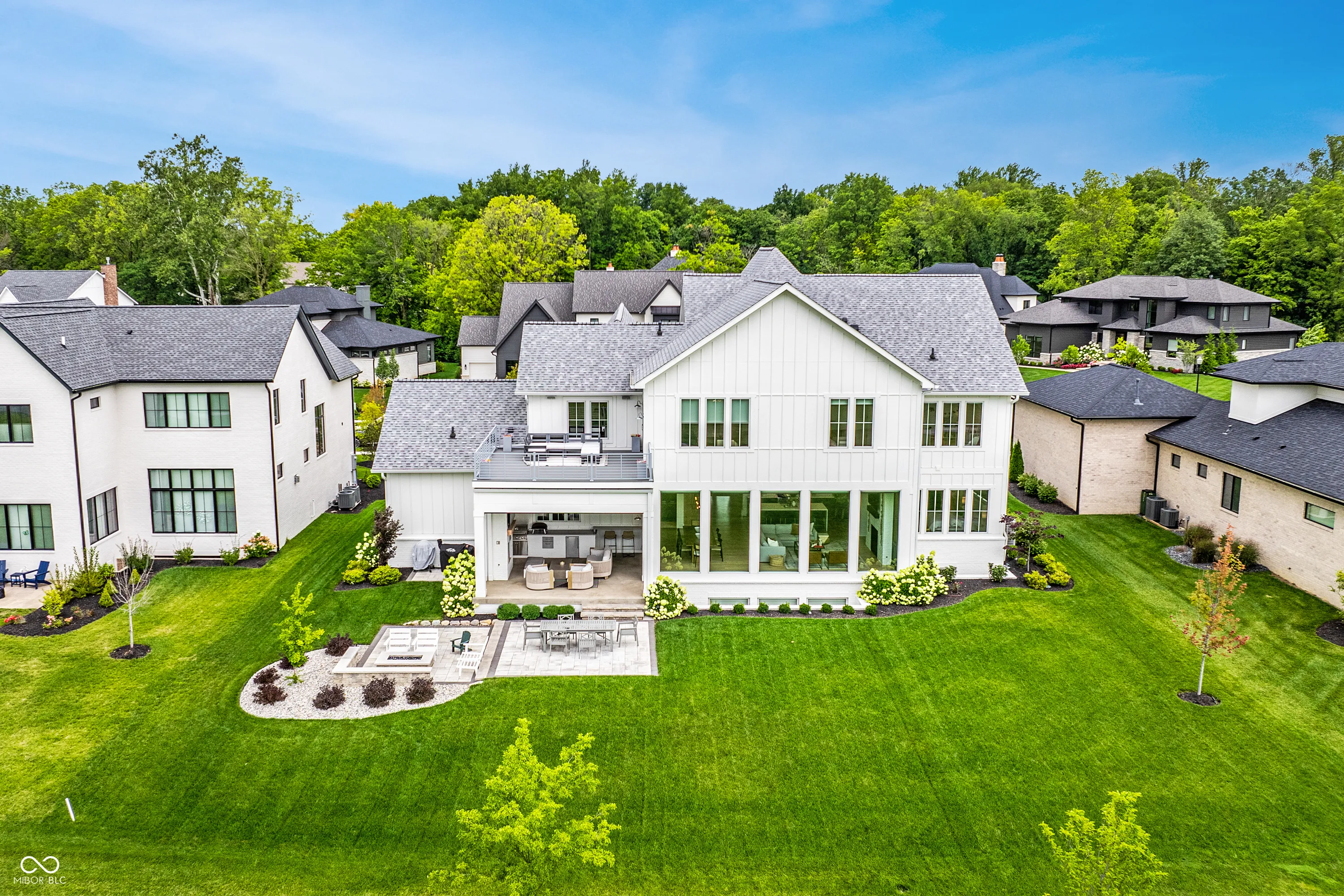 Nestled within the prestigious Holliday Farms of Zionsville, this exquisite custom home by renowned builder Kent Shaffer Homes awaits. The open-concept living spaces feature panoramic views of the second hole through expansive floor-to-ceiling windows. The great room, designed with a fireplace, built-ins, and soaring ceilings adorned with wooden beams, exudes charm and sophistication. Connected seamlessly to the kitchen, a culinary haven awaits with quartz countertops, a quartz backsplash, and a custom range hood, perfect for any cooking enthusiast. The magnificent main level primary suite, complete with a tray ceiling and beautiful beams, features a spacious walk-in closet and a spa-like bath. Ascending to the upper level reveals an expansive media room with vaulted ceilings and custom built-in desks, a wet bar, three bedrooms, two full baths, and a large balcony overlooking the second hole and a serene pond. Additionally, the upper level boasts two exquisite bonus rooms, thoughtfully finished by the seller. The impeccable lower level offers entertainment options, including a media room and a well-appointed wet bar, ideal for hosting guests. Additionally, the lower level features a bedroom, full bath, and an exercise room, offering versatility and functionality. Outside, the covered lanai with invisible screens beckons, providing a tranquil setting to admire the breathtaking views alongside an outdoor fireplace, completing this exceptional residence. This home epitomizes luxury living.